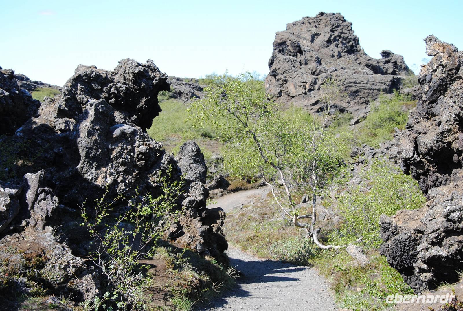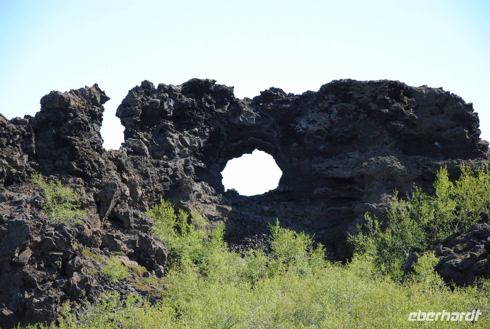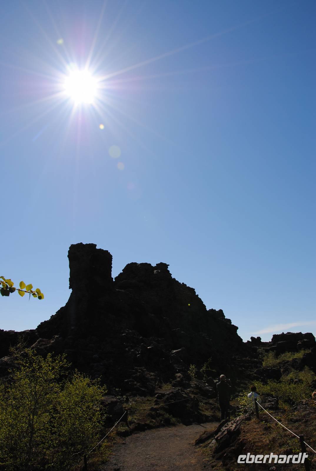 Der Spaziergang durch das Lava-Labyrinth in Dimmuborgir mit seinen bizarren Felsformationen erinnerte uns ein wenig an verfallene Burgruinen. Und damit wird auch verständlich, dass dieser Ort auch in der isländischen Mythologie auch als Unterkunftsort für Elfen und Trollen gesehen wird.