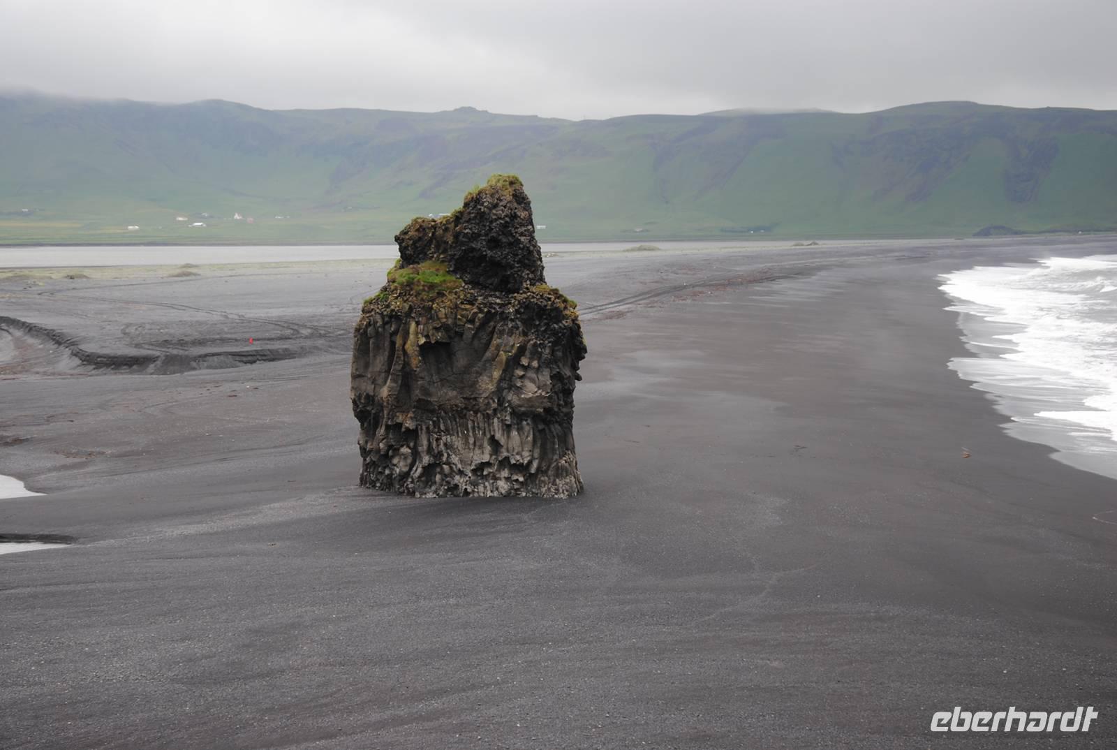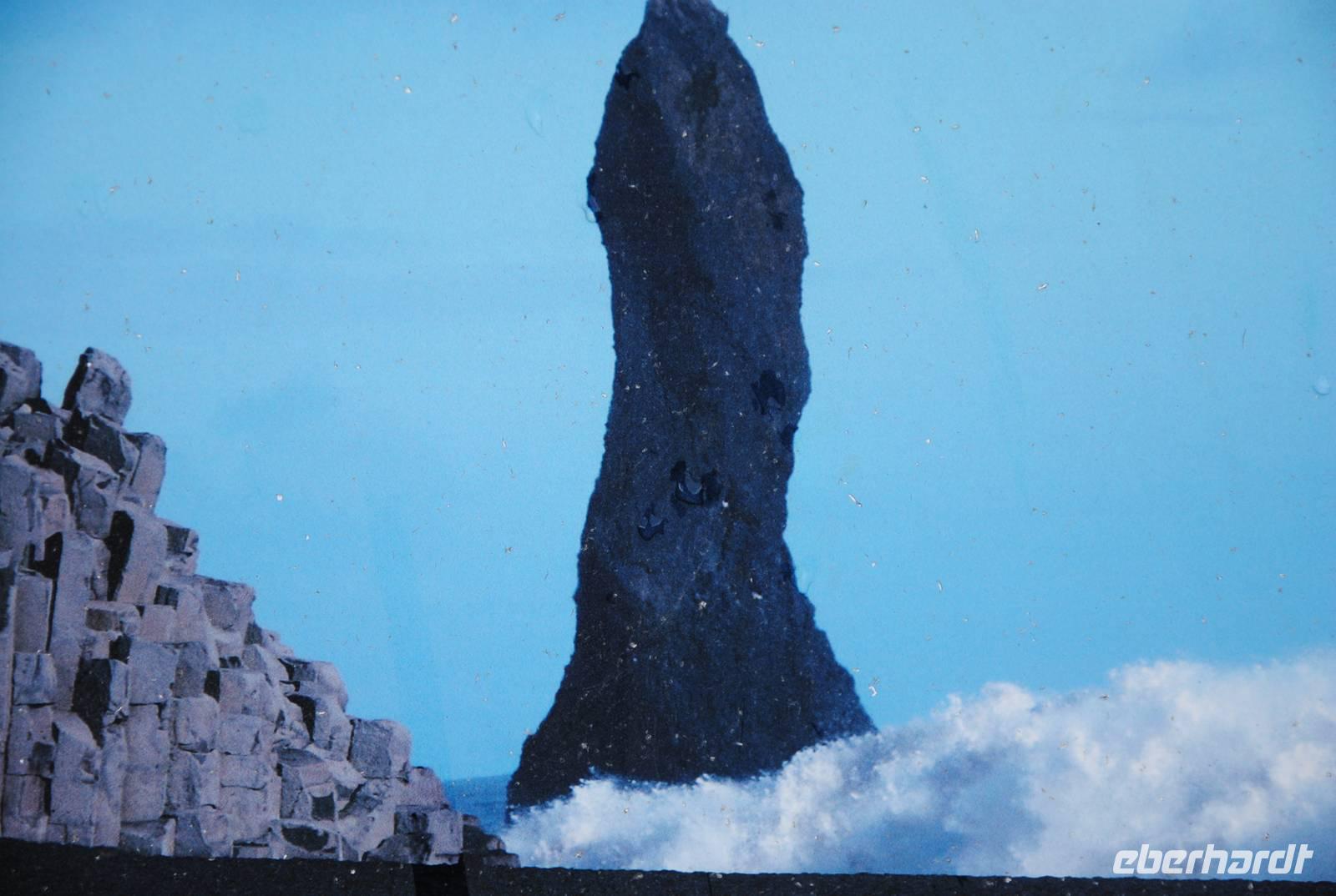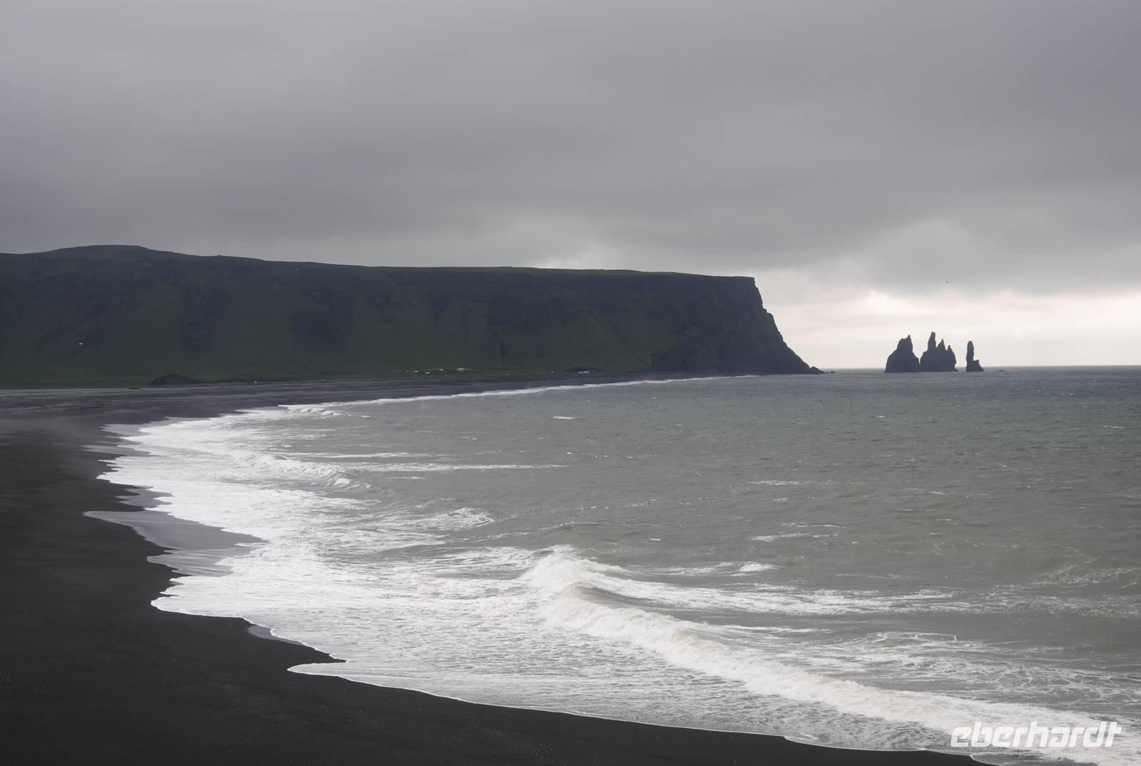 Zeitig machten wir uns heute auf und unternahmen zunächst einen Spaziergang am feinsandigen, schwarzen Strand von Vik, wo in der Ferne die markanten Felsnadeln Reynisdrangar aus dem Meer ragte. Der Strand bestand aus schwarzer Lava und das Meer an dieser Stelle ist häufig wild und aufgewühlt. So auch am heutigen Tag. Jeder von uns bestätigte das Urteil des „Island-Magazins", dass dieser Stand wirklich zu den 10 schönsten Stränden der Welt zählt