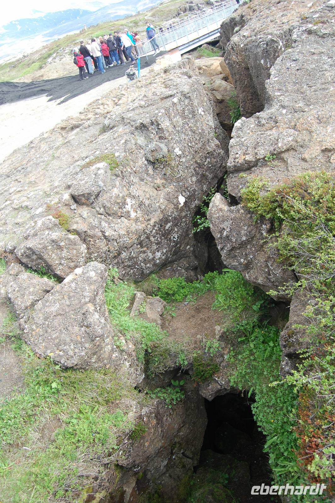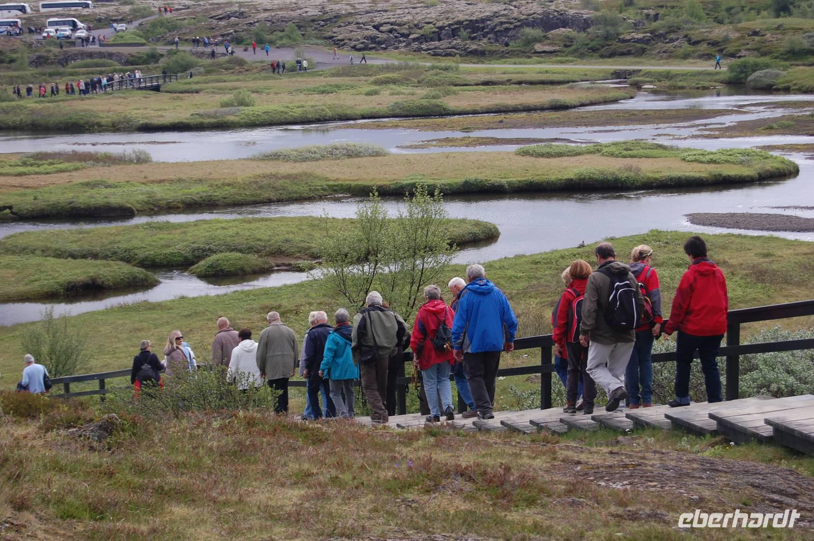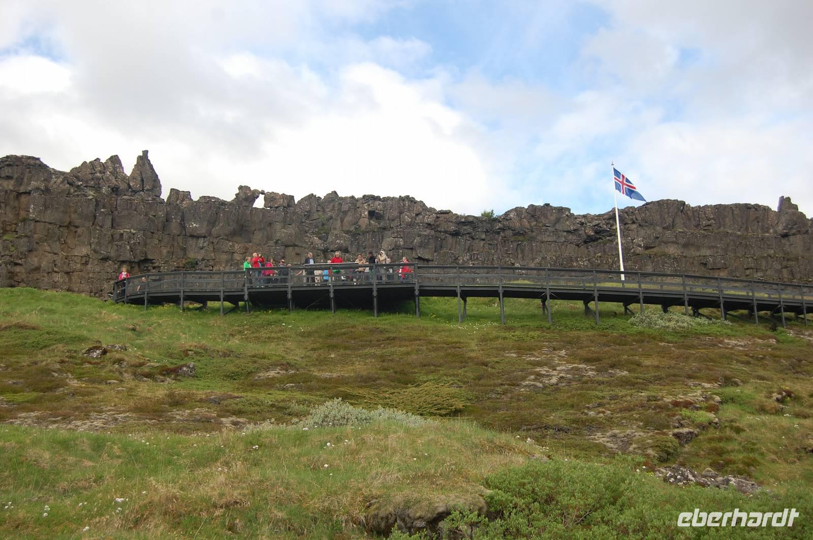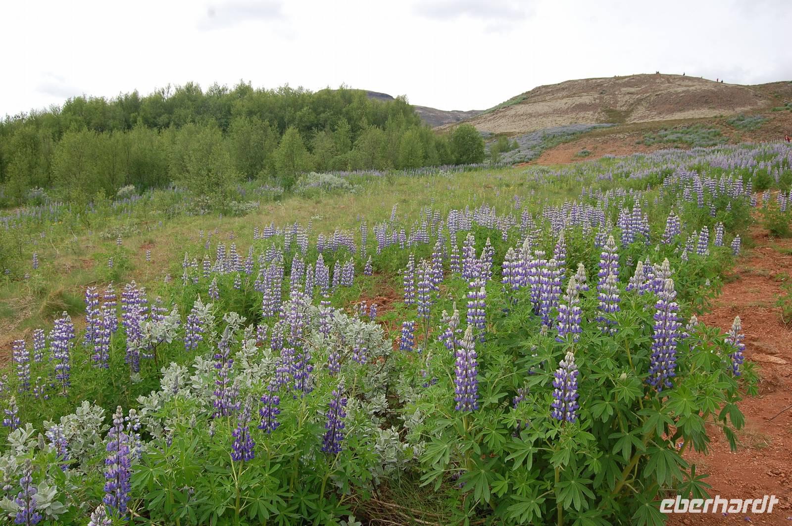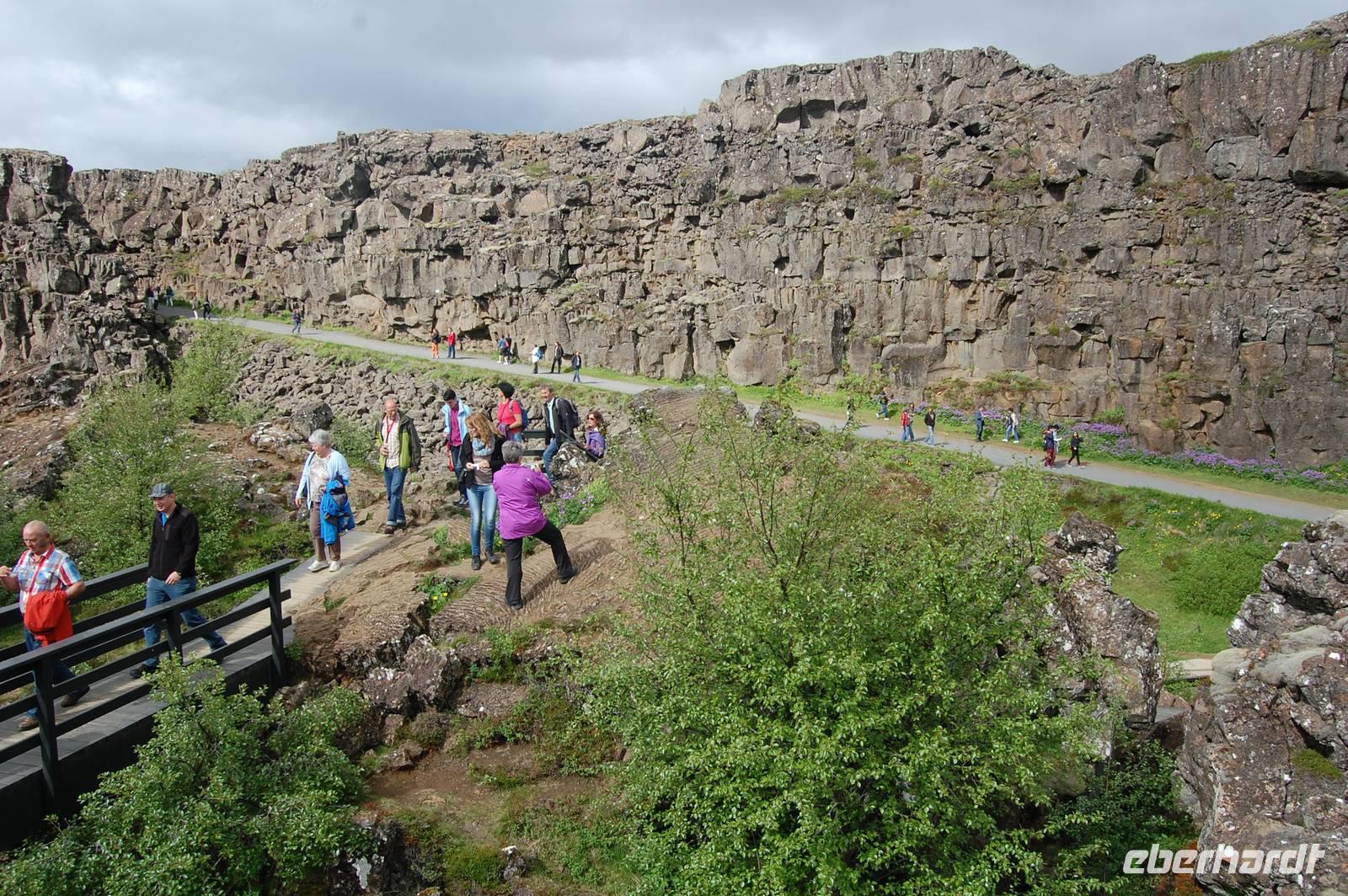 Pünktlich 09.00 Uhr starten wir mit unserem Reisebus. Unser Busfahrer für die gesamte Rundreise heißt Münte. Er fährt in Richtung Nordosten, wo wir in der Kleinstadt Mosfellsbaer an einer Bank stoppen um Geld zu tauschen. Schon nach kurzer Fahrzeit haben wir den etwas stärker besiedelten Großraum Reykjavik verlassen und sehen spärlich bewachsene Lava- und Hügellandschaften. In der Ferne leuchten lila die von Alaska-Lupinen bewachsenen Berghänge und gelangen in eine geologisch interessante Region. Bei einem Fotostopp oberhalb des Sees Pingvallavatn erkennen wir die geotektonische Grenze zwischen Europa und Amerika, denn hier an dieser Nahtstelle driften die amerikanische und die eurasische Platte Jahr für Jahr um einige Zentimeter auseinander.