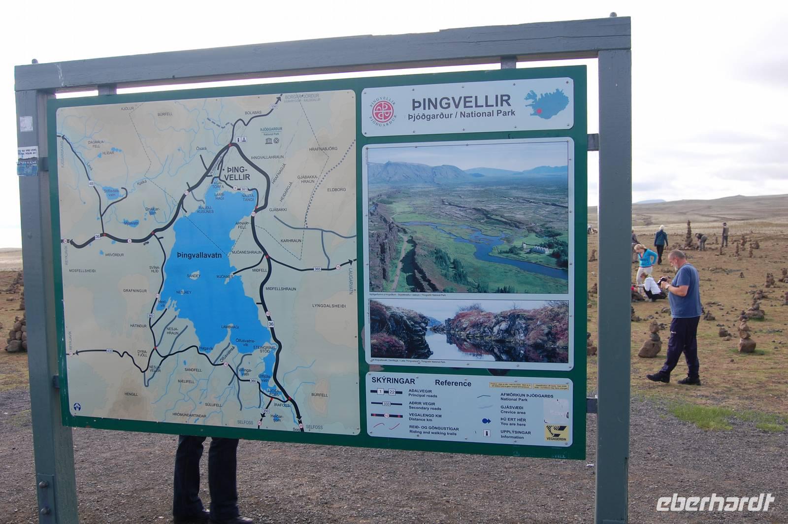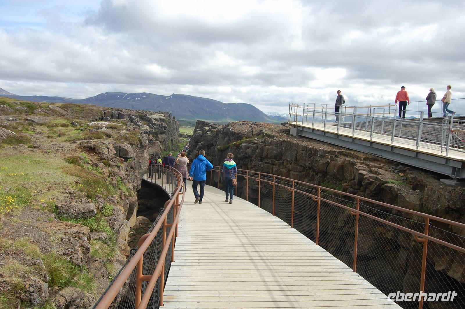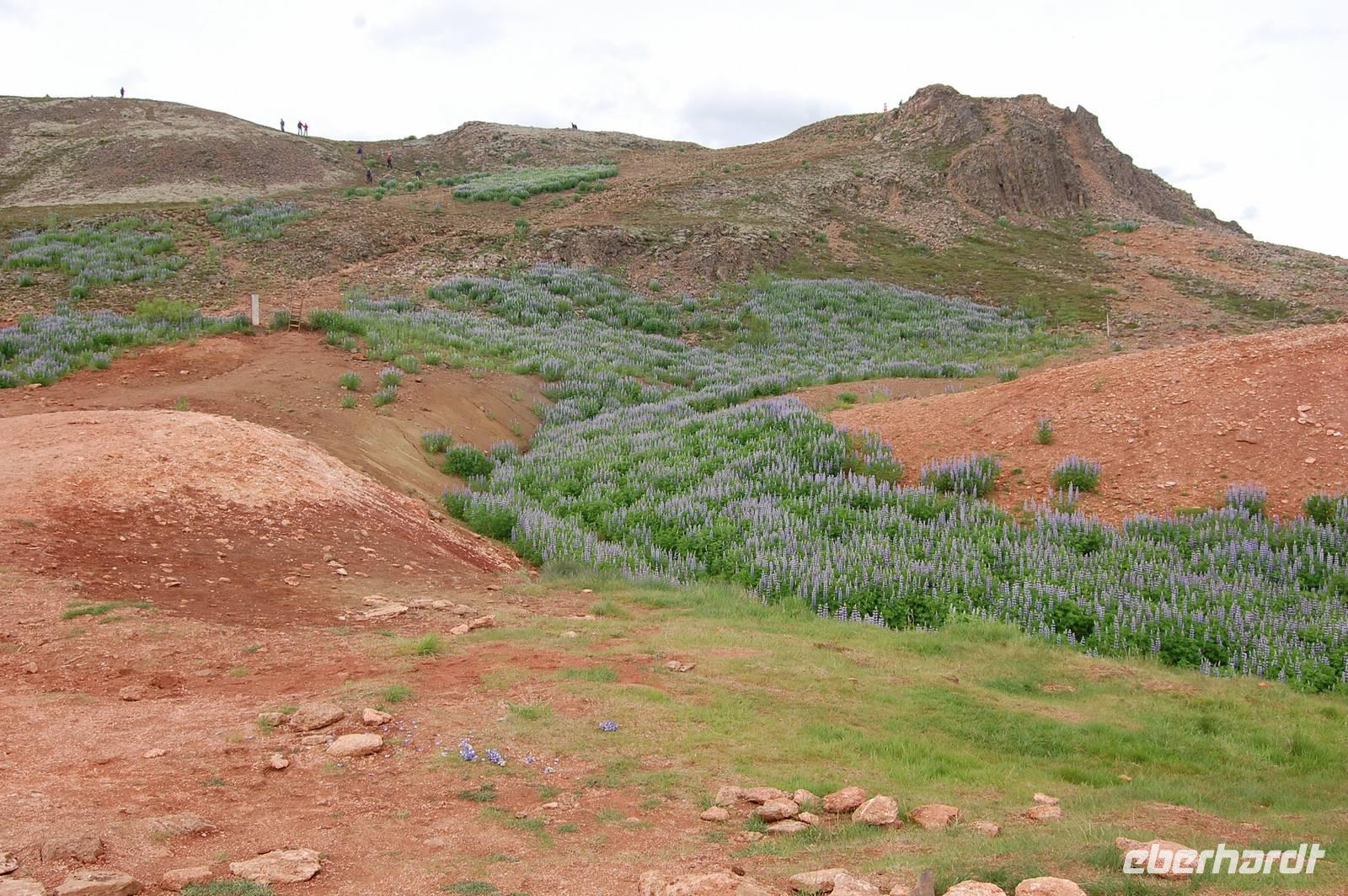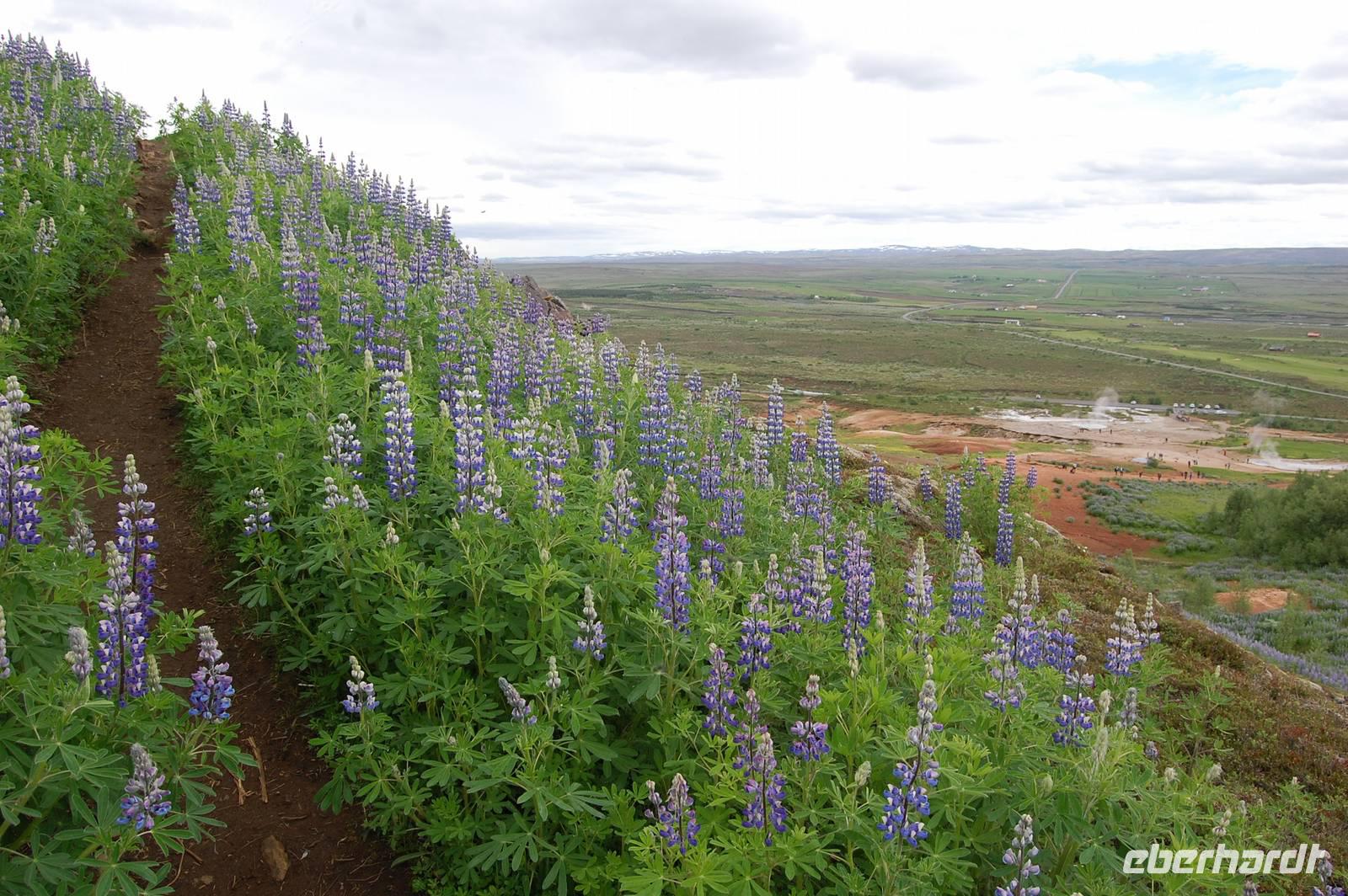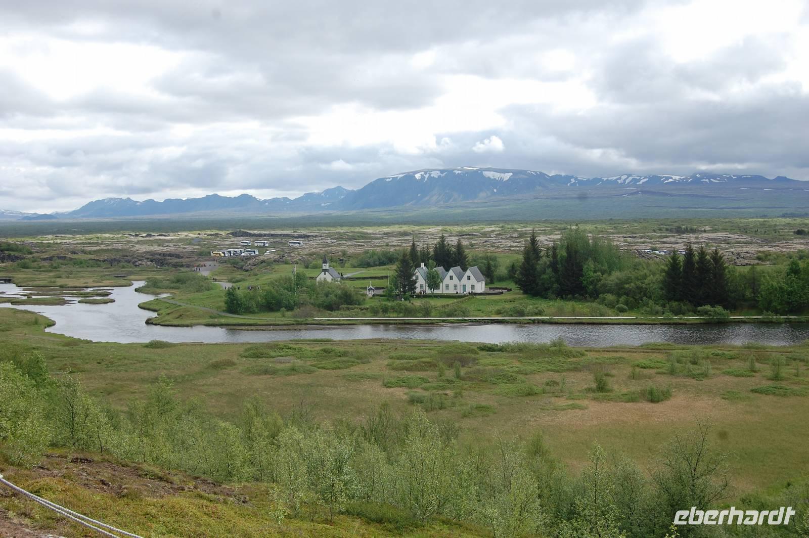 Pünktlich 09.00 Uhr starten wir mit unserem Reisebus. Unser Busfahrer für die gesamte Rundreise heißt Münte. Er fährt in Richtung Nordosten, wo wir in der Kleinstadt Mosfellsbaer an einer Bank stoppen um Geld zu tauschen. Schon nach kurzer Fahrzeit haben wir den etwas stärker besiedelten Großraum Reykjavik verlassen und sehen spärlich bewachsene Lava- und Hügellandschaften. In der Ferne leuchten lila die von Alaska-Lupinen bewachsenen Berghänge und gelangen in eine geologisch interessante Region. Bei einem Fotostopp oberhalb des Sees Pingvallavatn erkennen wir die geotektonische Grenze zwischen Europa und Amerika, denn hier an dieser Nahtstelle driften die amerikanische und die eurasische Platte Jahr für Jahr um einige Zentimeter auseinander.