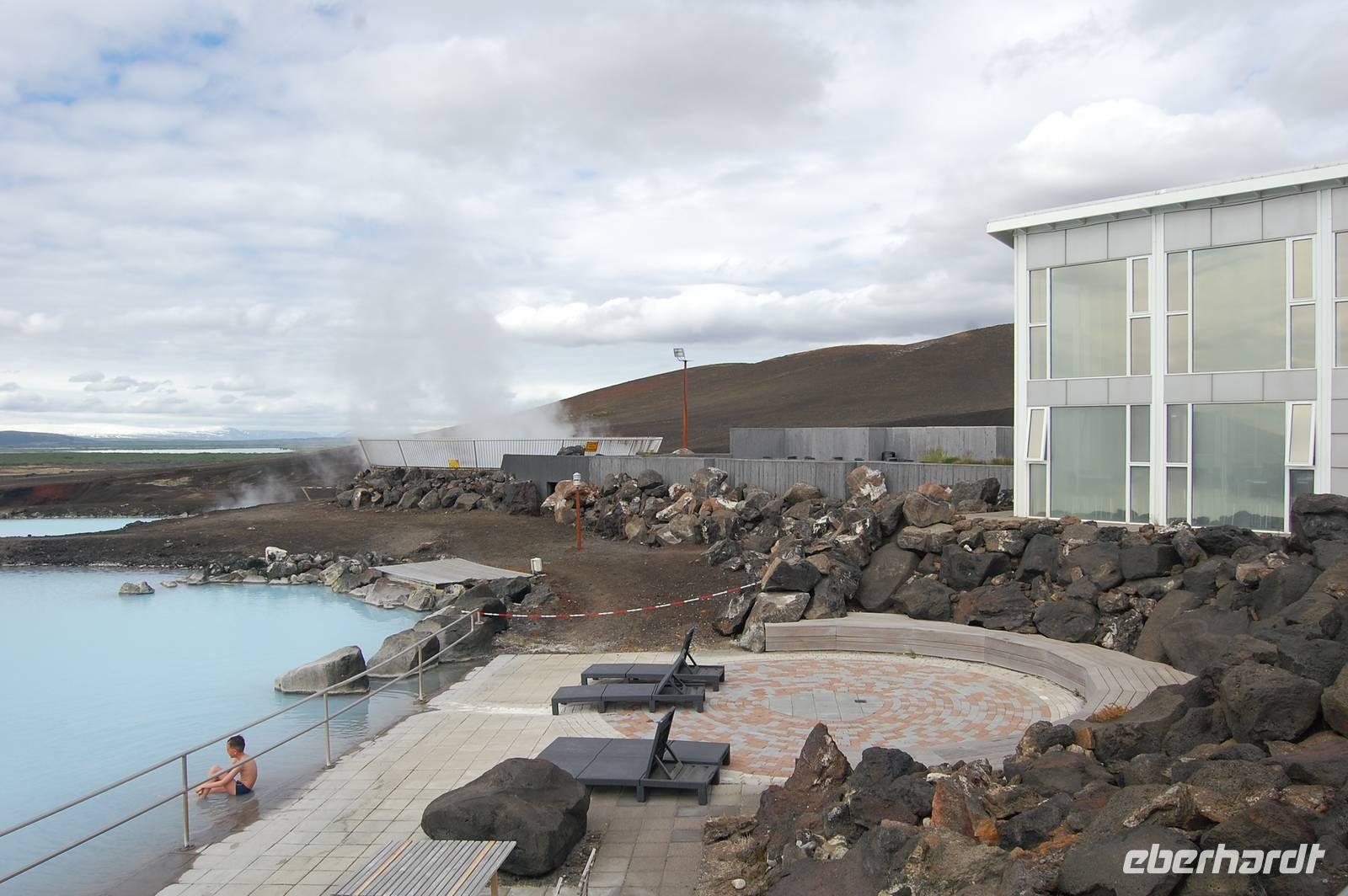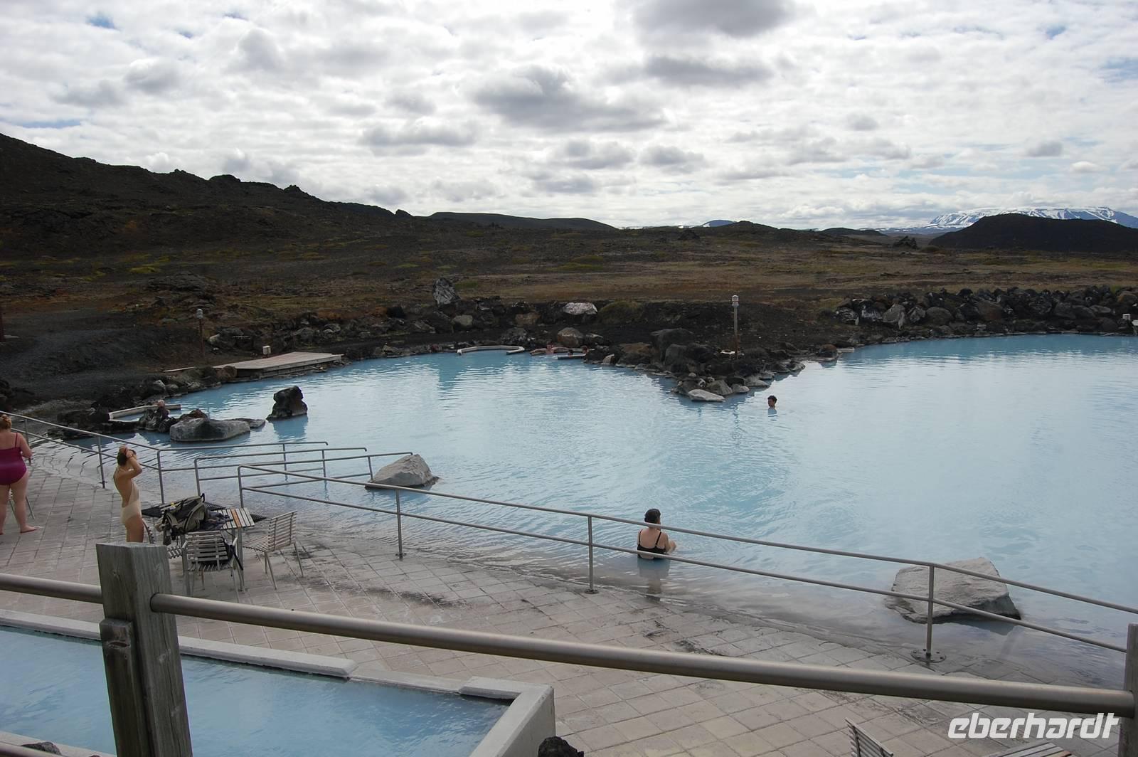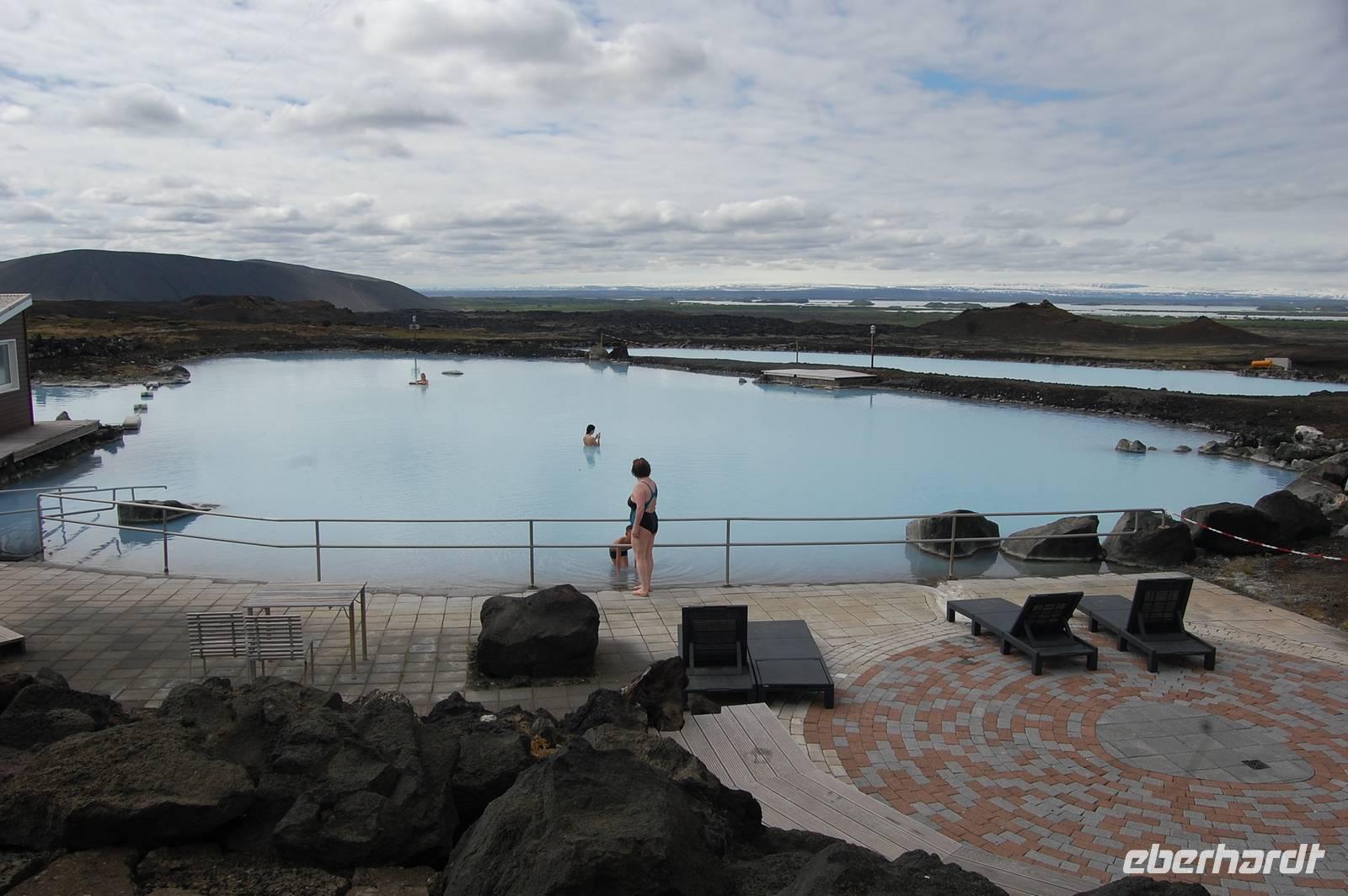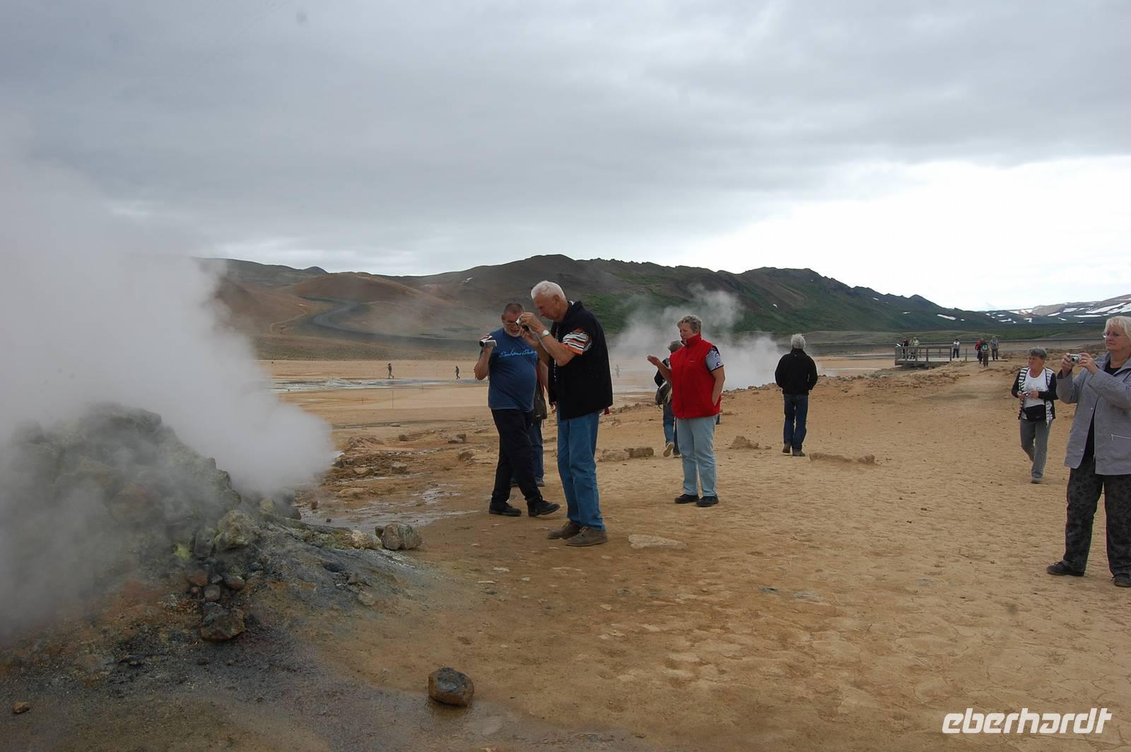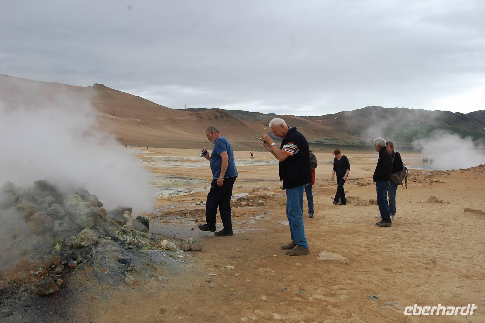 Nach einer kurzen Fahrt steigen wir an einem Lava-Labyrinth aus, um durch die sog. „Dunklen Burgen" zu wandern. Wir sehen bizarre Lava-Formationen und in der Ferne einen mächtigen Ringwallkrater, der vor 3500 Jahren entstand. Auch bei diesem halbstündigen Spaziergang begleiten uns leider die lästigen Fliegen. Wieder bringt uns der Bus nur ein kurzes Stück und so sind wir schon mittags am Eingang des Thermalbades „Jardbödin". Hier können wir endlich entspannen. In zwei großen, natürlichen Thermalbecken räkeln wir uns im angenehm heißen Wasser und besuchen die Dampfsauna. Es besteht hier auch gleich die Möglichkeit, etwas zu essen.