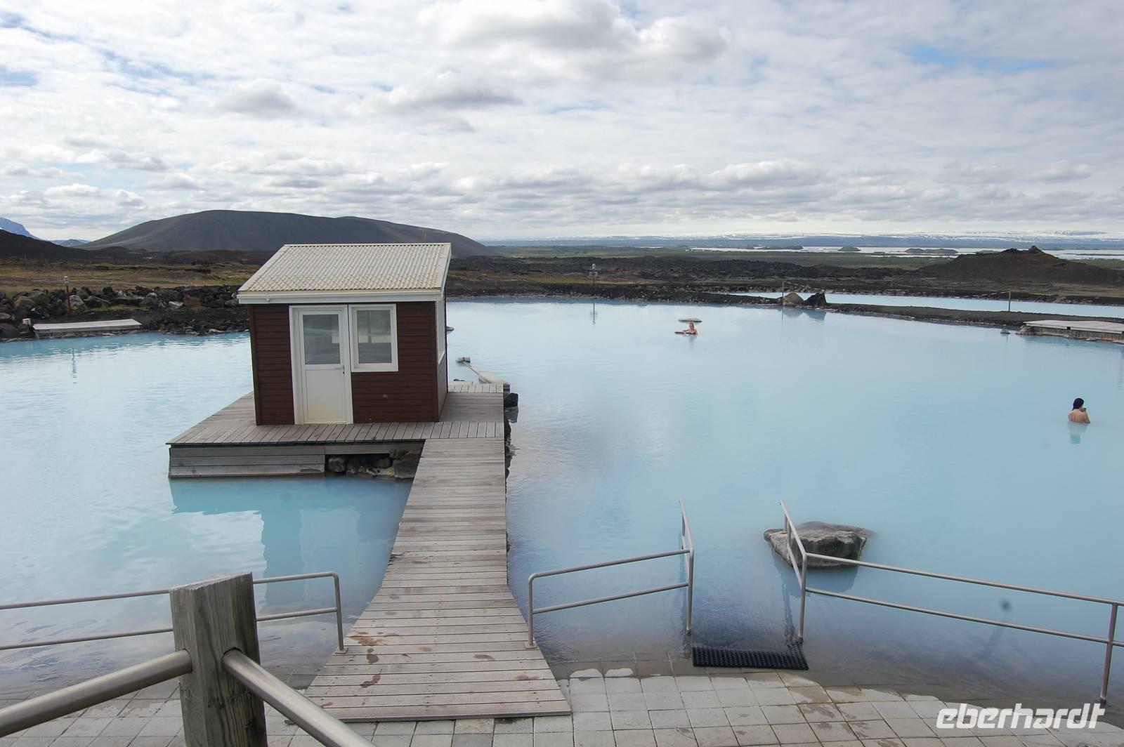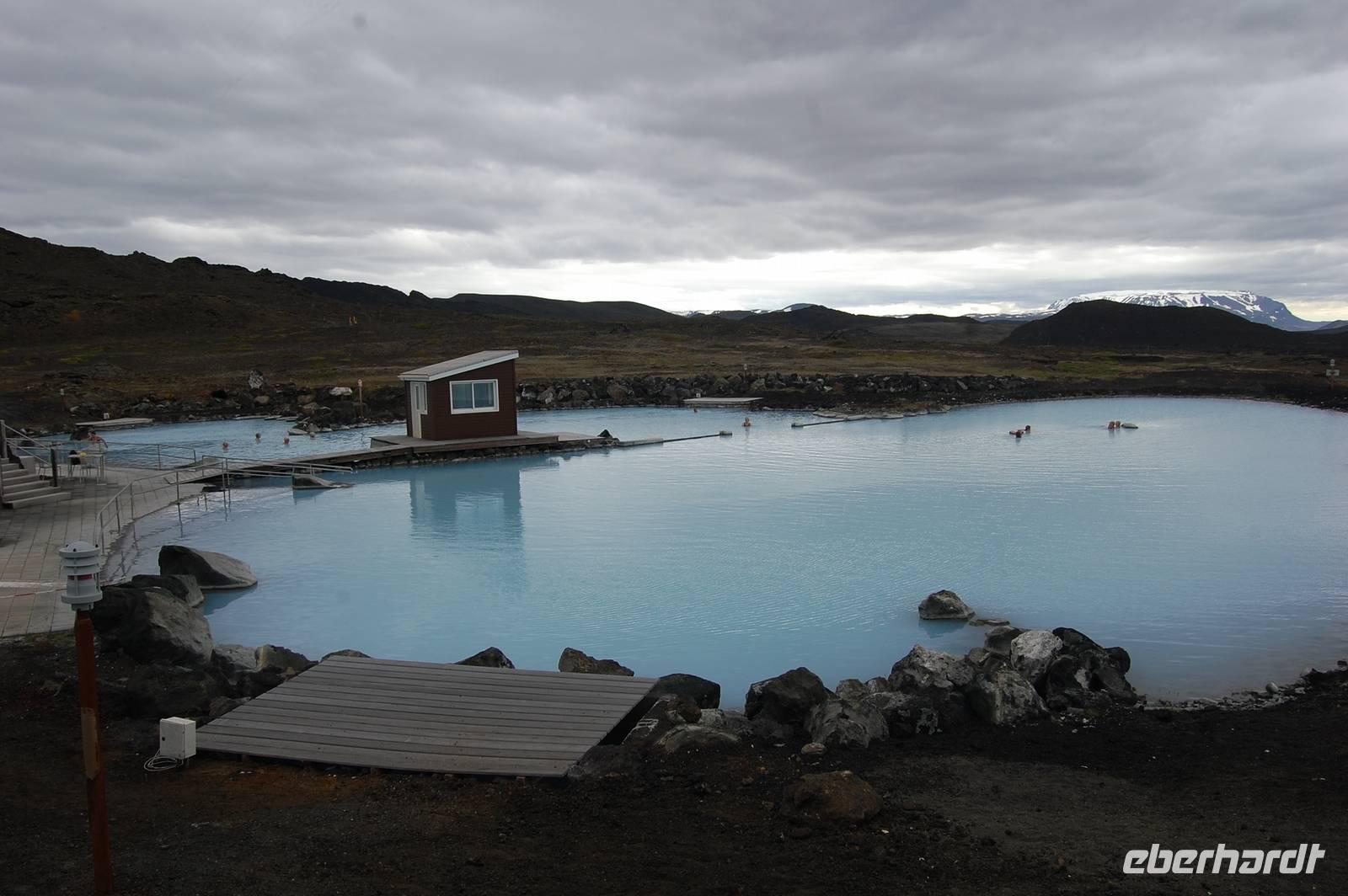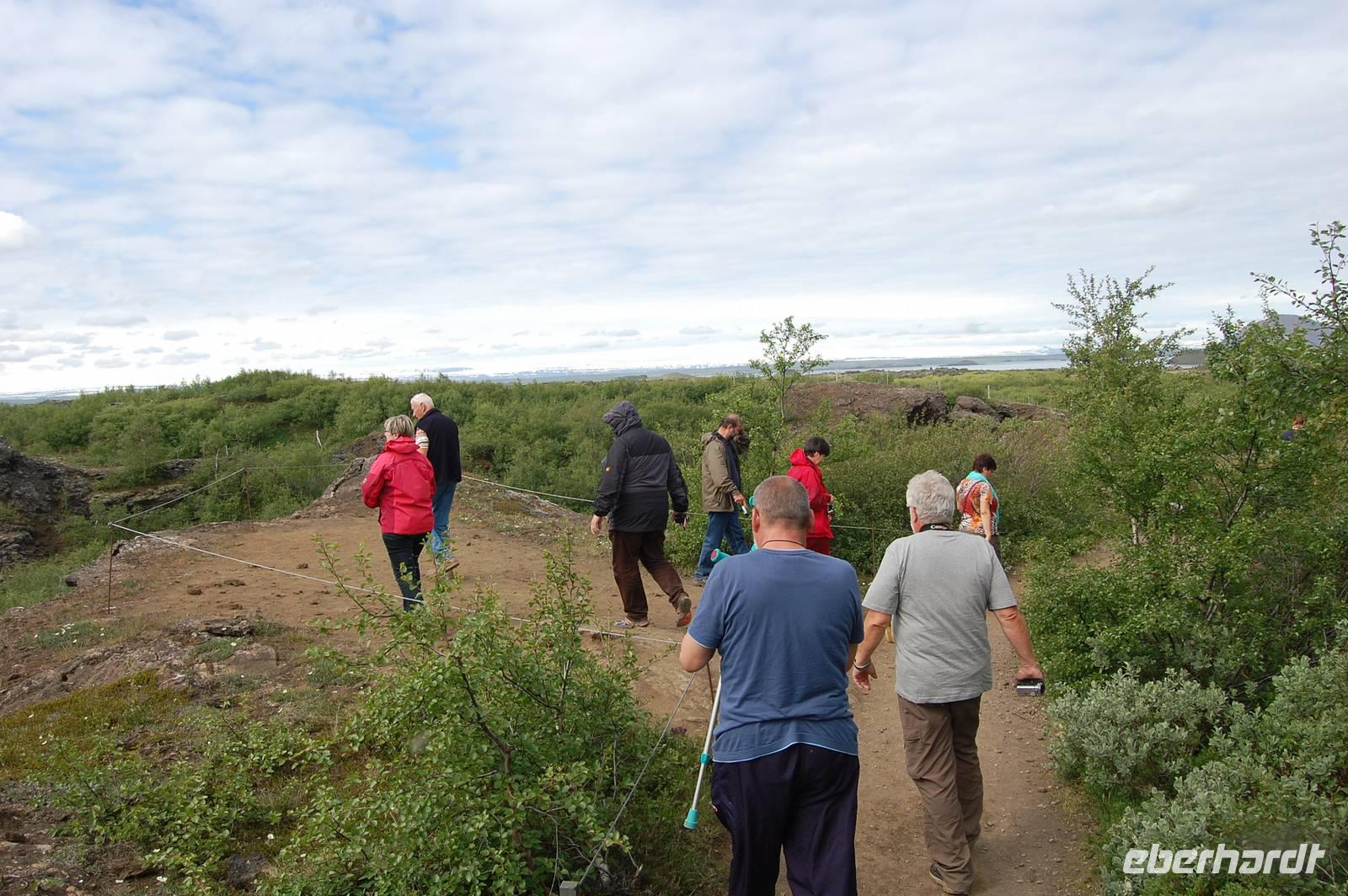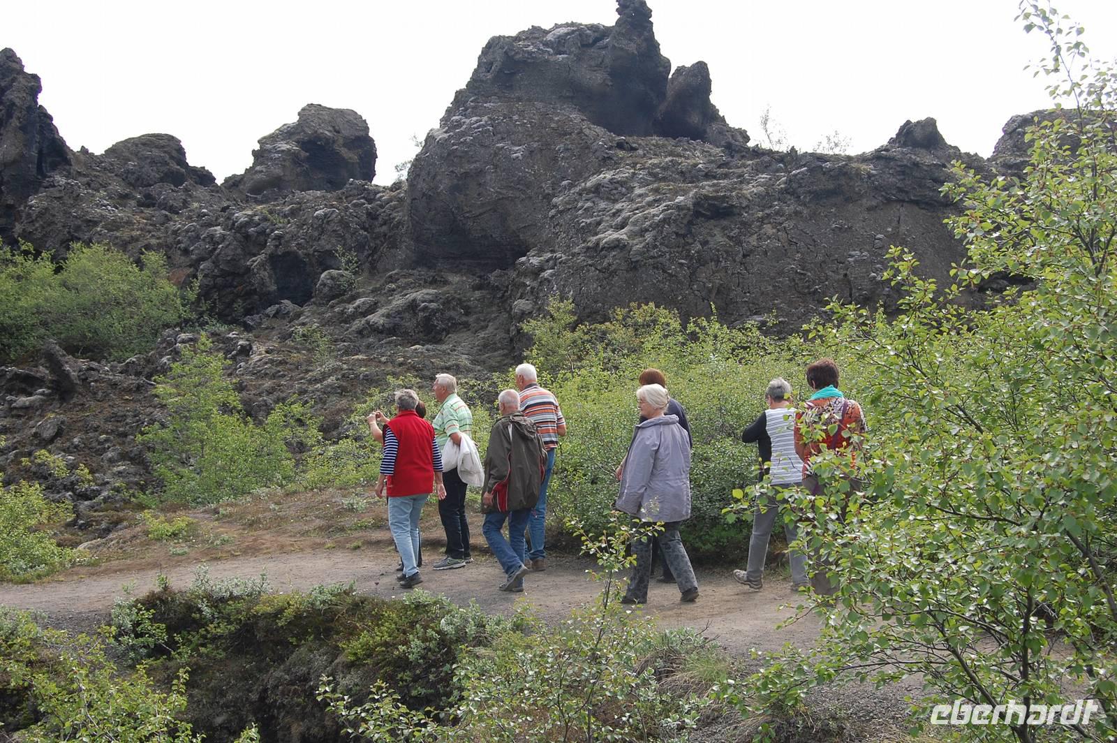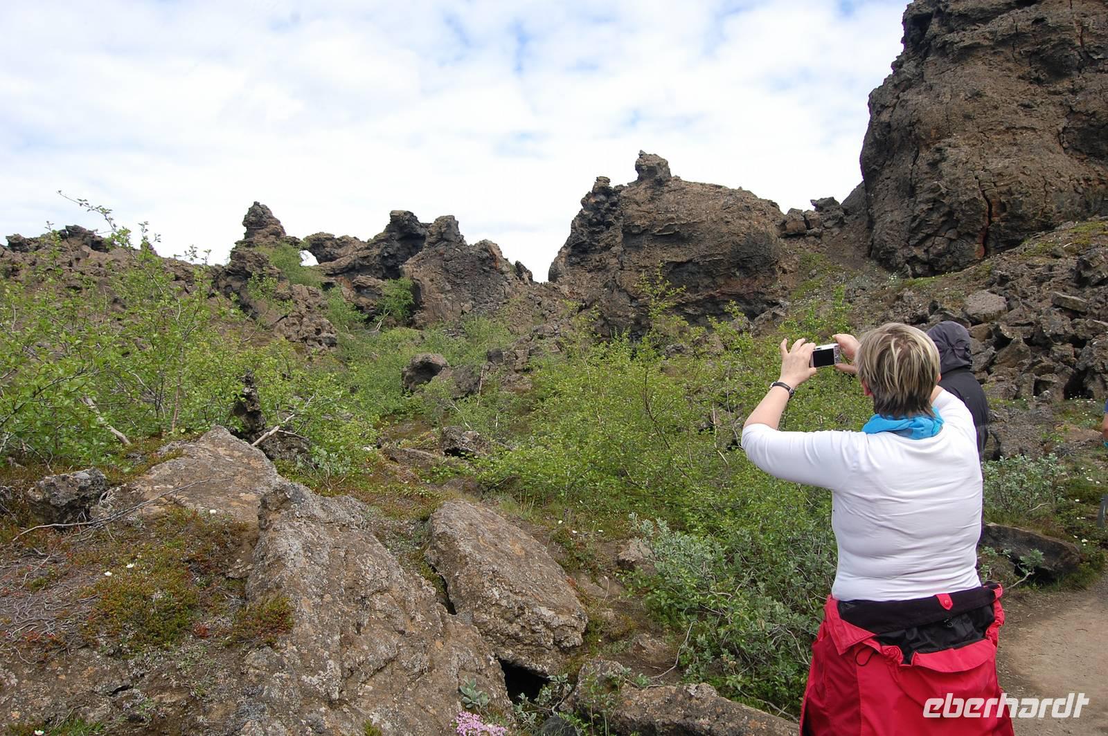 Nach einer kurzen Fahrt steigen wir an einem Lava-Labyrinth aus, um durch die sog. „Dunklen Burgen" zu wandern. Wir sehen bizarre Lava-Formationen und in der Ferne einen mächtigen Ringwallkrater, der vor 3500 Jahren entstand. Auch bei diesem halbstündigen Spaziergang begleiten uns leider die lästigen Fliegen. Wieder bringt uns der Bus nur ein kurzes Stück und so sind wir schon mittags am Eingang des Thermalbades „Jardbödin". Hier können wir endlich entspannen. In zwei großen, natürlichen Thermalbecken räkeln wir uns im angenehm heißen Wasser und besuchen die Dampfsauna. Es besteht hier auch gleich die Möglichkeit, etwas zu essen.