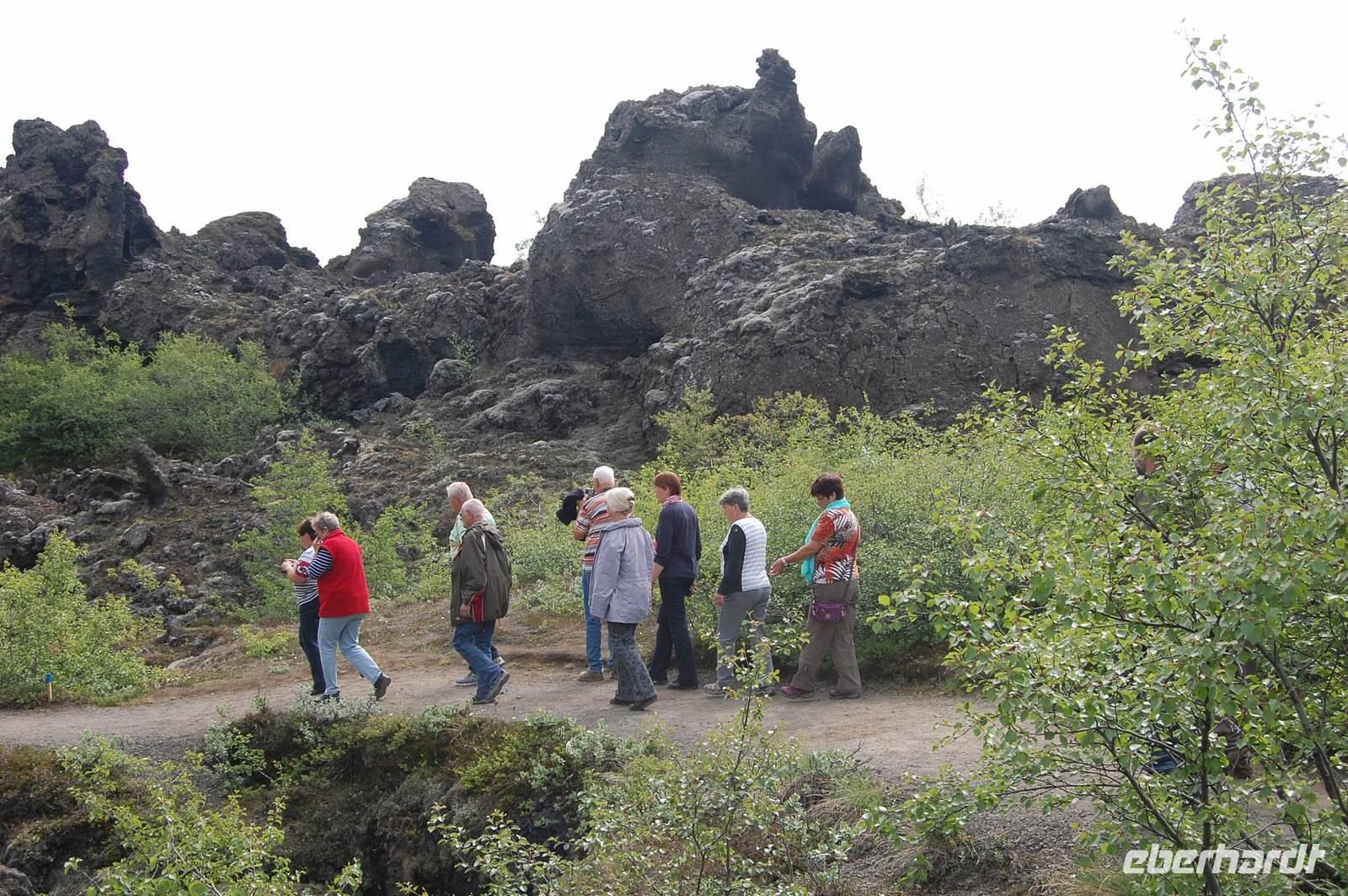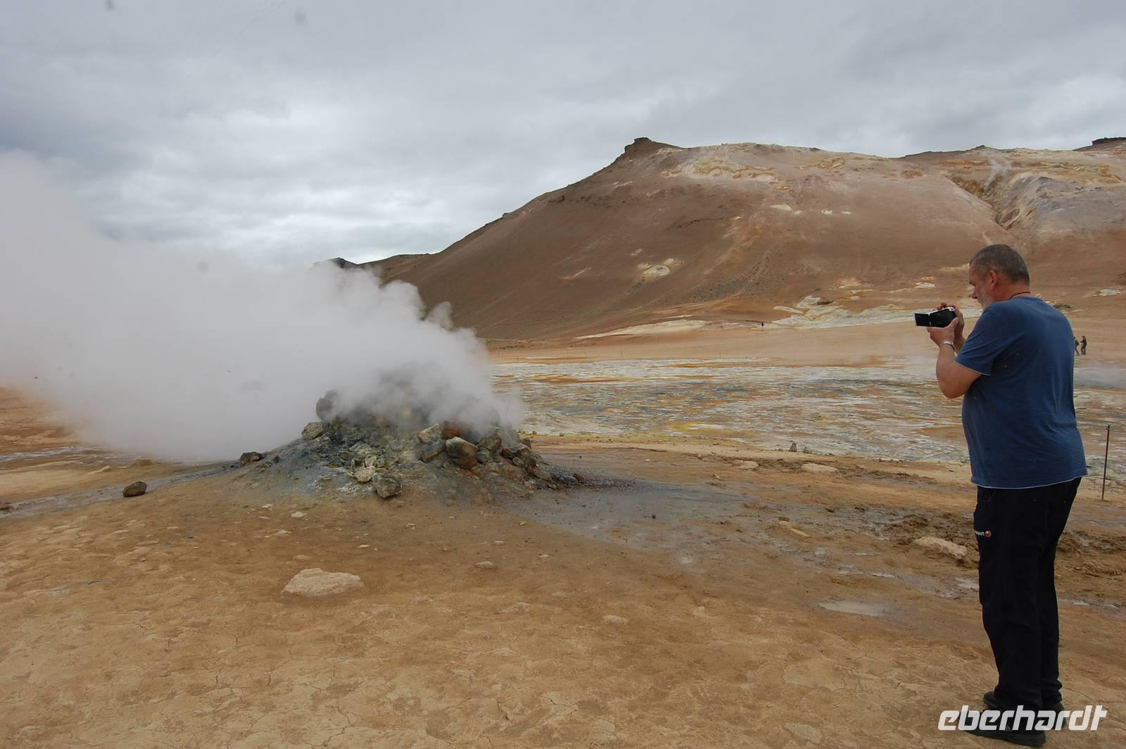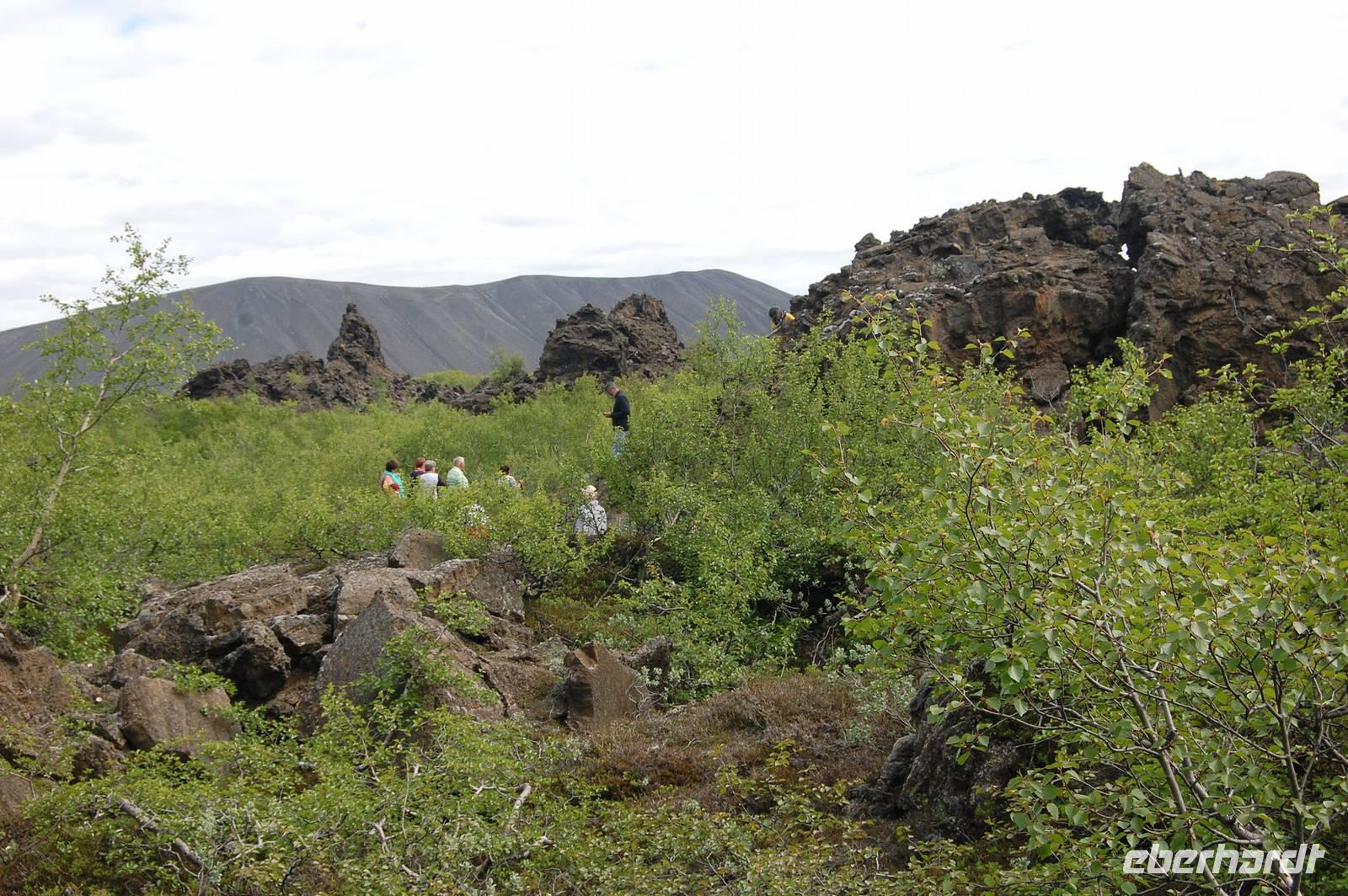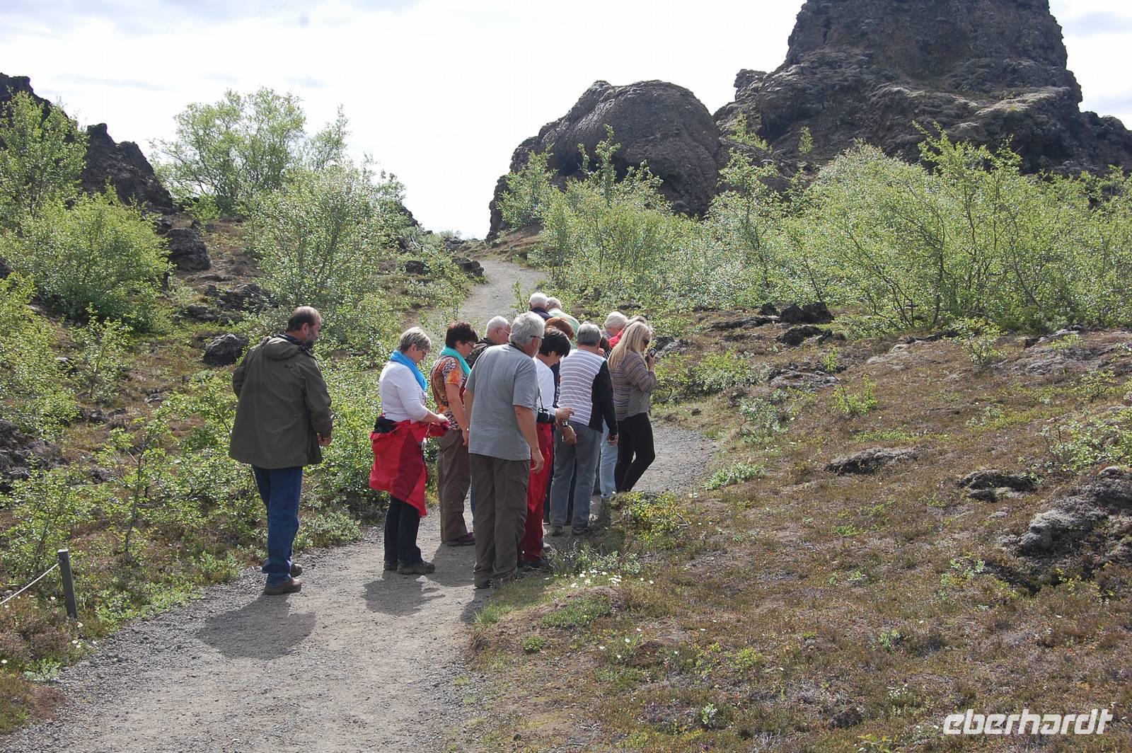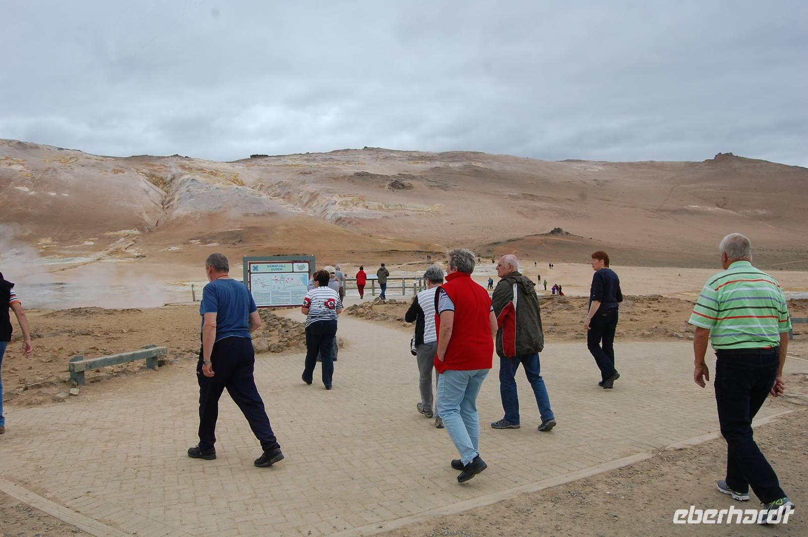 Nach einer kurzen Fahrt steigen wir an einem Lava-Labyrinth aus, um durch die sog. „Dunklen Burgen" zu wandern. Wir sehen bizarre Lava-Formationen und in der Ferne einen mächtigen Ringwallkrater, der vor 3500 Jahren entstand. Auch bei diesem halbstündigen Spaziergang begleiten uns leider die lästigen Fliegen. Wieder bringt uns der Bus nur ein kurzes Stück und so sind wir schon mittags am Eingang des Thermalbades „Jardbödin". Hier können wir endlich entspannen. In zwei großen, natürlichen Thermalbecken räkeln wir uns im angenehm heißen Wasser und besuchen die Dampfsauna. Es besteht hier auch gleich die Möglichkeit, etwas zu essen.