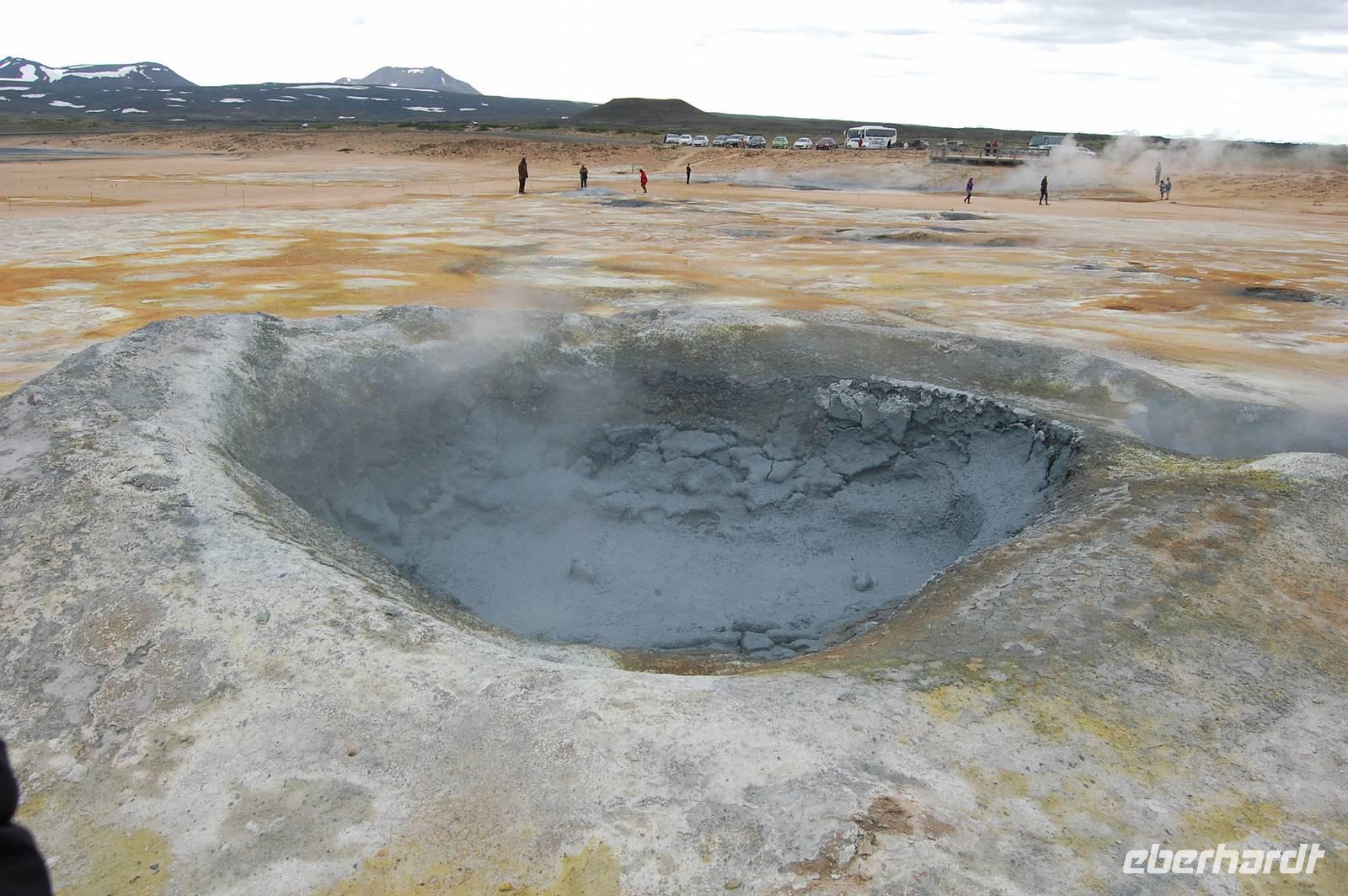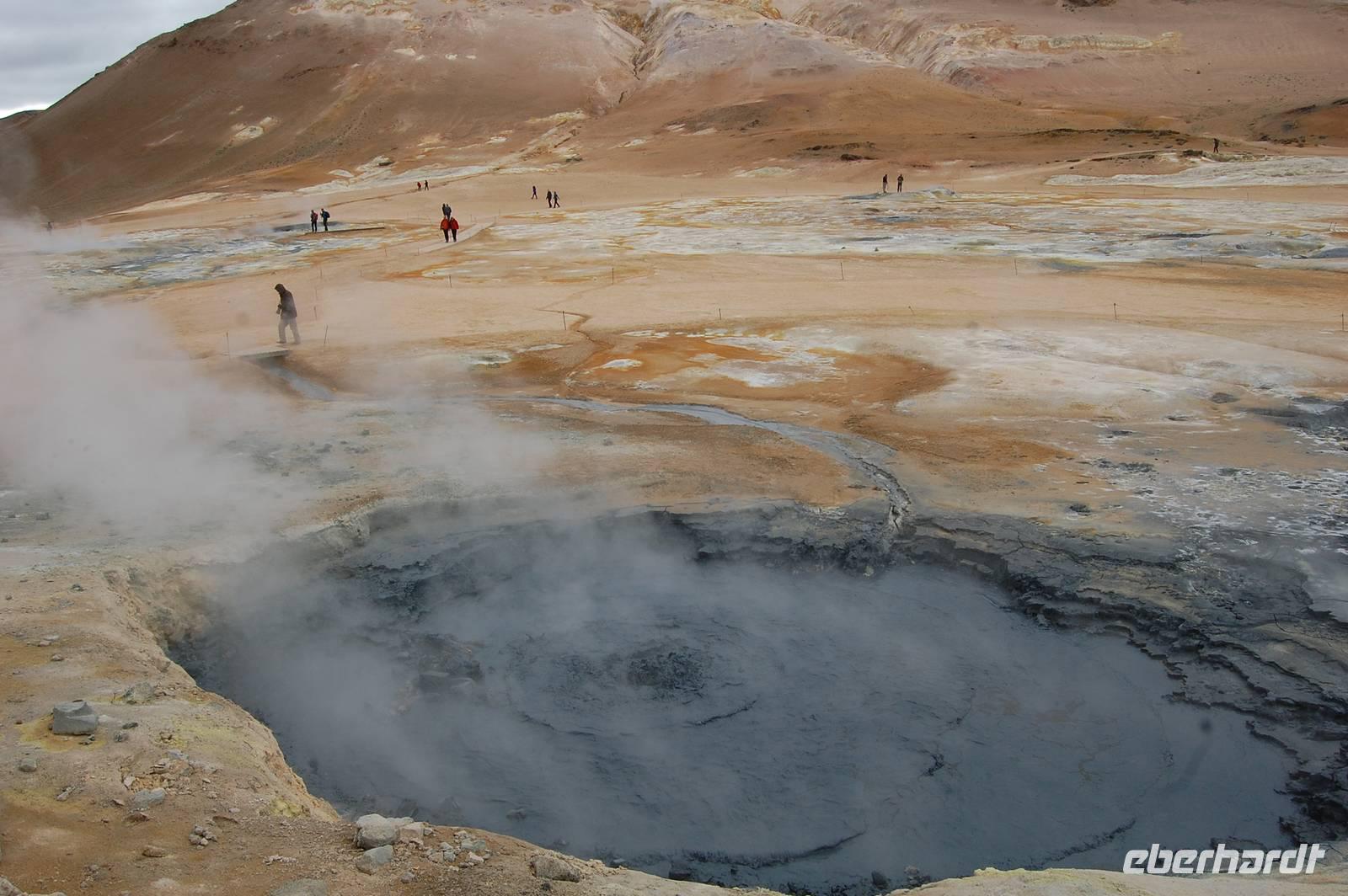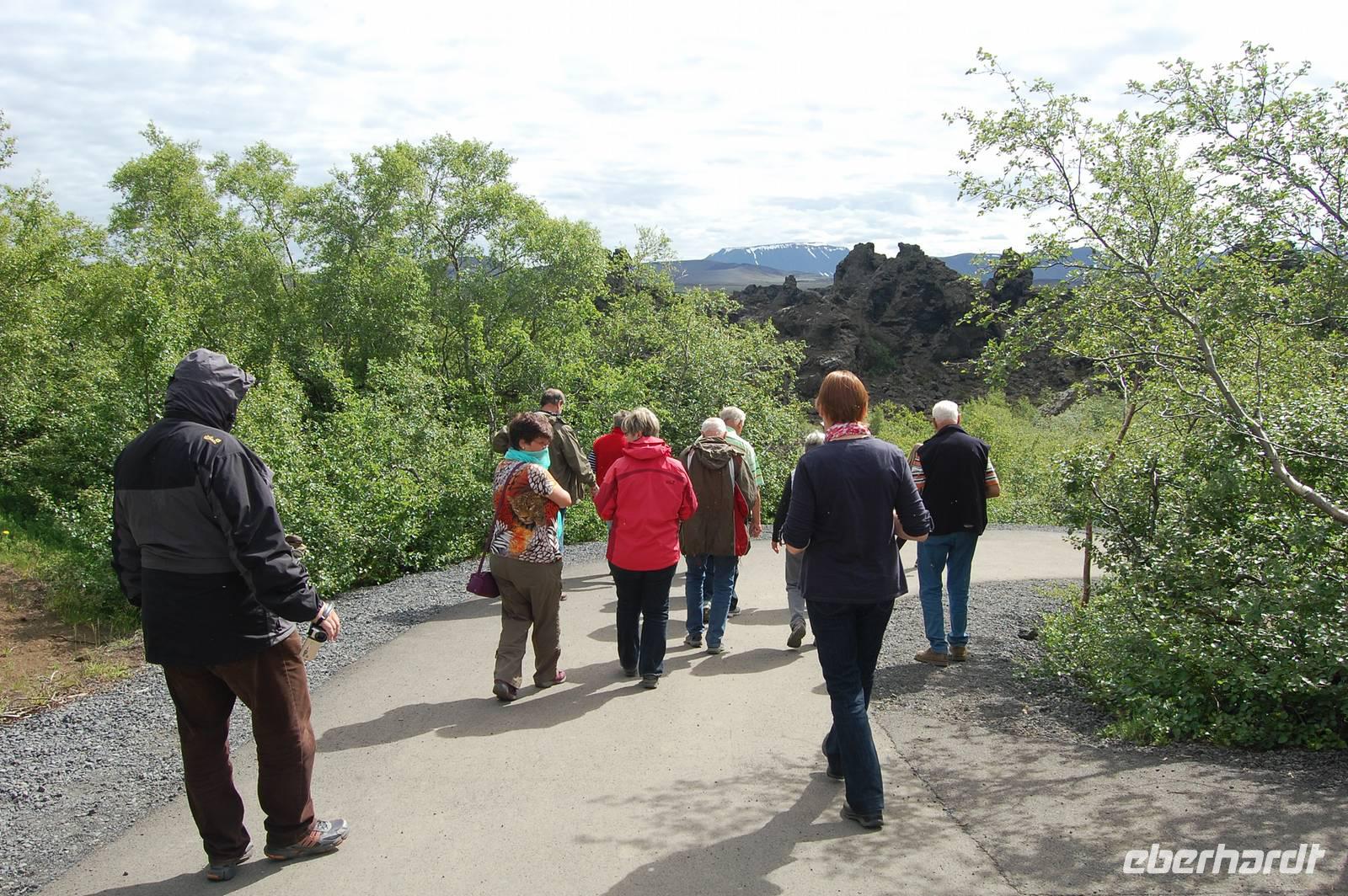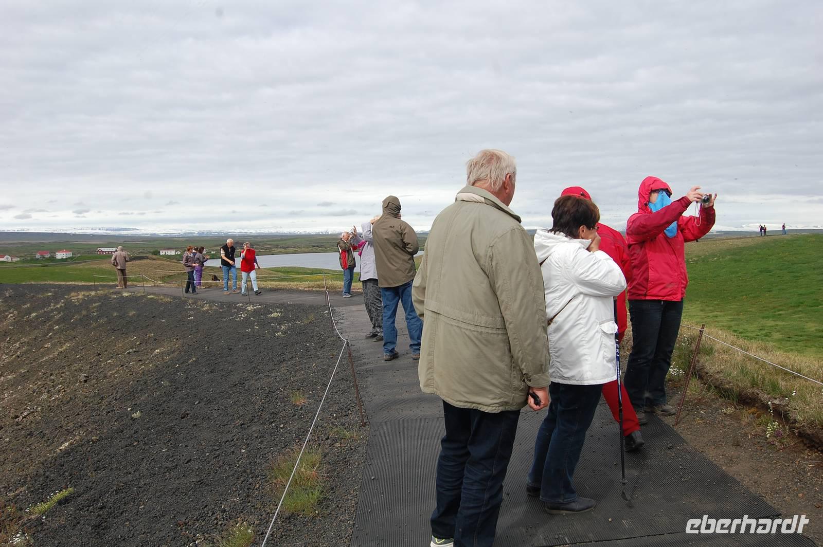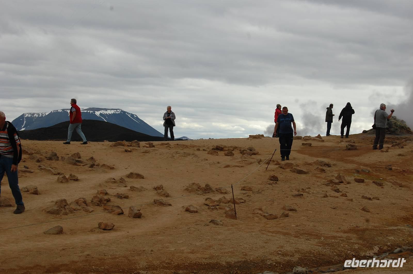 Nach einer kurzen Fahrt steigen wir an einem Lava-Labyrinth aus, um durch die sog. „Dunklen Burgen" zu wandern. Wir sehen bizarre Lava-Formationen und in der Ferne einen mächtigen Ringwallkrater, der vor 3500 Jahren entstand. Auch bei diesem halbstündigen Spaziergang begleiten uns leider die lästigen Fliegen. Wieder bringt uns der Bus nur ein kurzes Stück und so sind wir schon mittags am Eingang des Thermalbades „Jardbödin". Hier können wir endlich entspannen. In zwei großen, natürlichen Thermalbecken räkeln wir uns im angenehm heißen Wasser und besuchen die Dampfsauna. Es besteht hier auch gleich die Möglichkeit, etwas zu essen.