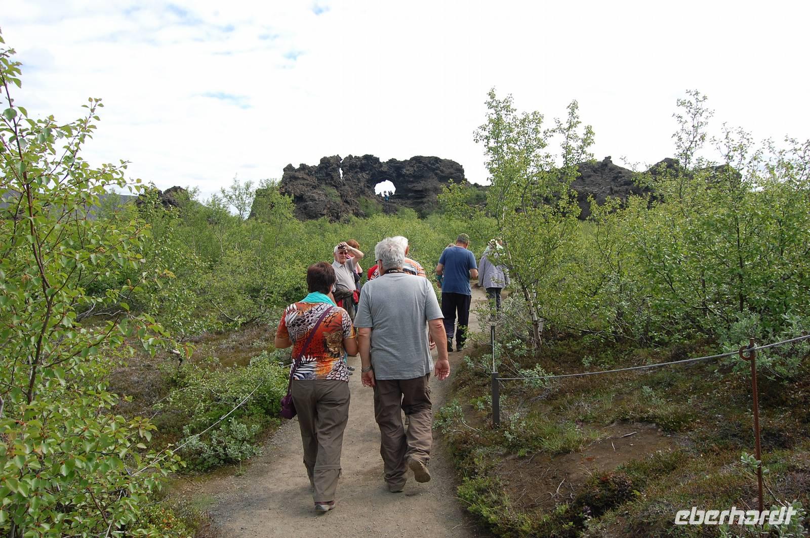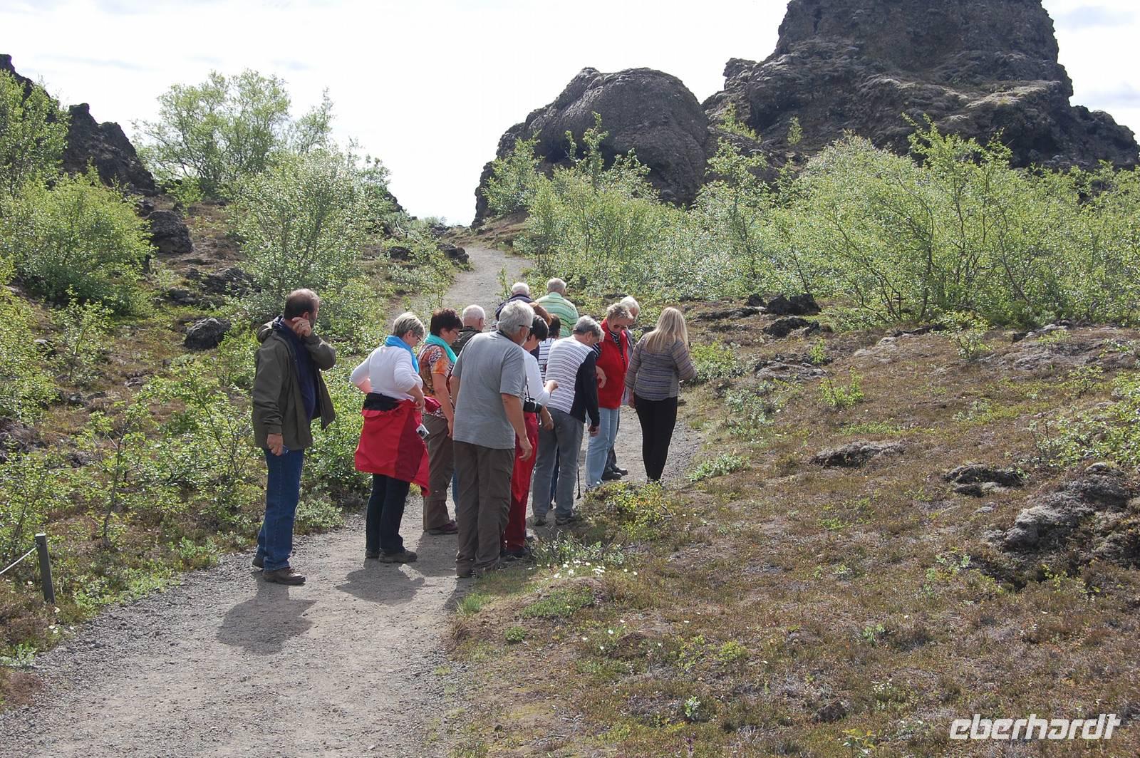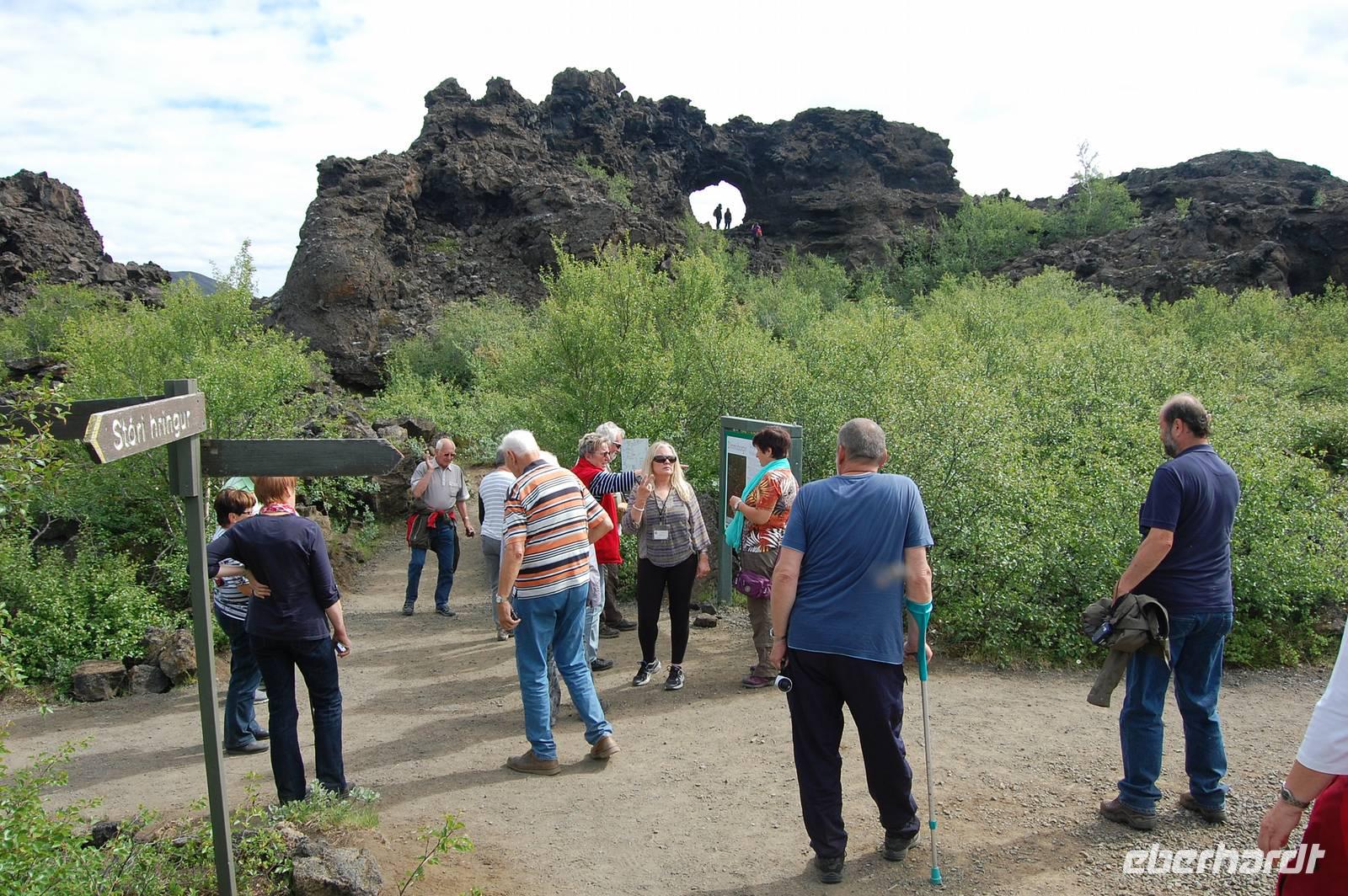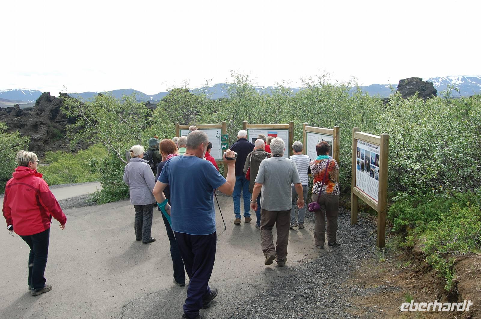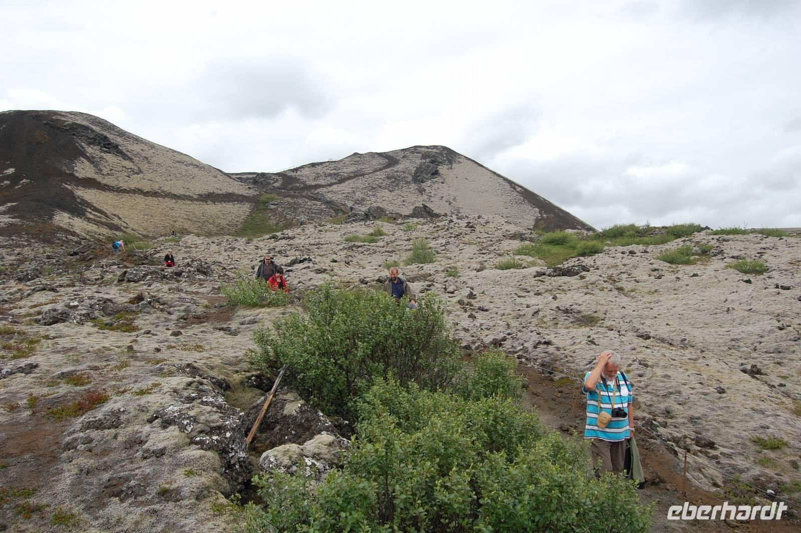Nach einer kurzen Fahrt steigen wir an einem Lava-Labyrinth aus, um durch die sog. „Dunklen Burgen" zu wandern. Wir sehen bizarre Lava-Formationen und in der Ferne einen mächtigen Ringwallkrater, der vor 3500 Jahren entstand. Auch bei diesem halbstündigen Spaziergang begleiten uns leider die lästigen Fliegen. Wieder bringt uns der Bus nur ein kurzes Stück und so sind wir schon mittags am Eingang des Thermalbades „Jardbödin". Hier können wir endlich entspannen. In zwei großen, natürlichen Thermalbecken räkeln wir uns im angenehm heißen Wasser und besuchen die Dampfsauna. Es besteht hier auch gleich die Möglichkeit, etwas zu essen.