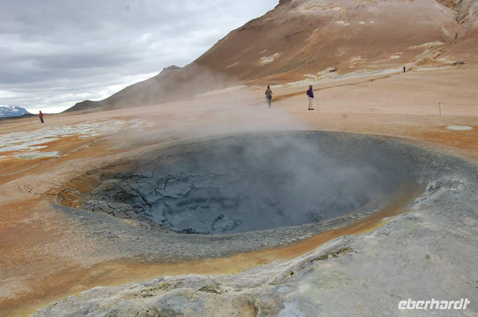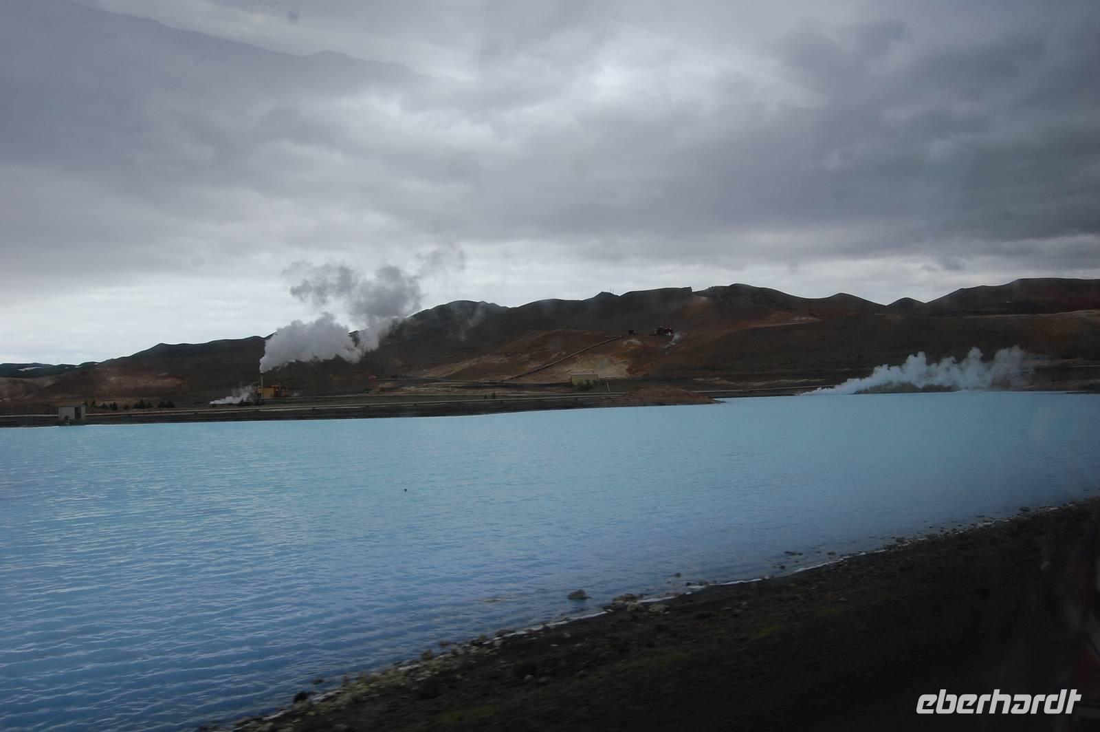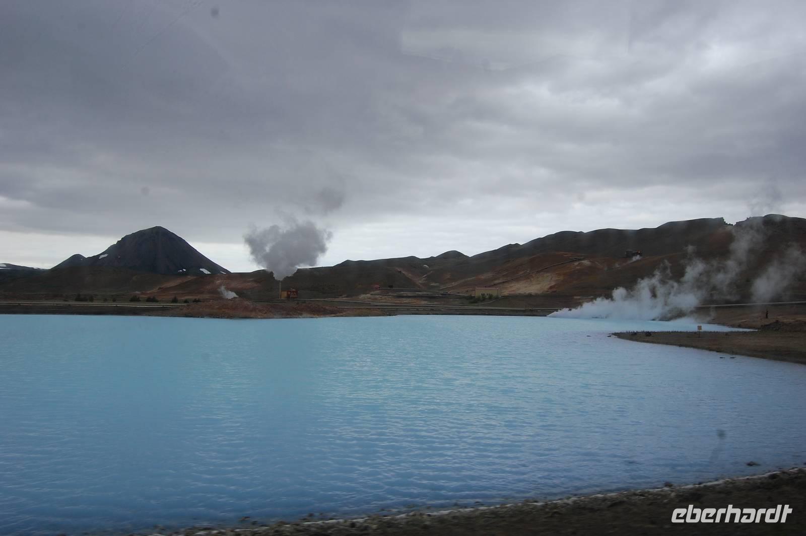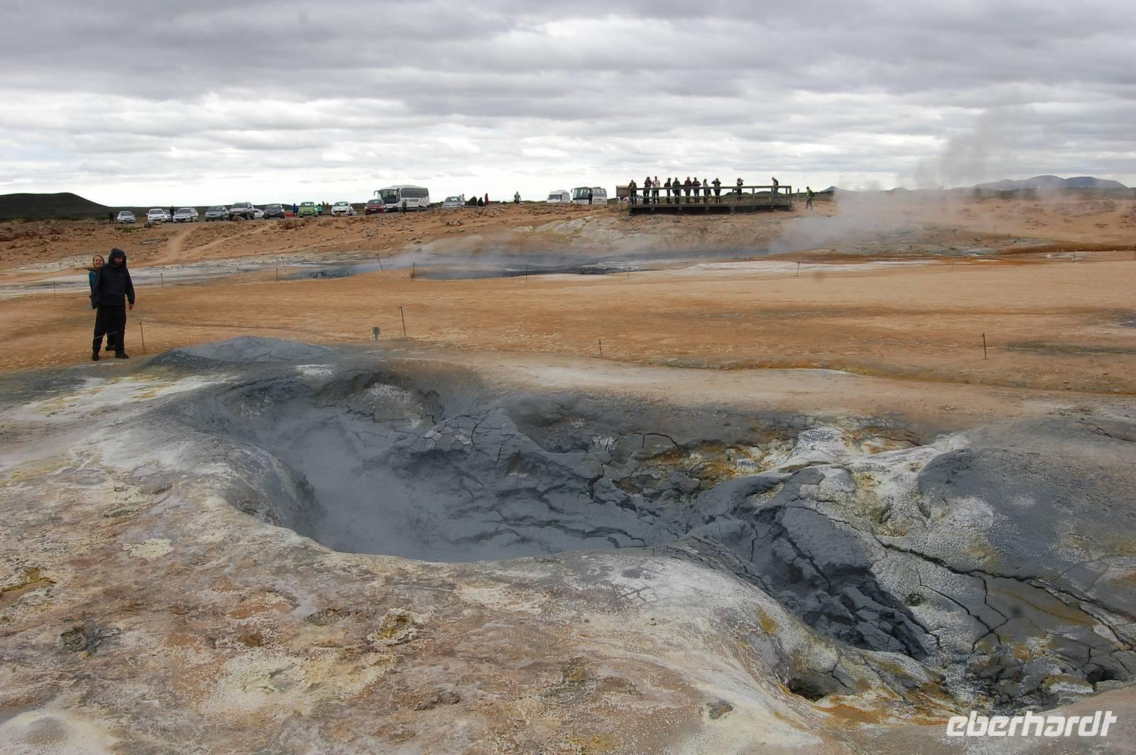 Nach einer kurzen Fahrt steigen wir an einem Lava-Labyrinth aus, um durch die sog. „Dunklen Burgen" zu wandern. Wir sehen bizarre Lava-Formationen und in der Ferne einen mächtigen Ringwallkrater, der vor 3500 Jahren entstand. Auch bei diesem halbstündigen Spaziergang begleiten uns leider die lästigen Fliegen. Wieder bringt uns der Bus nur ein kurzes Stück und so sind wir schon mittags am Eingang des Thermalbades „Jardbödin". Hier können wir endlich entspannen. In zwei großen, natürlichen Thermalbecken räkeln wir uns im angenehm heißen Wasser und besuchen die Dampfsauna. Es besteht hier auch gleich die Möglichkeit, etwas zu essen.