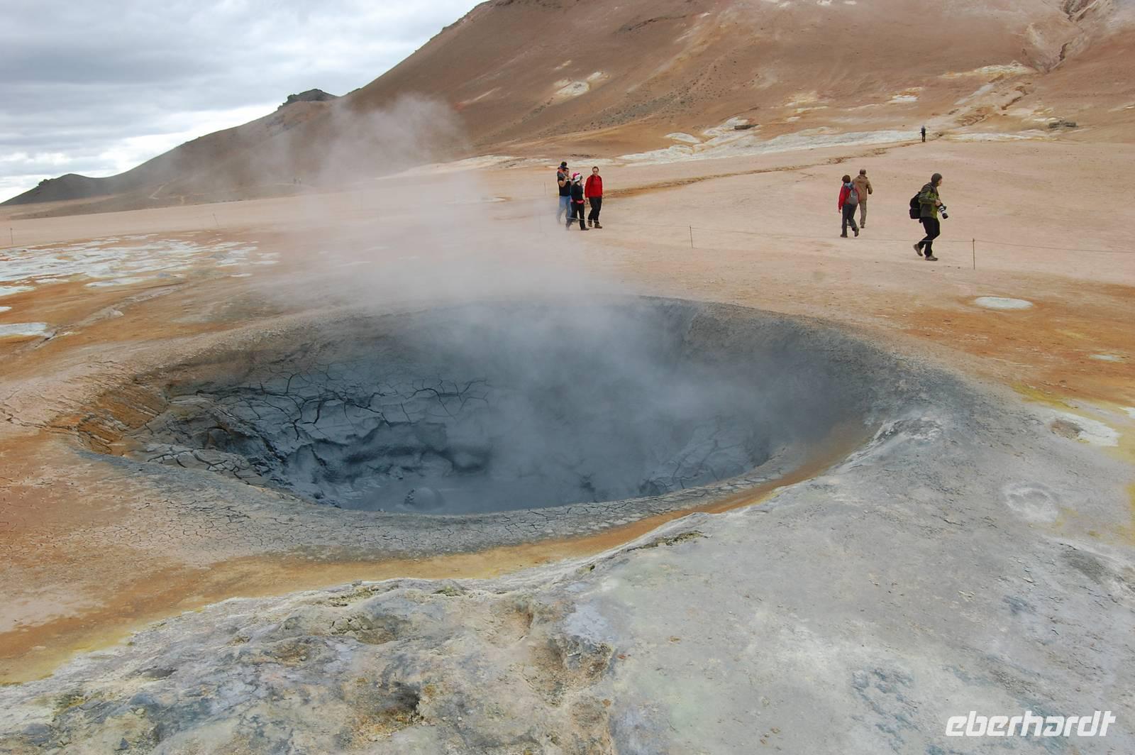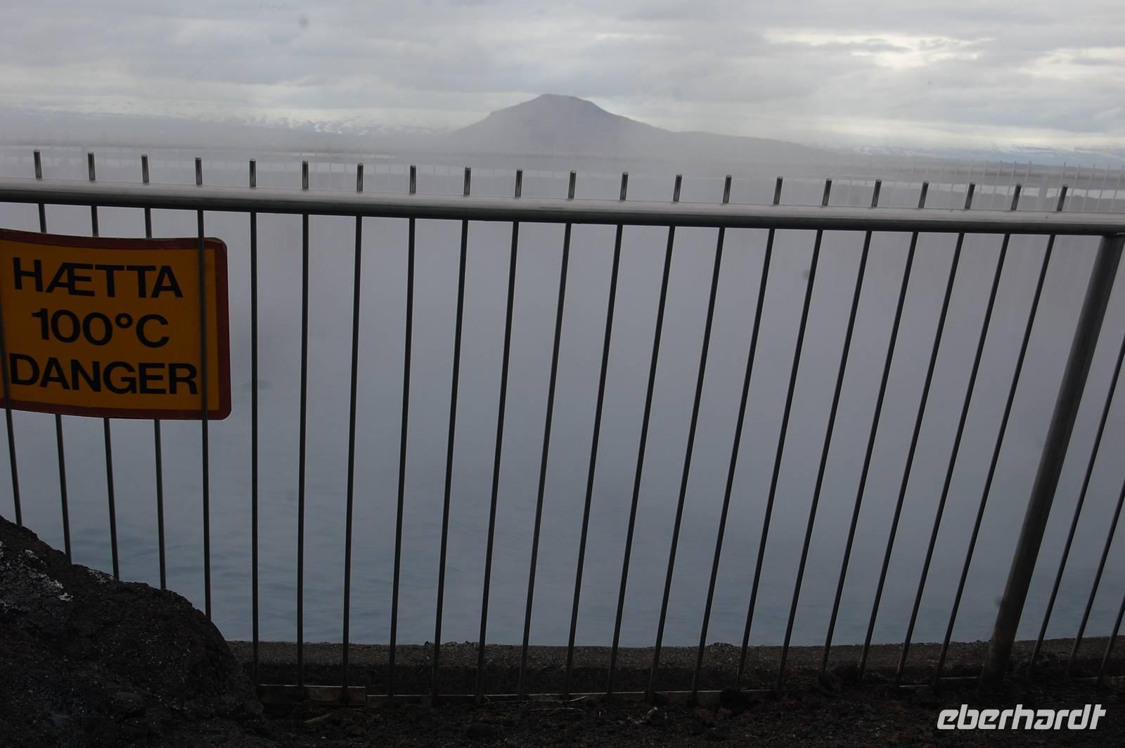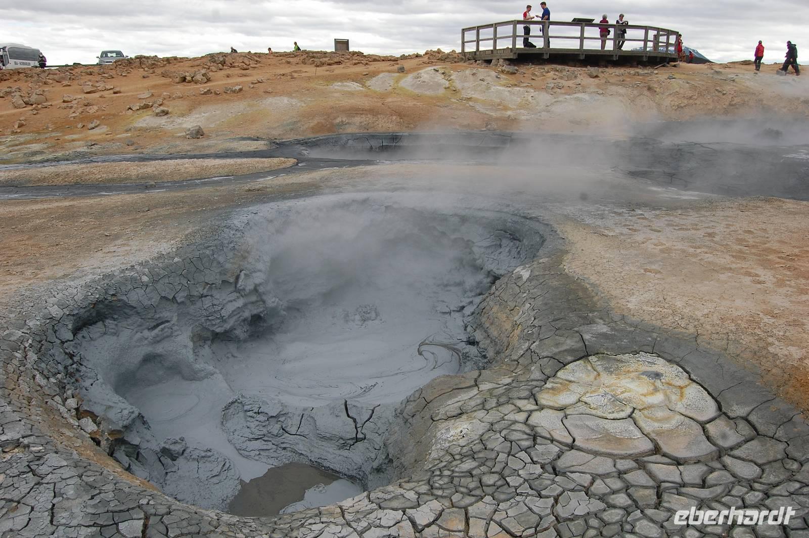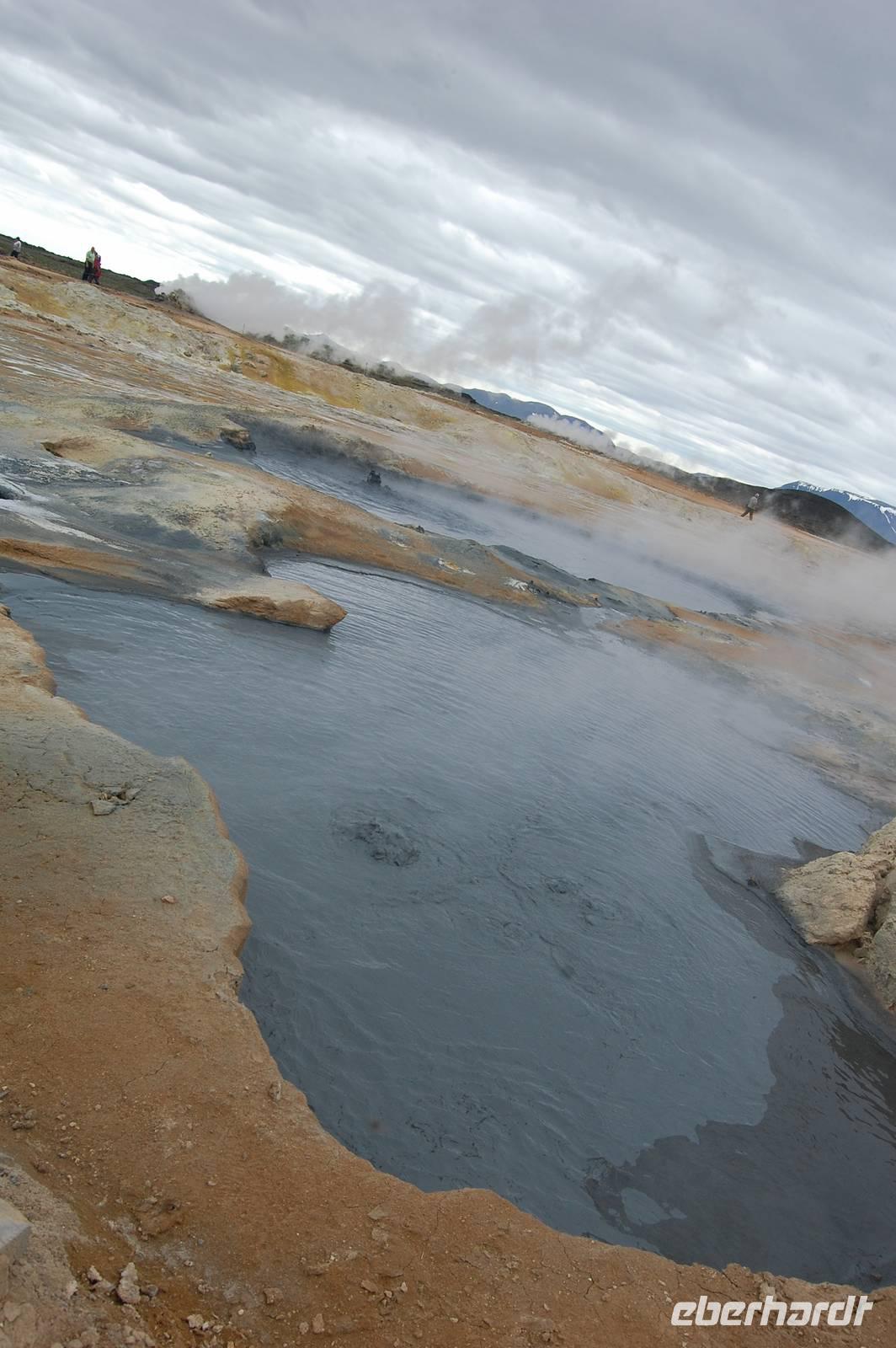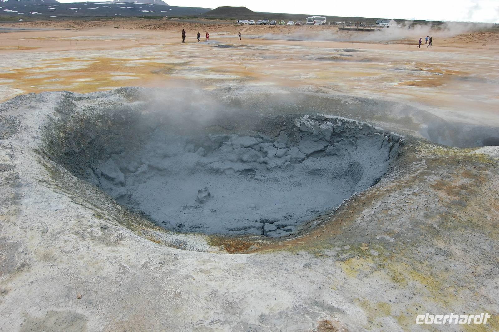 Nach einer kurzen Fahrt steigen wir an einem Lava-Labyrinth aus, um durch die sog. „Dunklen Burgen" zu wandern. Wir sehen bizarre Lava-Formationen und in der Ferne einen mächtigen Ringwallkrater, der vor 3500 Jahren entstand. Auch bei diesem halbstündigen Spaziergang begleiten uns leider die lästigen Fliegen. Wieder bringt uns der Bus nur ein kurzes Stück und so sind wir schon mittags am Eingang des Thermalbades „Jardbödin". Hier können wir endlich entspannen. In zwei großen, natürlichen Thermalbecken räkeln wir uns im angenehm heißen Wasser und besuchen die Dampfsauna. Es besteht hier auch gleich die Möglichkeit, etwas zu essen.