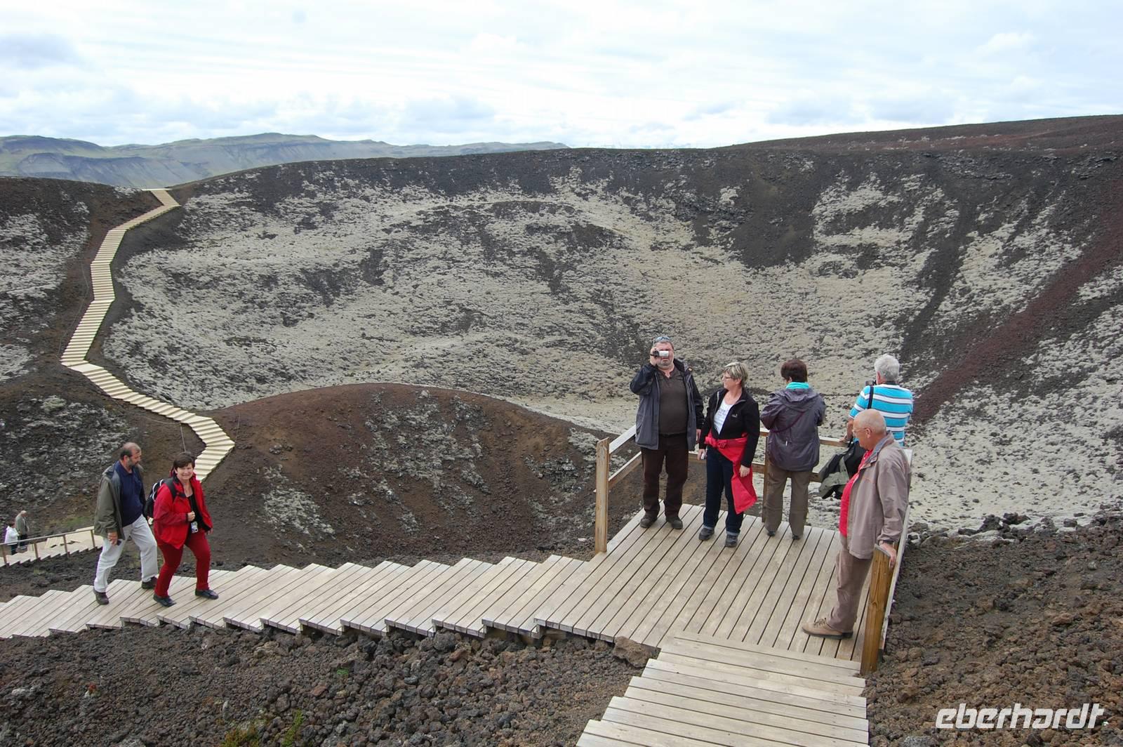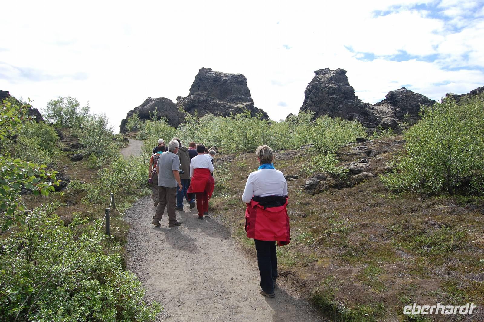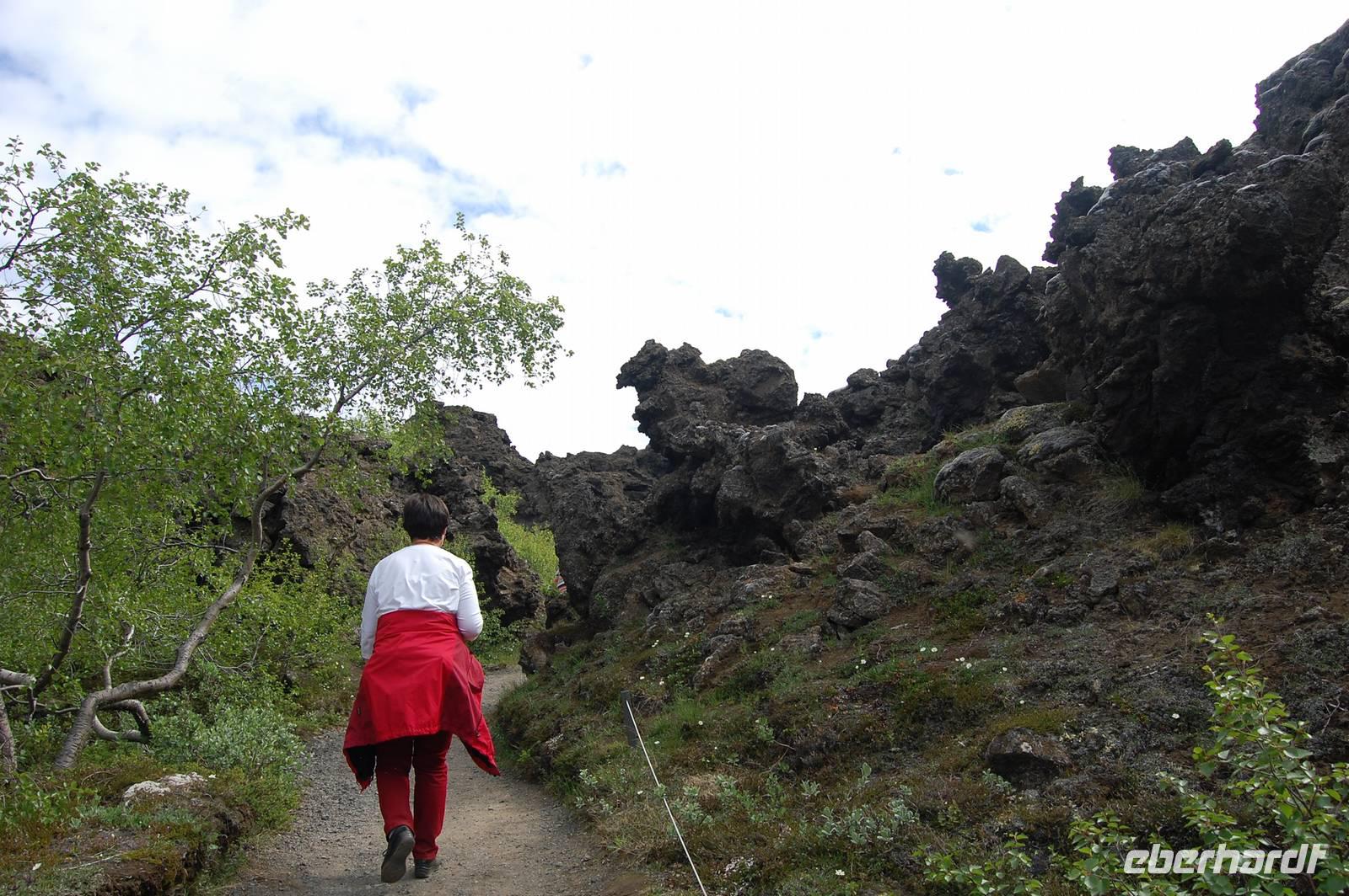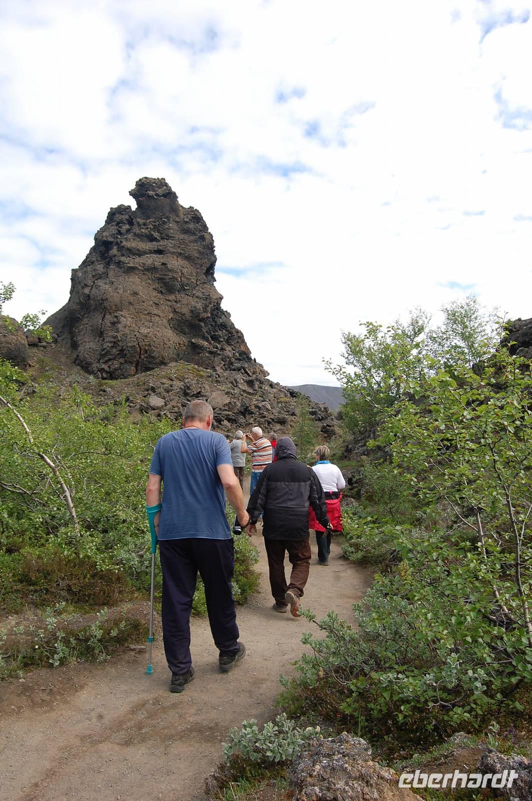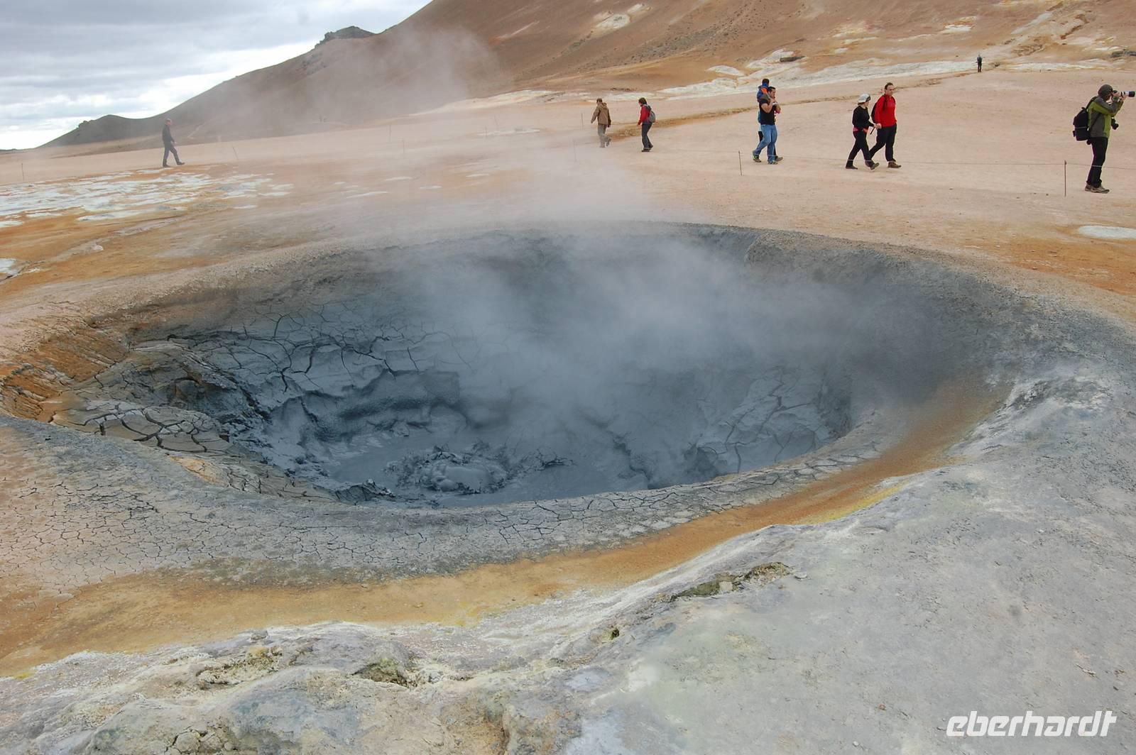 Nach einer kurzen Fahrt steigen wir an einem Lava-Labyrinth aus, um durch die sog. „Dunklen Burgen" zu wandern. Wir sehen bizarre Lava-Formationen und in der Ferne einen mächtigen Ringwallkrater, der vor 3500 Jahren entstand. Auch bei diesem halbstündigen Spaziergang begleiten uns leider die lästigen Fliegen. Wieder bringt uns der Bus nur ein kurzes Stück und so sind wir schon mittags am Eingang des Thermalbades „Jardbödin". Hier können wir endlich entspannen. In zwei großen, natürlichen Thermalbecken räkeln wir uns im angenehm heißen Wasser und besuchen die Dampfsauna. Es besteht hier auch gleich die Möglichkeit, etwas zu essen.