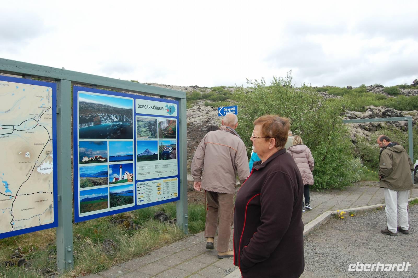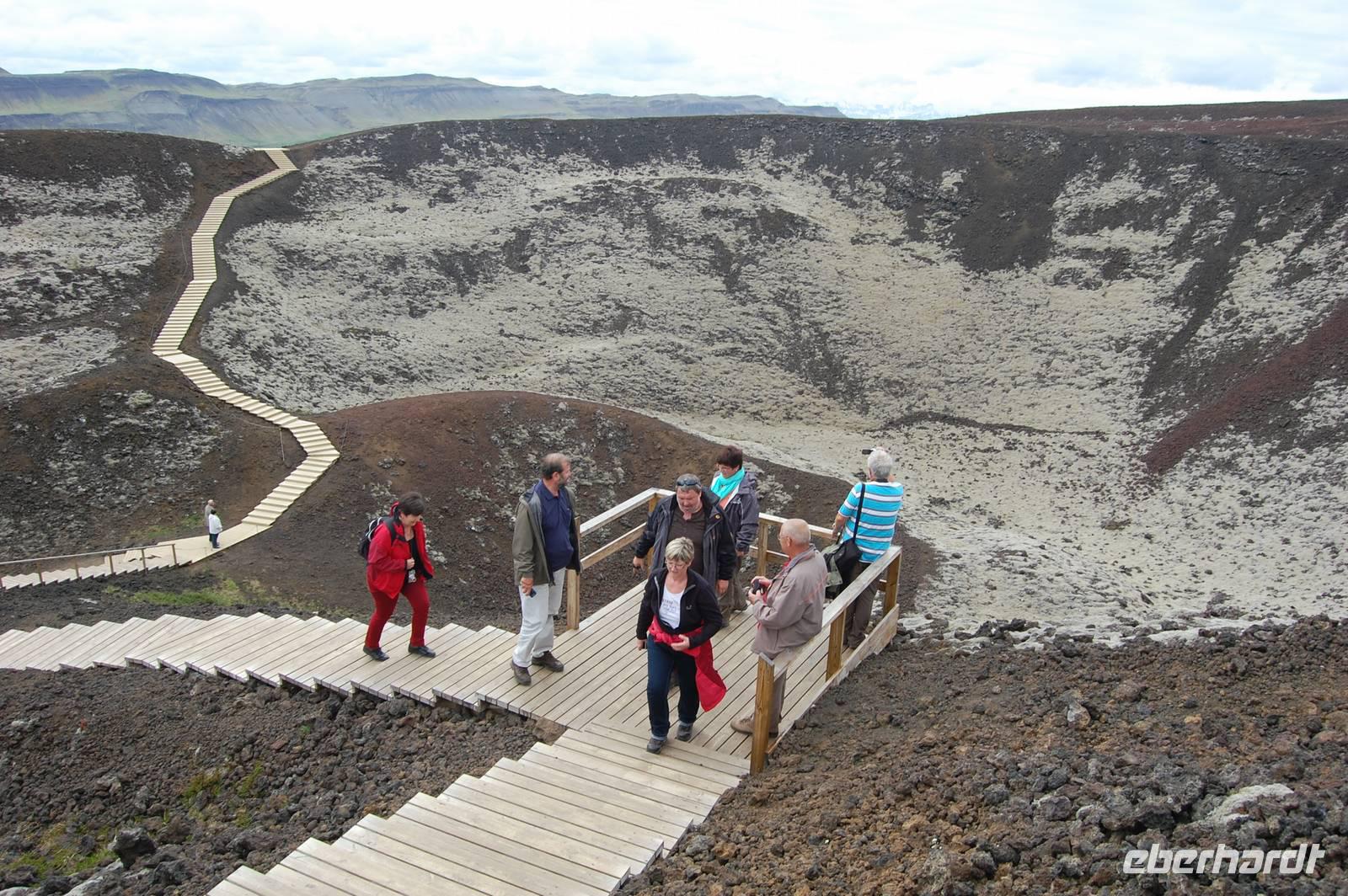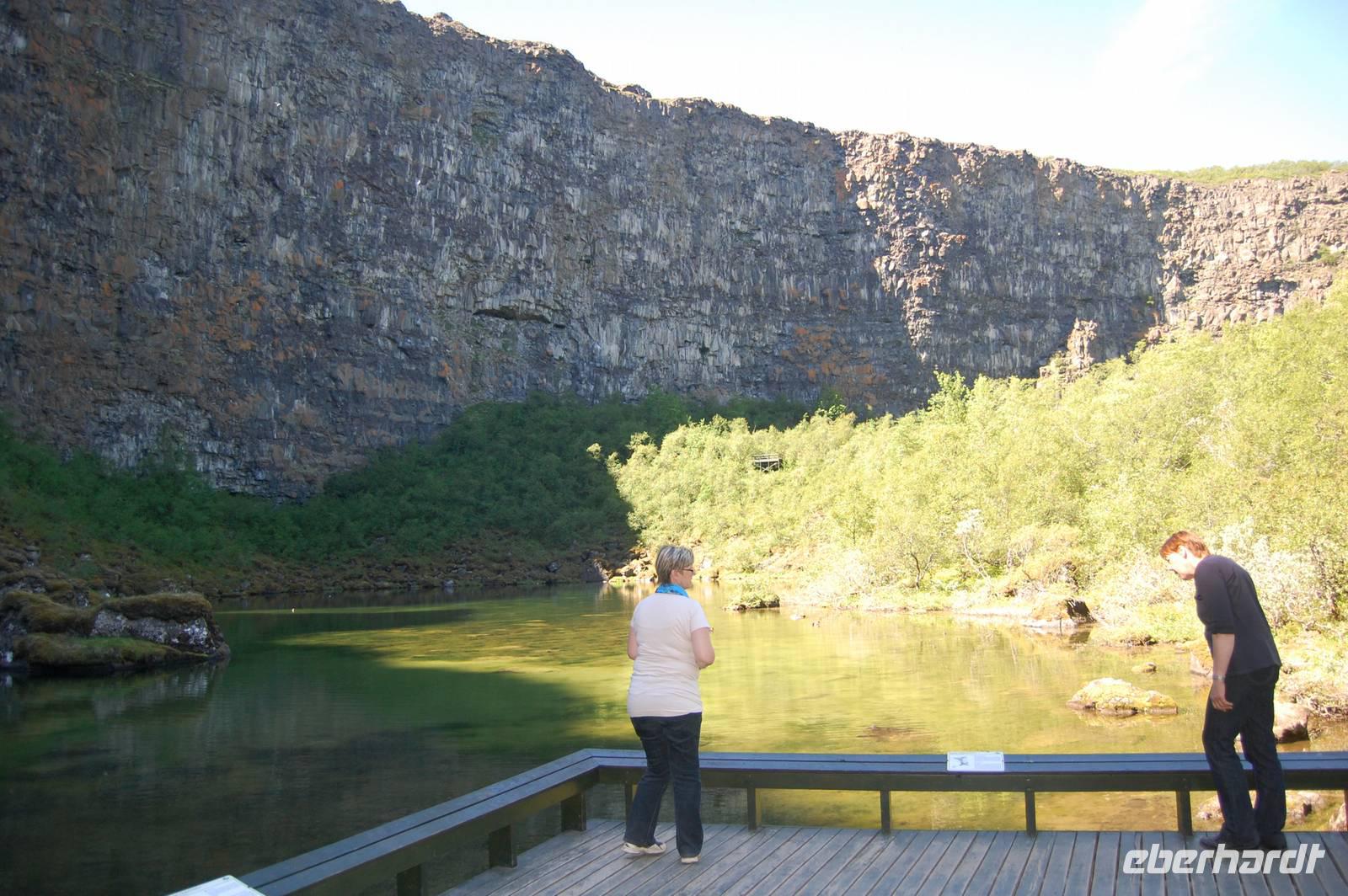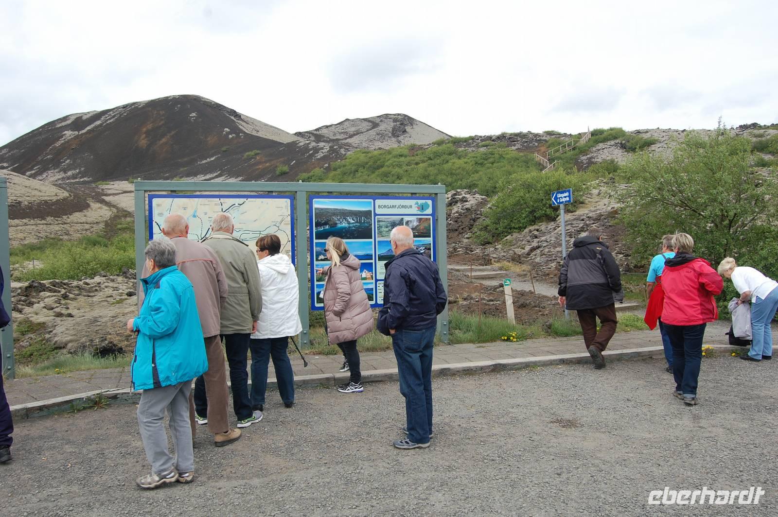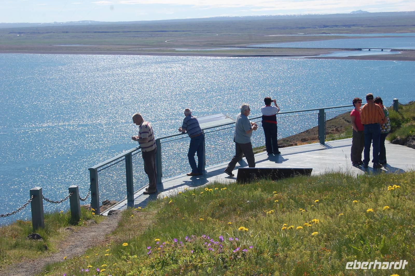 Nach einer kurzen Fahrt steigen wir an einem Lava-Labyrinth aus, um durch die sog. „Dunklen Burgen" zu wandern. Wir sehen bizarre Lava-Formationen und in der Ferne einen mächtigen Ringwallkrater, der vor 3500 Jahren entstand. Auch bei diesem halbstündigen Spaziergang begleiten uns leider die lästigen Fliegen. Wieder bringt uns der Bus nur ein kurzes Stück und so sind wir schon mittags am Eingang des Thermalbades „Jardbödin". Hier können wir endlich entspannen. In zwei großen, natürlichen Thermalbecken räkeln wir uns im angenehm heißen Wasser und besuchen die Dampfsauna. Es besteht hier auch gleich die Möglichkeit, etwas zu essen.