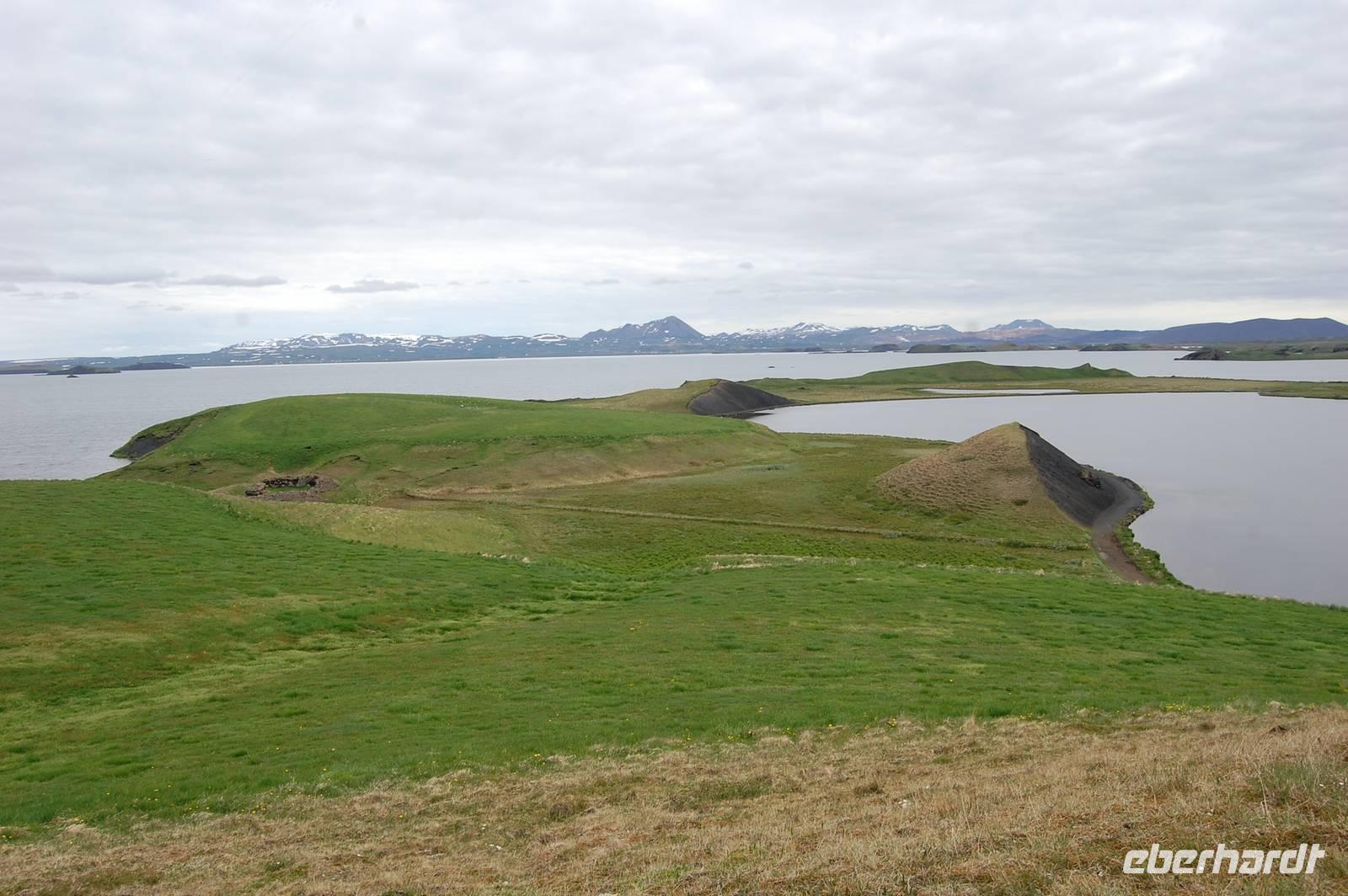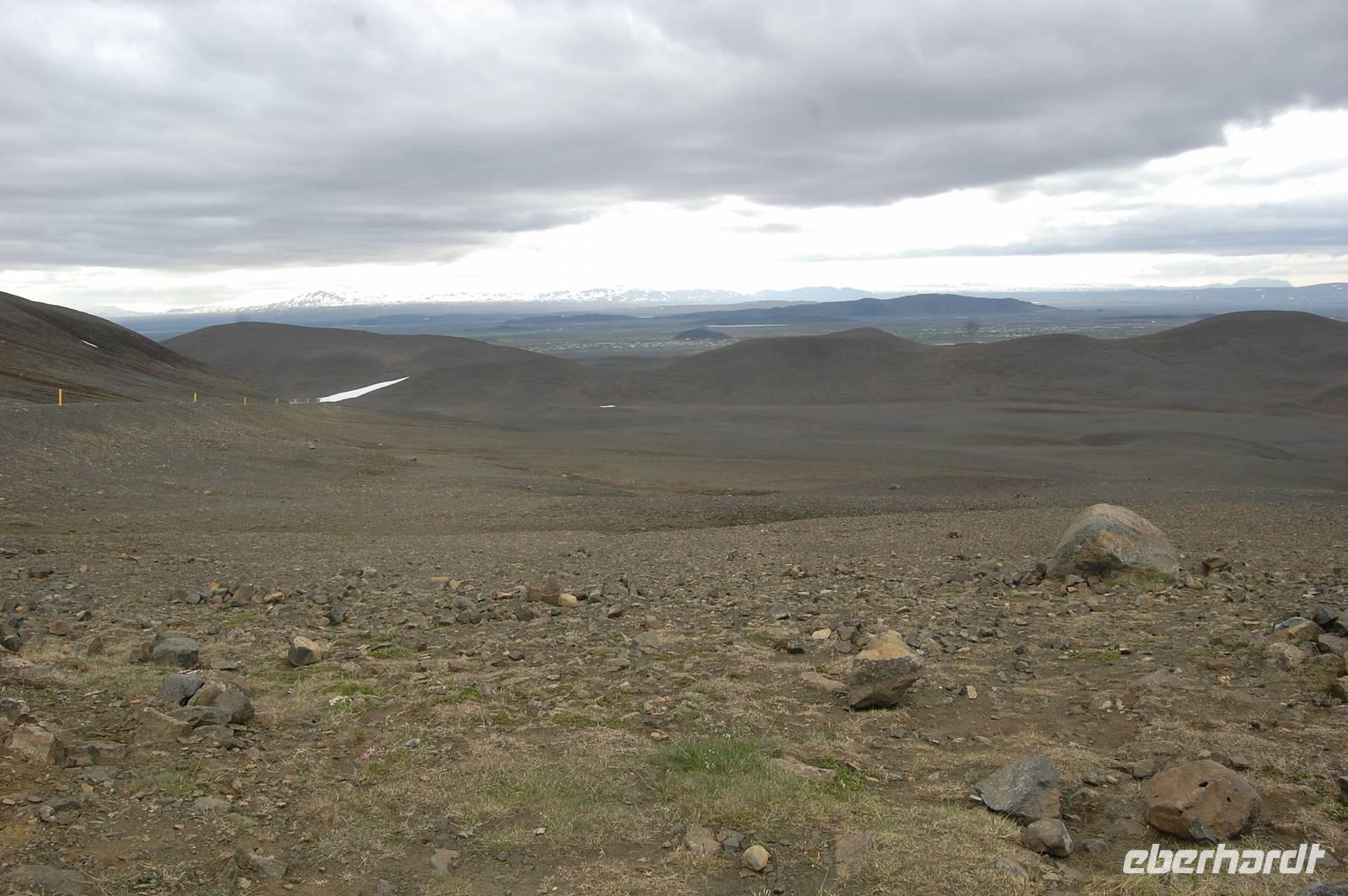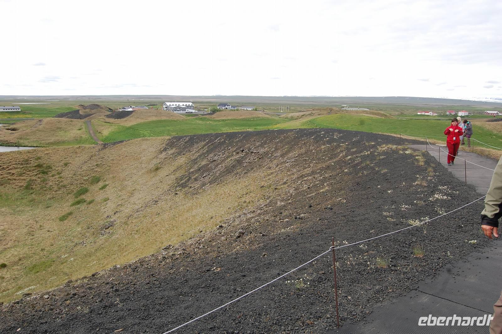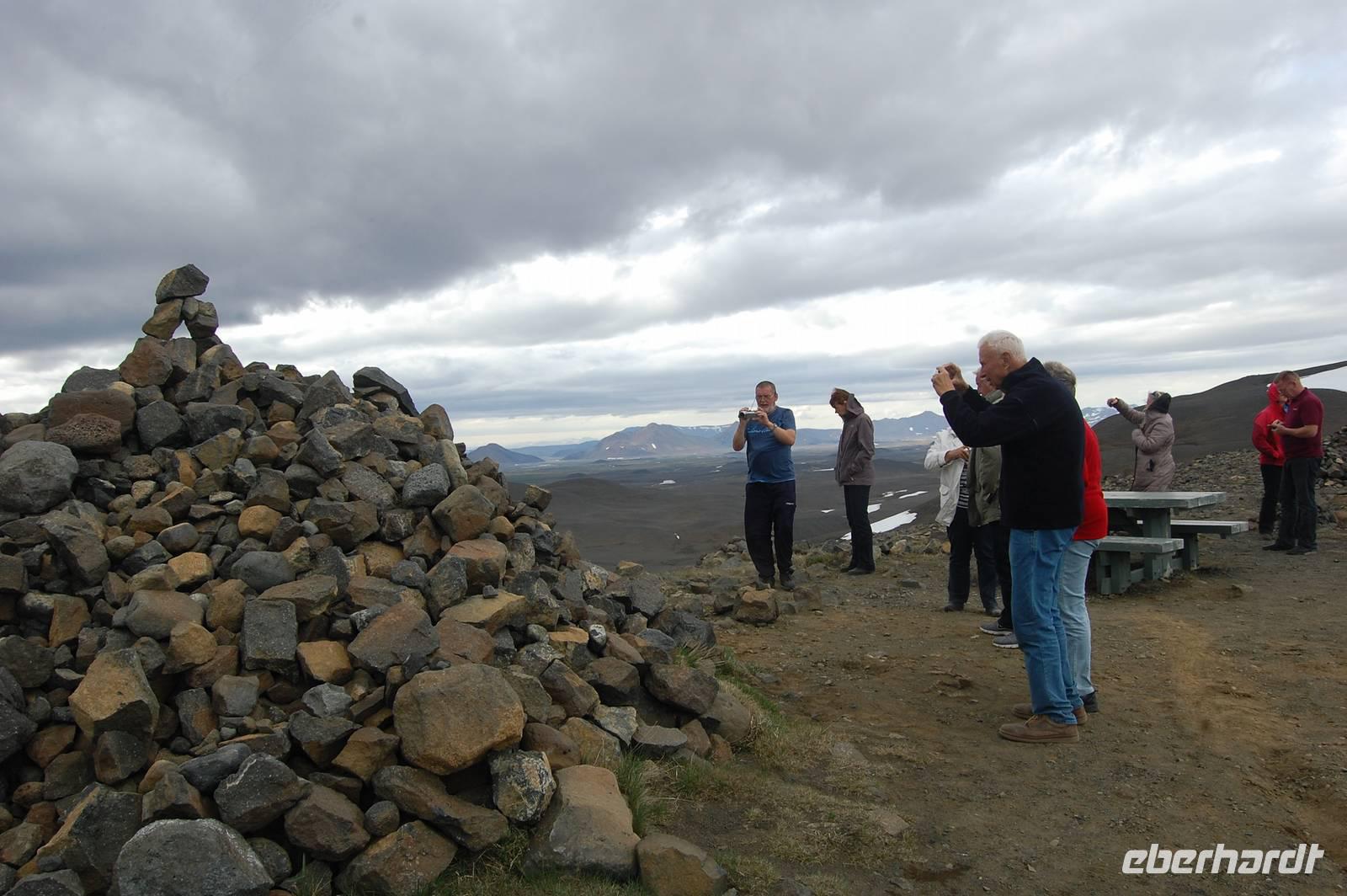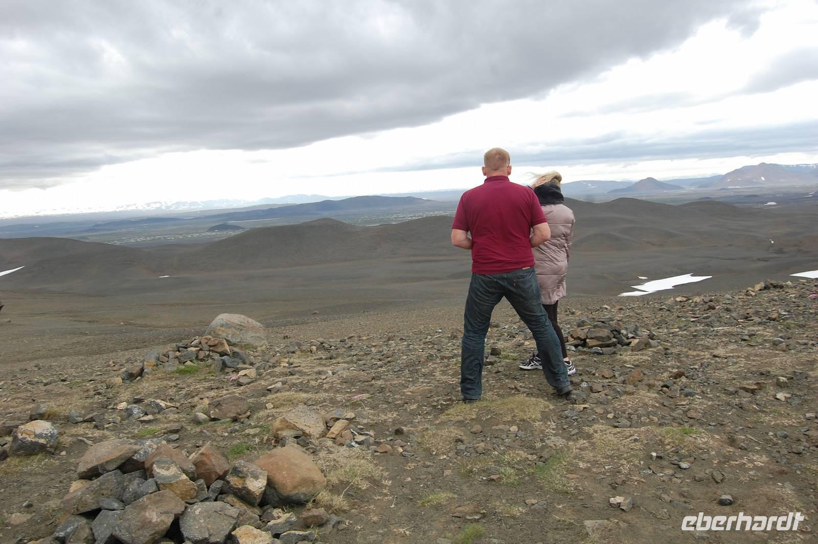Nach einer kurzen Fahrt steigen wir an einem Lava-Labyrinth aus, um durch die sog. „Dunklen Burgen" zu wandern. Wir sehen bizarre Lava-Formationen und in der Ferne einen mächtigen Ringwallkrater, der vor 3500 Jahren entstand. Auch bei diesem halbstündigen Spaziergang begleiten uns leider die lästigen Fliegen. Wieder bringt uns der Bus nur ein kurzes Stück und so sind wir schon mittags am Eingang des Thermalbades „Jardbödin". Hier können wir endlich entspannen. In zwei großen, natürlichen Thermalbecken räkeln wir uns im angenehm heißen Wasser und besuchen die Dampfsauna. Es besteht hier auch gleich die Möglichkeit, etwas zu essen.
