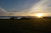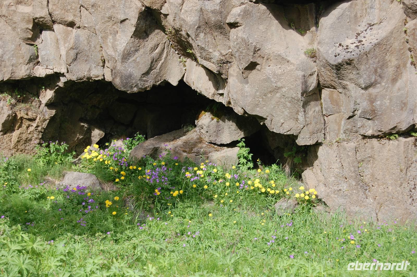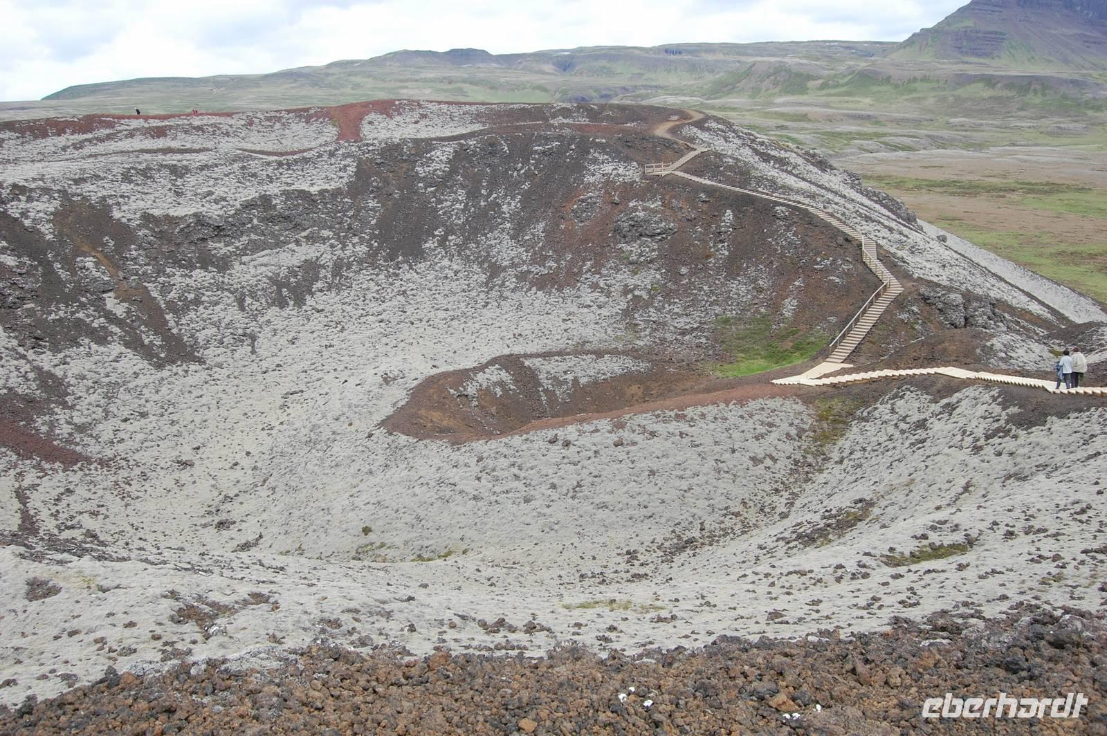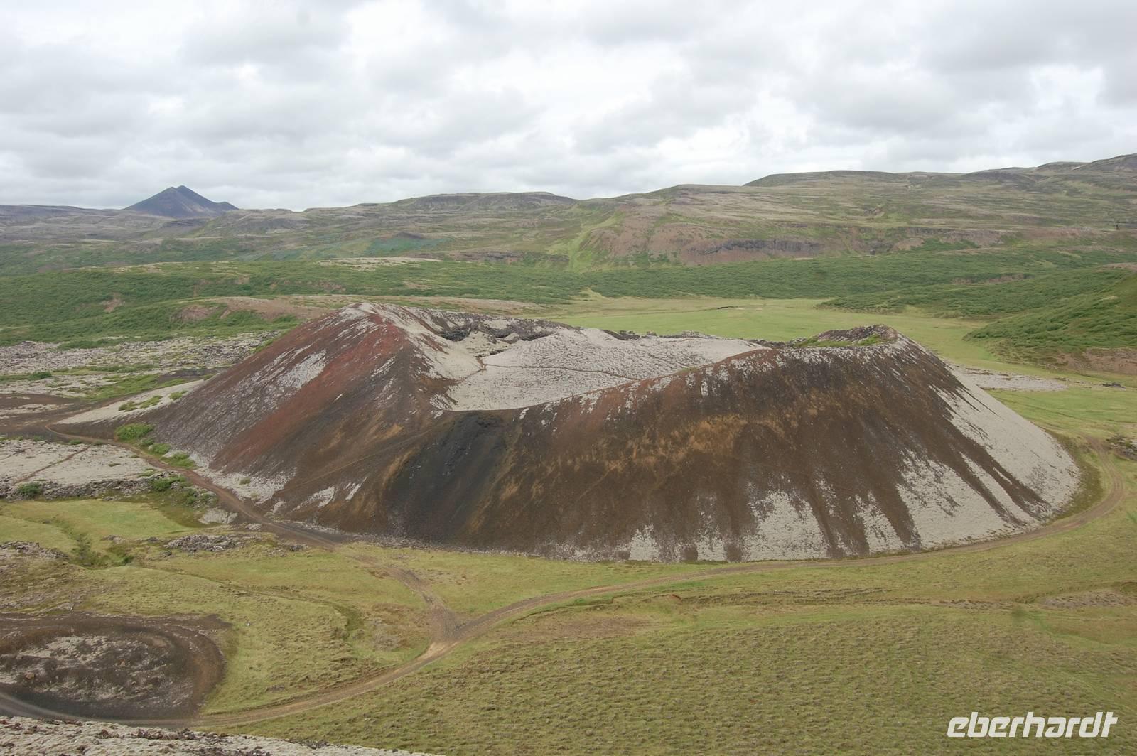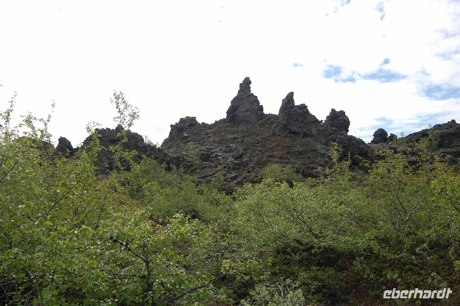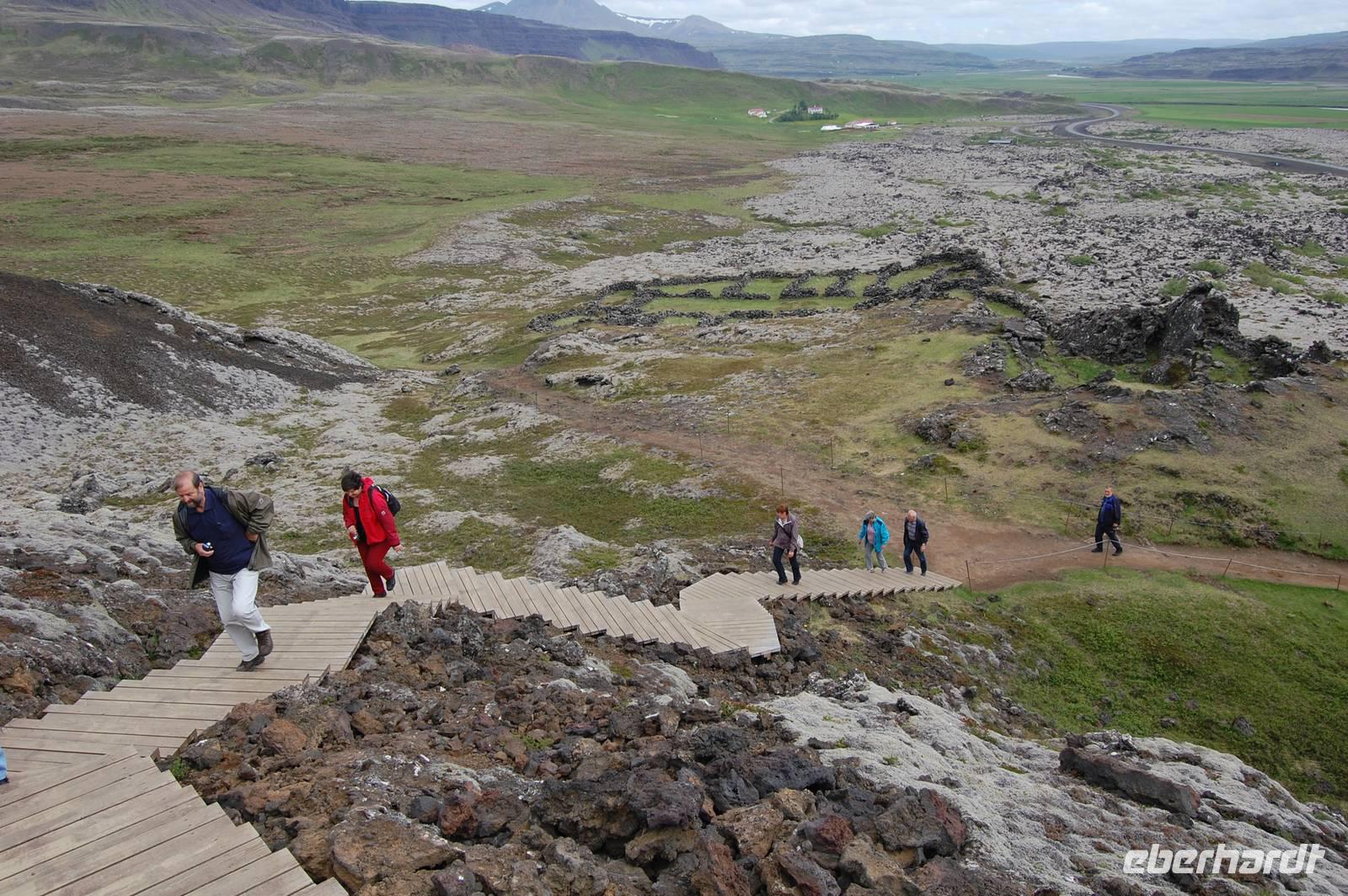 Nach einer kurzen Fahrt steigen wir an einem Lava-Labyrinth aus, um durch die sog. „Dunklen Burgen" zu wandern. Wir sehen bizarre Lava-Formationen und in der Ferne einen mächtigen Ringwallkrater, der vor 3500 Jahren entstand. Auch bei diesem halbstündigen Spaziergang begleiten uns leider die lästigen Fliegen. Wieder bringt uns der Bus nur ein kurzes Stück und so sind wir schon mittags am Eingang des Thermalbades „Jardbödin". Hier können wir endlich entspannen. In zwei großen, natürlichen Thermalbecken räkeln wir uns im angenehm heißen Wasser und besuchen die Dampfsauna. Es besteht hier auch gleich die Möglichkeit, etwas zu essen.