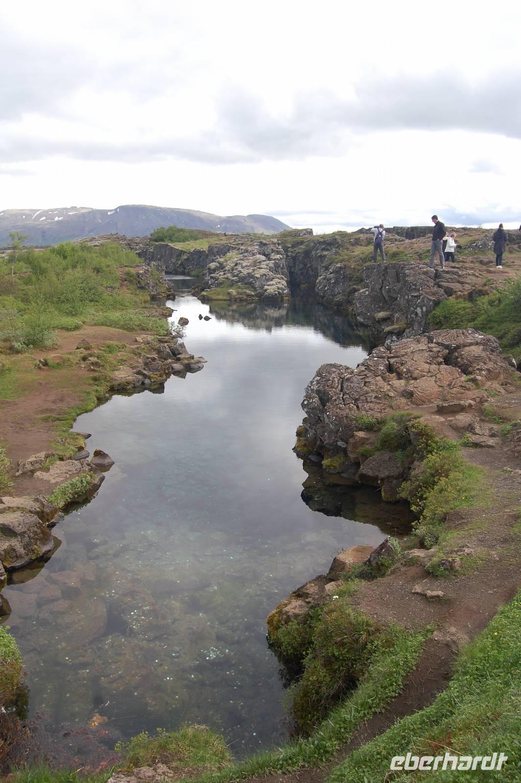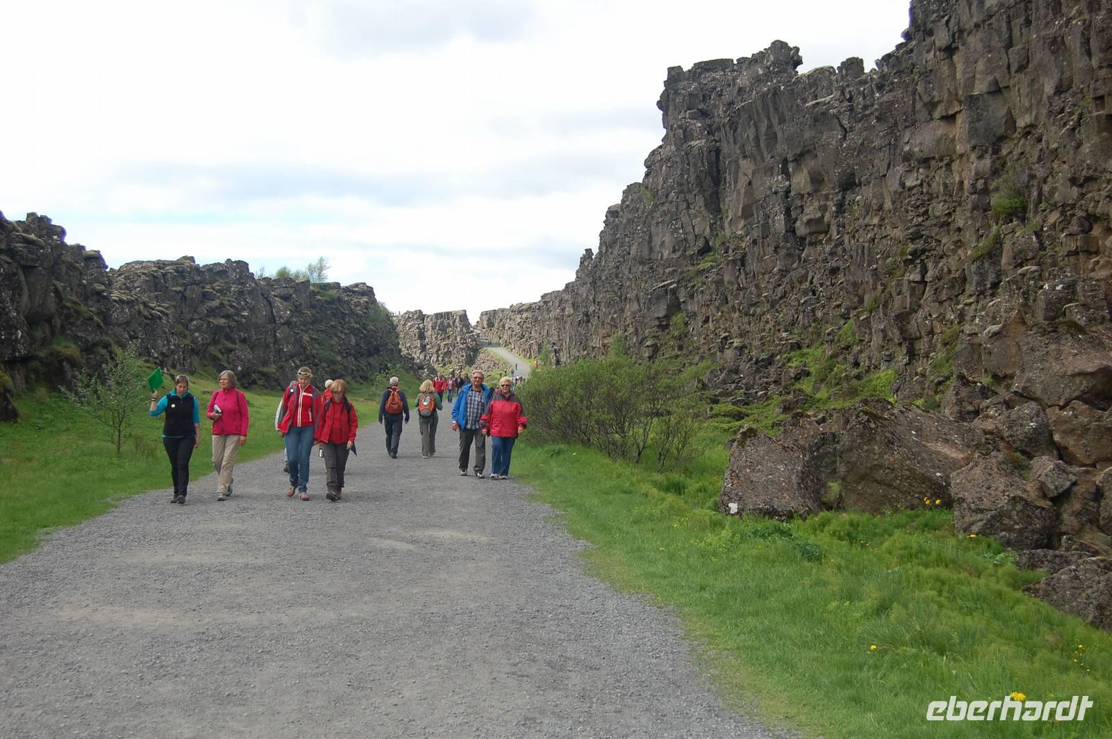 Nun fahren wir weiter und erreichen den Nationalpark Pingvellir, wo wir eine kleine Wanderung unternehmen. Anschaulich erläutert uns Rosa die tektonische Plattenbewegung. Man sieht hier recht anschaulich, wie die Erde an dieser Stelle auseinander bricht. Hier wurde um 1000 die weltweit erste demokratische Regierung ausgerufen, ein Rat der verschiedenen Stämme der damaligen Inselbewohner.