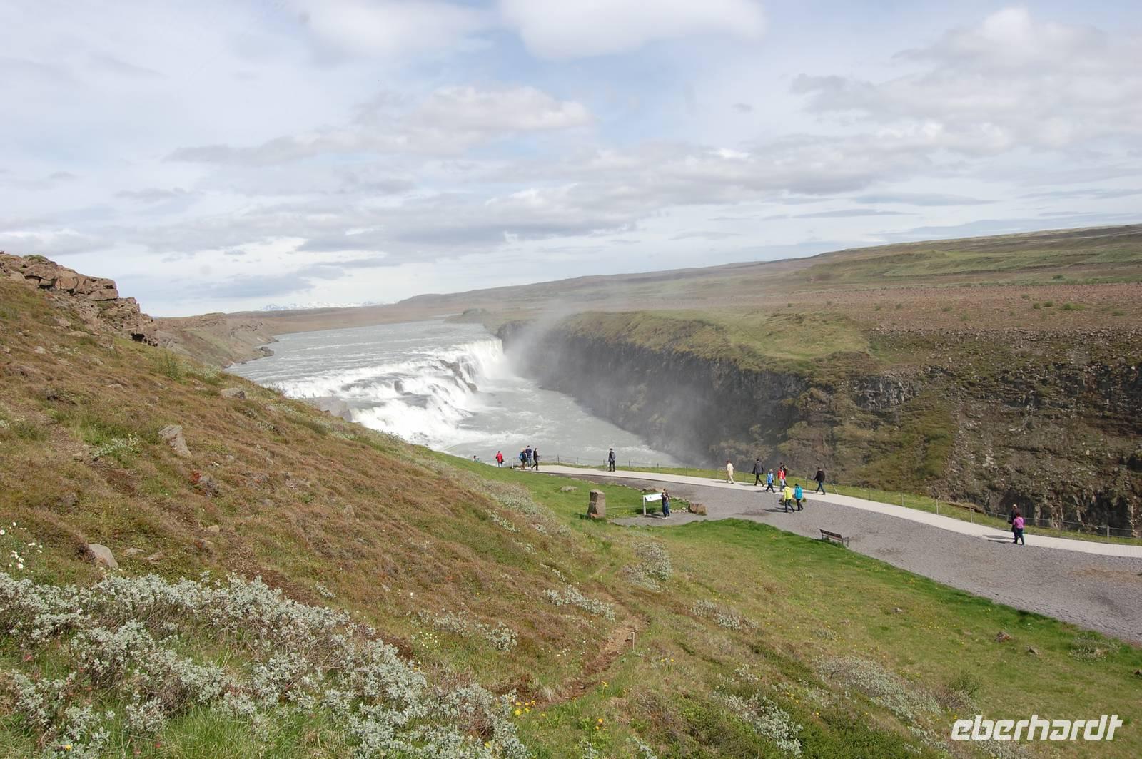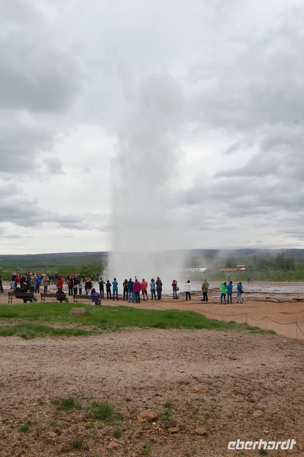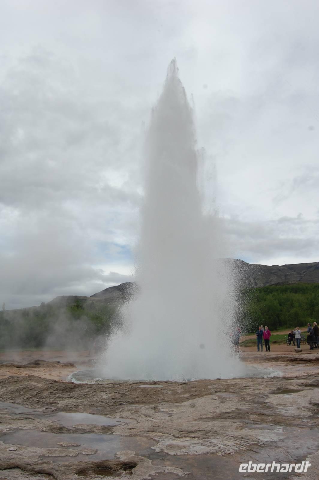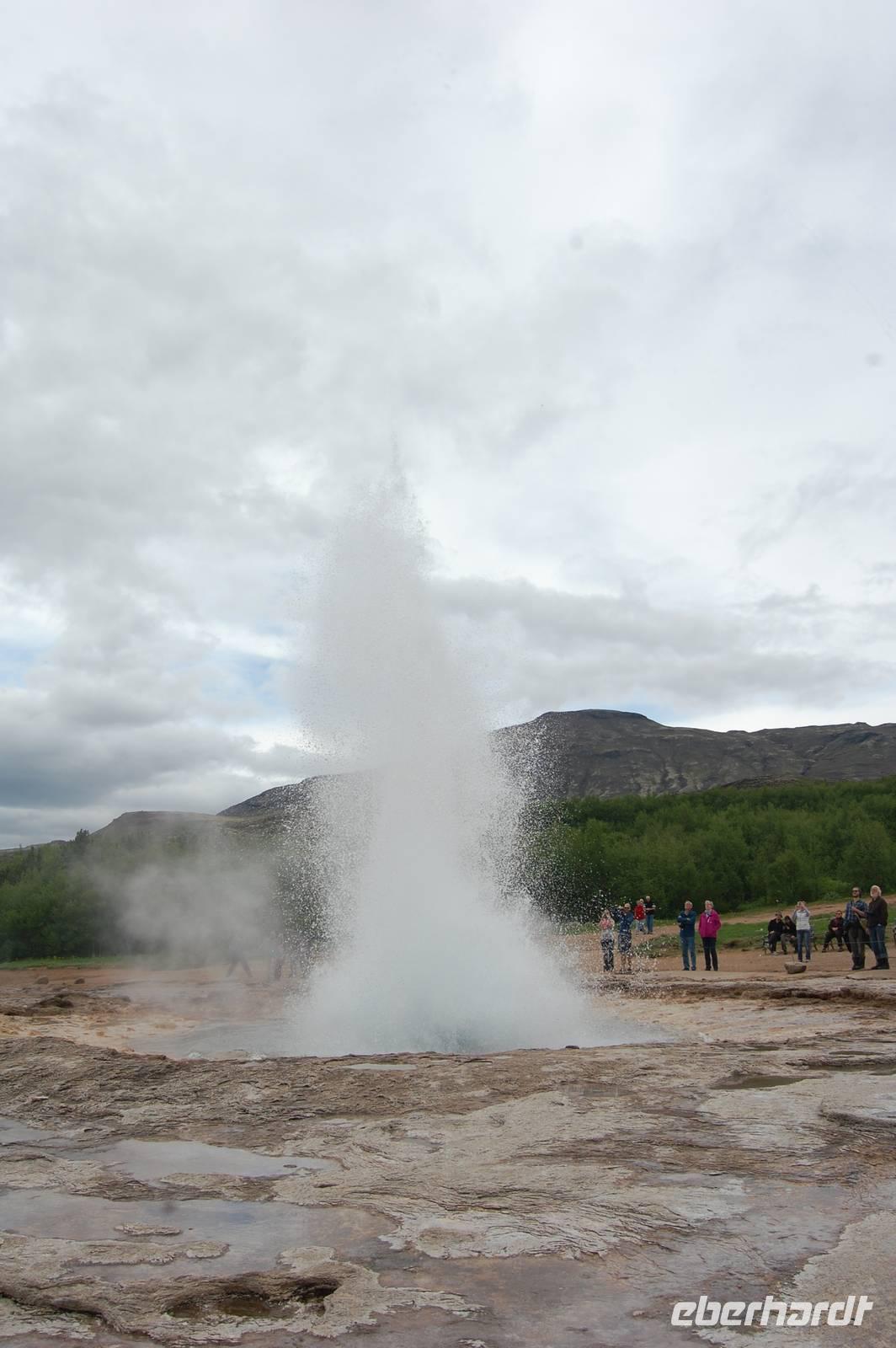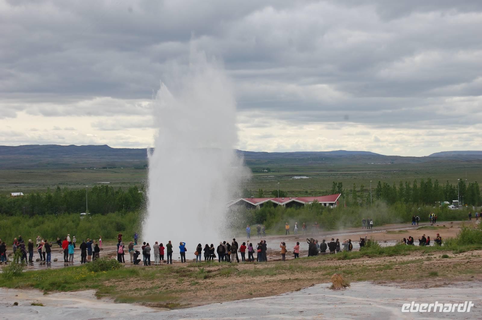 Der Geysir „Strokkur" bringt alle 4-6 Minuten eine 10 - 20 m hohe Wassersäule hervor, die von den vielen fotografierenden Besuchern entsprechend akustisch gewürdigt wird. Neben weiteren heißen Quellen und viel Dampf bietet dieses Geothermalgebiet eine reizvolle Landschaft. In den verschiedenen Bistros und Restaurants nehmen wir unser Lunch ein und fahren anschließend noch ein kleines Stück weiter nach Osten zum Wasserfall „Gollfuss". Atemberaubend stürzt sich der Fluss in zwei Stufen in die Tiefe. Unser Bus setzt uns unterhalb des „Goldenen Wasserfalles" ab, so dass wir den gesamten Weg entlang gehen können um schließlich etwas oberhalb wieder auf den Parkplatz zu gelangen, auf dem unser Fahrer wartet.