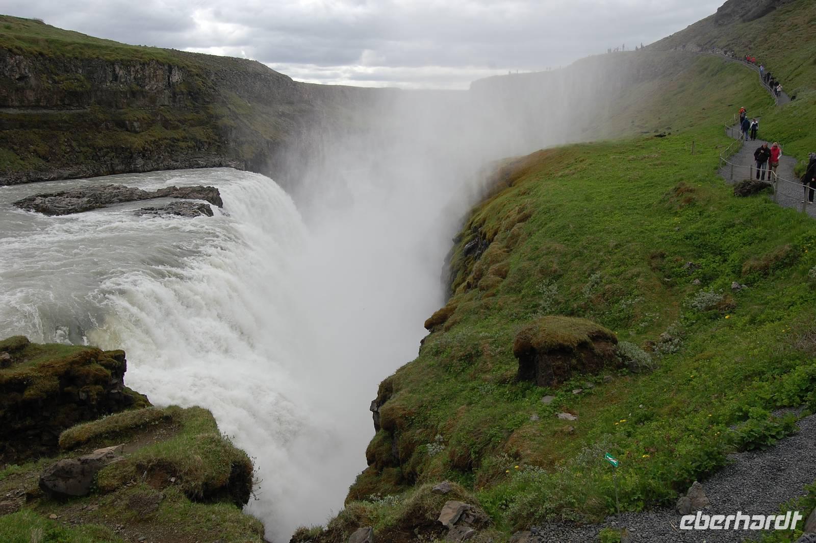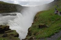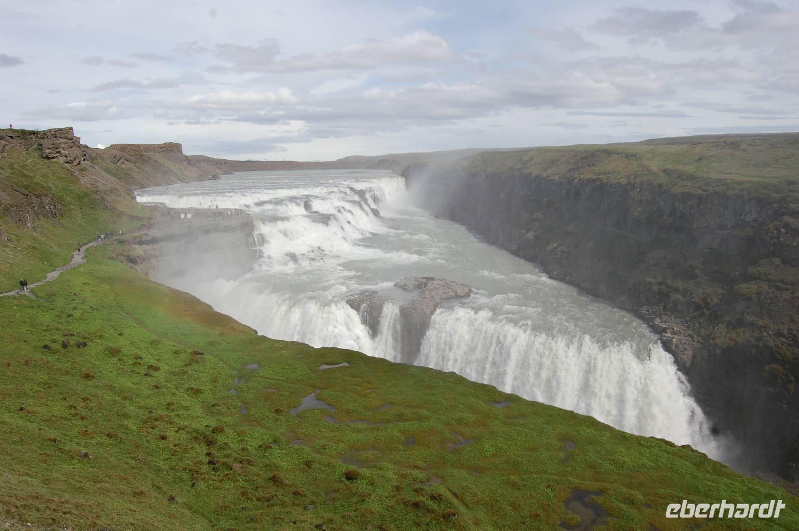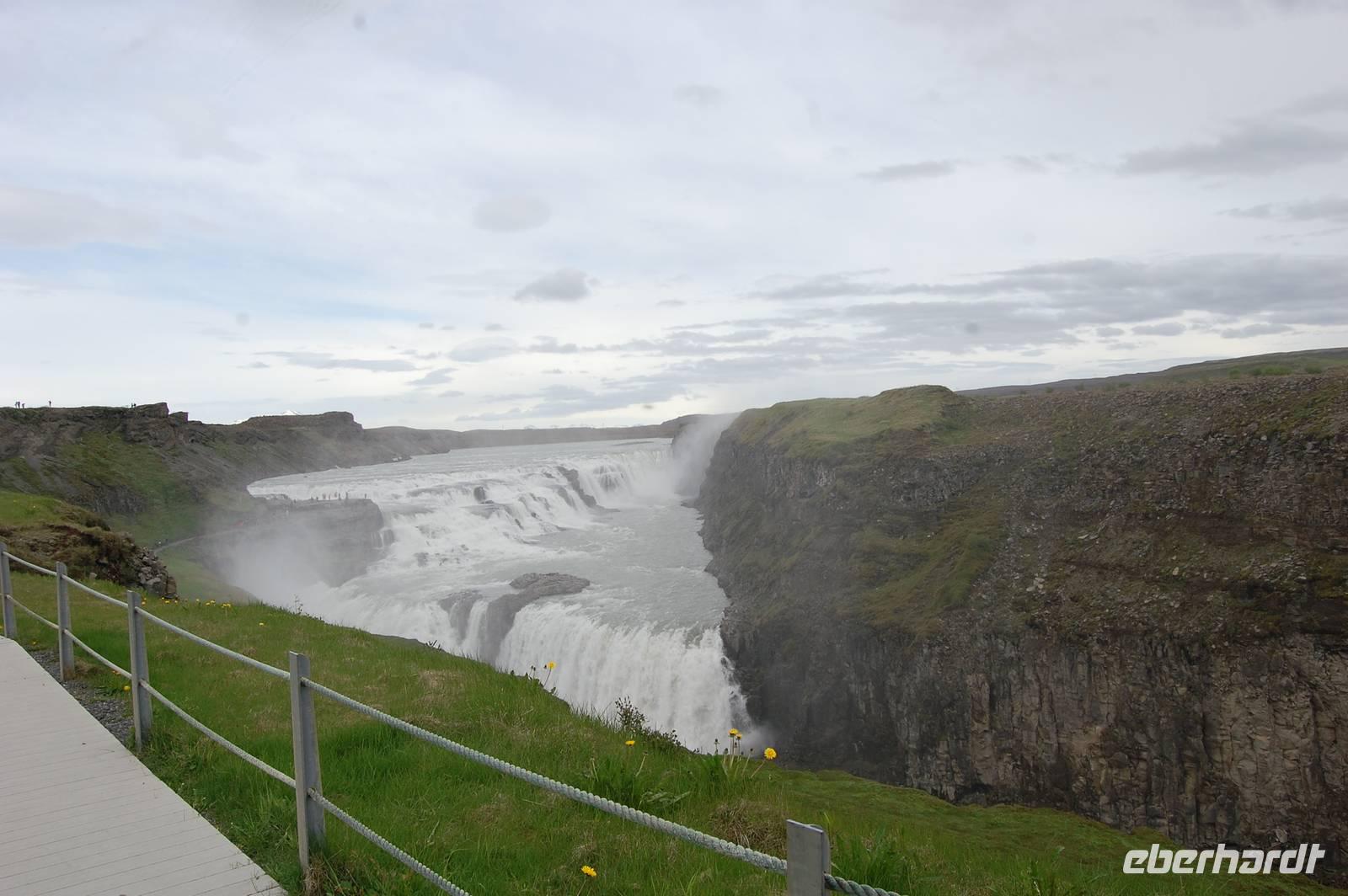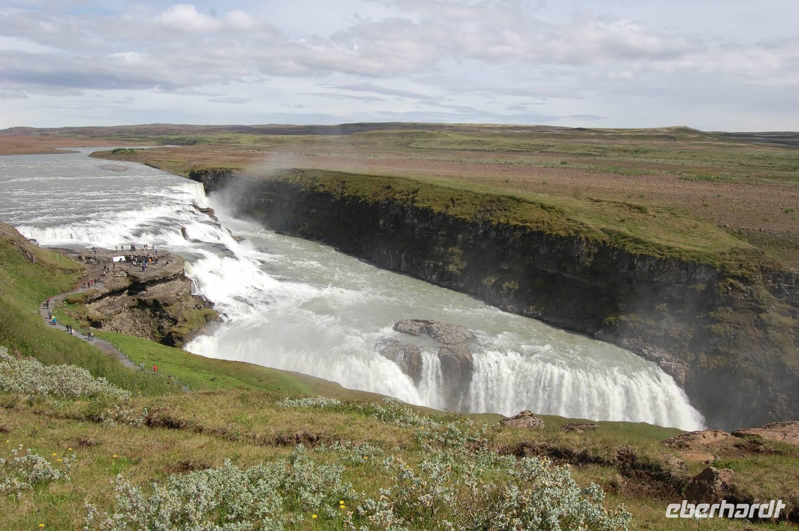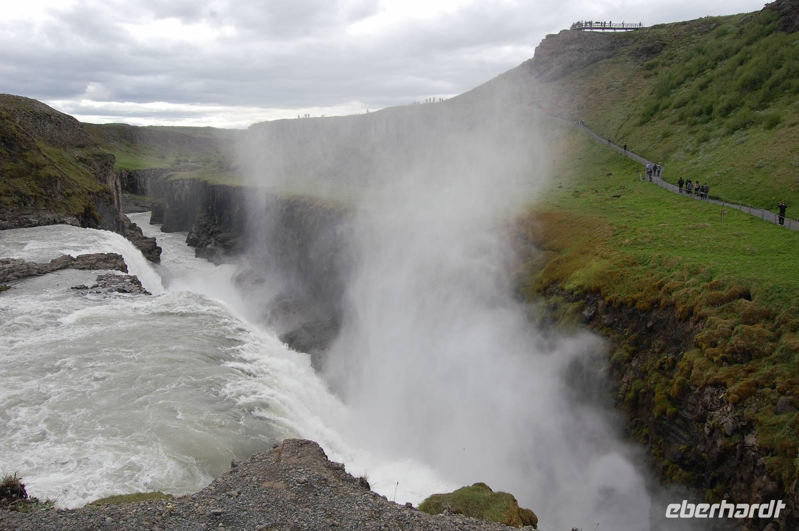 Der Geysir „Strokkur" bringt alle 4-6 Minuten eine 10 - 20 m hohe Wassersäule hervor, die von den vielen fotografierenden Besuchern entsprechend akustisch gewürdigt wird. Neben weiteren heißen Quellen und viel Dampf bietet dieses Geothermalgebiet eine reizvolle Landschaft. In den verschiedenen Bistros und Restaurants nehmen wir unser Lunch ein und fahren anschließend noch ein kleines Stück weiter nach Osten zum Wasserfall „Gollfuss". Atemberaubend stürzt sich der Fluss in zwei Stufen in die Tiefe. Unser Bus setzt uns unterhalb des „Goldenen Wasserfalles" ab, so dass wir den gesamten Weg entlang gehen können um schließlich etwas oberhalb wieder auf den Parkplatz zu gelangen, auf dem unser Fahrer wartet.