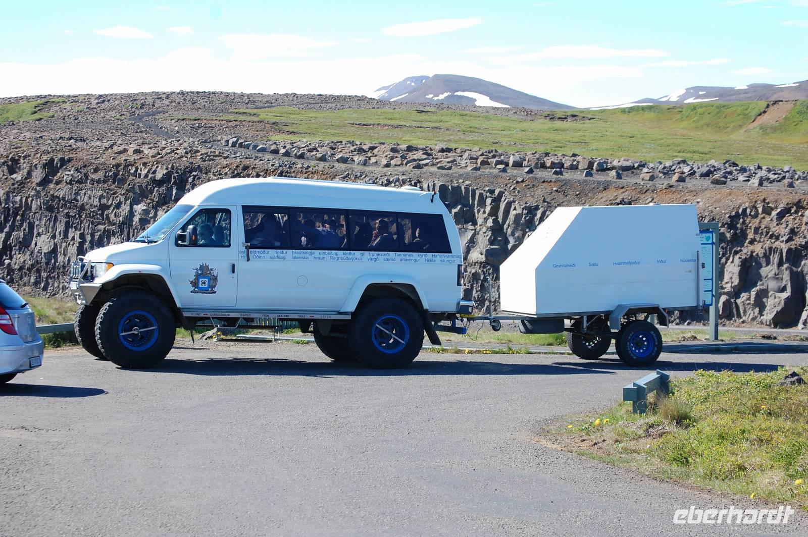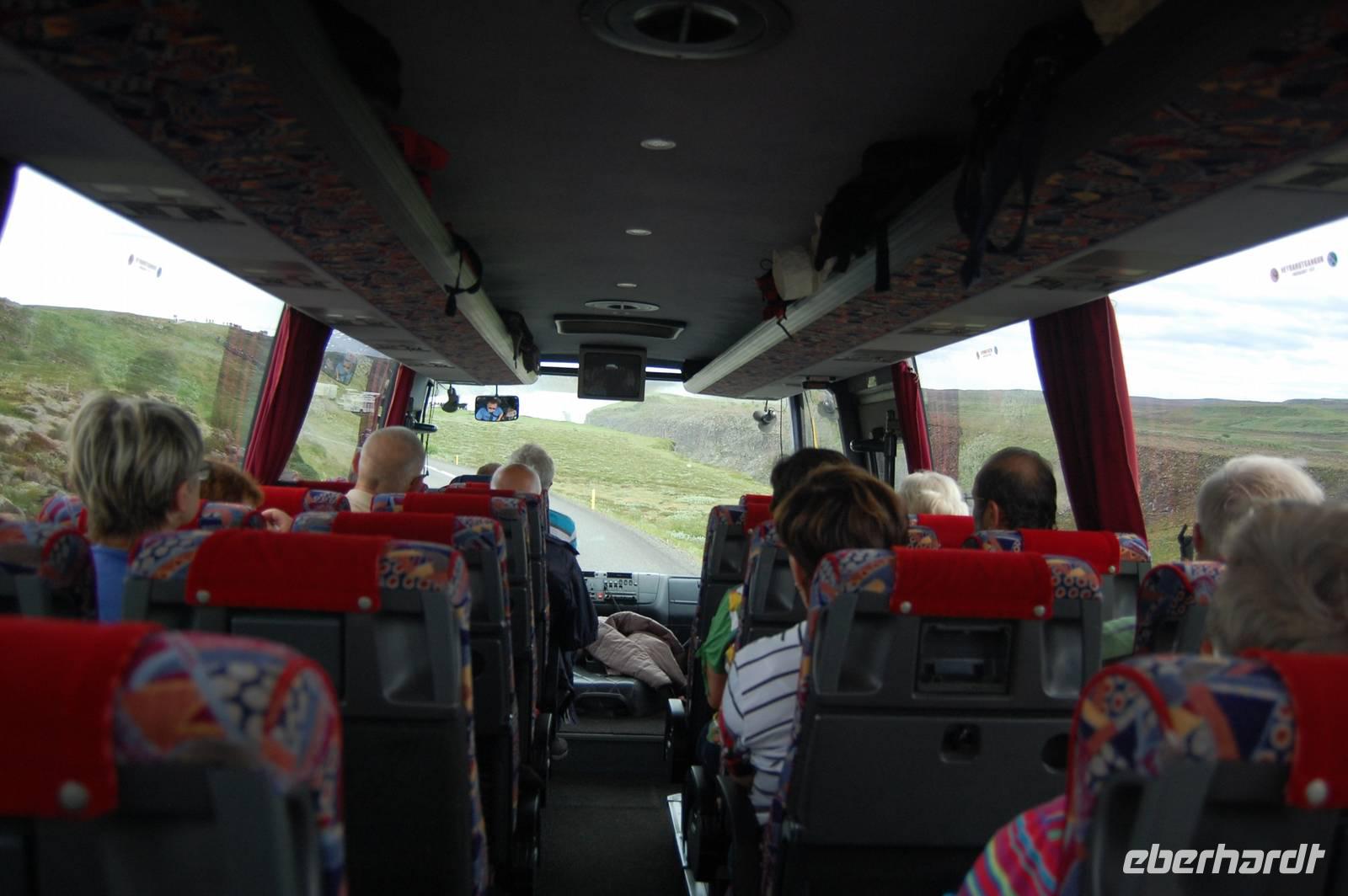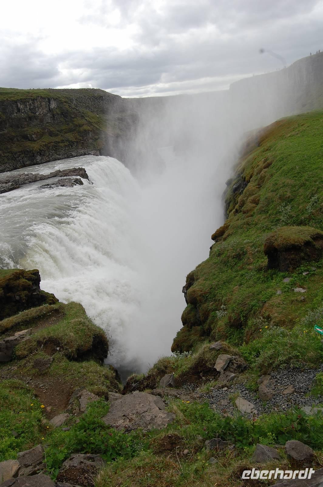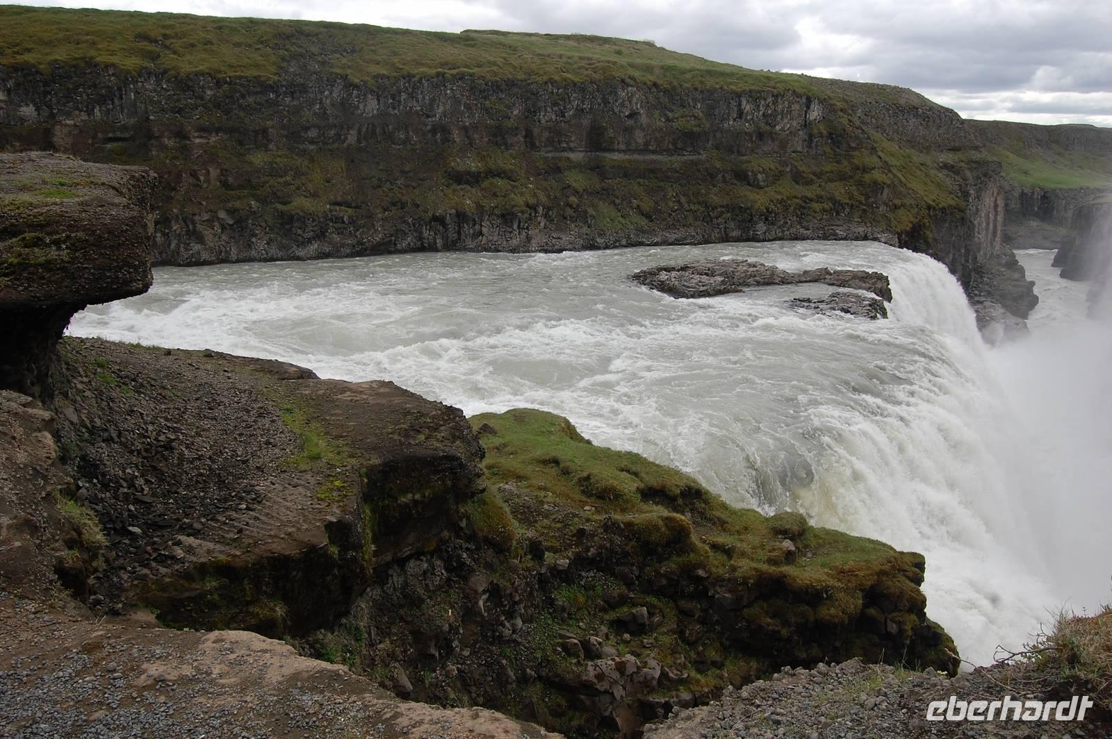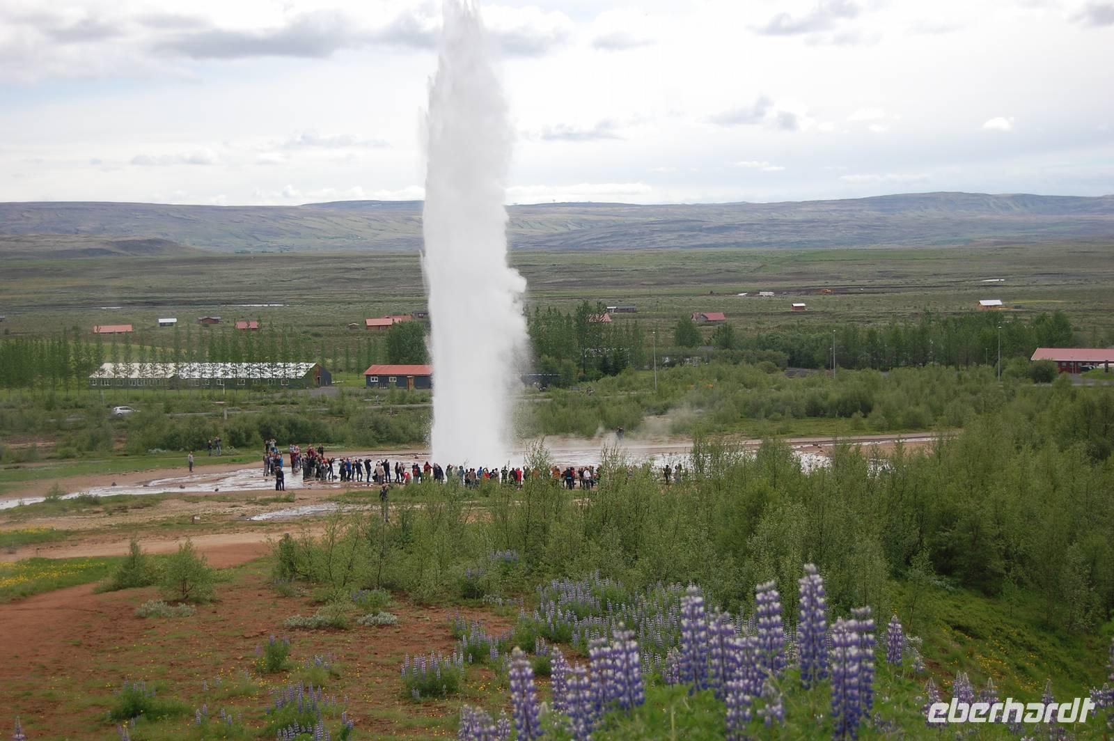 Der Geysir „Strokkur" bringt alle 4-6 Minuten eine 10 - 20 m hohe Wassersäule hervor, die von den vielen fotografierenden Besuchern entsprechend akustisch gewürdigt wird. Neben weiteren heißen Quellen und viel Dampf bietet dieses Geothermalgebiet eine reizvolle Landschaft. In den verschiedenen Bistros und Restaurants nehmen wir unser Lunch ein und fahren anschließend noch ein kleines Stück weiter nach Osten zum Wasserfall „Gollfuss". Atemberaubend stürzt sich der Fluss in zwei Stufen in die Tiefe. Unser Bus setzt uns unterhalb des „Goldenen Wasserfalles" ab, so dass wir den gesamten Weg entlang gehen können um schließlich etwas oberhalb wieder auf den Parkplatz zu gelangen, auf dem unser Fahrer wartet.