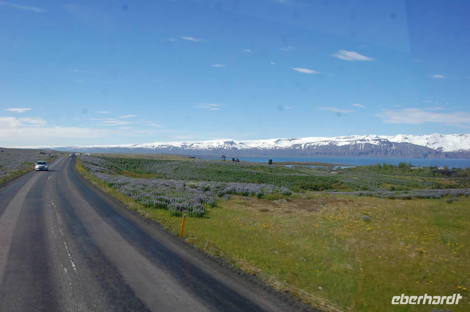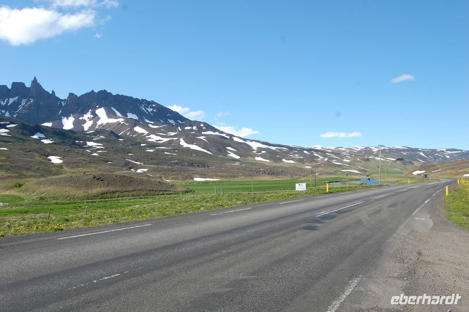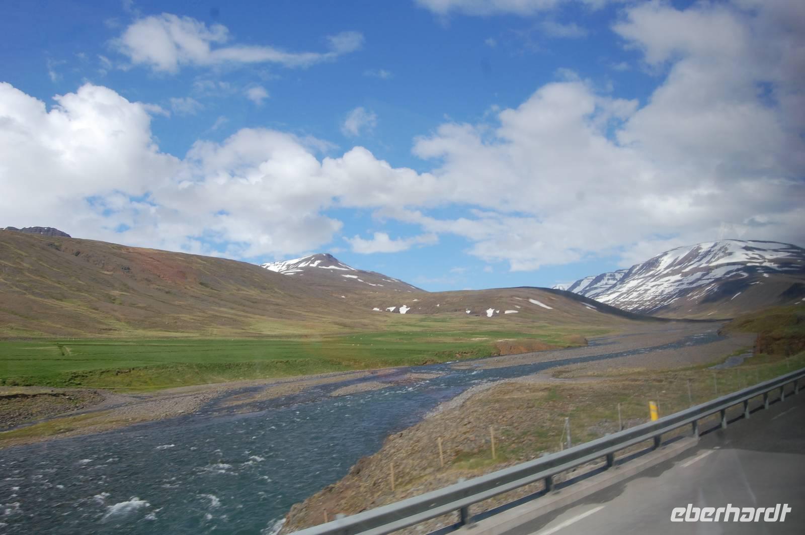 Danach reisen wir weiter über die Hochebene Holtavvöduheidi entlang des „schwarzen Flusses" durch das „lange Tal". Die schneebedeckten Gipfel und die grünen Bergwiesen begleiten uns und bieten immer wieder einen tollen Anblick.