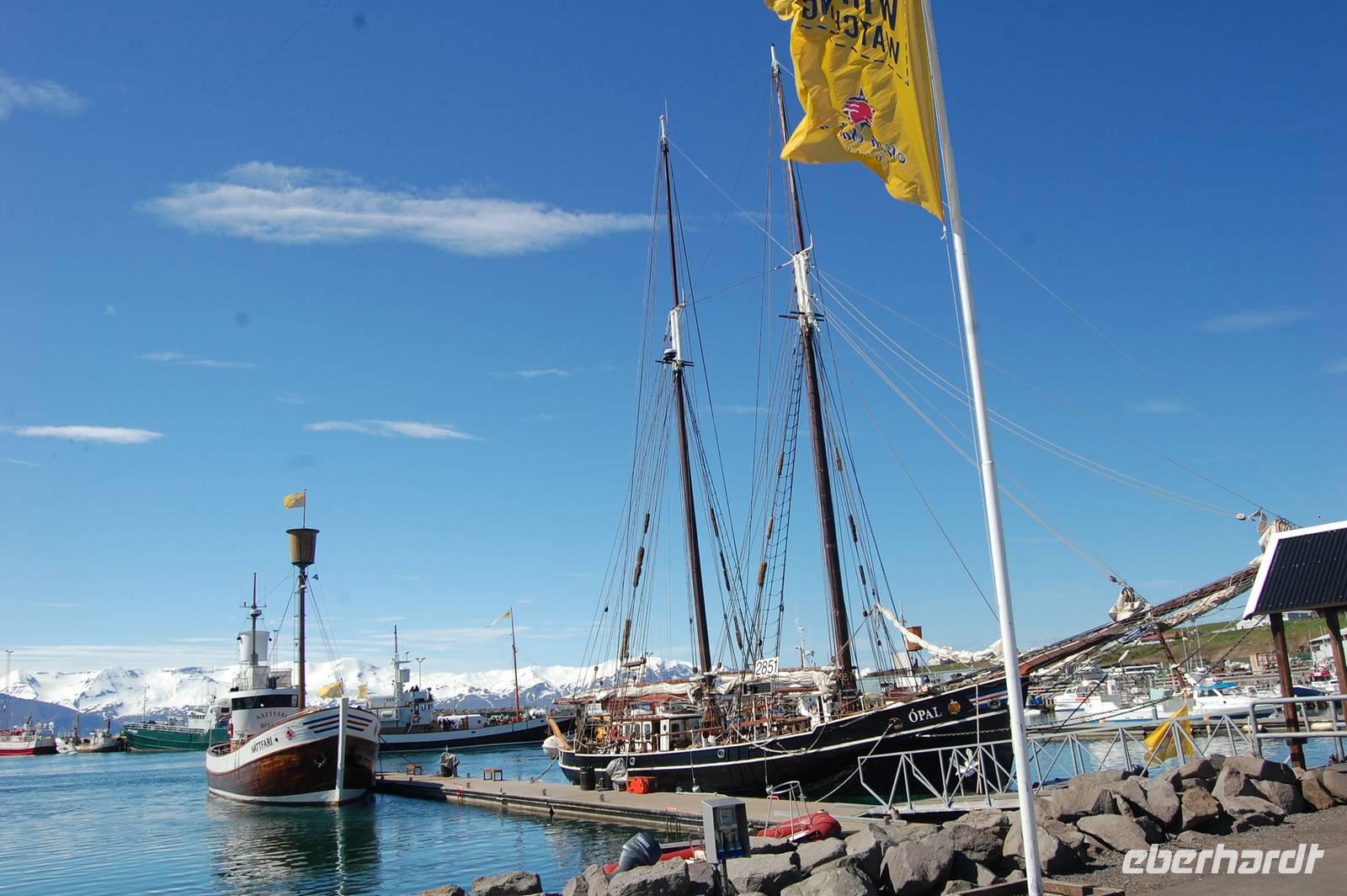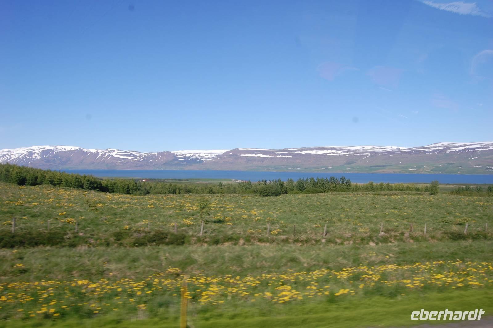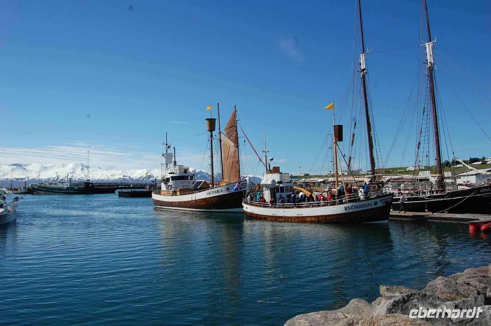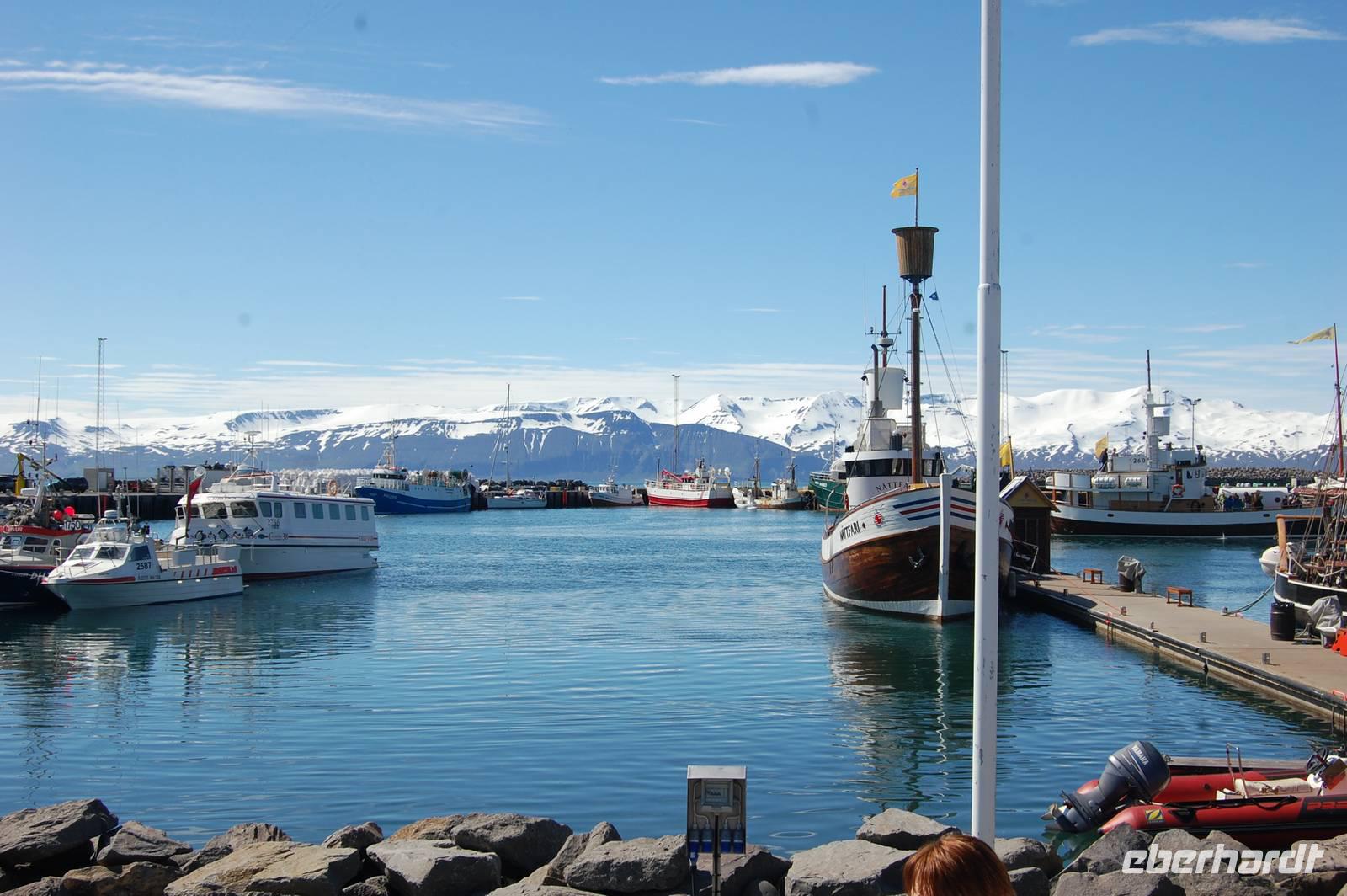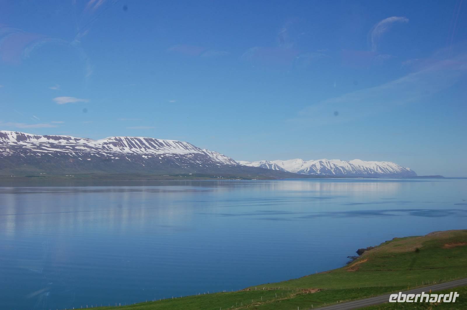 Nach einem gemütlichen Frühstück starten wir um 09.00 Uhr und lassen uns von unserem Fahrer „Münte" durch seine Heimatstadt fahren. Er zeigt uns die ursprünglich ersten Holzhäuser auf der verlängerten Hafenstraße und den sehenswerten botanischen Garten. Oberhalb der Stadt sehen wir schneebedeckte Hänge, auf denen Wintersport möglich ist. Über eine Brücke wechseln wir auf die andere Seite des Fjordes und machen einen kurzen Stopp, um das Stadtbild von Akureyri, das sich auf der glatten Wasserfläche des Fjordes spiegelt, zu fotografieren. Der strahlend blaue Himmel und die glatte, ruhige See verheißen uns nicht nur einen schönen Tag, sondern wir entschließen uns, an diesem Abend eine Walbeobachtung zu unternehmen, bei der wir nicht nur gute Chancen haben, die Meeressäuger zu sehen, sondern vielleicht auch die Mitternachtssonne, denn wir werden um Mitternacht nur 20 km südlich des Polarkreises unterwegs sein.
