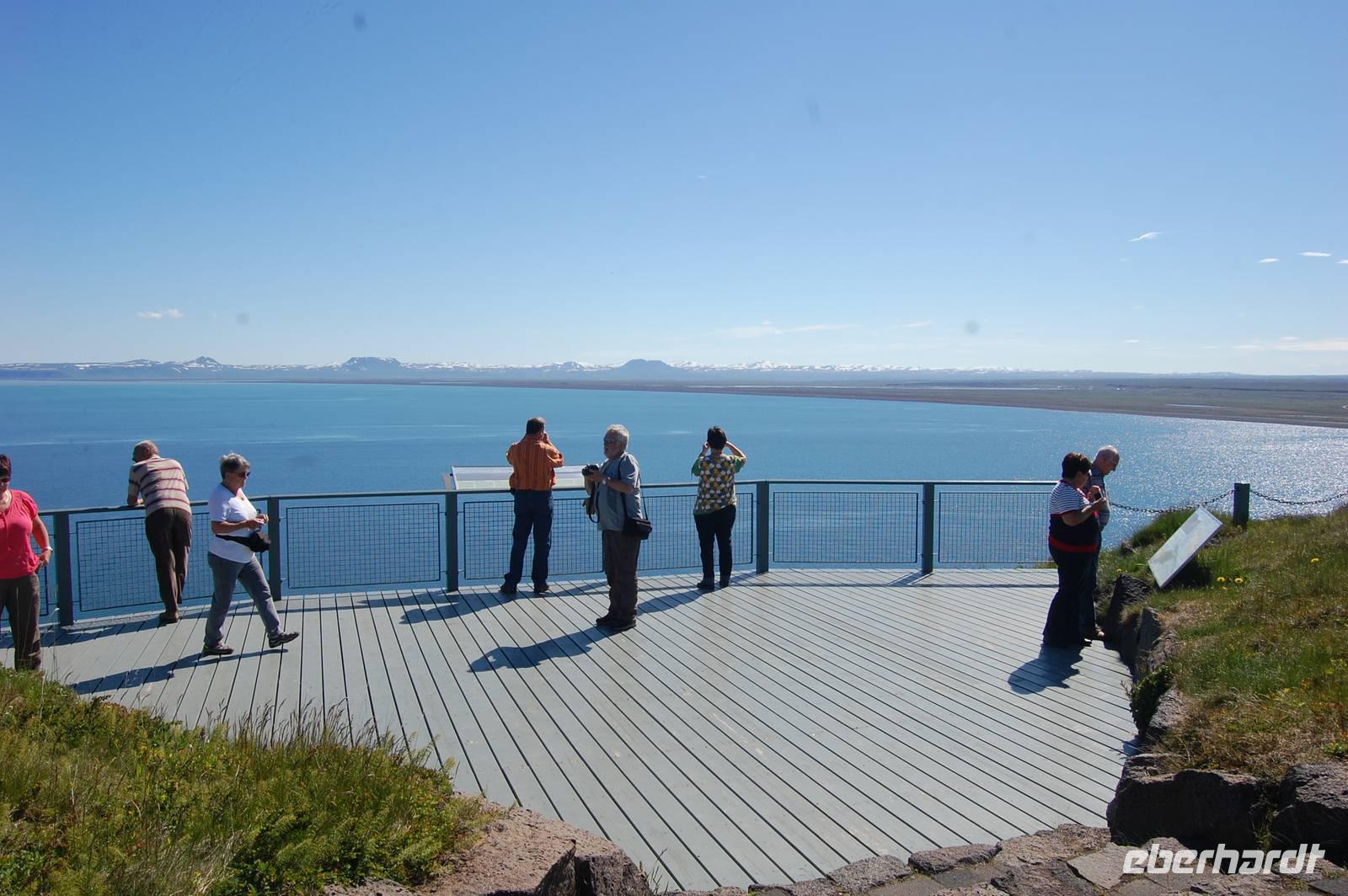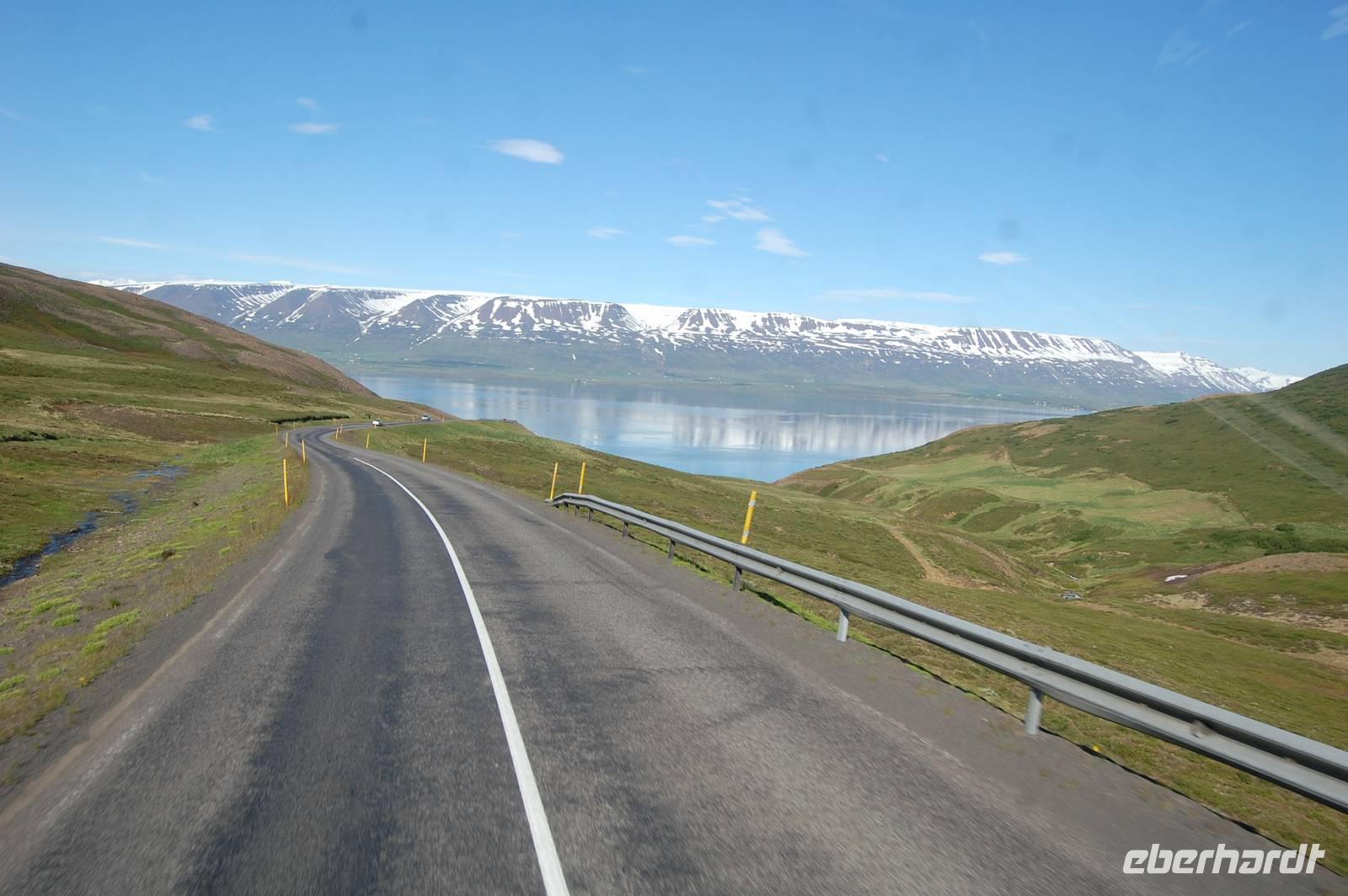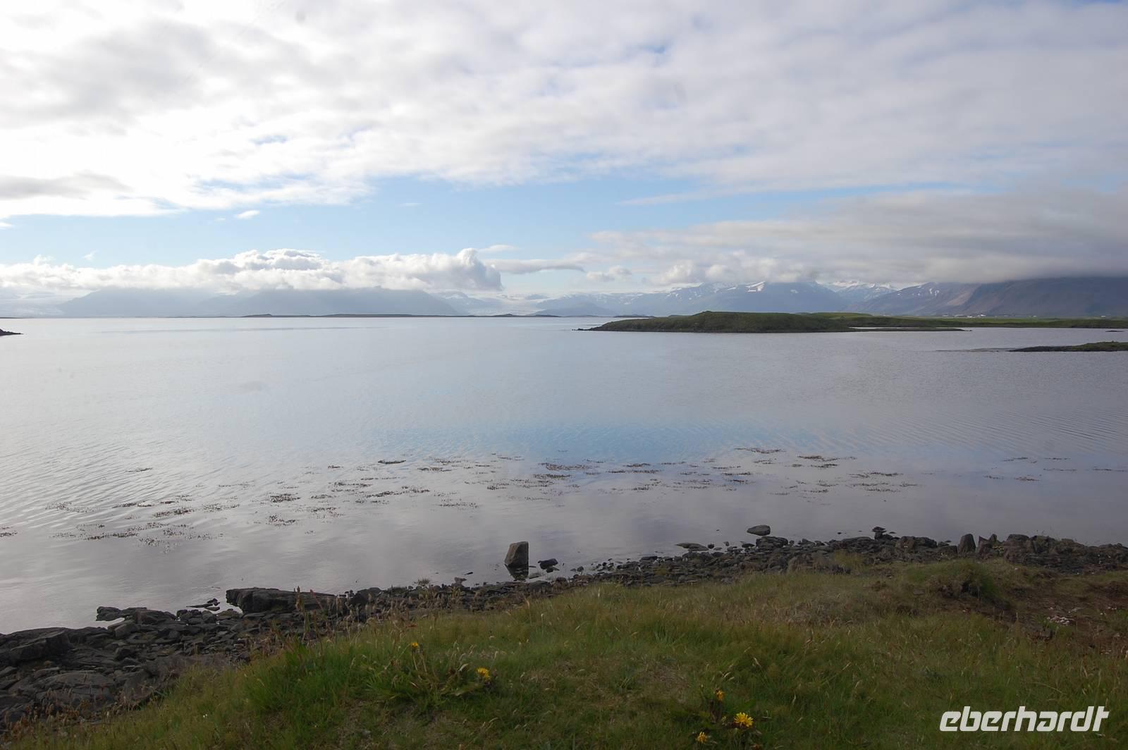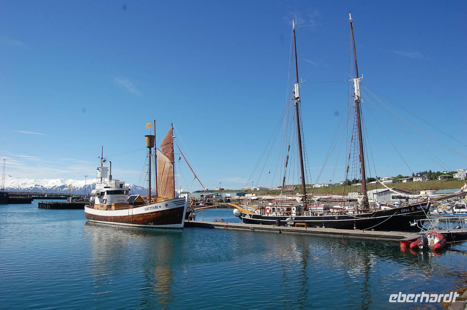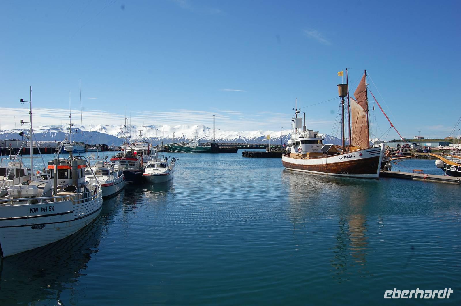 Nach einem gemütlichen Frühstück starten wir um 09.00 Uhr und lassen uns von unserem Fahrer „Münte" durch seine Heimatstadt fahren. Er zeigt uns die ursprünglich ersten Holzhäuser auf der verlängerten Hafenstraße und den sehenswerten botanischen Garten. Oberhalb der Stadt sehen wir schneebedeckte Hänge, auf denen Wintersport möglich ist. Über eine Brücke wechseln wir auf die andere Seite des Fjordes und machen einen kurzen Stopp, um das Stadtbild von Akureyri, das sich auf der glatten Wasserfläche des Fjordes spiegelt, zu fotografieren. Der strahlend blaue Himmel und die glatte, ruhige See verheißen uns nicht nur einen schönen Tag, sondern wir entschließen uns, an diesem Abend eine Walbeobachtung zu unternehmen, bei der wir nicht nur gute Chancen haben, die Meeressäuger zu sehen, sondern vielleicht auch die Mitternachtssonne, denn wir werden um Mitternacht nur 20 km südlich des Polarkreises unterwegs sein.