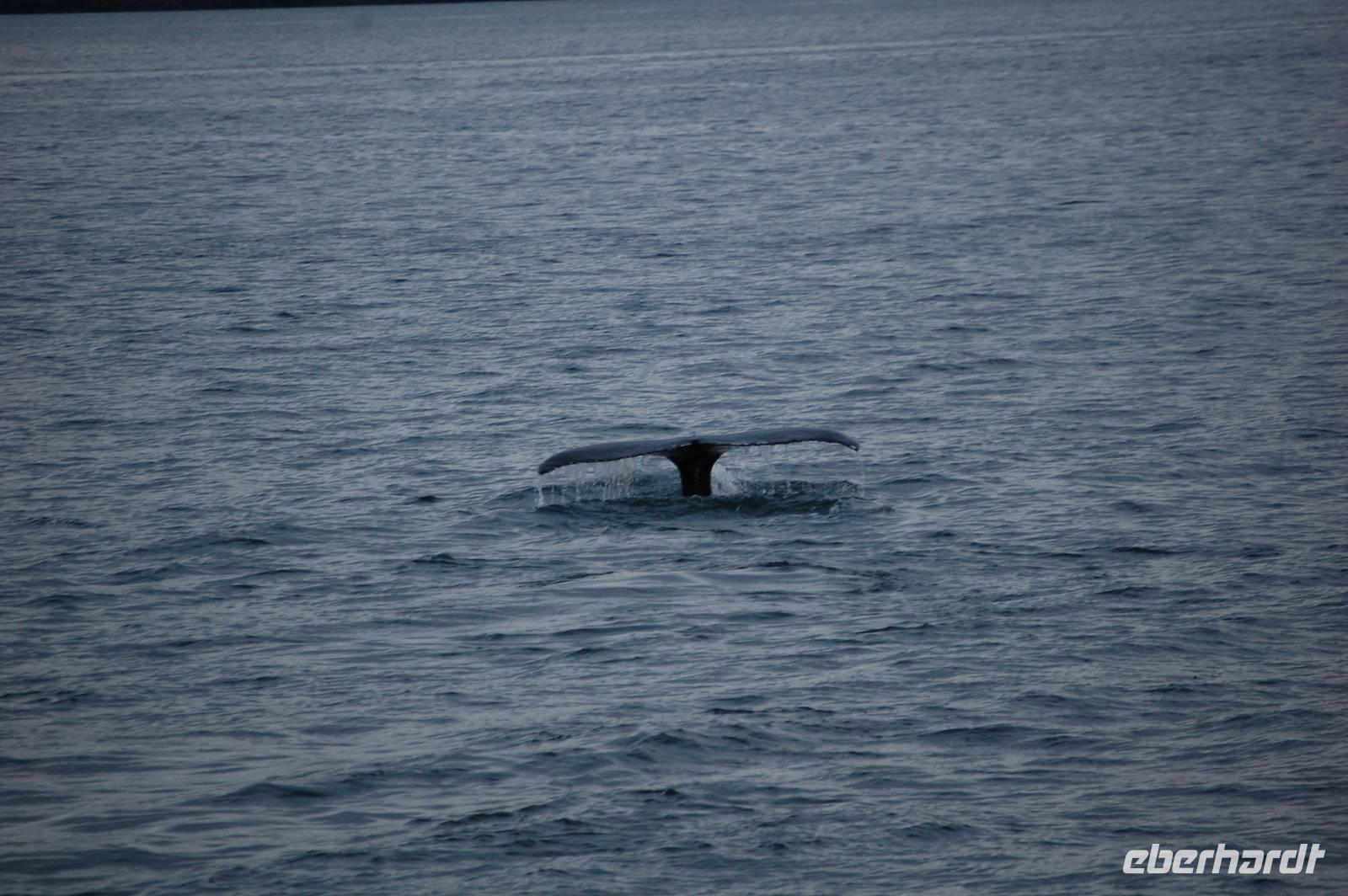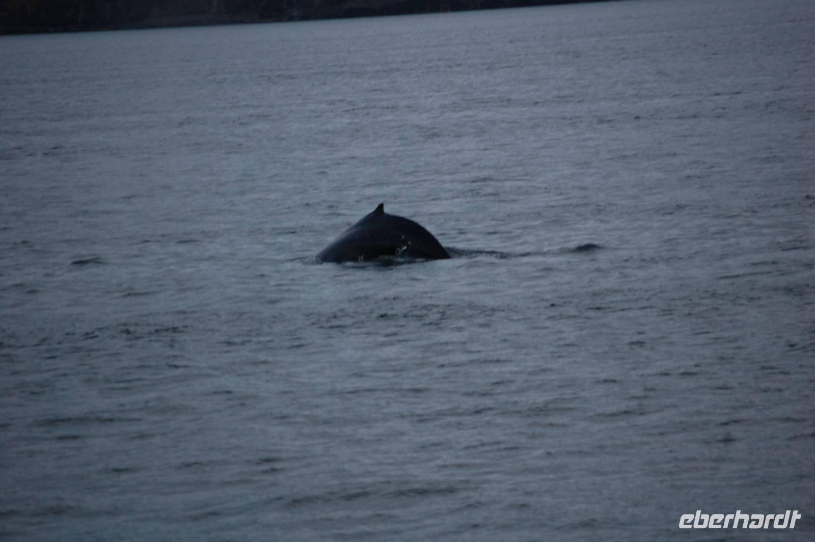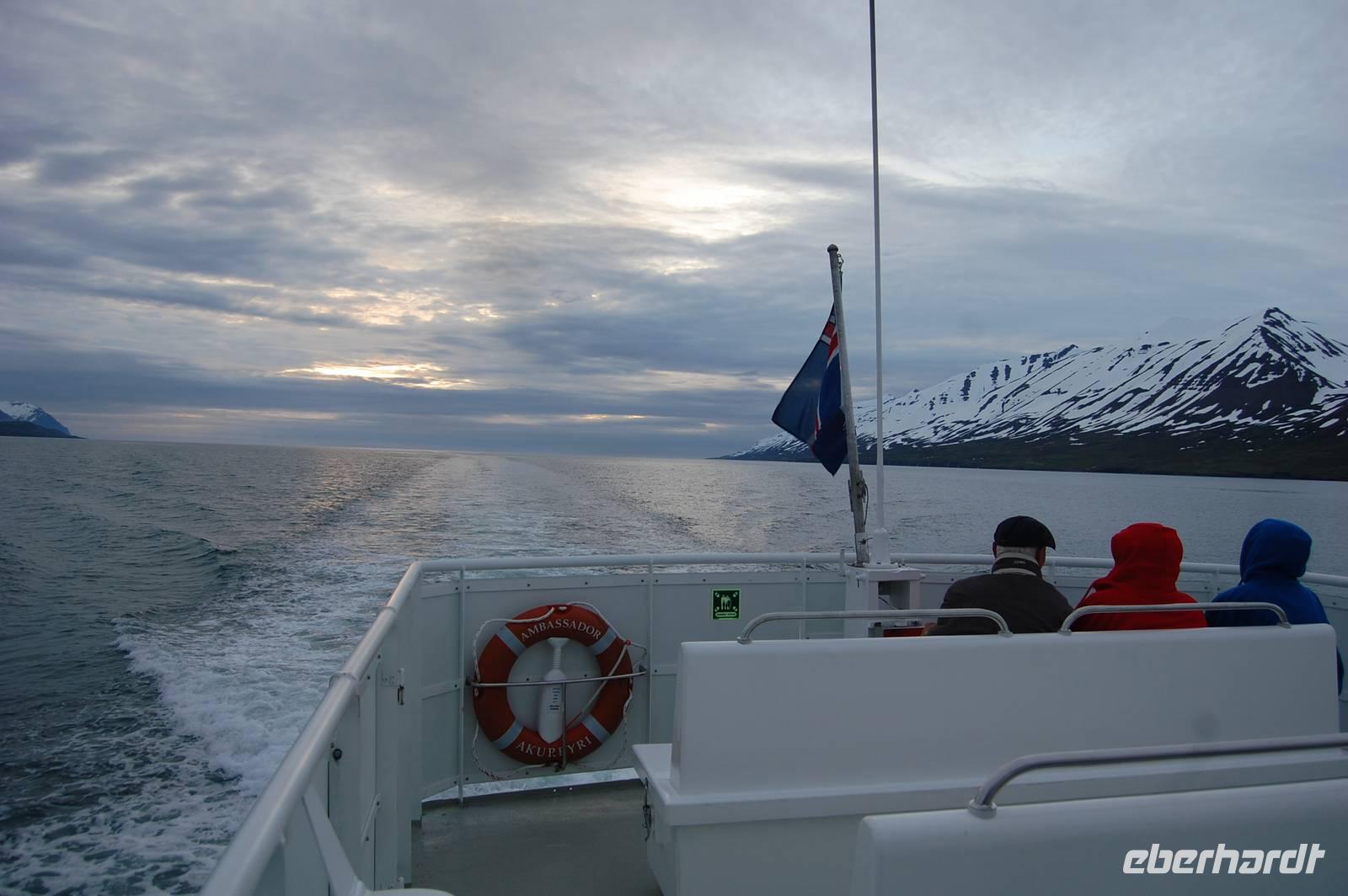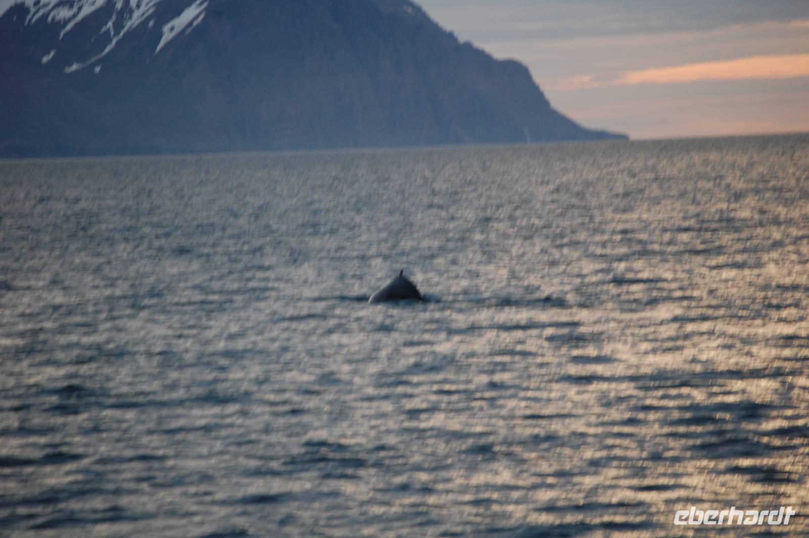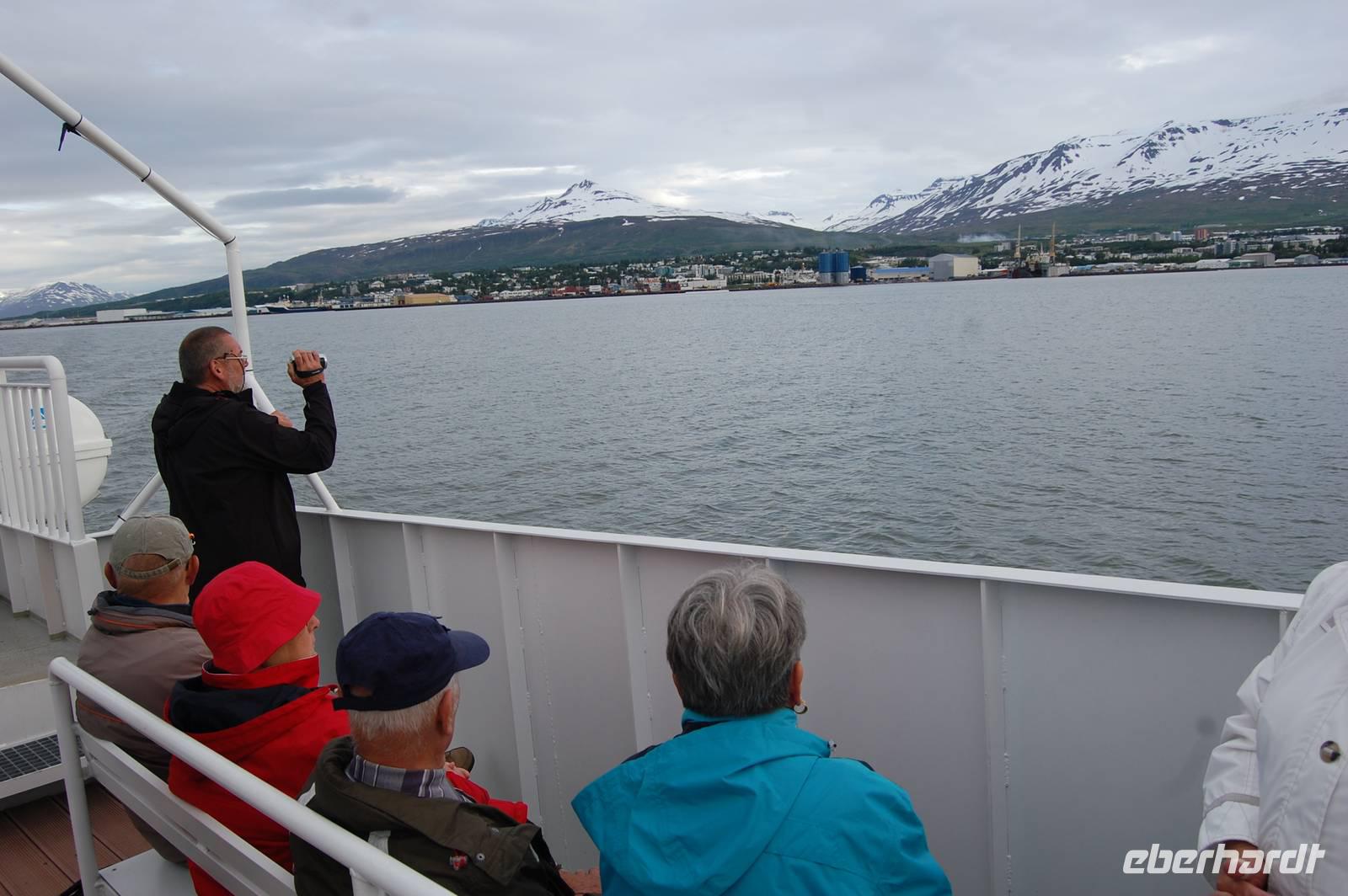 Um 17.00 Uhr erreichen wir wieder unser Hotel in Akureyri und treffen uns bereits 18 Uhr zum gemeinsamen Abendessen, denn wir möchten um 20.30 Uhr mit einem Schiff im Hafen zur Walbeobachtung aufbrechen. Unsere isländische Reiseleiterin, Rosa, hat bereits alles reserviert, sodass wir pünktlich in See stechen können. In 2 Stunden bringt uns das Boot 30 oder 40 km hinaus in Richtung Meer, jedoch befinden wir uns immer noch im Fjord, als unsere deutsche Stewardess (aus Schwerin) plötzlich „11 Uhr: ein Buckelwal" ruft. Von nun an wurden die Köpfe und Kameras der Fahrgäste immer wieder in eine Richtung gewiesen, die sich aus der Zeigerstellung einer Uhr ergibt. So konnten wir bis Mitternacht 4 oder 5 verschiedene Buckelwale beobachten, die sich immer wieder aus der glatten See hoben oder die Schwanzflosse zeigten.