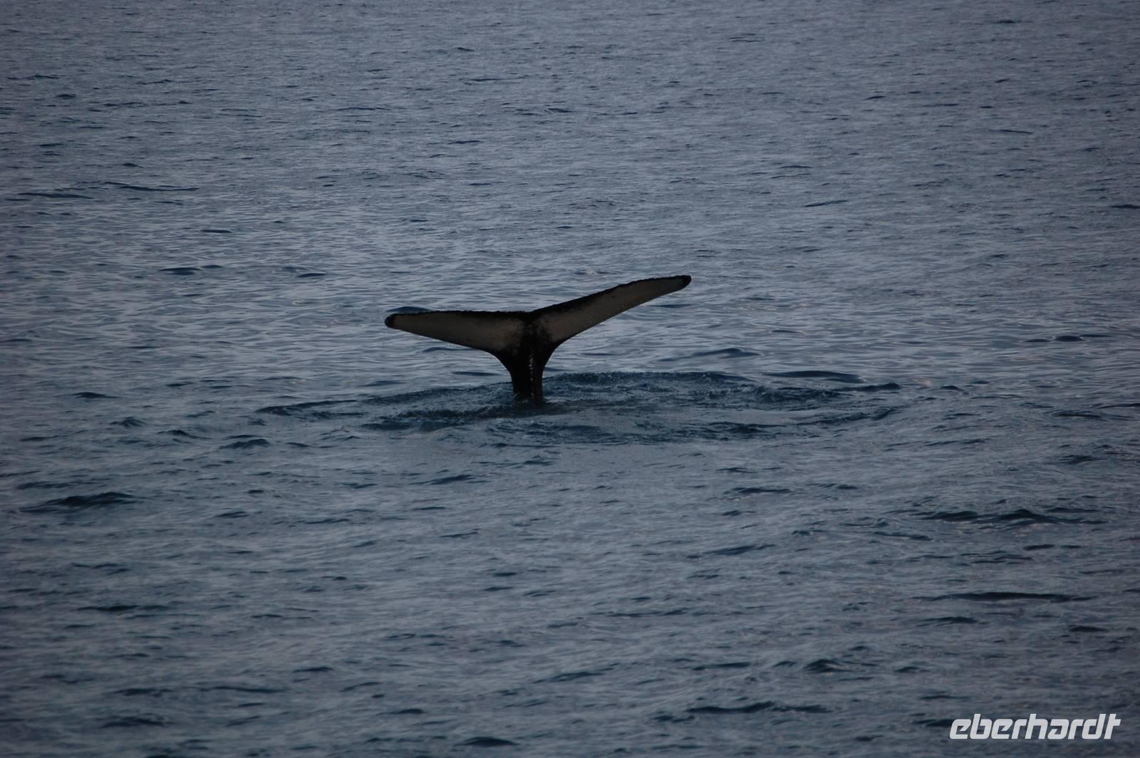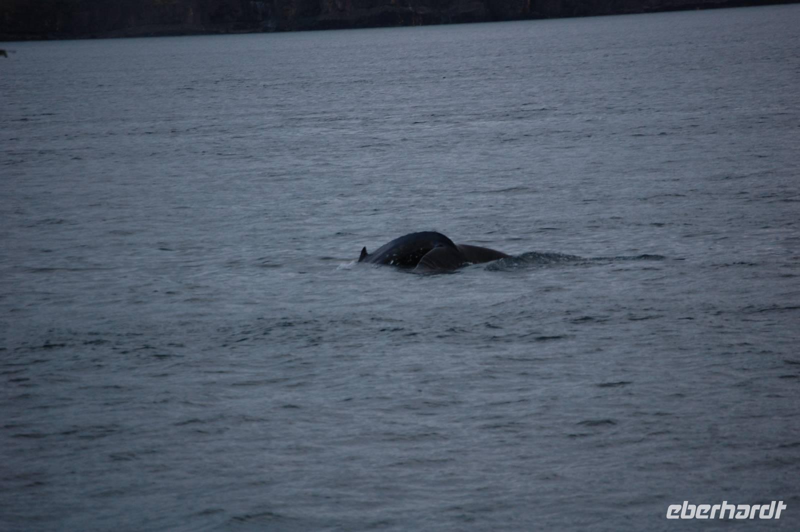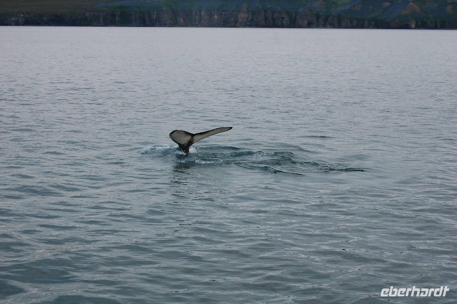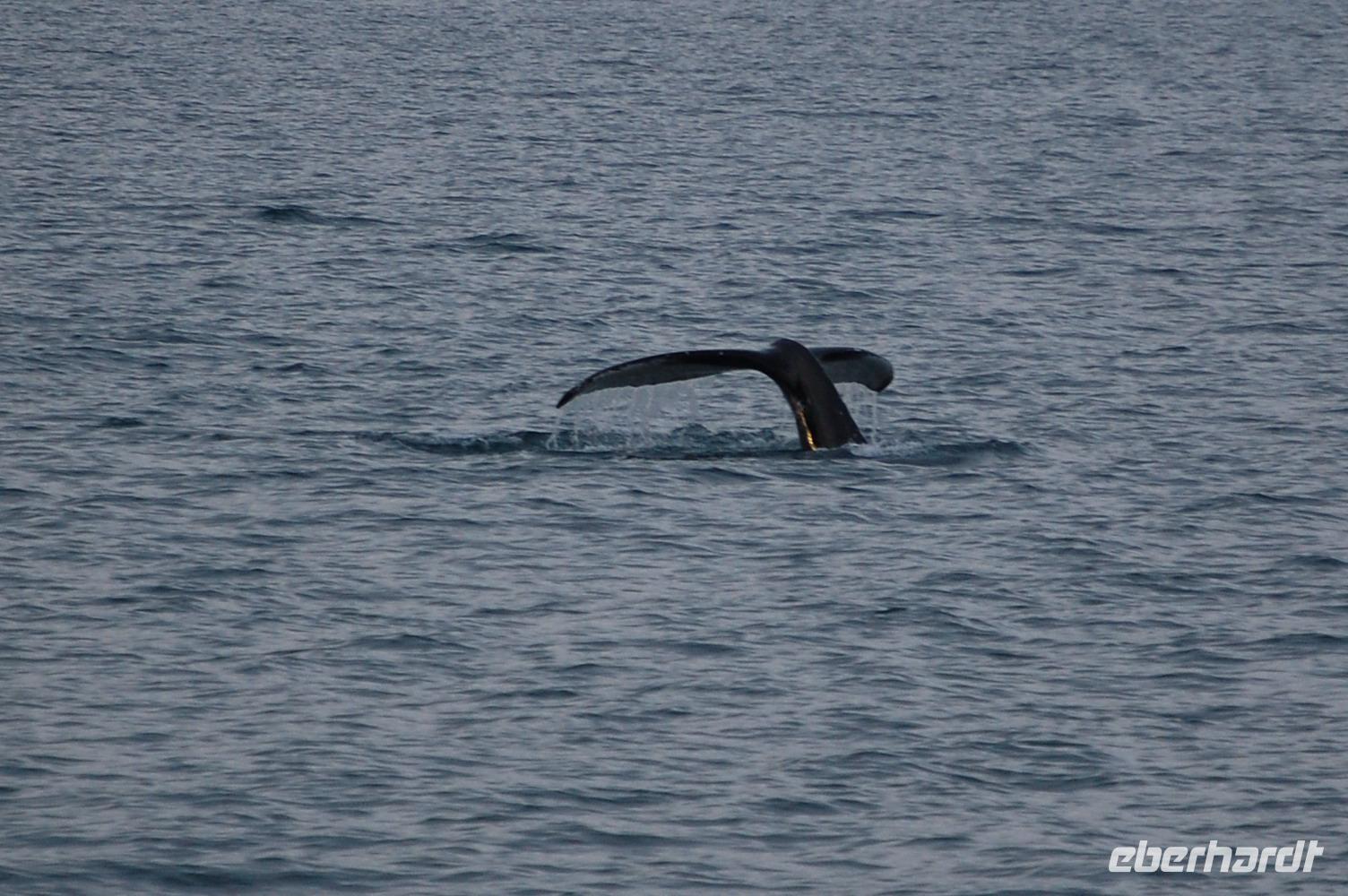 Um 17.00 Uhr erreichen wir wieder unser Hotel in Akureyri und treffen uns bereits 18 Uhr zum gemeinsamen Abendessen, denn wir möchten um 20.30 Uhr mit einem Schiff im Hafen zur Walbeobachtung aufbrechen. Unsere isländische Reiseleiterin, Rosa, hat bereits alles reserviert, sodass wir pünktlich in See stechen können. In 2 Stunden bringt uns das Boot 30 oder 40 km hinaus in Richtung Meer, jedoch befinden wir uns immer noch im Fjord, als unsere deutsche Stewardess (aus Schwerin) plötzlich „11 Uhr: ein Buckelwal" ruft. Von nun an wurden die Köpfe und Kameras der Fahrgäste immer wieder in eine Richtung gewiesen, die sich aus der Zeigerstellung einer Uhr ergibt. So konnten wir bis Mitternacht 4 oder 5 verschiedene Buckelwale beobachten, die sich immer wieder aus der glatten See hoben oder die Schwanzflosse zeigten.