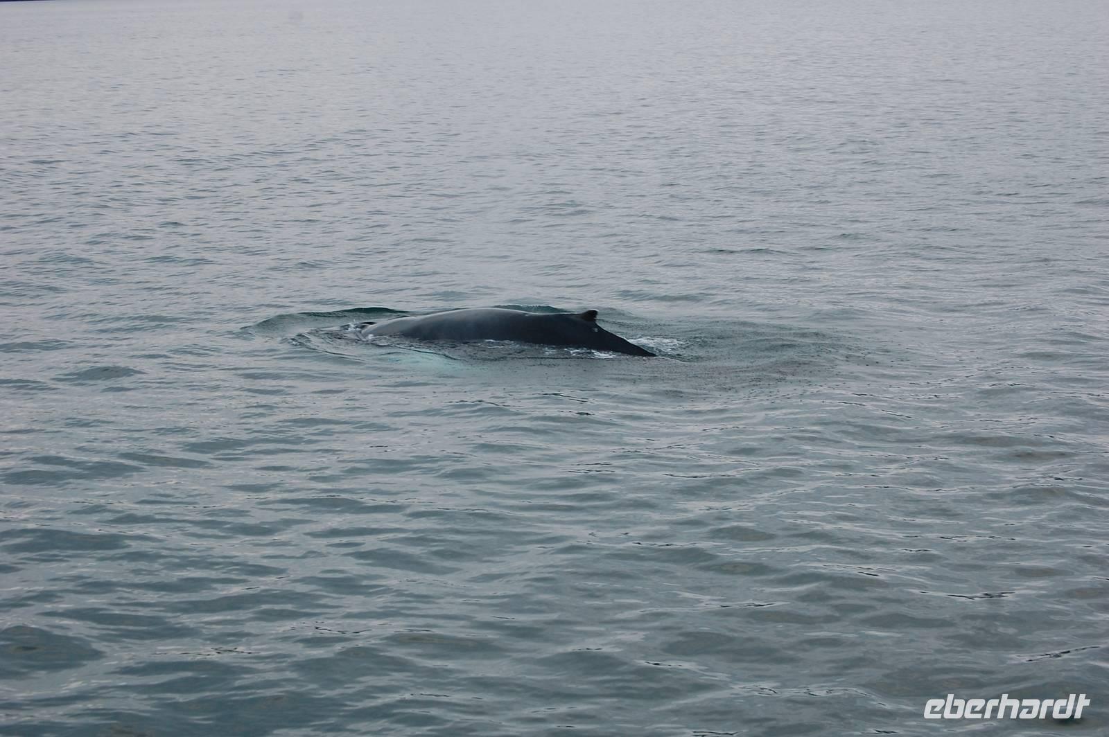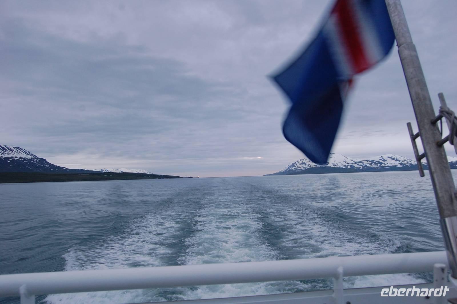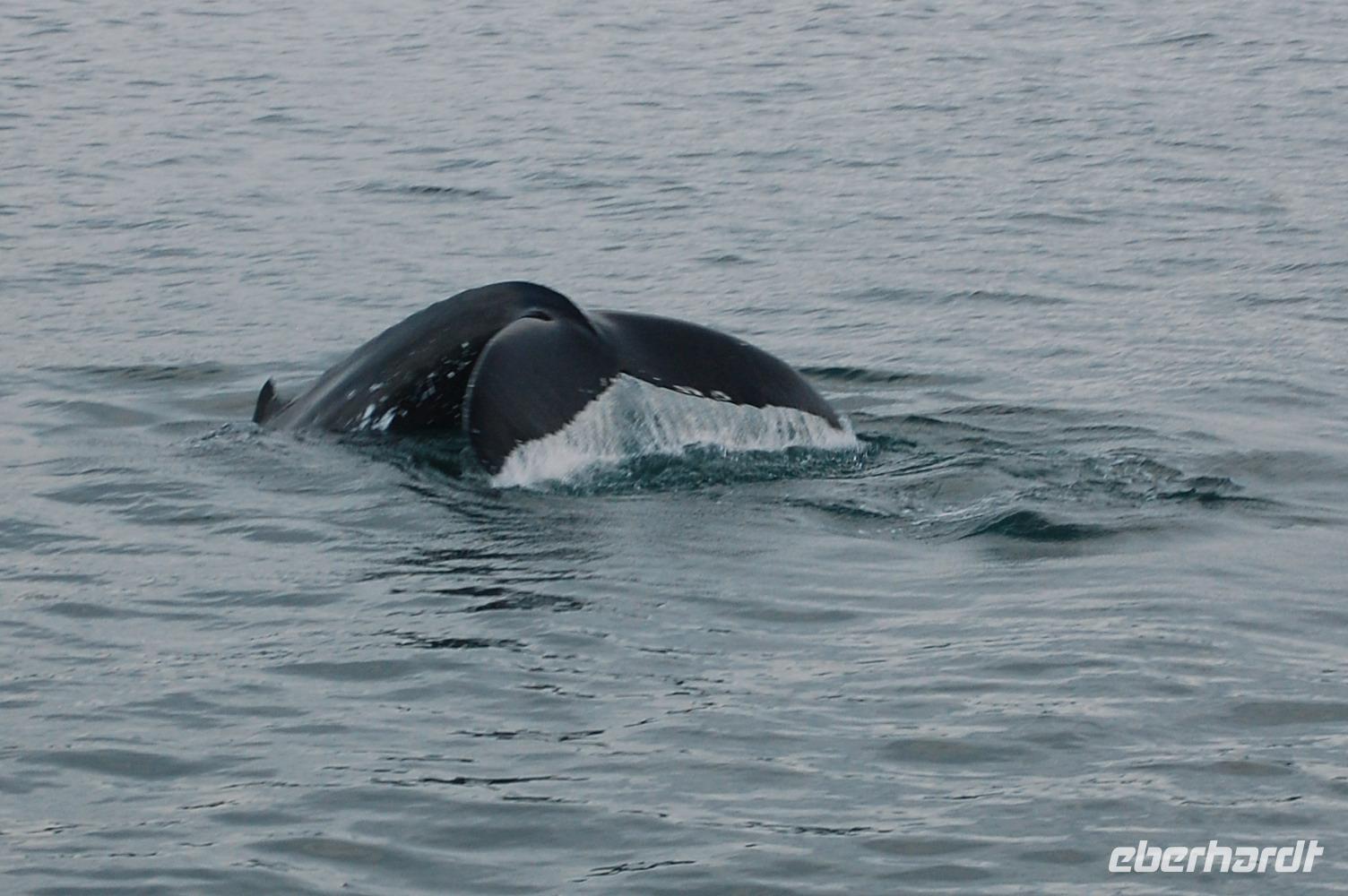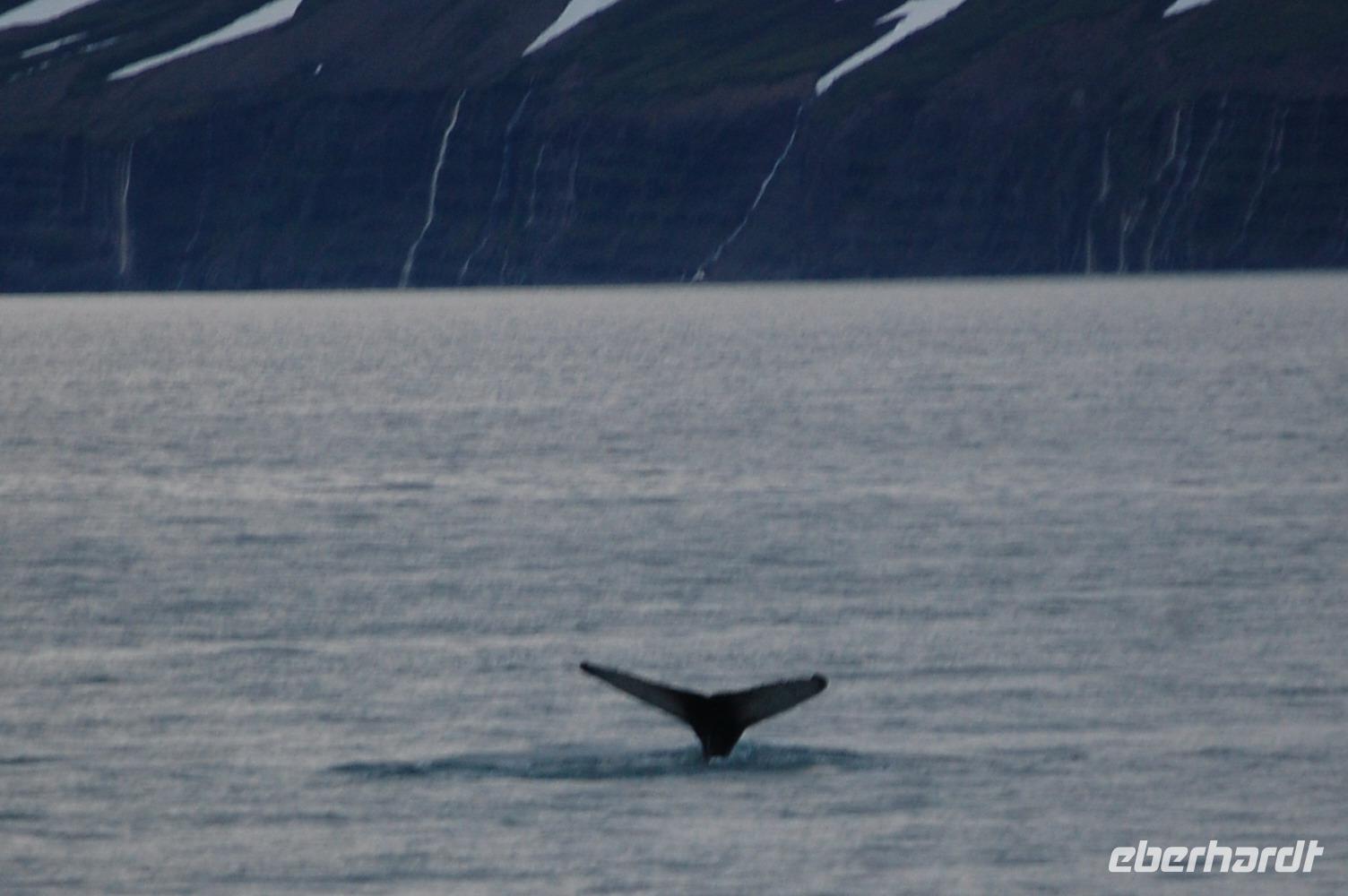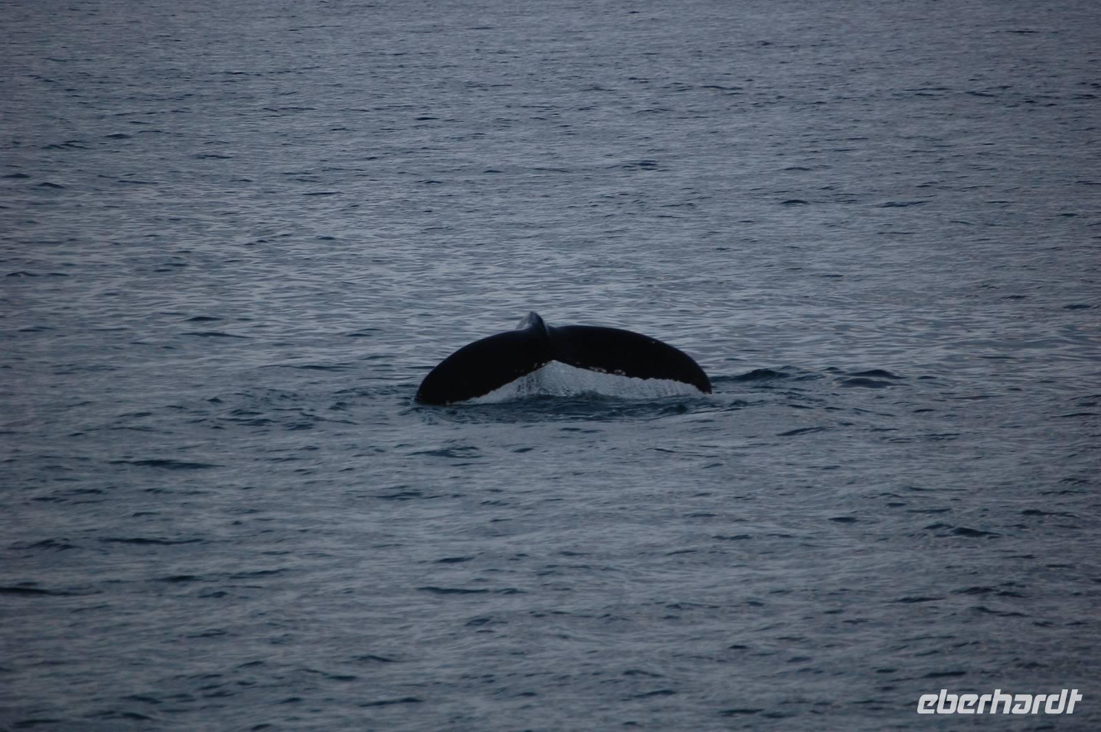 Um 17.00 Uhr erreichen wir wieder unser Hotel in Akureyri und treffen uns bereits 18 Uhr zum gemeinsamen Abendessen, denn wir möchten um 20.30 Uhr mit einem Schiff im Hafen zur Walbeobachtung aufbrechen. Unsere isländische Reiseleiterin, Rosa, hat bereits alles reserviert, sodass wir pünktlich in See stechen können. In 2 Stunden bringt uns das Boot 30 oder 40 km hinaus in Richtung Meer, jedoch befinden wir uns immer noch im Fjord, als unsere deutsche Stewardess (aus Schwerin) plötzlich „11 Uhr: ein Buckelwal" ruft. Von nun an wurden die Köpfe und Kameras der Fahrgäste immer wieder in eine Richtung gewiesen, die sich aus der Zeigerstellung einer Uhr ergibt. So konnten wir bis Mitternacht 4 oder 5 verschiedene Buckelwale beobachten, die sich immer wieder aus der glatten See hoben oder die Schwanzflosse zeigten.