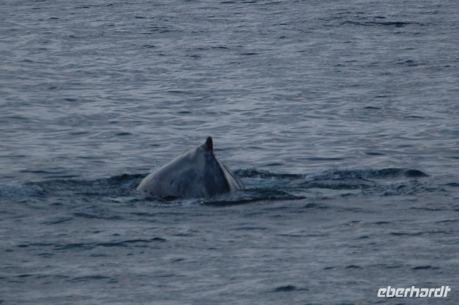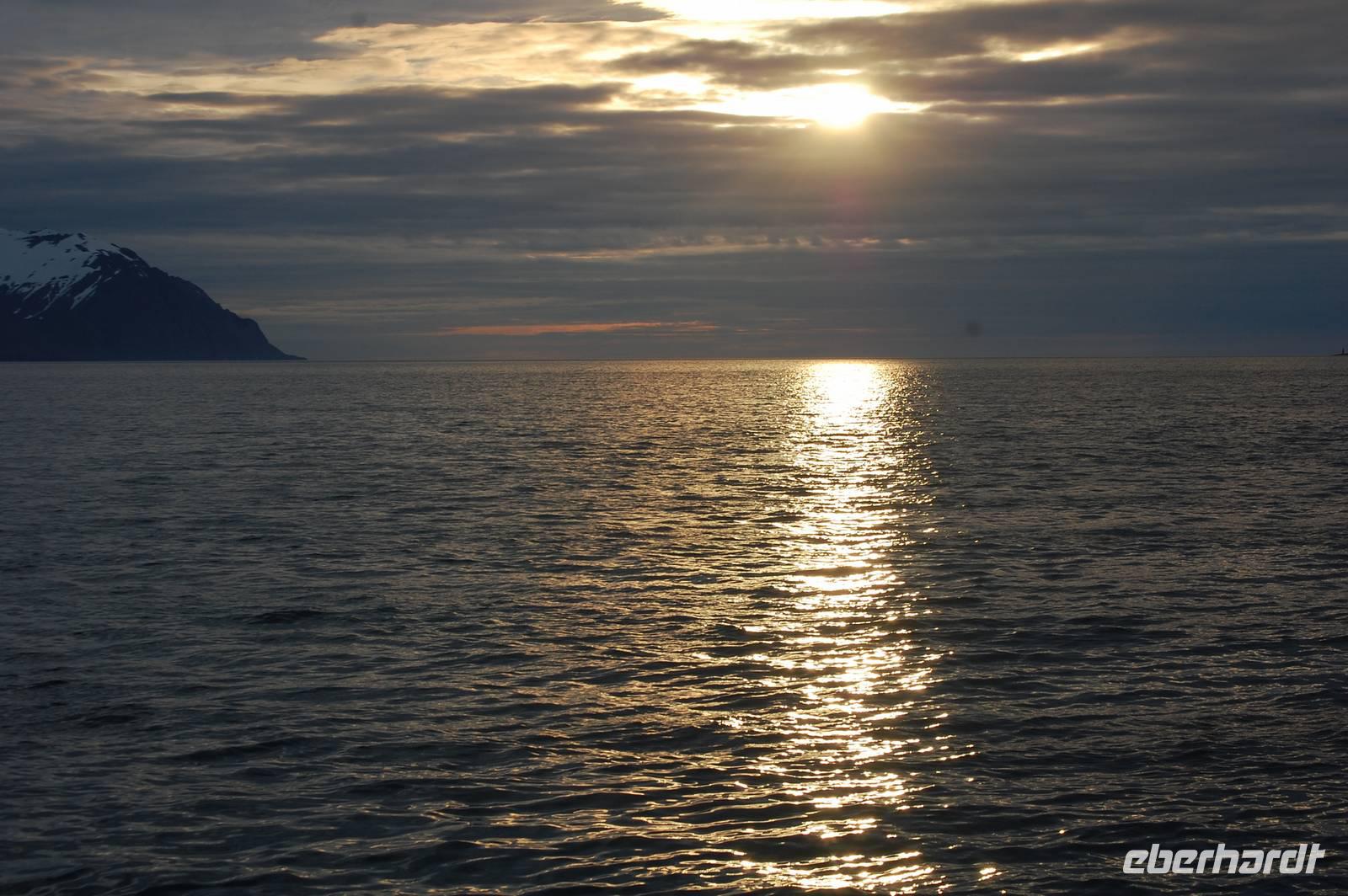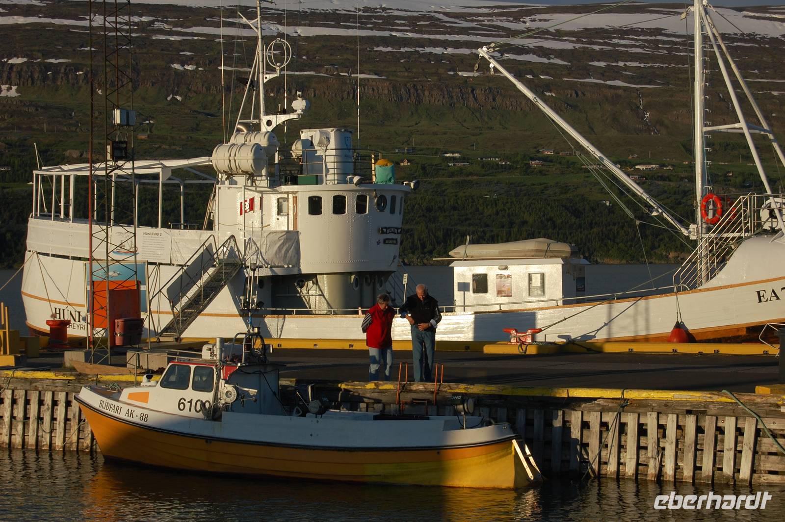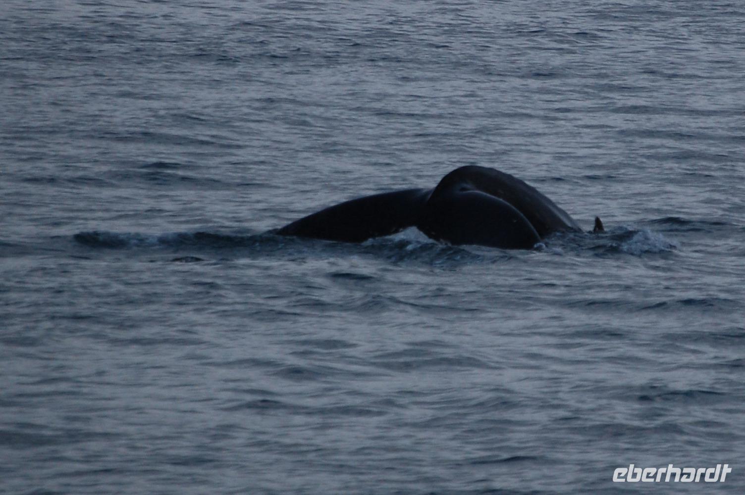 Um 17.00 Uhr erreichen wir wieder unser Hotel in Akureyri und treffen uns bereits 18 Uhr zum gemeinsamen Abendessen, denn wir möchten um 20.30 Uhr mit einem Schiff im Hafen zur Walbeobachtung aufbrechen. Unsere isländische Reiseleiterin, Rosa, hat bereits alles reserviert, sodass wir pünktlich in See stechen können. In 2 Stunden bringt uns das Boot 30 oder 40 km hinaus in Richtung Meer, jedoch befinden wir uns immer noch im Fjord, als unsere deutsche Stewardess (aus Schwerin) plötzlich „11 Uhr: ein Buckelwal" ruft. Von nun an wurden die Köpfe und Kameras der Fahrgäste immer wieder in eine Richtung gewiesen, die sich aus der Zeigerstellung einer Uhr ergibt. So konnten wir bis Mitternacht 4 oder 5 verschiedene Buckelwale beobachten, die sich immer wieder aus der glatten See hoben oder die Schwanzflosse zeigten.