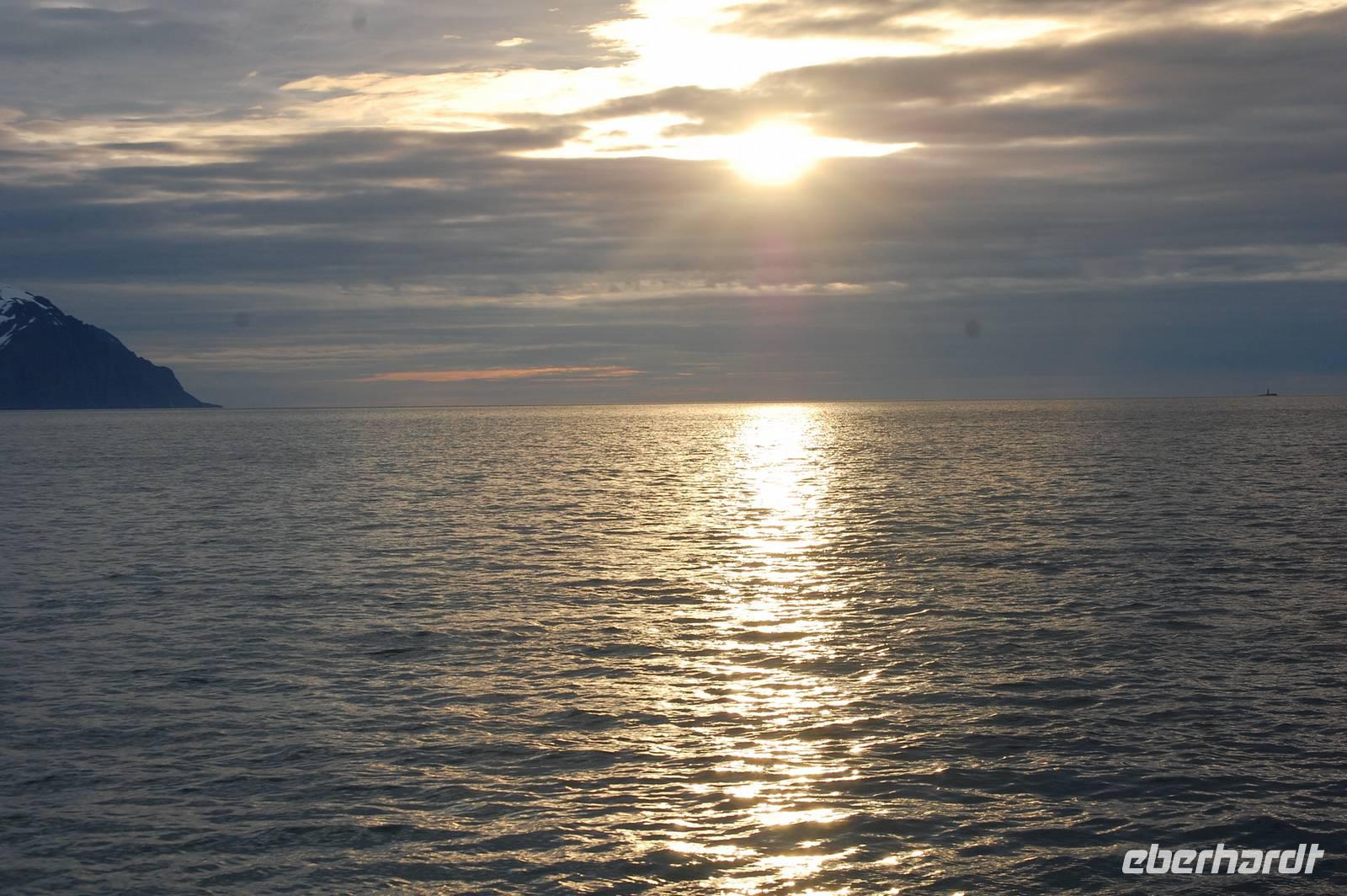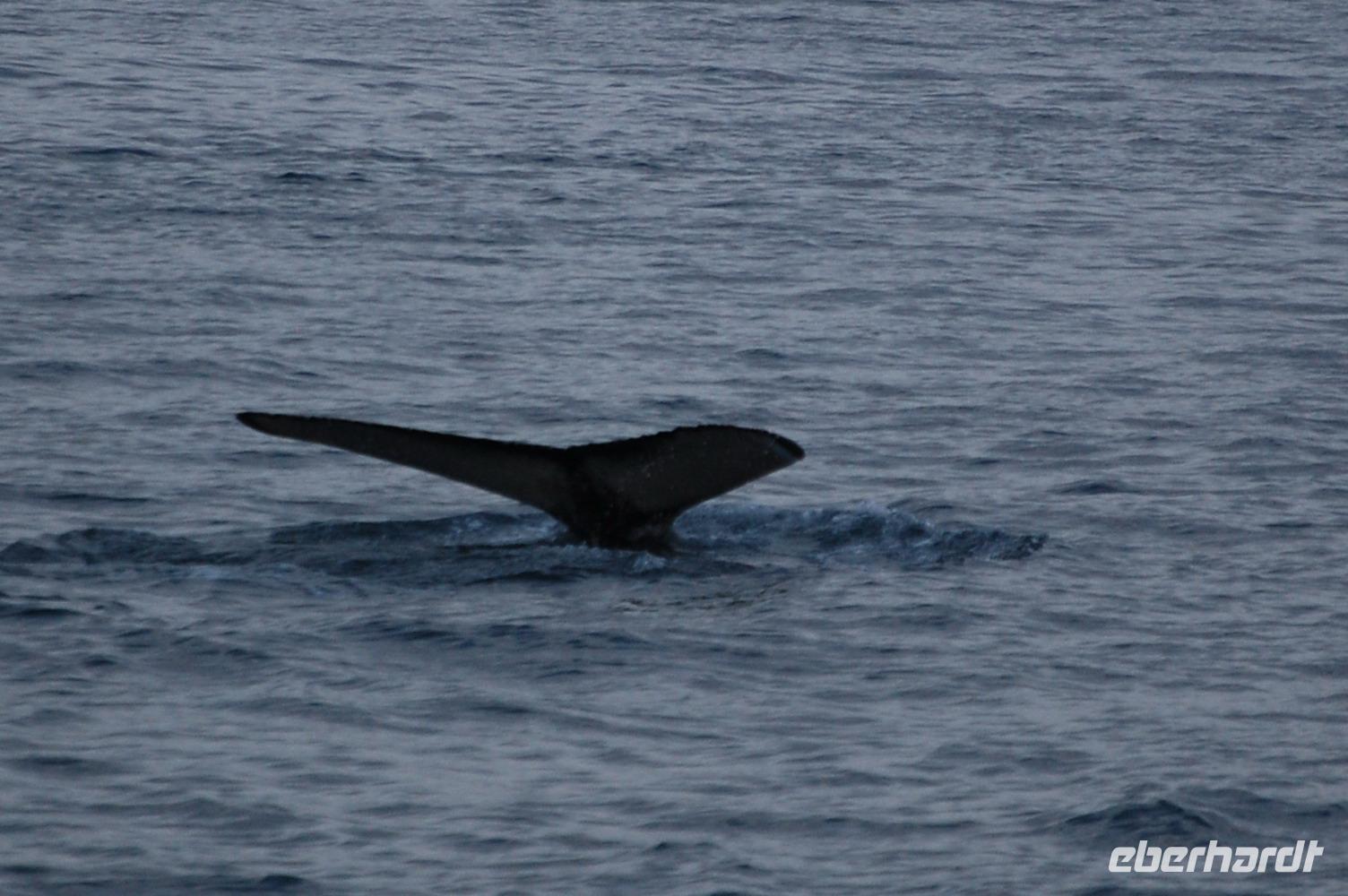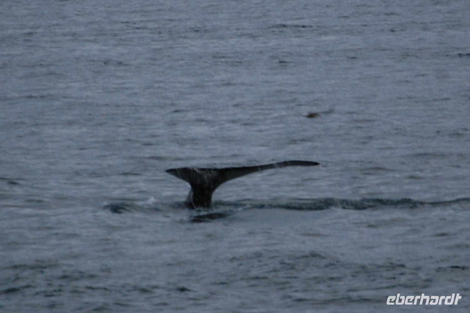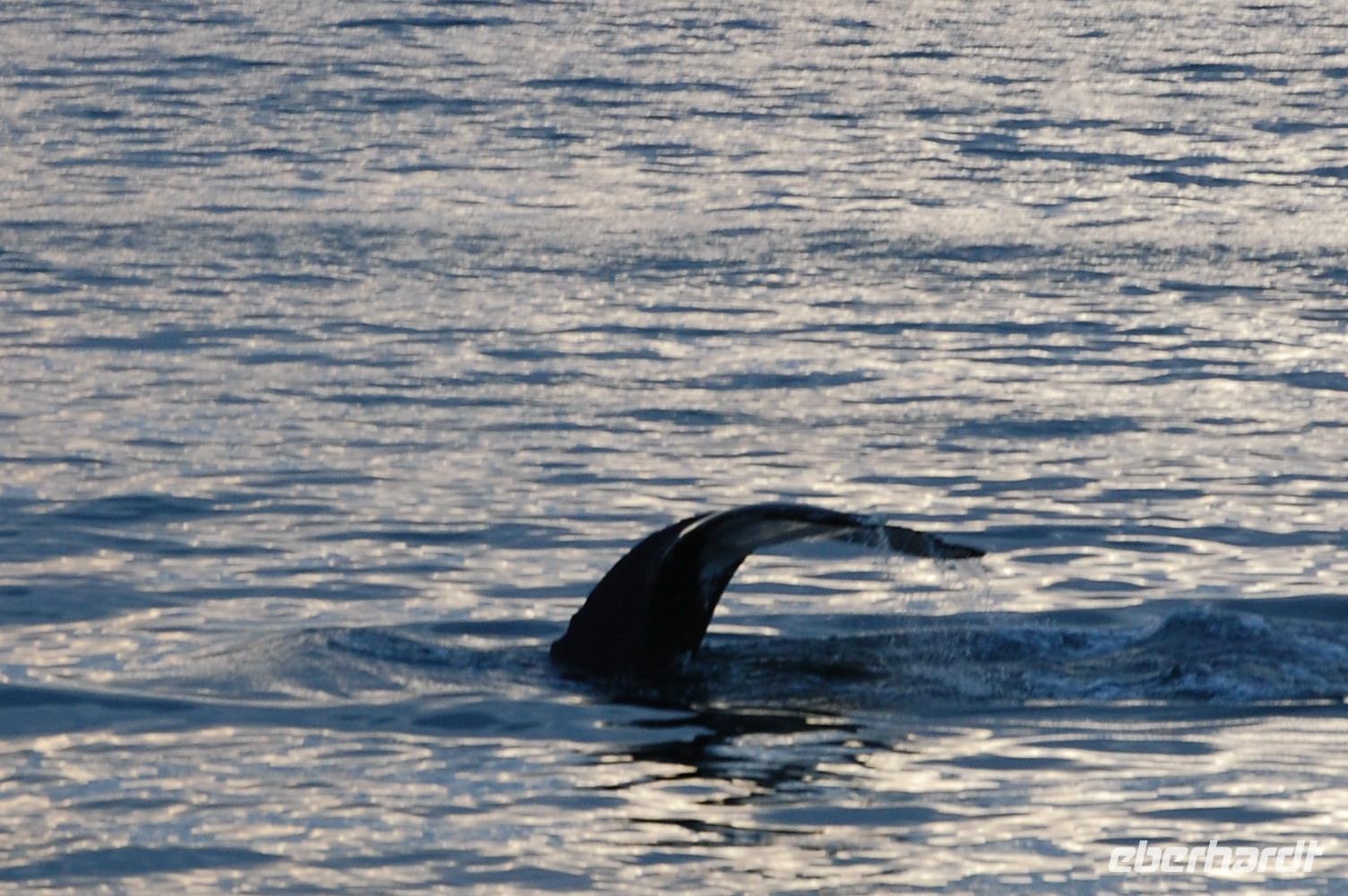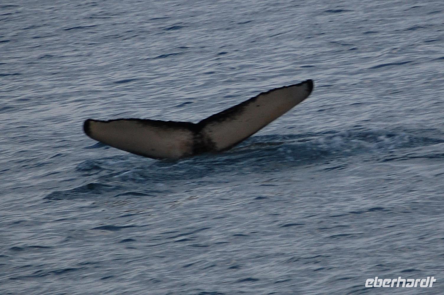 Um 17.00 Uhr erreichen wir wieder unser Hotel in Akureyri und treffen uns bereits 18 Uhr zum gemeinsamen Abendessen, denn wir möchten um 20.30 Uhr mit einem Schiff im Hafen zur Walbeobachtung aufbrechen. Unsere isländische Reiseleiterin, Rosa, hat bereits alles reserviert, sodass wir pünktlich in See stechen können. In 2 Stunden bringt uns das Boot 30 oder 40 km hinaus in Richtung Meer, jedoch befinden wir uns immer noch im Fjord, als unsere deutsche Stewardess (aus Schwerin) plötzlich „11 Uhr: ein Buckelwal" ruft. Von nun an wurden die Köpfe und Kameras der Fahrgäste immer wieder in eine Richtung gewiesen, die sich aus der Zeigerstellung einer Uhr ergibt. So konnten wir bis Mitternacht 4 oder 5 verschiedene Buckelwale beobachten, die sich immer wieder aus der glatten See hoben oder die Schwanzflosse zeigten.