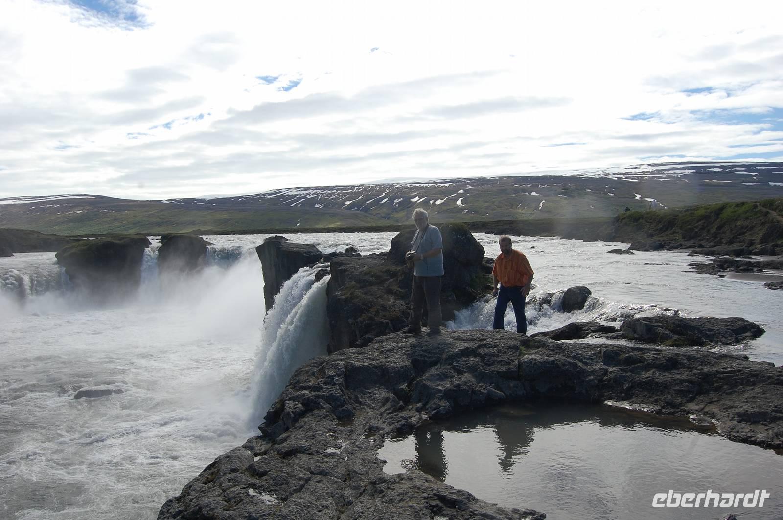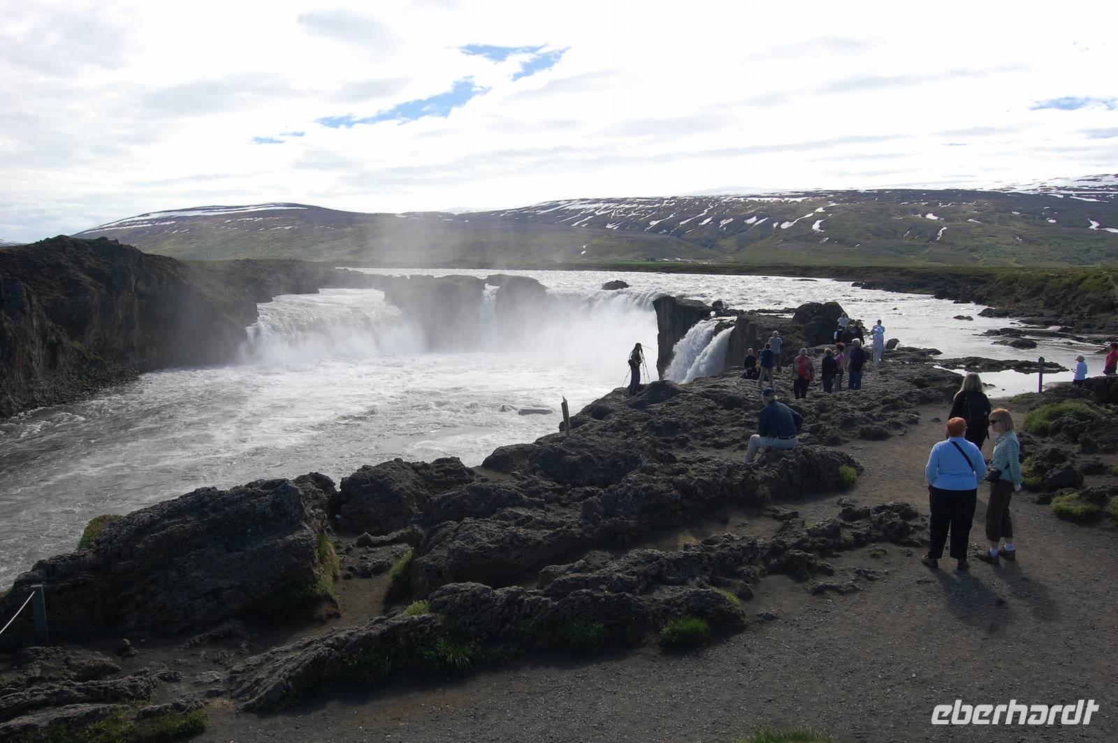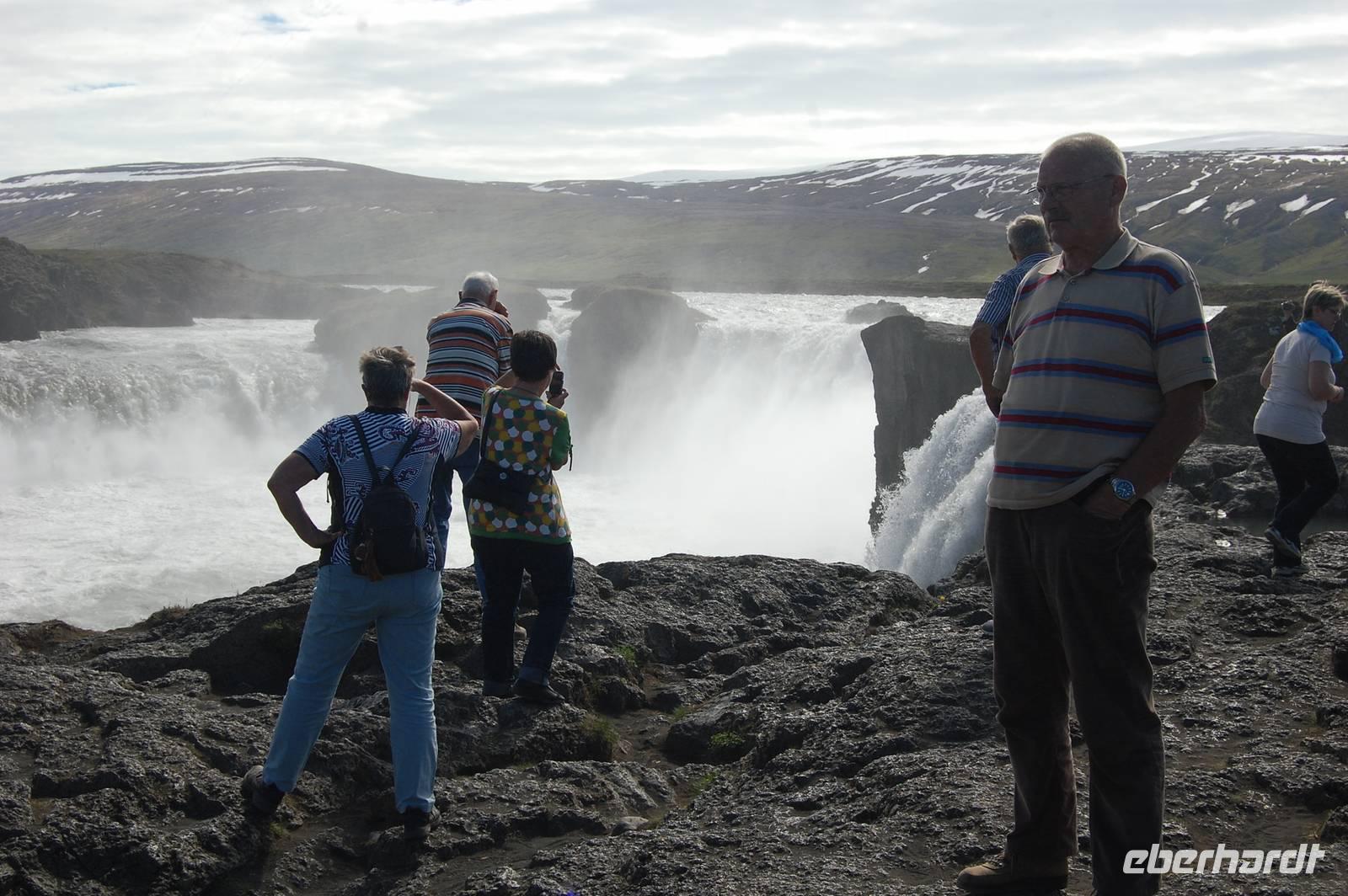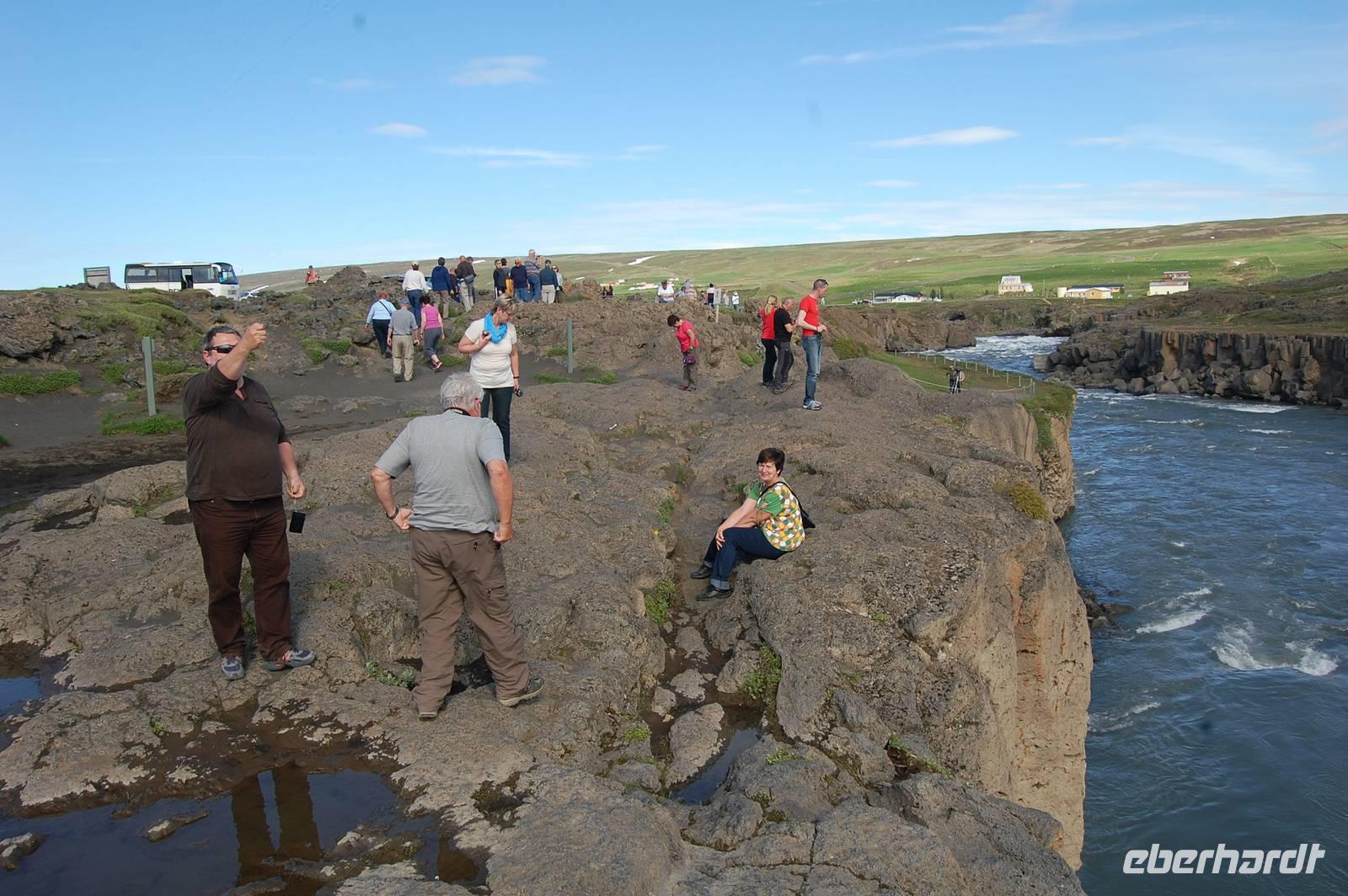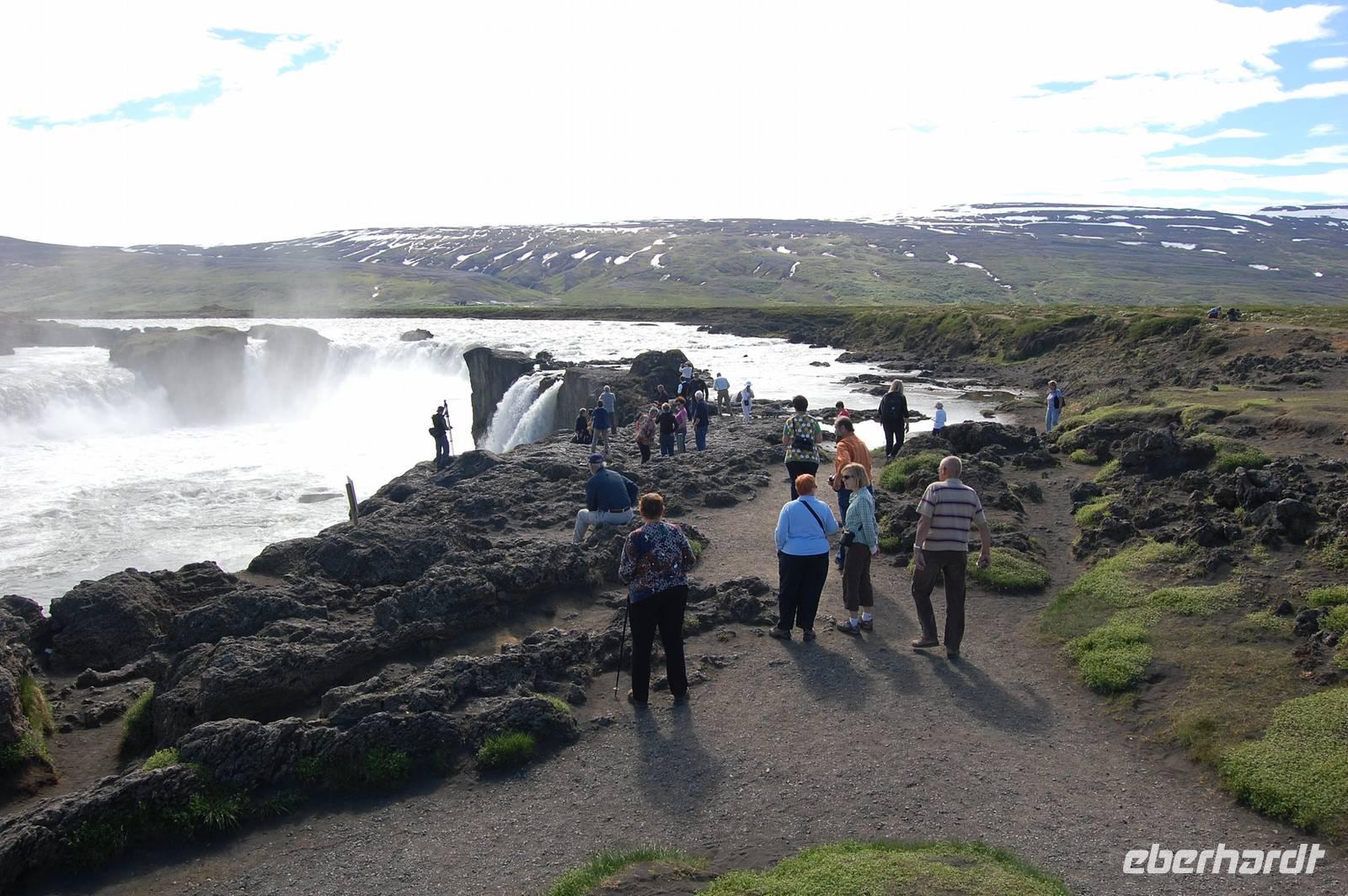 Doch erst einmal fahren wir entlang des „Eyjafjödur" = Inselfjord nach Norden, dann über den Buckel weiter durch das benachbarte Tal in das Hafenstädtchen Húsavík und nach einem kurzen Stopp weiter auf der Halbinsel Tjörnes nach Norden zum Kap. Dort laden die gute Fernsicht und die vielen brütenden Vögel zu einem Fotostopp ein, bevor wir weiter nach Süden in den Nationalpark Asbyrgi reisen. Hier floss in der Vergangenheit ein breiter Fluss, der sich tosend in die Tiefe stürzte und somit diese Landschaft prägte. Durch eine tektonische Verschiebung verlagerte sich dieser Fluss irgendwann weiter nach Osten und so können wir bei einer kurzen Wanderung durch das ausgetrocknete Flussbett bis zum ehemaligen Wasserfall gehen. Das Wasser hat sich über Jahrtausende in den dunklen Granit gegraben, so dass links und rechts 30 bis 40 m hohe Felswände stehen, die Burgmauern gleichen. Nun bringt uns unser Reisebus zurück in das hübsche Fischerdorf Húsavík, wo wir unsere Mittagspause einlegen. Bei herrlichem Sonnenschein blicken wir über den Hafen hinüber zu den schneebedeckten Bergen auf der anderen Seite des Fjordes. Das letzte Busziel unseres heutigen Tages ist der „Götterwasserfall", den wir nach kurzer Fahrzeit erreichen. Am „Godafoss" haben wir wieder die Möglichkeit, bei einem Spaziergang den Wasserfall von beiden Ufern zu betrachten.