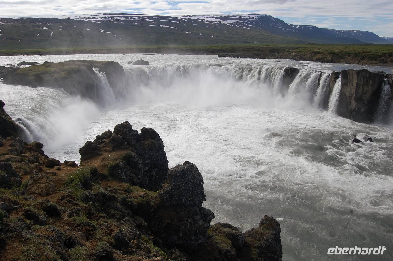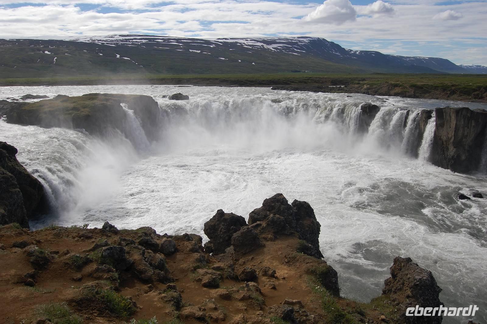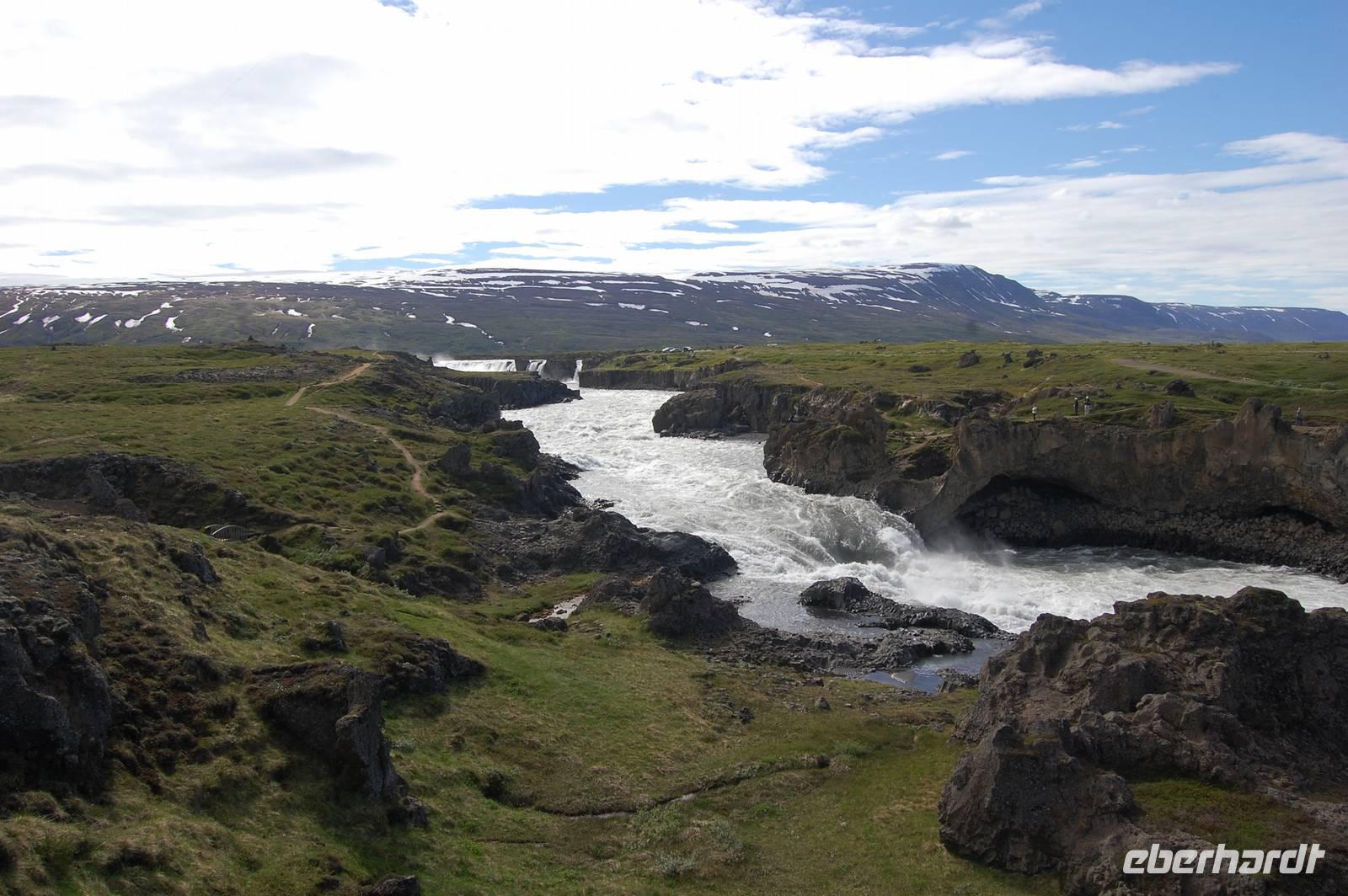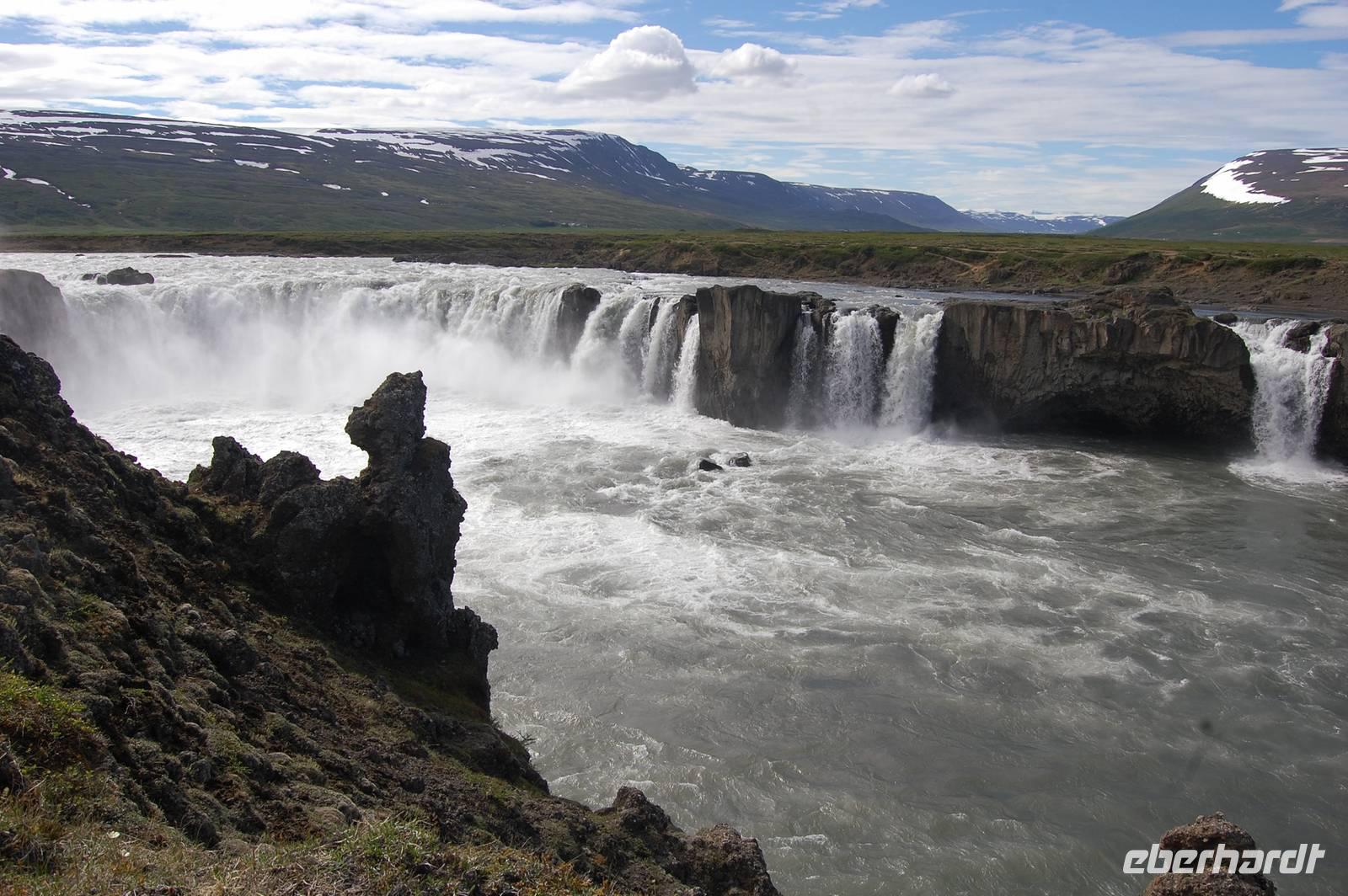 Doch erst einmal fahren wir entlang des „Eyjafjödur" = Inselfjord nach Norden, dann über den Buckel weiter durch das benachbarte Tal in das Hafenstädtchen Húsavík und nach einem kurzen Stopp weiter auf der Halbinsel Tjörnes nach Norden zum Kap. Dort laden die gute Fernsicht und die vielen brütenden Vögel zu einem Fotostopp ein, bevor wir weiter nach Süden in den Nationalpark Asbyrgi reisen. Hier floss in der Vergangenheit ein breiter Fluss, der sich tosend in die Tiefe stürzte und somit diese Landschaft prägte. Durch eine tektonische Verschiebung verlagerte sich dieser Fluss irgendwann weiter nach Osten und so können wir bei einer kurzen Wanderung durch das ausgetrocknete Flussbett bis zum ehemaligen Wasserfall gehen. Das Wasser hat sich über Jahrtausende in den dunklen Granit gegraben, so dass links und rechts 30 bis 40 m hohe Felswände stehen, die Burgmauern gleichen. Nun bringt uns unser Reisebus zurück in das hübsche Fischerdorf Húsavík, wo wir unsere Mittagspause einlegen. Bei herrlichem Sonnenschein blicken wir über den Hafen hinüber zu den schneebedeckten Bergen auf der anderen Seite des Fjordes. Das letzte Busziel unseres heutigen Tages ist der „Götterwasserfall", den wir nach kurzer Fahrzeit erreichen. Am „Godafoss" haben wir wieder die Möglichkeit, bei einem Spaziergang den Wasserfall von beiden Ufern zu betrachten.