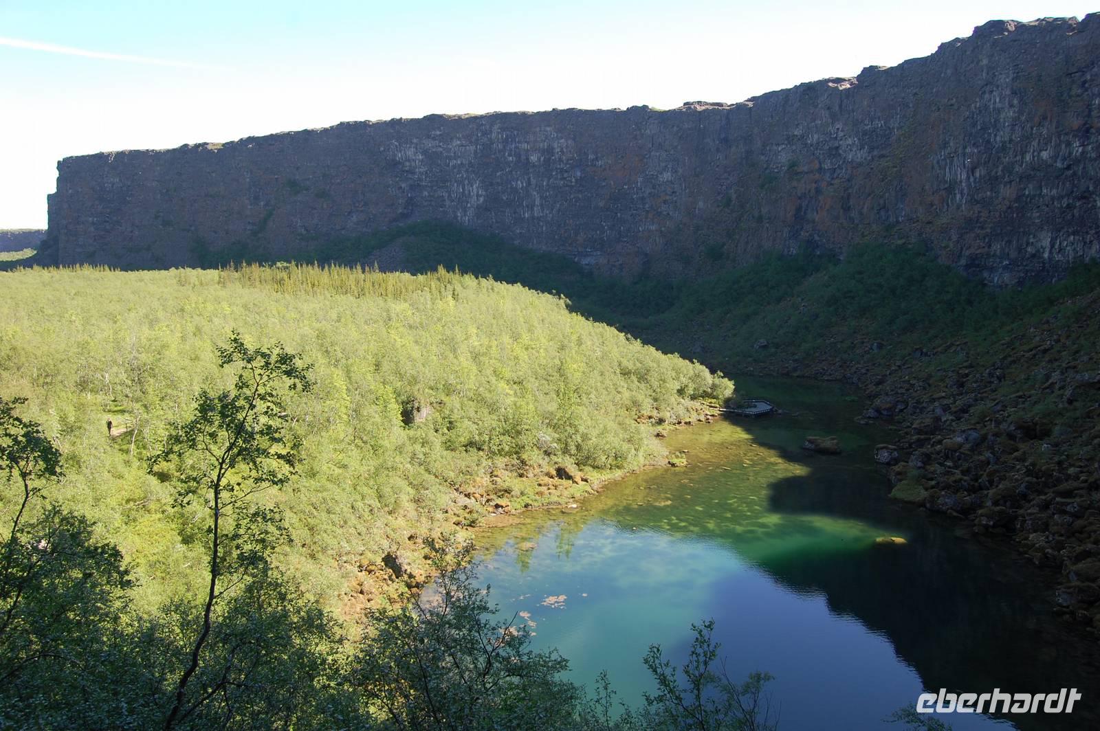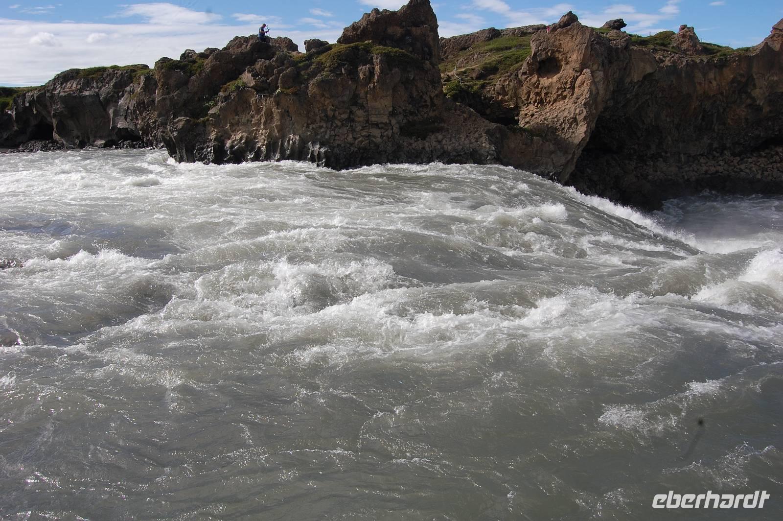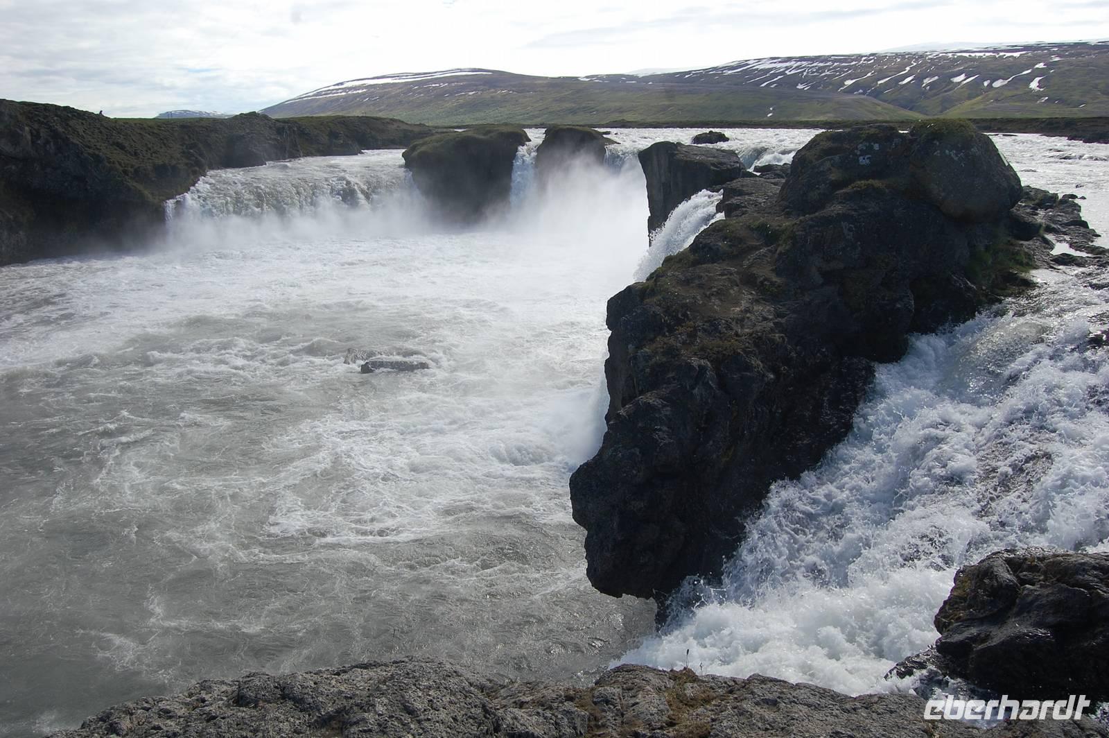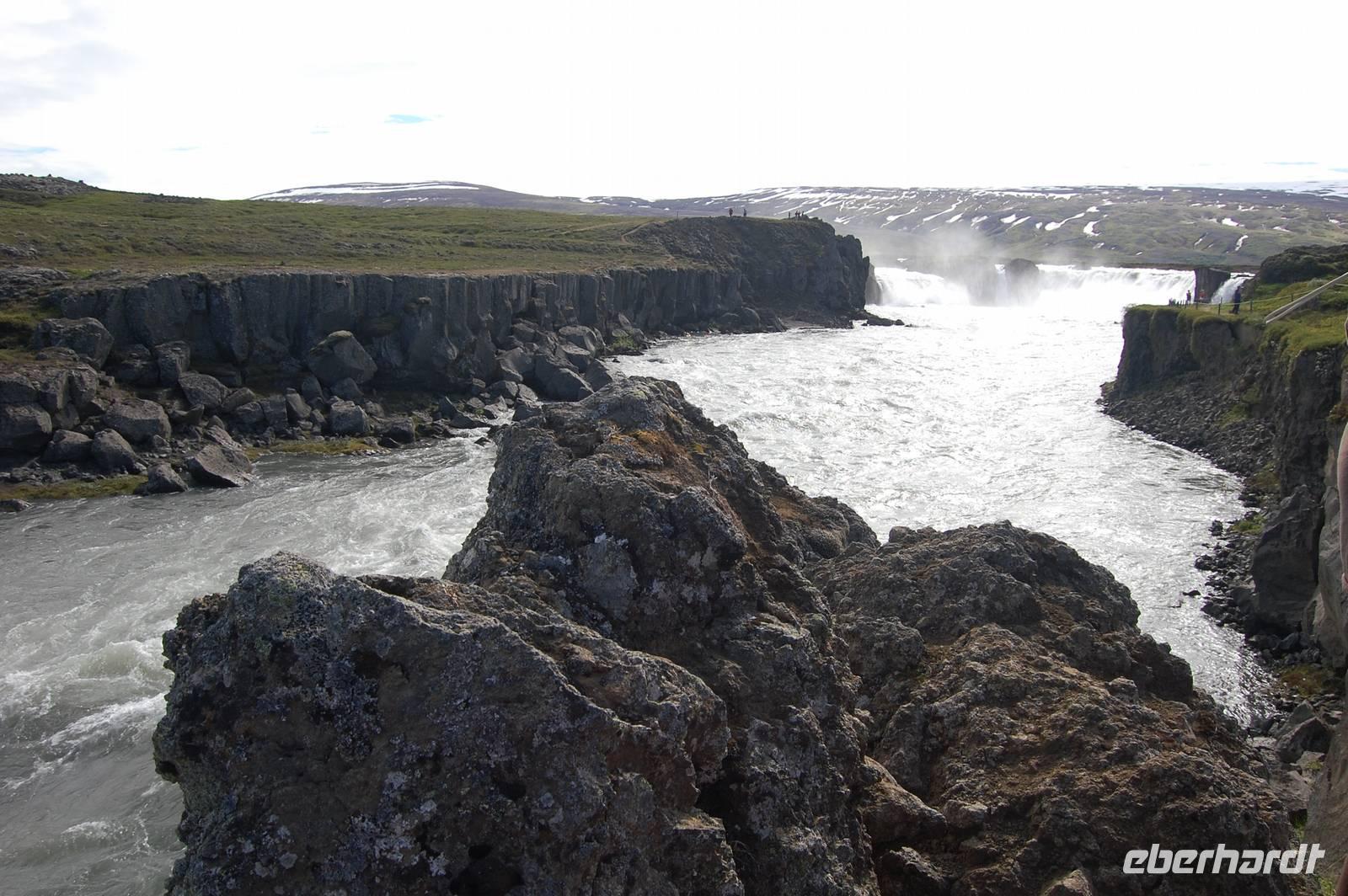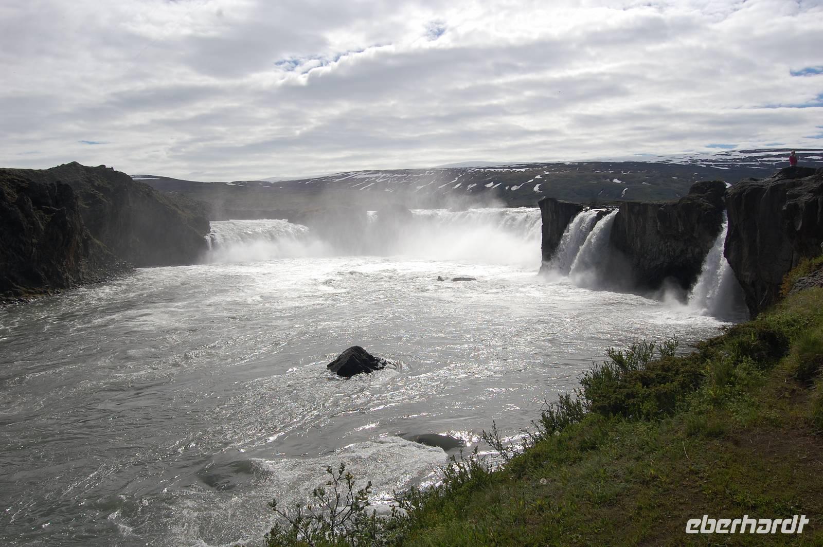 Doch erst einmal fahren wir entlang des „Eyjafjödur" = Inselfjord nach Norden, dann über den Buckel weiter durch das benachbarte Tal in das Hafenstädtchen Húsavík und nach einem kurzen Stopp weiter auf der Halbinsel Tjörnes nach Norden zum Kap. Dort laden die gute Fernsicht und die vielen brütenden Vögel zu einem Fotostopp ein, bevor wir weiter nach Süden in den Nationalpark Asbyrgi reisen. Hier floss in der Vergangenheit ein breiter Fluss, der sich tosend in die Tiefe stürzte und somit diese Landschaft prägte. Durch eine tektonische Verschiebung verlagerte sich dieser Fluss irgendwann weiter nach Osten und so können wir bei einer kurzen Wanderung durch das ausgetrocknete Flussbett bis zum ehemaligen Wasserfall gehen. Das Wasser hat sich über Jahrtausende in den dunklen Granit gegraben, so dass links und rechts 30 bis 40 m hohe Felswände stehen, die Burgmauern gleichen. Nun bringt uns unser Reisebus zurück in das hübsche Fischerdorf Húsavík, wo wir unsere Mittagspause einlegen. Bei herrlichem Sonnenschein blicken wir über den Hafen hinüber zu den schneebedeckten Bergen auf der anderen Seite des Fjordes. Das letzte Busziel unseres heutigen Tages ist der „Götterwasserfall", den wir nach kurzer Fahrzeit erreichen. Am „Godafoss" haben wir wieder die Möglichkeit, bei einem Spaziergang den Wasserfall von beiden Ufern zu betrachten.