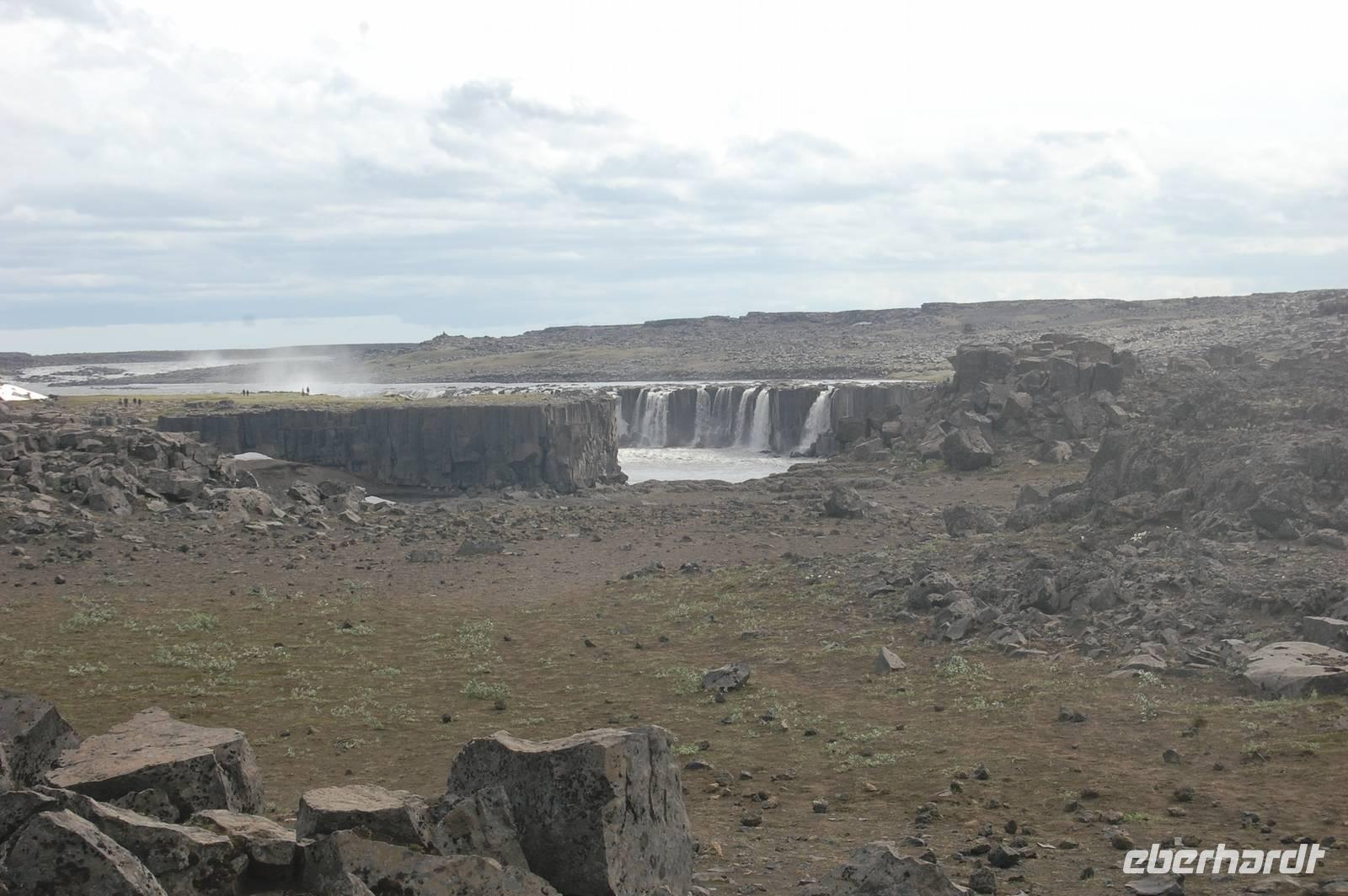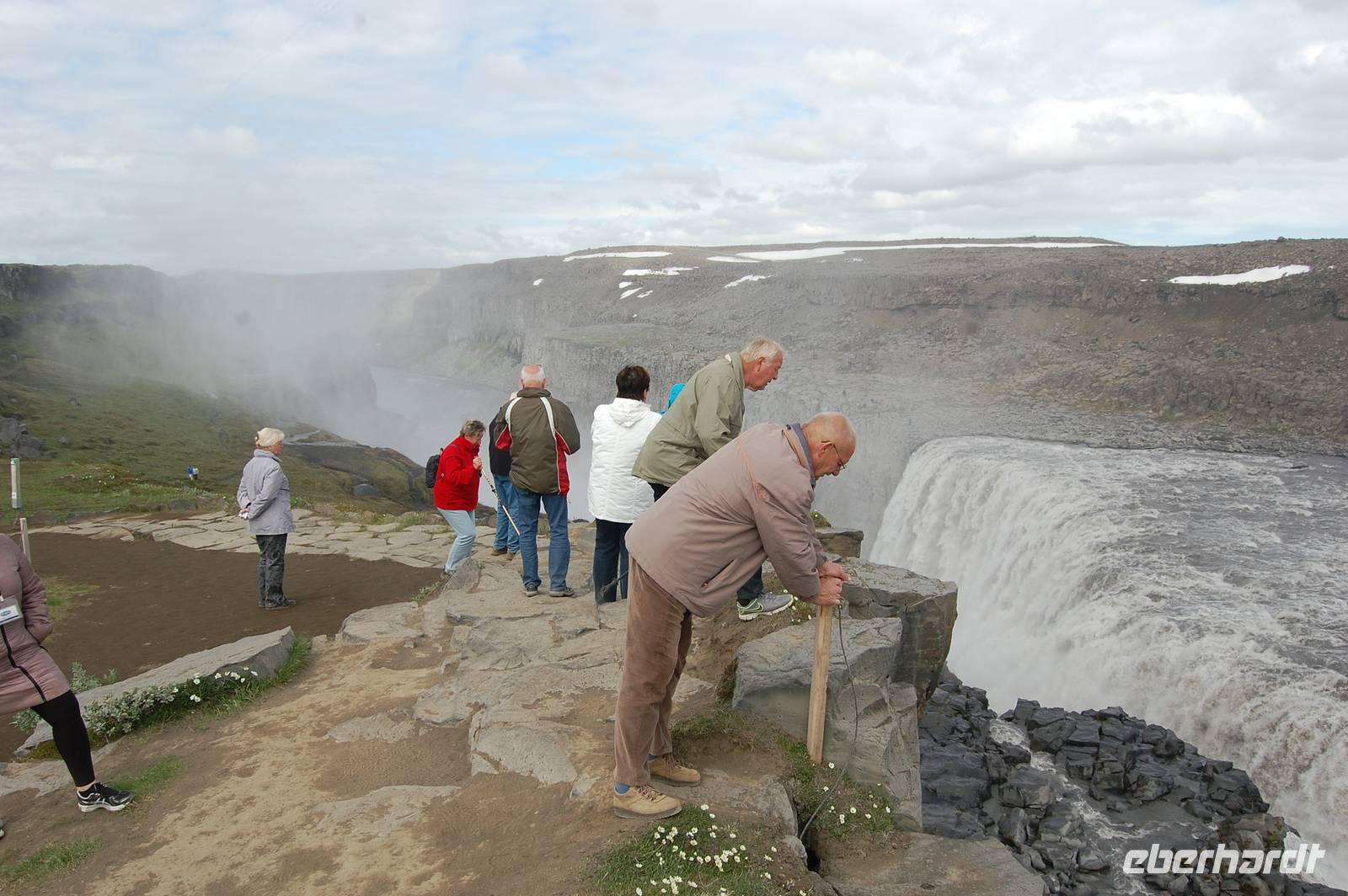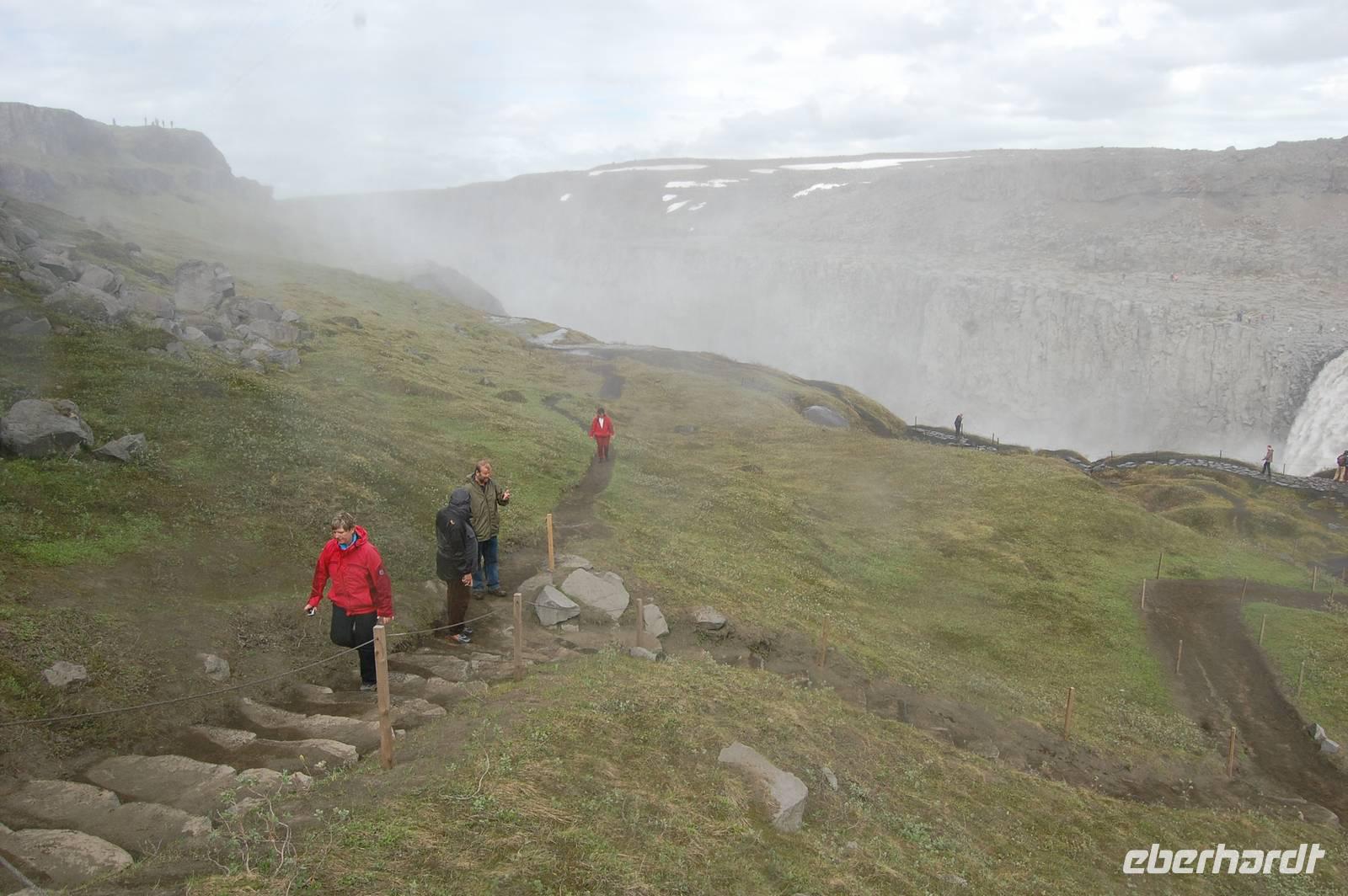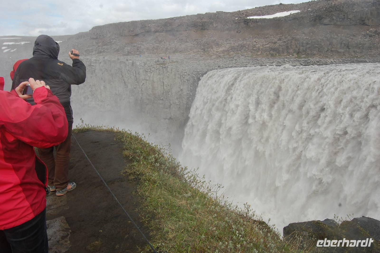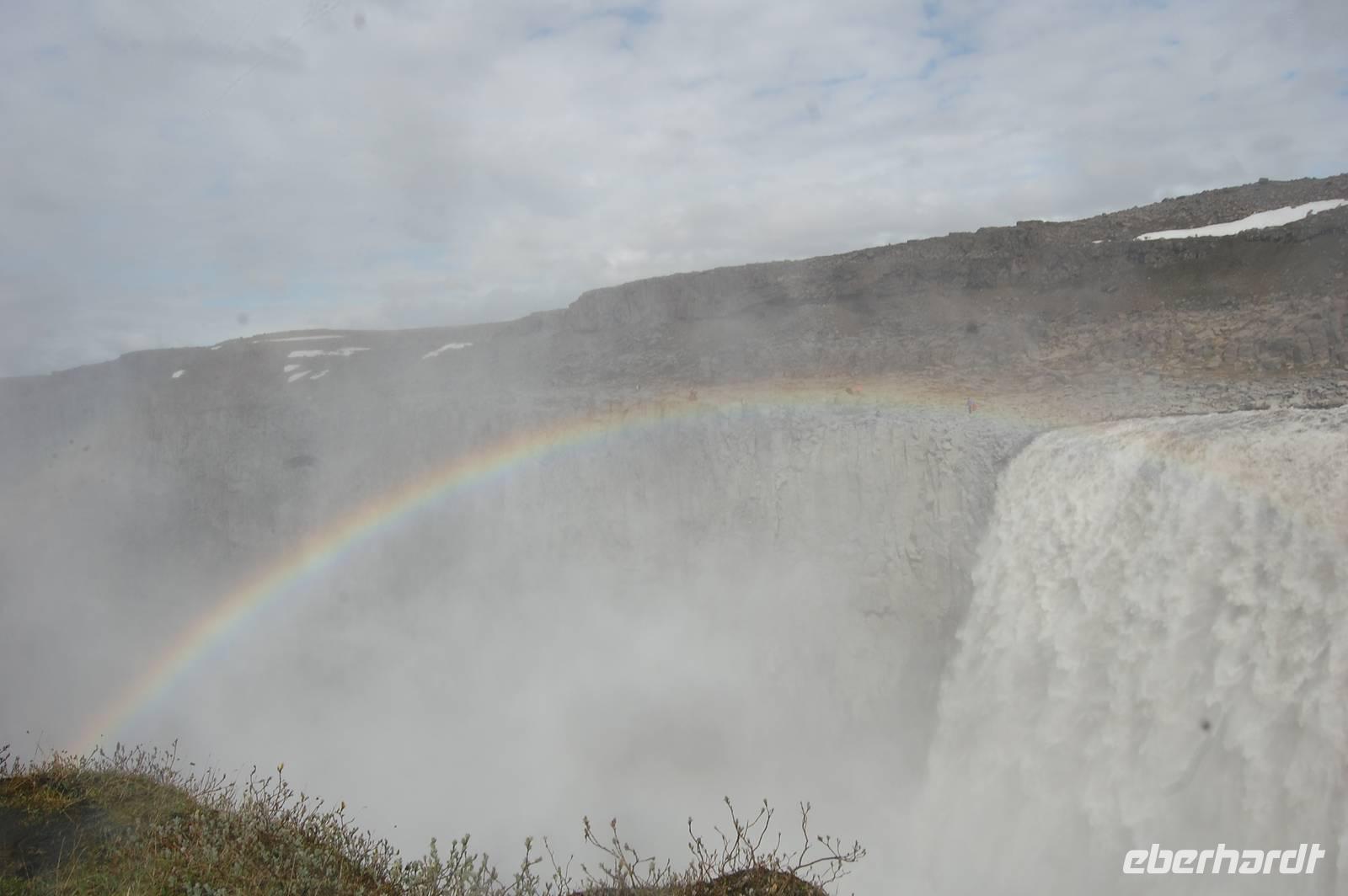 Erholt und gesättigt bringt uns der Bus wieder nur ein kleines Stück, bevor wir die unwirtlich anzuschauende Landschaft „Hvenr Namafjall" besuchen, ein Heißgebiet, wo aus vielen Öffnungen schwefelige Dämpfe entweichen und stinkende Schlammtöpfe brodeln. Diese „Hölle" entstand nach einem Vulkanausbruch im Jahr 1975. Schließlich verlassen wir dieses Heißgebiet und sehen noch einen Stausee und ein geothermisches Kraftwerk, bevor wir zum größten Wasserfall Europas, den „Dettifoss"-Wasserfall gelangen. Bei einem Spaziergang kann man gefährlich nah an die Brandung des gigantischen Falls gelangen, aber auch die kleineren Wasserfälle erreichen. Die Gischt gepaart mit den Sonnenstrahlen zaubert einen tollen Regenbogen.