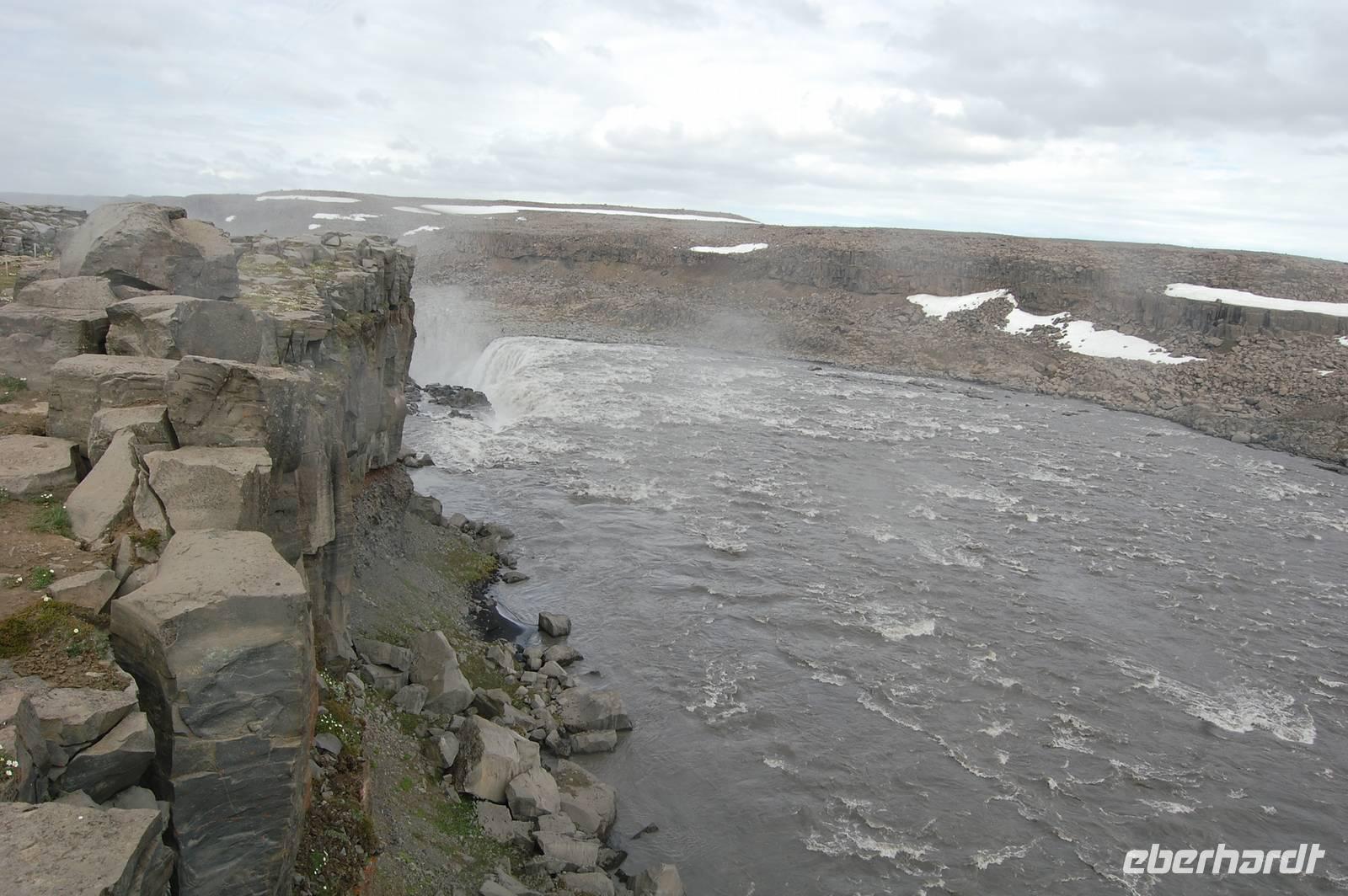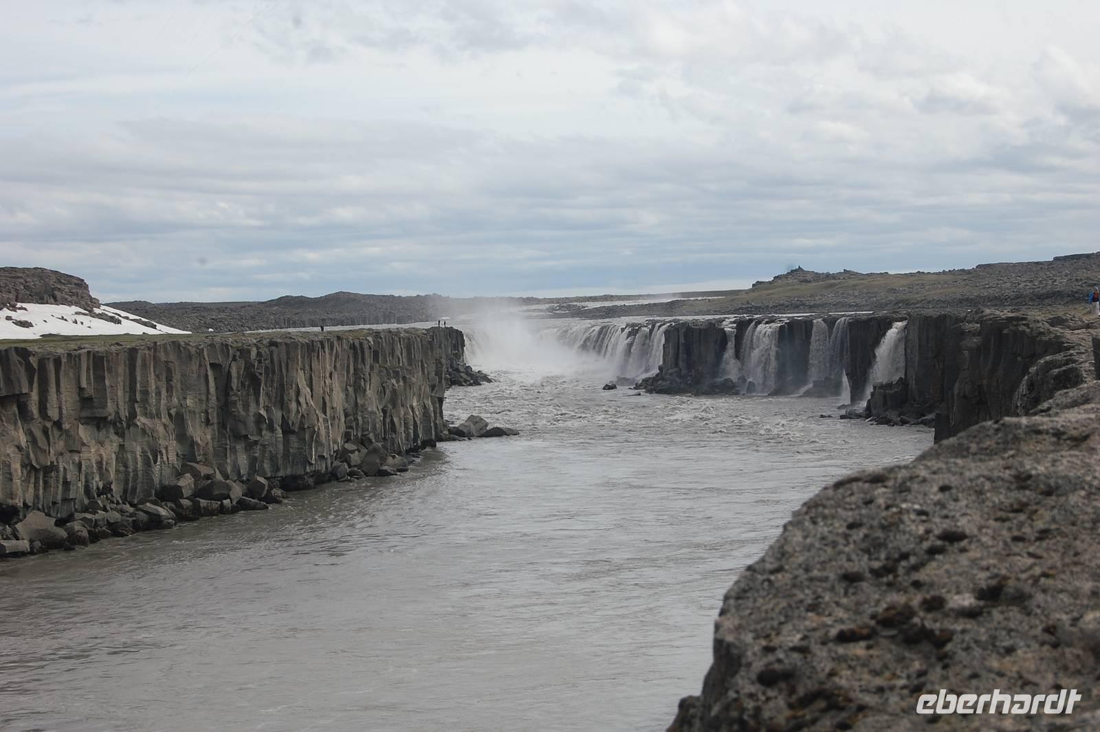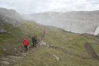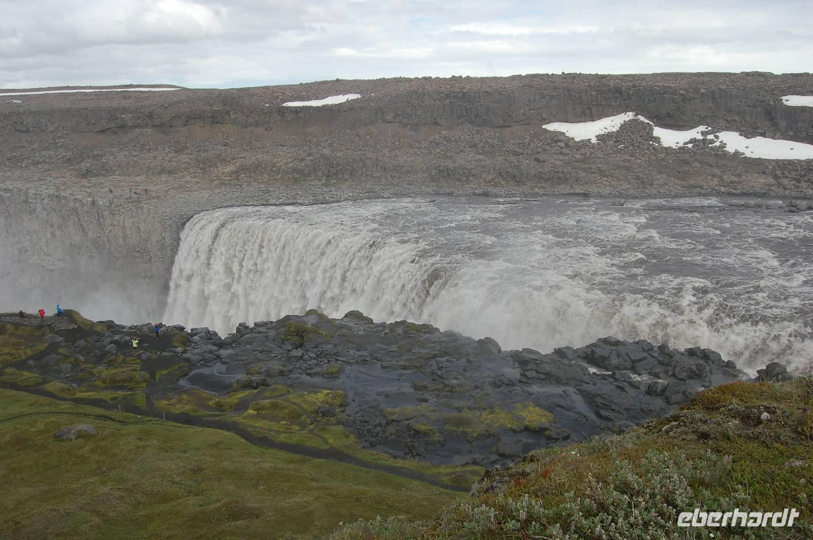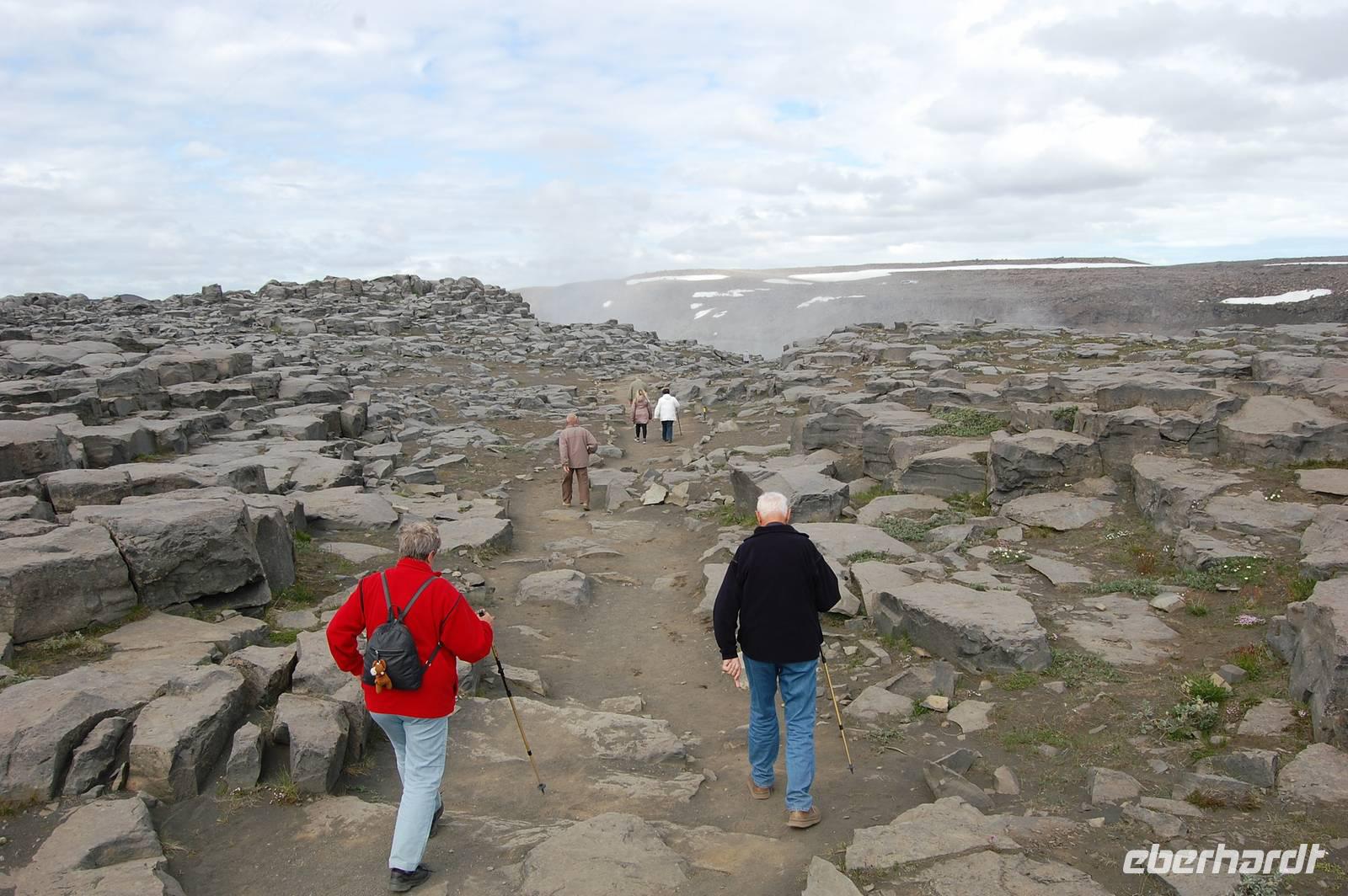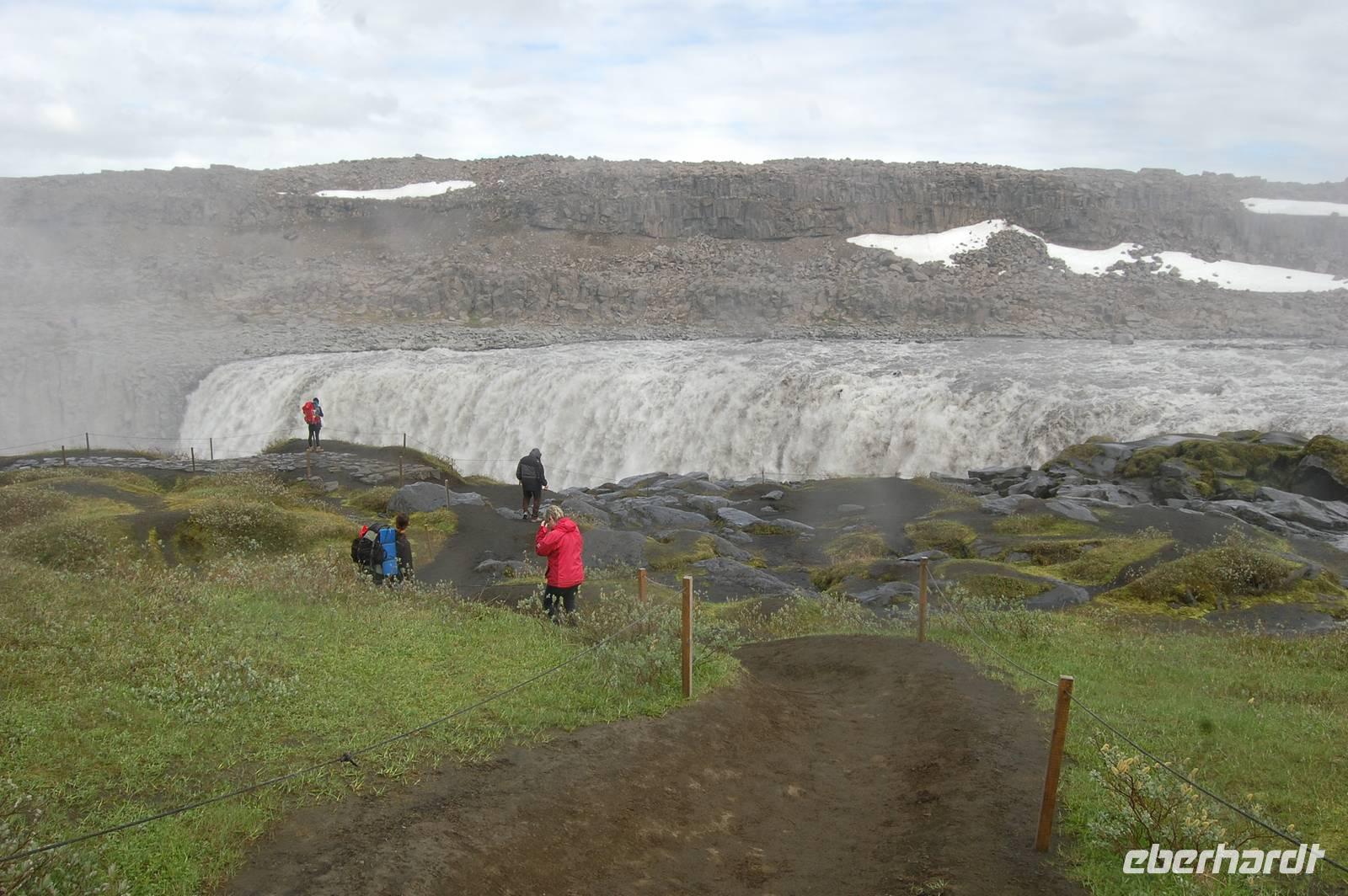 Erholt und gesättigt bringt uns der Bus wieder nur ein kleines Stück, bevor wir die unwirtlich anzuschauende Landschaft „Hvenr Namafjall" besuchen, ein Heißgebiet, wo aus vielen Öffnungen schwefelige Dämpfe entweichen und stinkende Schlammtöpfe brodeln. Diese „Hölle" entstand nach einem Vulkanausbruch im Jahr 1975. Schließlich verlassen wir dieses Heißgebiet und sehen noch einen Stausee und ein geothermisches Kraftwerk, bevor wir zum größten Wasserfall Europas, den „Dettifoss"-Wasserfall gelangen. Bei einem Spaziergang kann man gefährlich nah an die Brandung des gigantischen Falls gelangen, aber auch die kleineren Wasserfälle erreichen. Die Gischt gepaart mit den Sonnenstrahlen zaubert einen tollen Regenbogen.