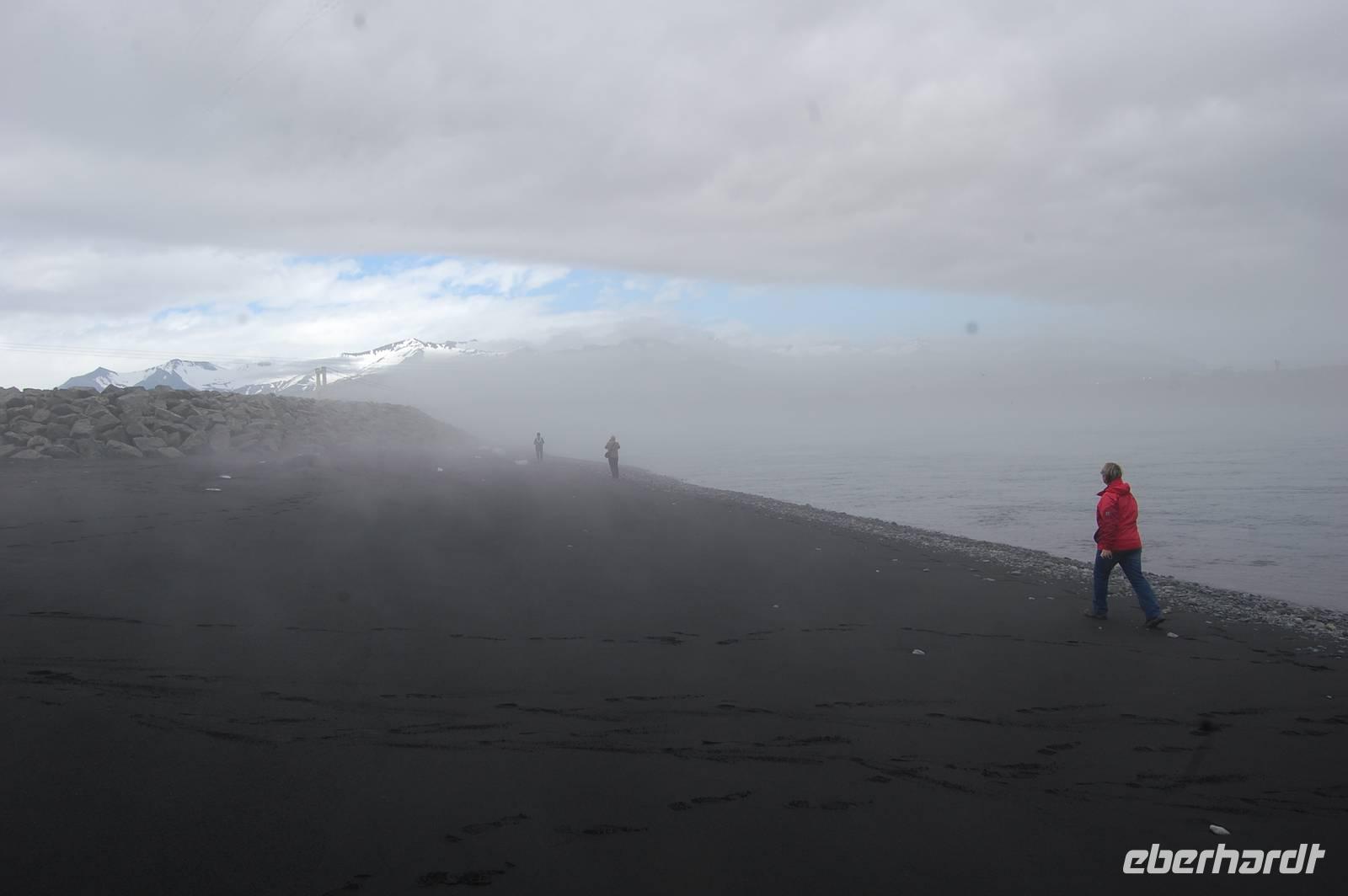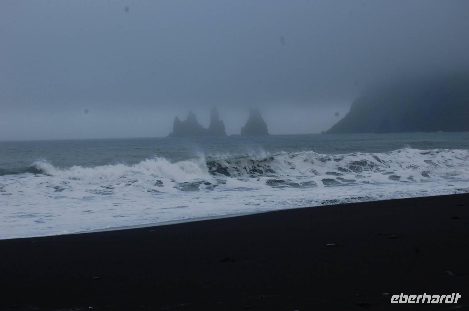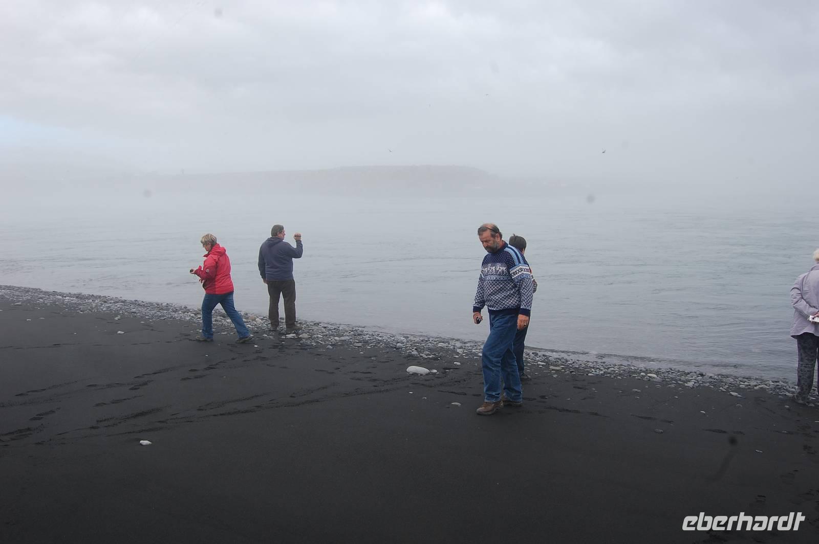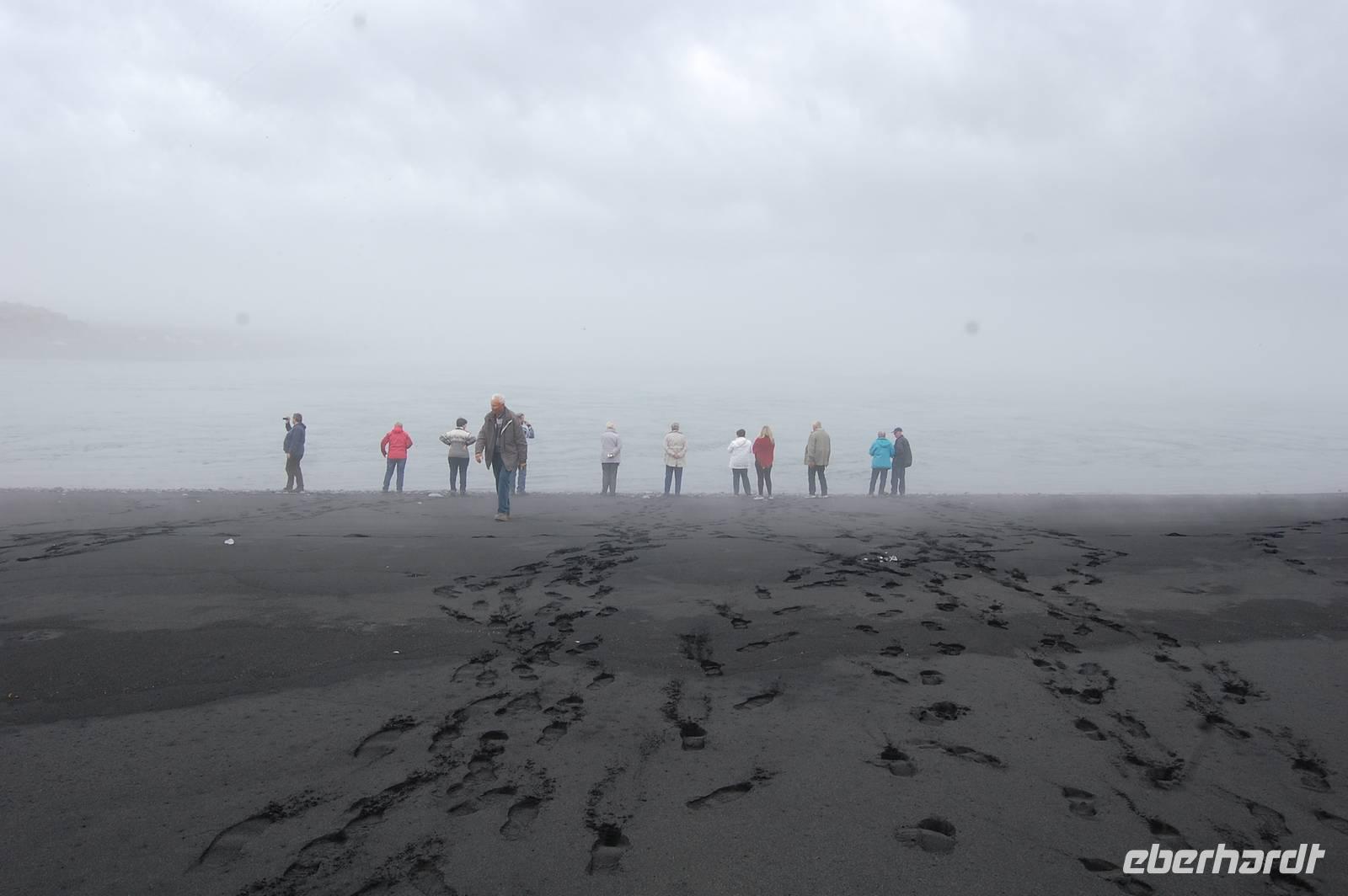 Nach dem gemeinsamen Abendessen treffen wir uns zu einem kurzen Spaziergang zum schwarzsandigen Strand. Im Dunst sehen wir die Felsnadeln, die von gewaltigen Wellen umspült werden.