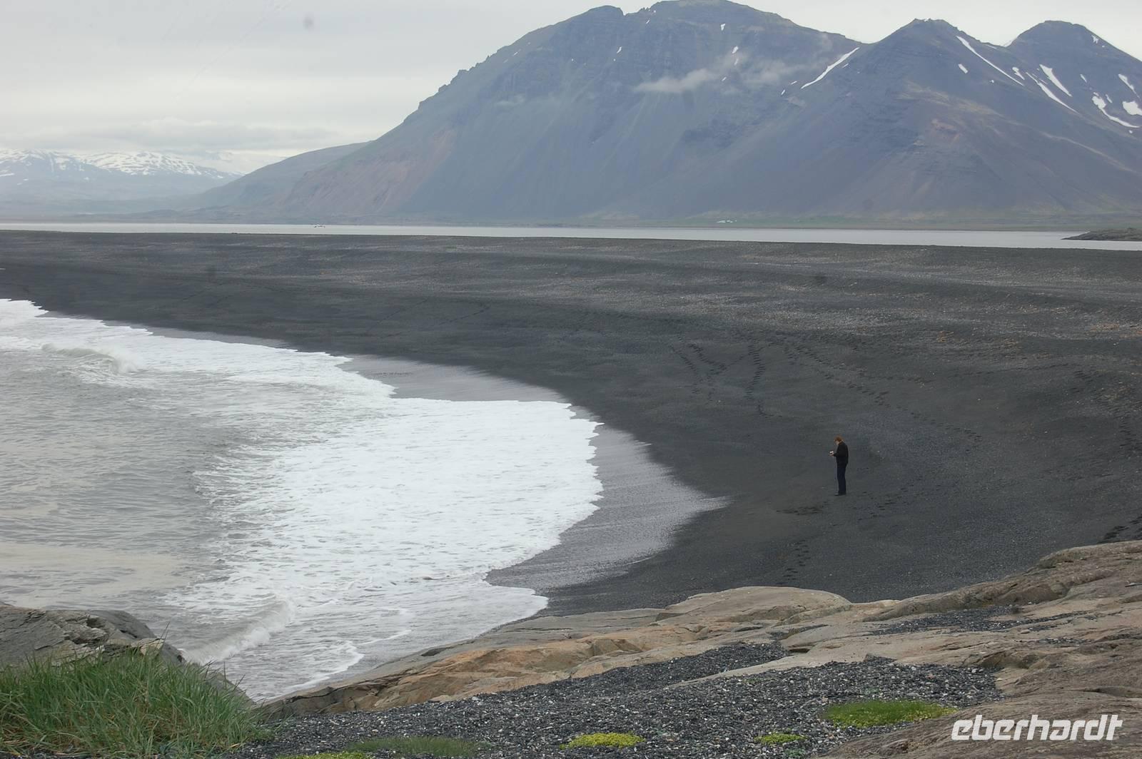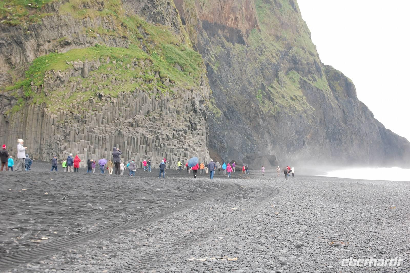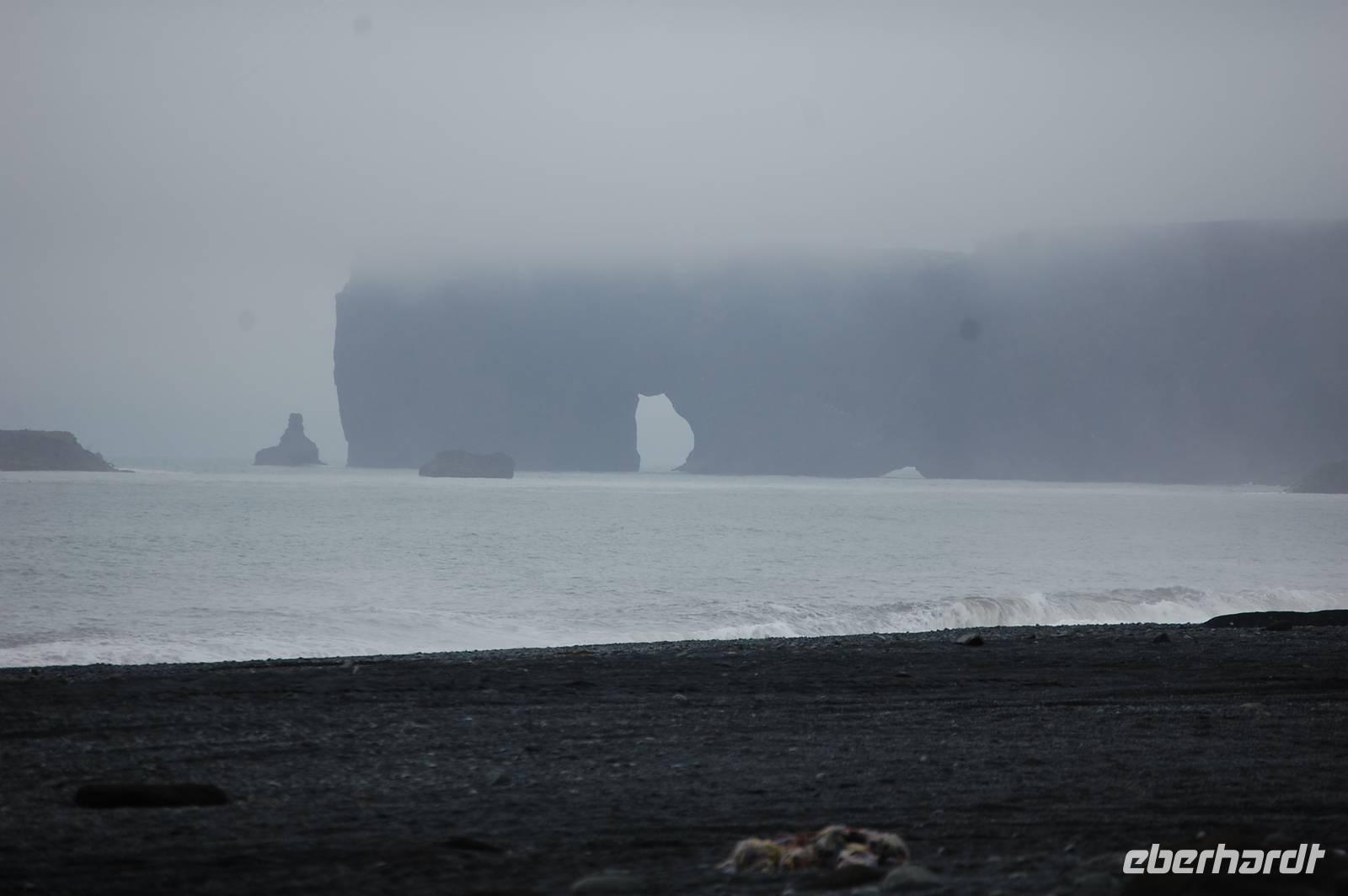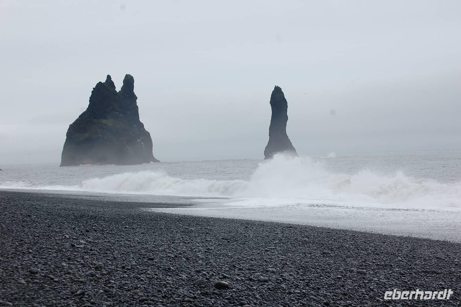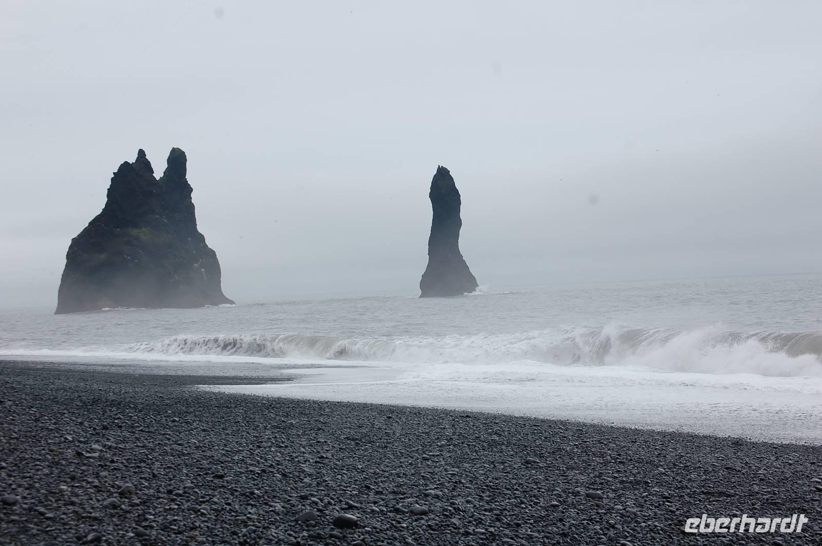 Nach dem gemeinsamen Abendessen treffen wir uns zu einem kurzen Spaziergang zum schwarzsandigen Strand. Im Dunst sehen wir die Felsnadeln, die von gewaltigen Wellen umspült werden.