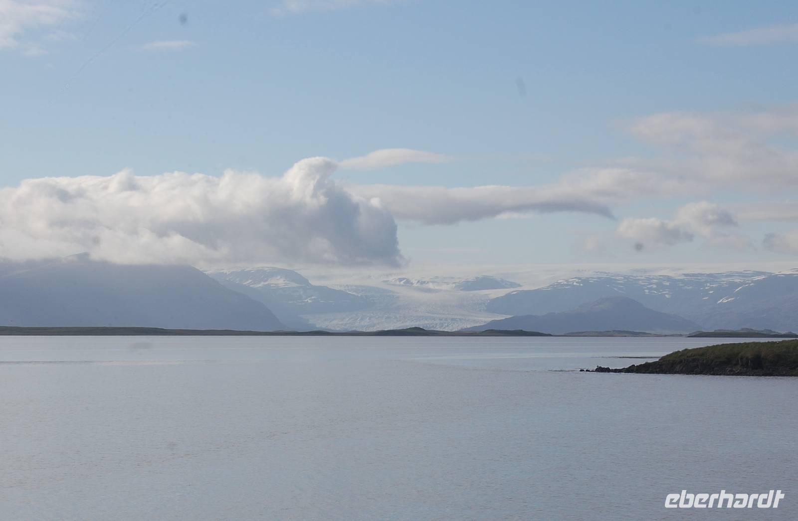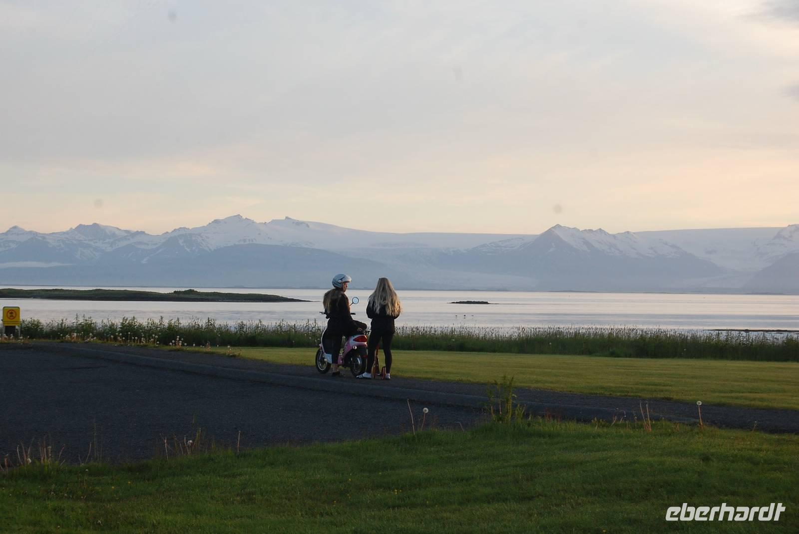 Auf der Fahrt nach Höfn, unserem heutigen Zielort, bemerken wir, dass sich immer mehr Wolken über den Bergen zusammenschieben. Die gewünschte Auffahrt auf den Gletscher hat Rosa in Absprache mit dem Programmanbieter auf den nächsten Tag, gleich morgens, verschoben. Wir fahren also direkt zum Hotel und checken bereits um 16 Uhr ein. Wir verbringen die Zeit zum Abendessen mit Spaziergängen durch das kleine Örtchen Höfn. Das Wetter wird besser und man sieht in der Ferne den Eispanzer des größten Gletschers Europas leuchten.