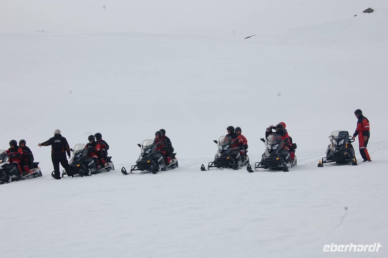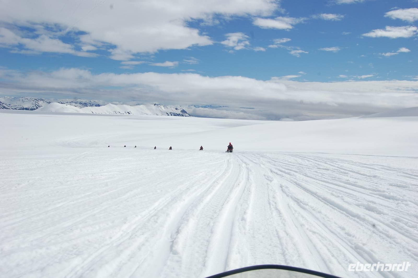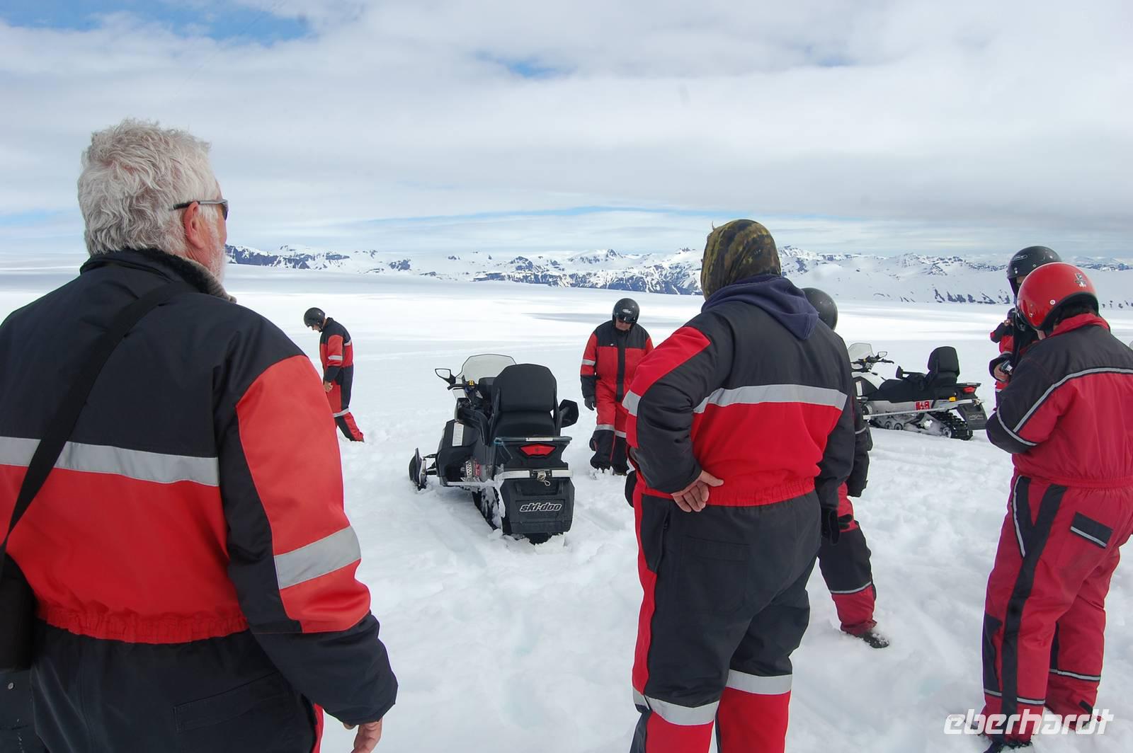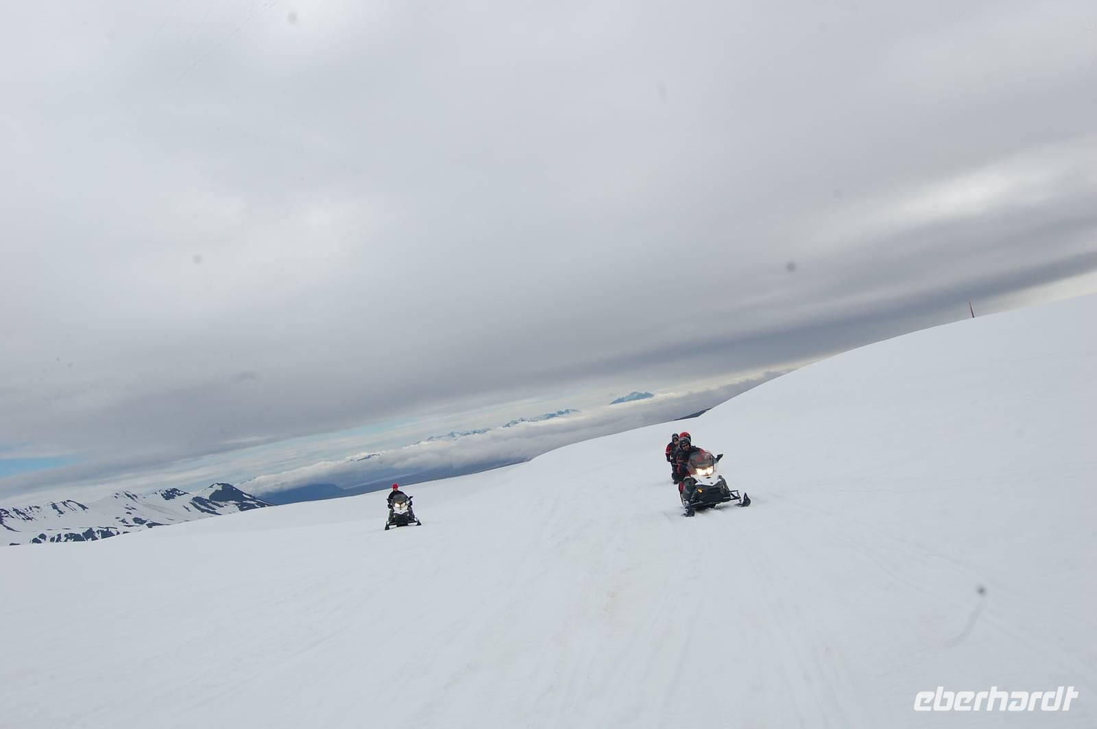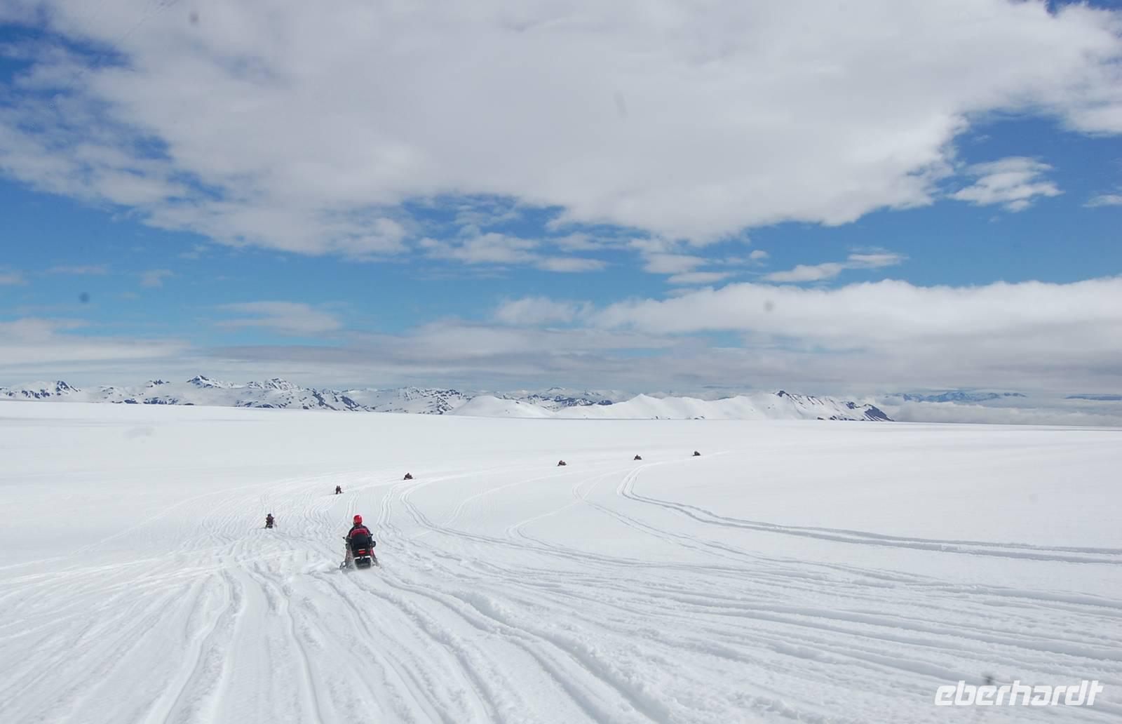 Heute frühstücken wir bereits um 06:30 Uhr, denn ein erlebnisreicher Tag erwartet uns. Wir fahren über die N1 weiter nach Osten. Nach einer knappen Stunde stoppen wir auf einem Parkplatz, wo wir auf die Jeeps für die Gletscherauffahrt umsteigen. Zwei „Bigfoot-Jeeps" befördern uns alle in einer 30-minütigen Fahrt hinauf zur Basishütte auf dem Gletscher. Dort bekommen wir Gummistiefel, Helm und Overalls sowie bei Bedarf Handschuhe und Sonnenbrille. Wie Astronauten laufen wir in unseren roten Anzügen durch den Schnee zu den Motorschlitten. Nach einer kurzen Einweisung durch Jörn, unseren Schlittenguide, starten wir immer zu zweit unsere Motorschlitten und fahren durch die sonnenklare Gletscherlandschaft. Bis zu 400 m dick ist das Eis unter uns. Maximal kann die Eisschicht 1000 m betragen. Es fällt jedes Jahr durchschnittlich 13 m Schnee, der Gletscher bewegt sich bis zu 15 m talwärts. Mit 8100 km² ist der „Vatnajökull" der größte Gletscher Europas und der drittgrößte der Welt. Die maximalen Ausdehnungen betragen 140 km (Ost - West) und 90 km (Nord - Süd).