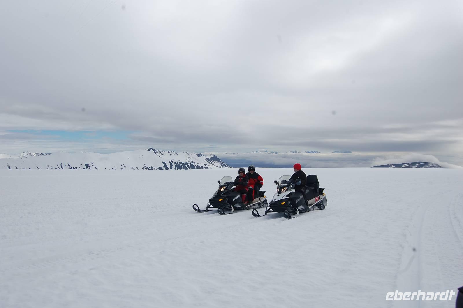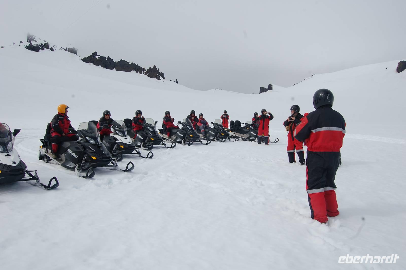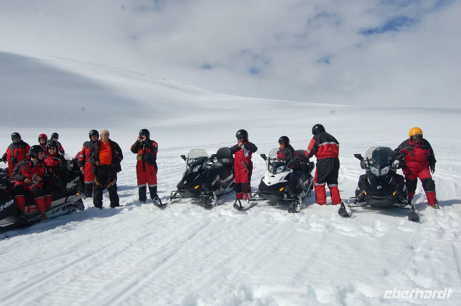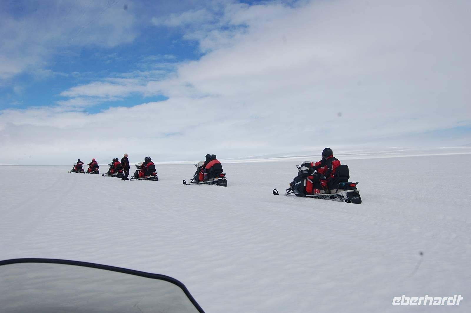 Heute frühstücken wir bereits um 06:30 Uhr, denn ein erlebnisreicher Tag erwartet uns. Wir fahren über die N1 weiter nach Osten. Nach einer knappen Stunde stoppen wir auf einem Parkplatz, wo wir auf die Jeeps für die Gletscherauffahrt umsteigen. Zwei „Bigfoot-Jeeps" befördern uns alle in einer 30-minütigen Fahrt hinauf zur Basishütte auf dem Gletscher. Dort bekommen wir Gummistiefel, Helm und Overalls sowie bei Bedarf Handschuhe und Sonnenbrille. Wie Astronauten laufen wir in unseren roten Anzügen durch den Schnee zu den Motorschlitten. Nach einer kurzen Einweisung durch Jörn, unseren Schlittenguide, starten wir immer zu zweit unsere Motorschlitten und fahren durch die sonnenklare Gletscherlandschaft. Bis zu 400 m dick ist das Eis unter uns. Maximal kann die Eisschicht 1000 m betragen. Es fällt jedes Jahr durchschnittlich 13 m Schnee, der Gletscher bewegt sich bis zu 15 m talwärts. Mit 8100 km² ist der „Vatnajökull" der größte Gletscher Europas und der drittgrößte der Welt. Die maximalen Ausdehnungen betragen 140 km (Ost - West) und 90 km (Nord - Süd).