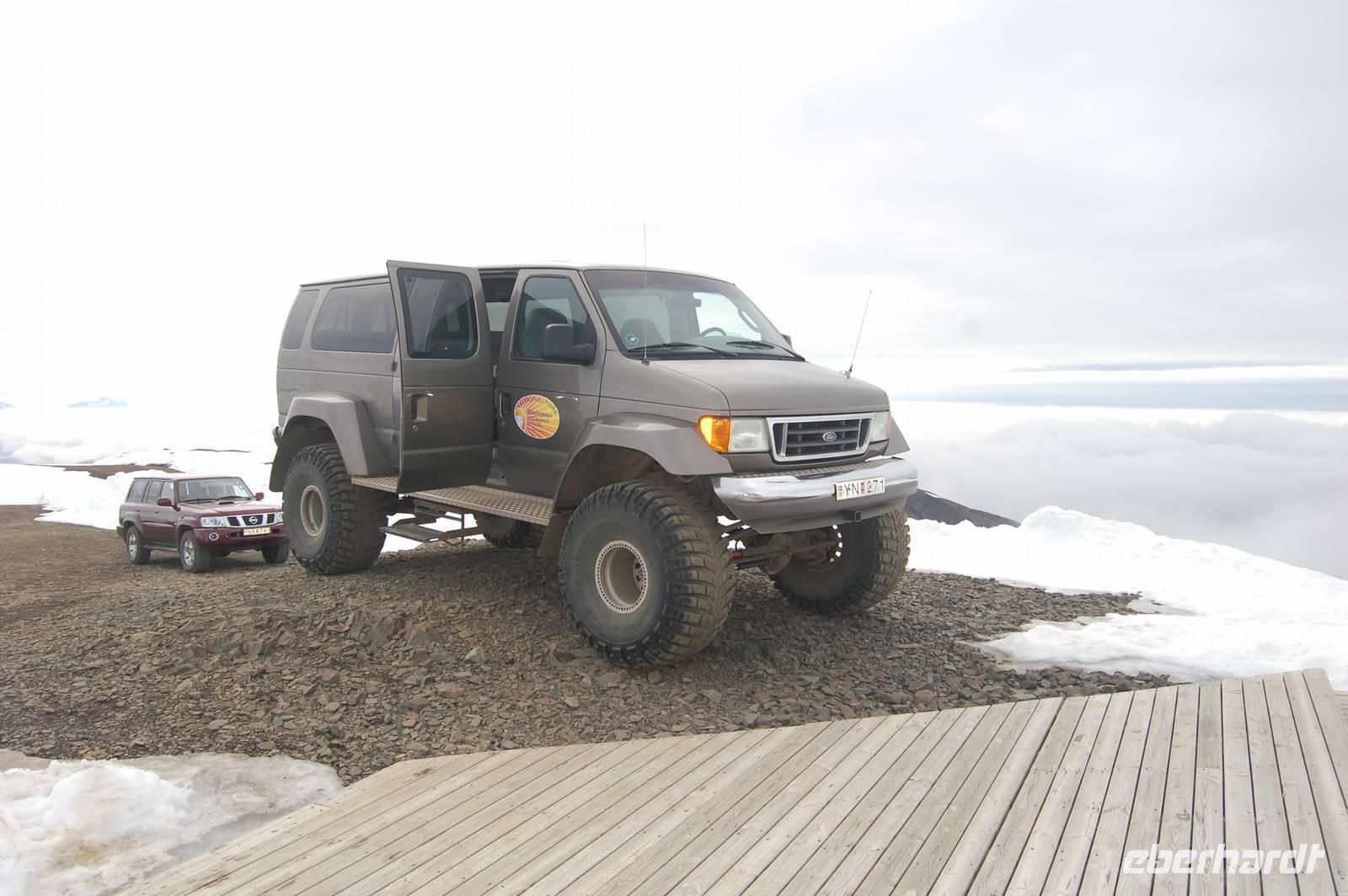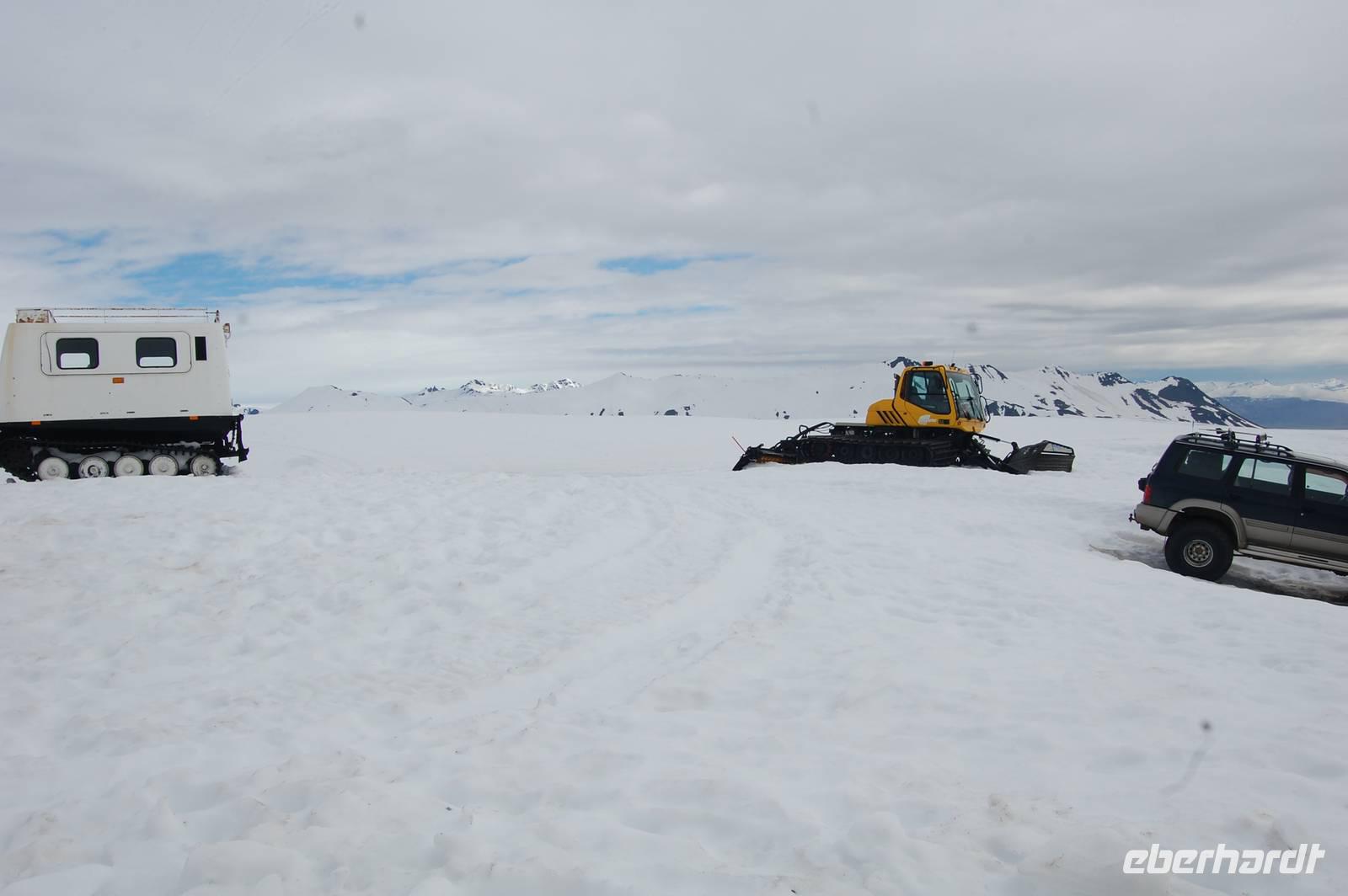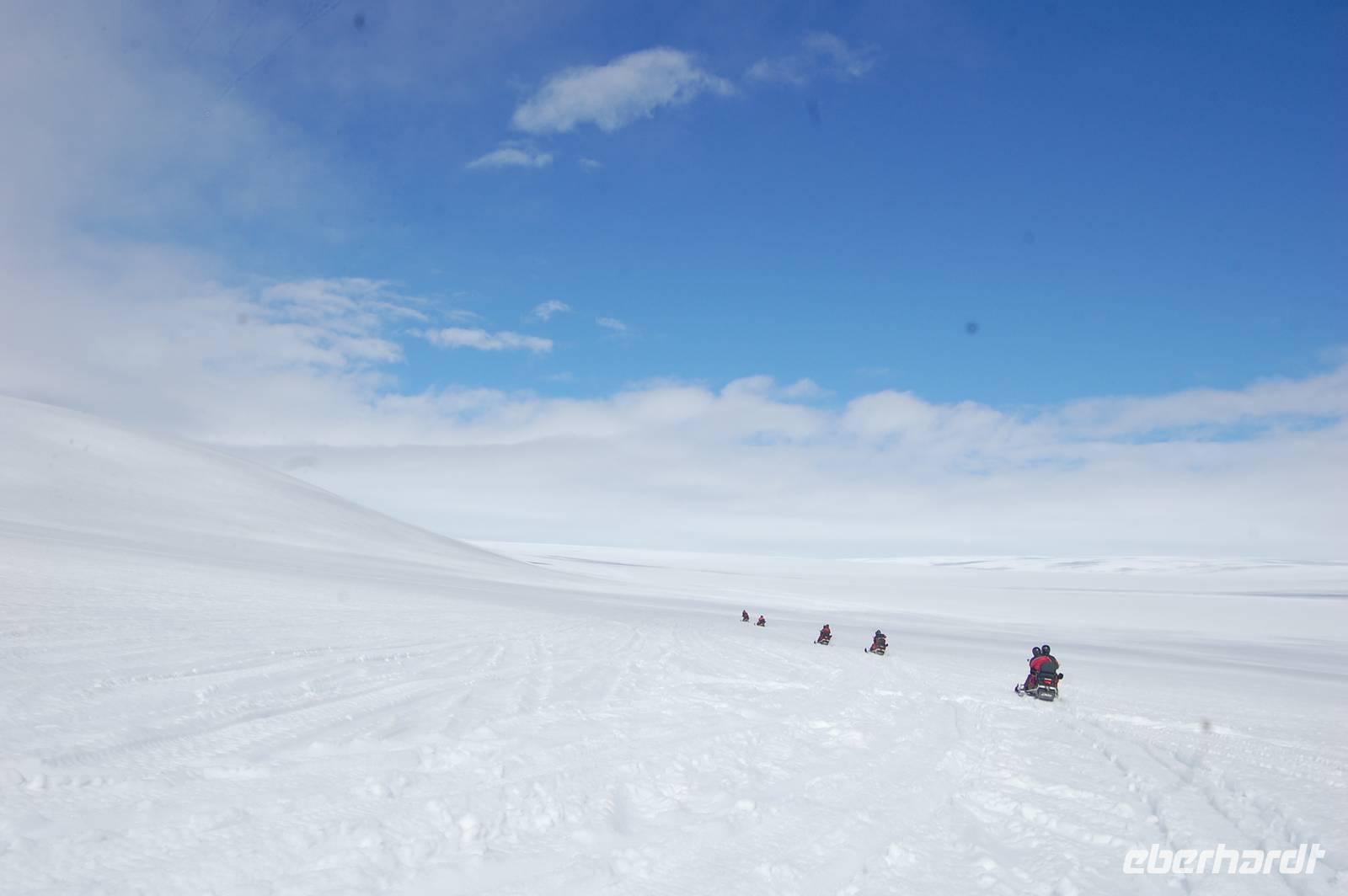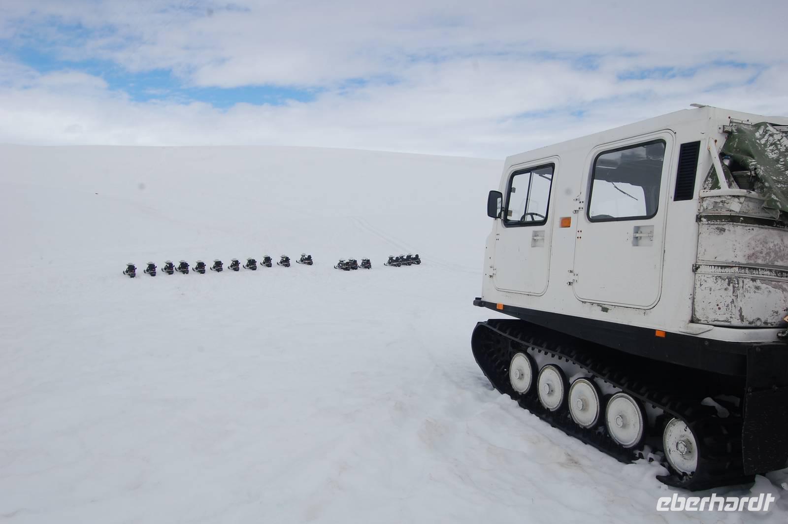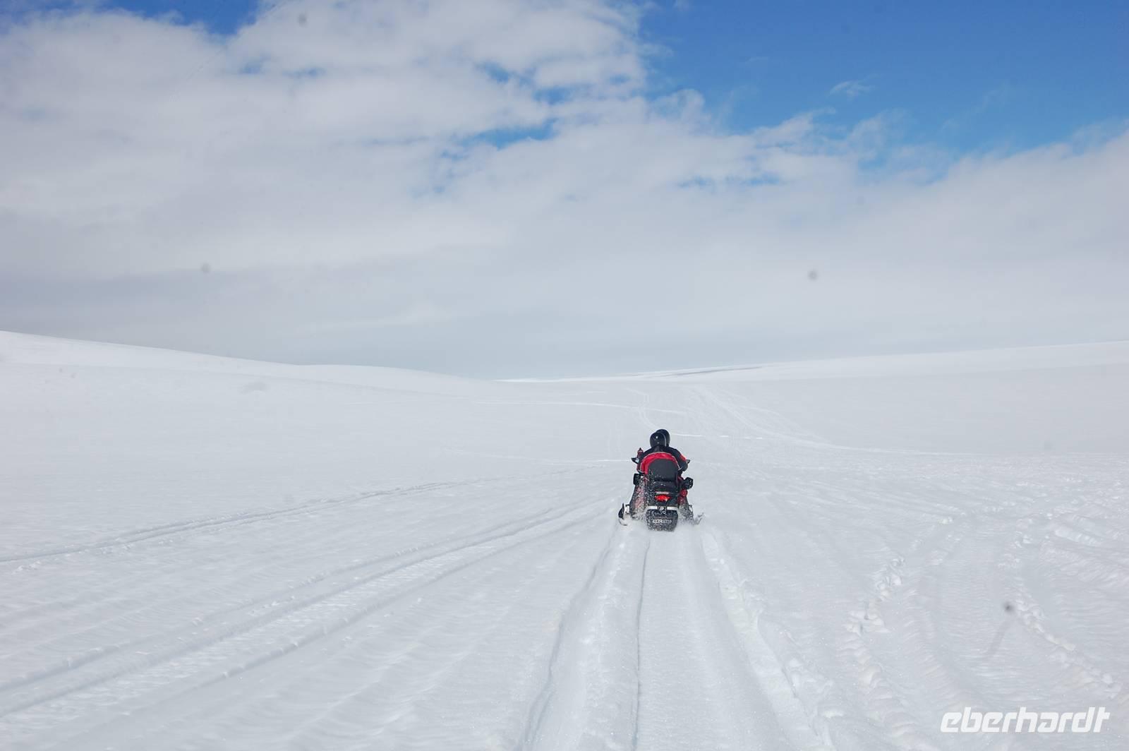 Heute frühstücken wir bereits um 06:30 Uhr, denn ein erlebnisreicher Tag erwartet uns. Wir fahren über die N1 weiter nach Osten. Nach einer knappen Stunde stoppen wir auf einem Parkplatz, wo wir auf die Jeeps für die Gletscherauffahrt umsteigen. Zwei „Bigfoot-Jeeps" befördern uns alle in einer 30-minütigen Fahrt hinauf zur Basishütte auf dem Gletscher. Dort bekommen wir Gummistiefel, Helm und Overalls sowie bei Bedarf Handschuhe und Sonnenbrille. Wie Astronauten laufen wir in unseren roten Anzügen durch den Schnee zu den Motorschlitten. Nach einer kurzen Einweisung durch Jörn, unseren Schlittenguide, starten wir immer zu zweit unsere Motorschlitten und fahren durch die sonnenklare Gletscherlandschaft. Bis zu 400 m dick ist das Eis unter uns. Maximal kann die Eisschicht 1000 m betragen. Es fällt jedes Jahr durchschnittlich 13 m Schnee, der Gletscher bewegt sich bis zu 15 m talwärts. Mit 8100 km² ist der „Vatnajökull" der größte Gletscher Europas und der drittgrößte der Welt. Die maximalen Ausdehnungen betragen 140 km (Ost - West) und 90 km (Nord - Süd).