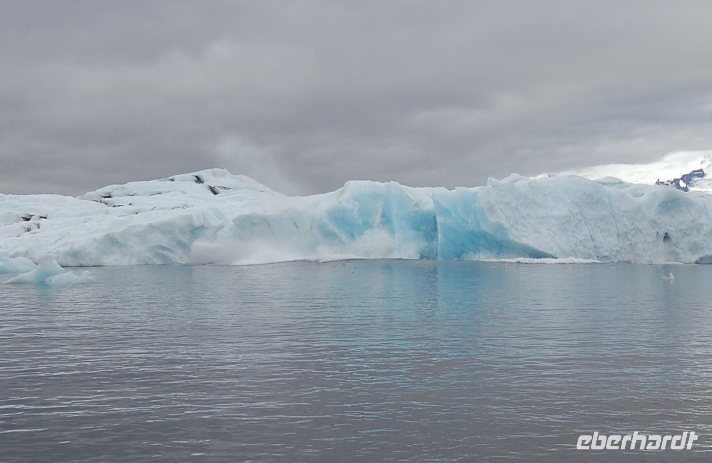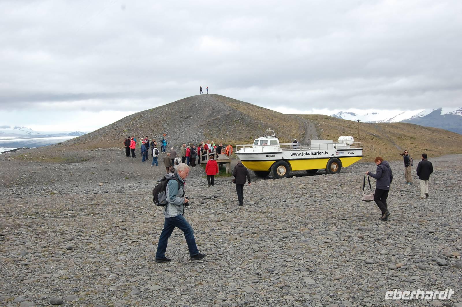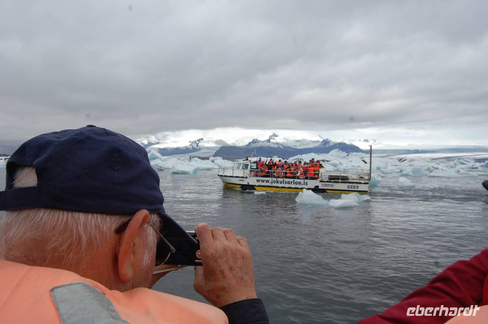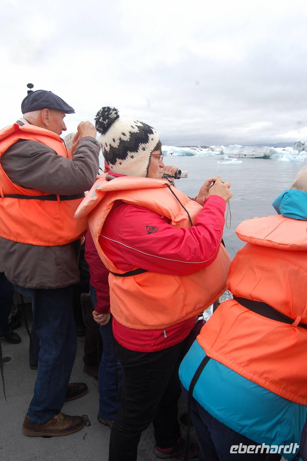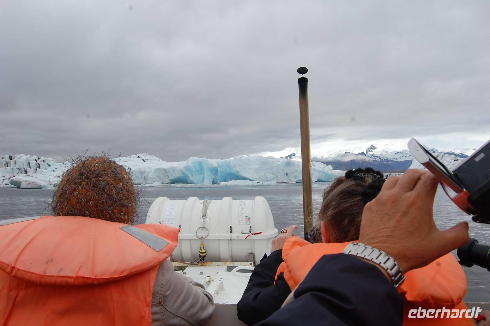 Nun bringen uns die Jeeps wieder zum Bus, der uns anschließend auf der Straße N1 weiter nach Osten bringt. Nur wenige Kilometer sind es, bis wir die nächste Attraktion des heutigen Tages erreichen. Mittags sind wir an der Gletscherlagune, in der die blauen Spitzen der Eisberge langsam in Richtung Meer schwimmen. Um 12.30 Uhr steigen wir auf ein Amphibienfahrzeug, das uns zuerst übers Land fährt, dann rollen die riesigen Räder ins Wasser und wir schwimmen zwischen den Eisbergen. Jorge - unser Guide aus Spanien, spricht kaum Deutsch und ich übersetze aus seinen englischen Ausführungen. Gerade als wir einen Eisberg betrachten, bricht ein großes Stück tosend ins Wasser und löst eine gewaltige Welle aus. Der Kapitän, der das Kalben ebenfalls bemerkte, dreht das Schiff, so dass wir der Welle nicht die Breitseite, sondern das Heck des Schiffes bieten.
