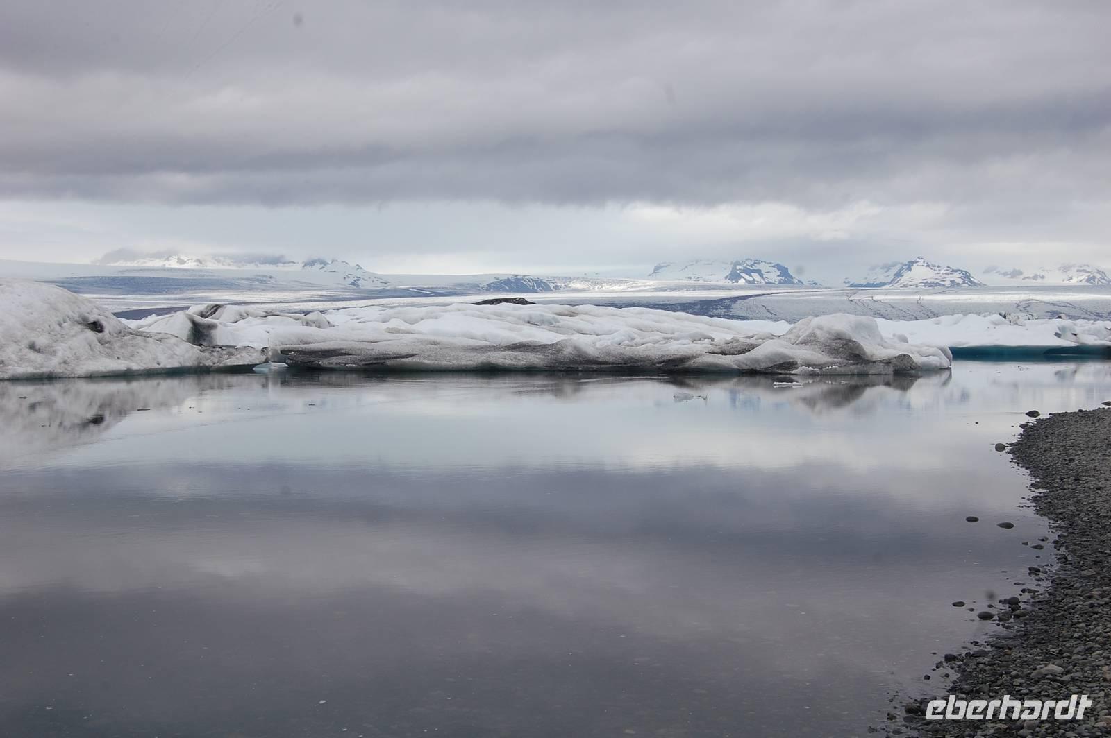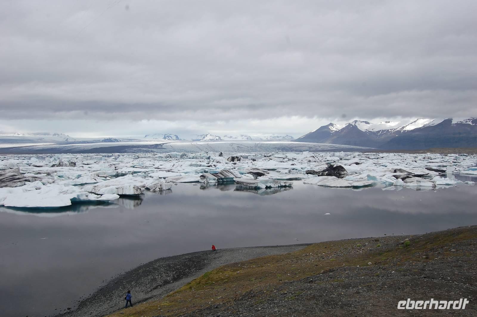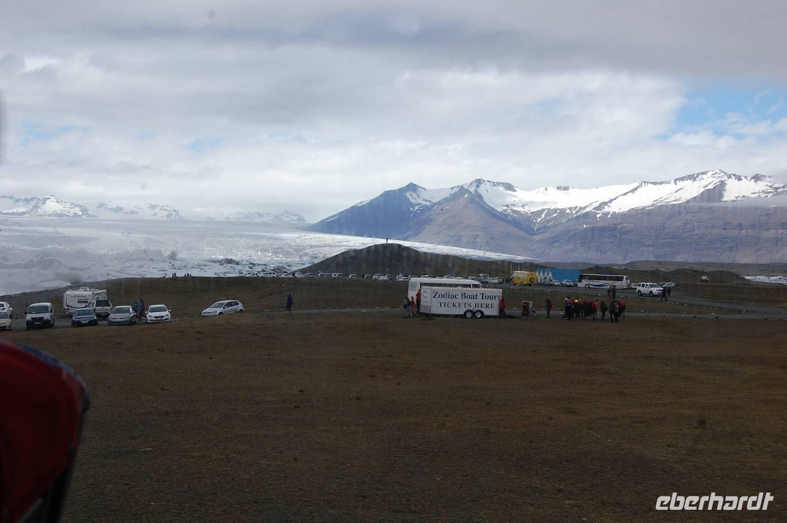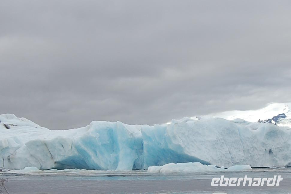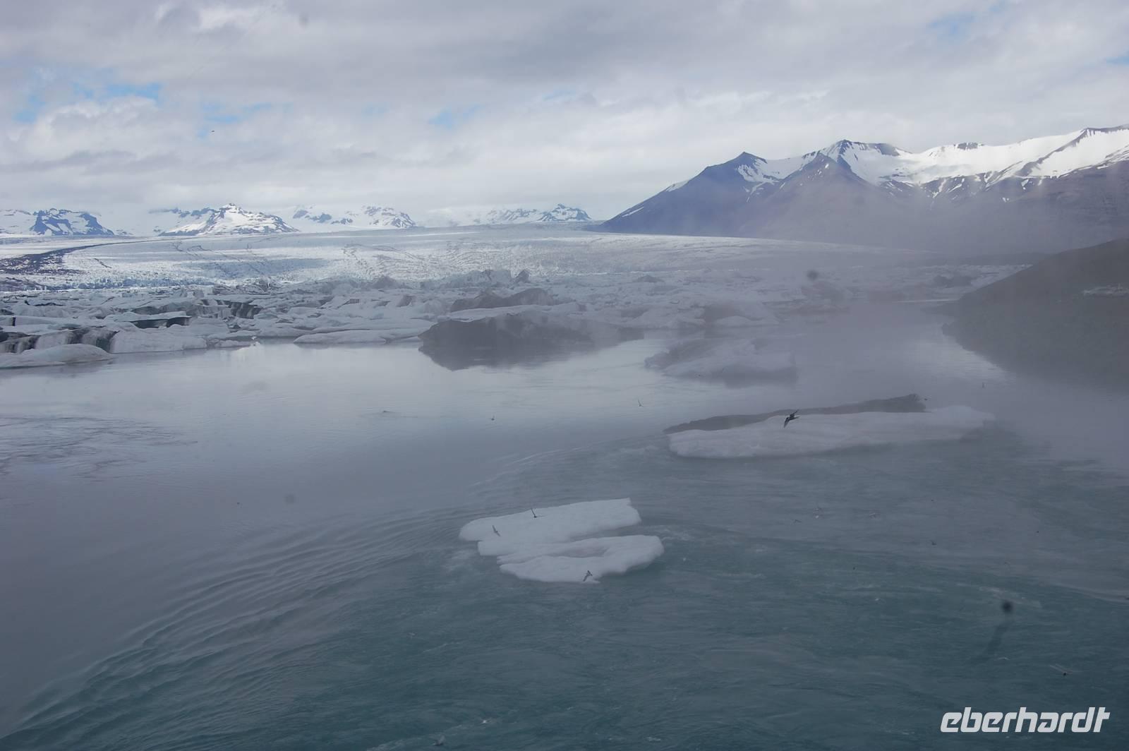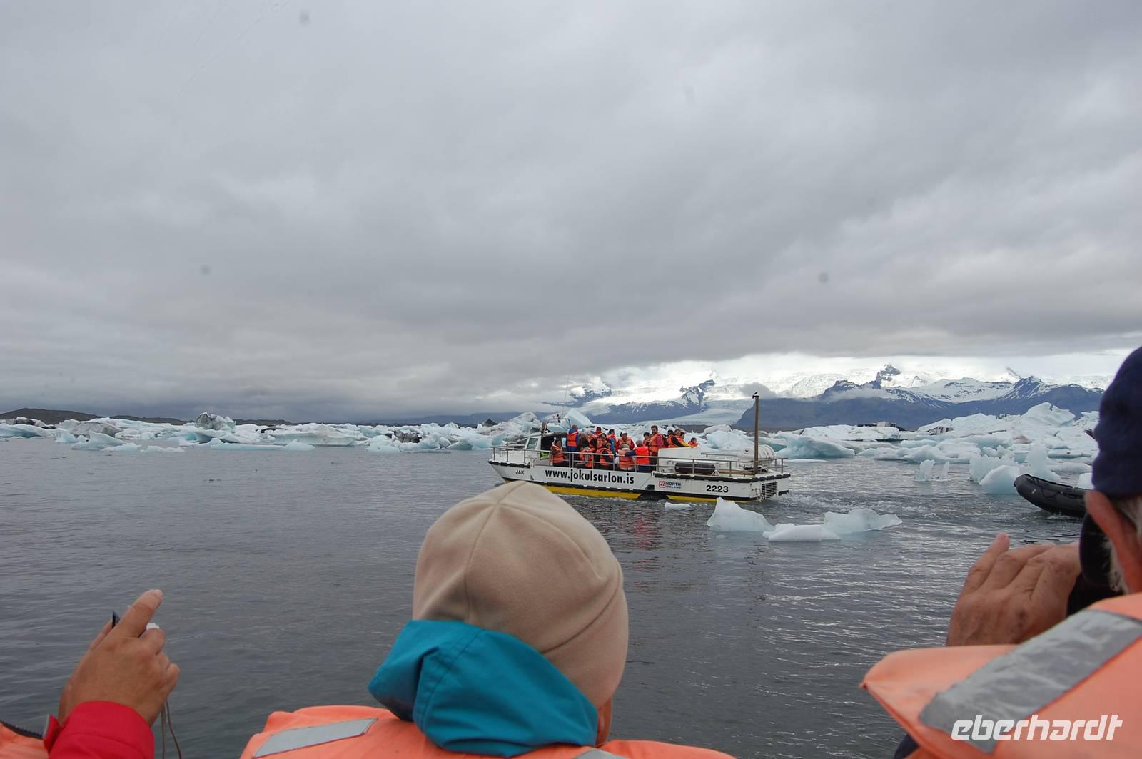 Nun bringen uns die Jeeps wieder zum Bus, der uns anschließend auf der Straße N1 weiter nach Osten bringt. Nur wenige Kilometer sind es, bis wir die nächste Attraktion des heutigen Tages erreichen. Mittags sind wir an der Gletscherlagune, in der die blauen Spitzen der Eisberge langsam in Richtung Meer schwimmen. Um 12.30 Uhr steigen wir auf ein Amphibienfahrzeug, das uns zuerst übers Land fährt, dann rollen die riesigen Räder ins Wasser und wir schwimmen zwischen den Eisbergen. Jorge - unser Guide aus Spanien, spricht kaum Deutsch und ich übersetze aus seinen englischen Ausführungen. Gerade als wir einen Eisberg betrachten, bricht ein großes Stück tosend ins Wasser und löst eine gewaltige Welle aus. Der Kapitän, der das Kalben ebenfalls bemerkte, dreht das Schiff, so dass wir der Welle nicht die Breitseite, sondern das Heck des Schiffes bieten.