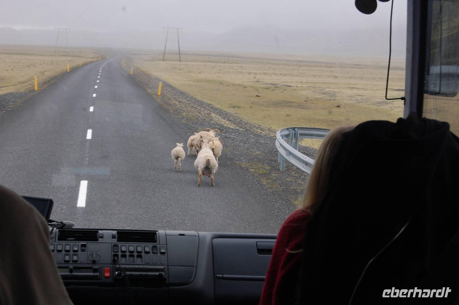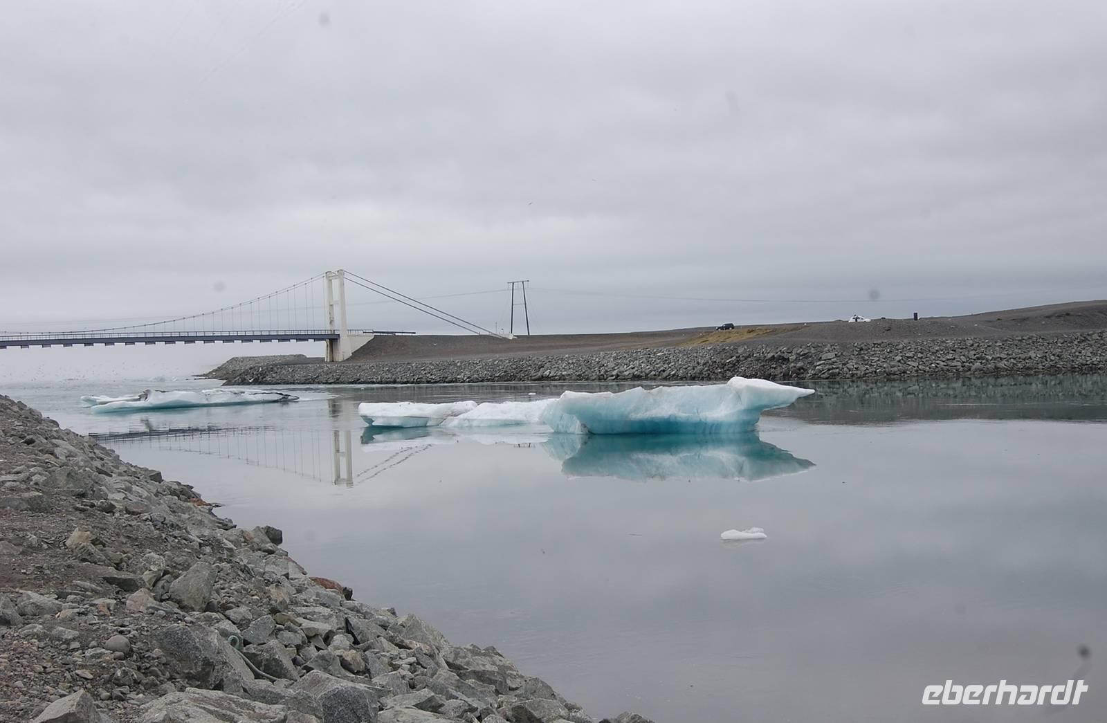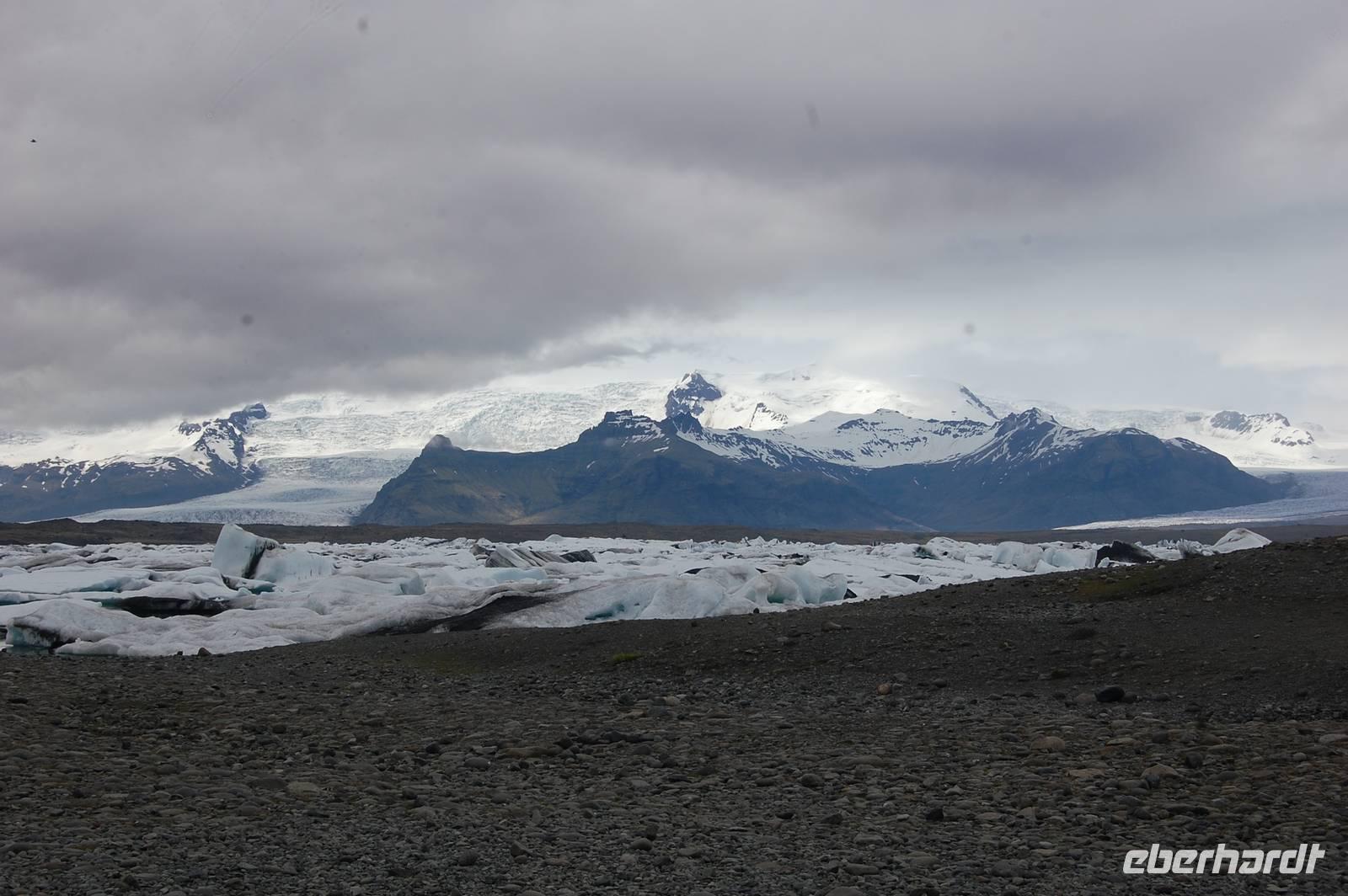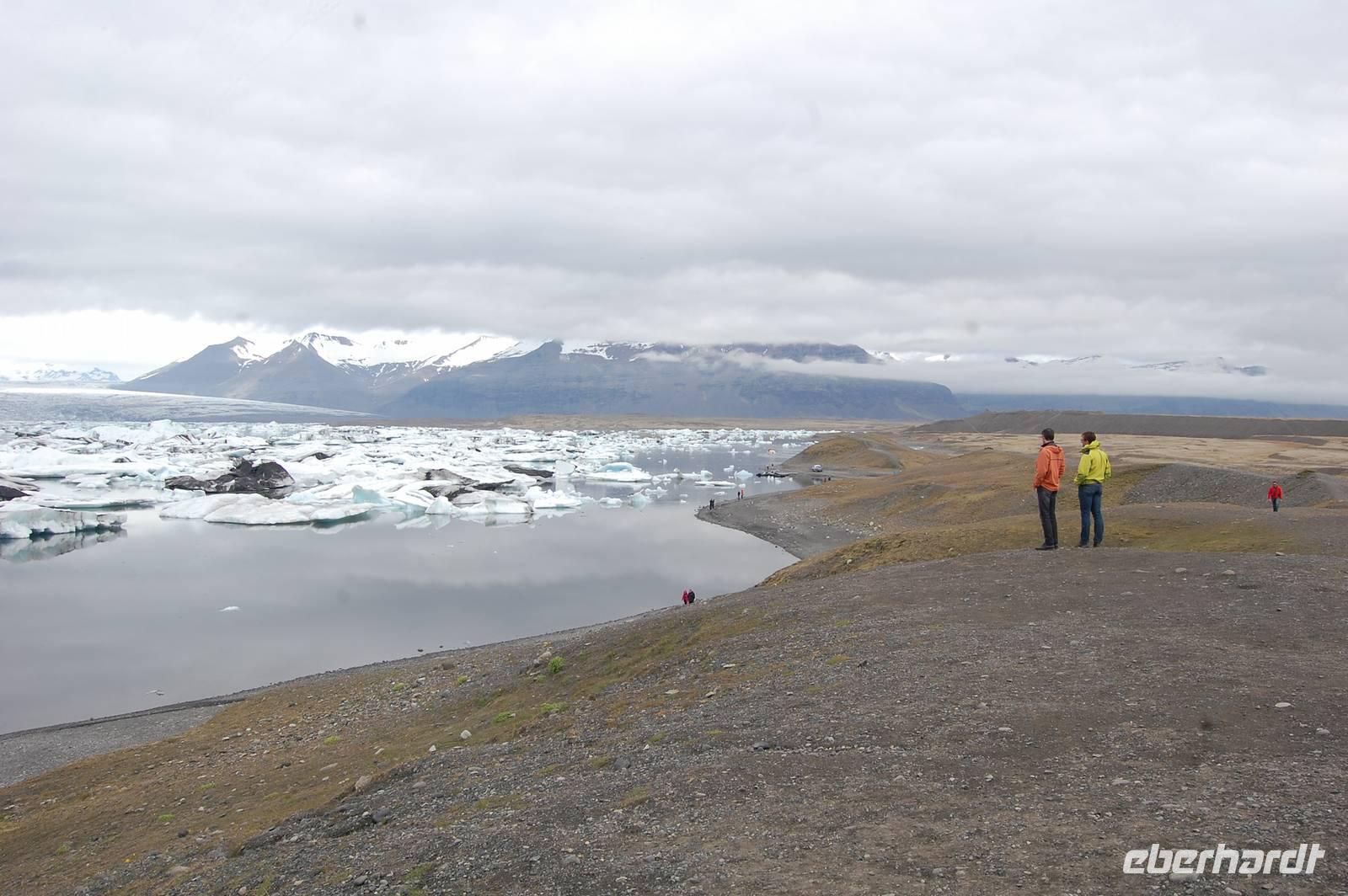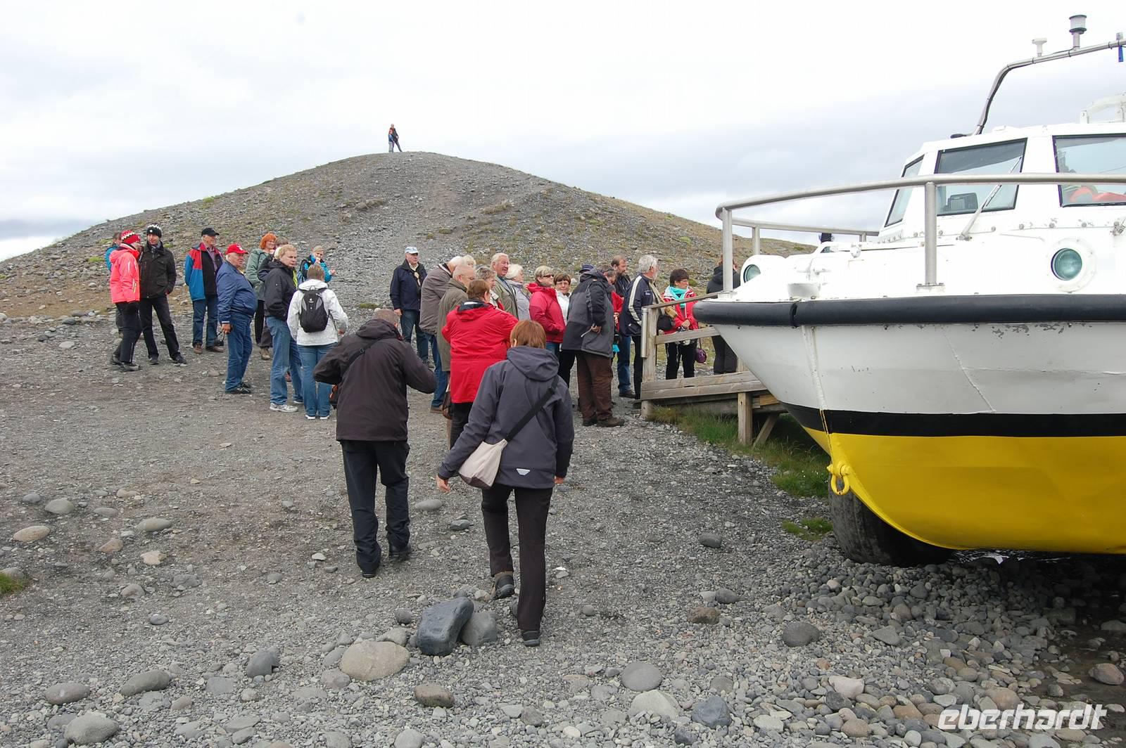 Nun bringen uns die Jeeps wieder zum Bus, der uns anschließend auf der Straße N1 weiter nach Osten bringt. Nur wenige Kilometer sind es, bis wir die nächste Attraktion des heutigen Tages erreichen. Mittags sind wir an der Gletscherlagune, in der die blauen Spitzen der Eisberge langsam in Richtung Meer schwimmen. Um 12.30 Uhr steigen wir auf ein Amphibienfahrzeug, das uns zuerst übers Land fährt, dann rollen die riesigen Räder ins Wasser und wir schwimmen zwischen den Eisbergen. Jorge - unser Guide aus Spanien, spricht kaum Deutsch und ich übersetze aus seinen englischen Ausführungen. Gerade als wir einen Eisberg betrachten, bricht ein großes Stück tosend ins Wasser und löst eine gewaltige Welle aus. Der Kapitän, der das Kalben ebenfalls bemerkte, dreht das Schiff, so dass wir der Welle nicht die Breitseite, sondern das Heck des Schiffes bieten.