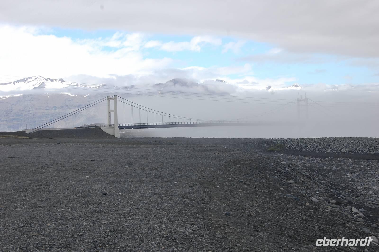 Ein tolles Live-Erlebnis, dass wir mit einem „Whisky on the Rocks" begießen. Dazu hatte Jorge ein Stück 1000-jähriges Gletschereis gecrusht. Becher und Irischen Whisky hatte ich vorsorglich eingepackt. Nach 45 Minuten landen wir wieder und verbringen noch etwas Zeit zum Essen im Bistro der Anlage. Anschließend besuchen wir noch die Mündung des Gletscherflusses, wo wir noch einmal kurz zu einem Fotostopp aussteigen. Überall liegt das Gletschereis in kleinen Stückchen auf dem schwarzen Lavasand des Ufers. Mystischer Nebel steigt wie aus einer Kühltruhe auf und verschleiert die Hängebrücke.