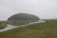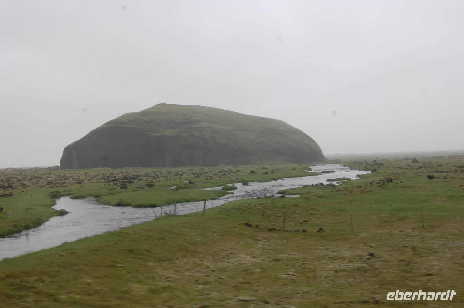 Wir fahren durch mit grauen Flechten bewachsene Lavafelder, die sich jetzt durch den Regen in grüne Hügelflächen verwandeln. Aus dem Nichts taucht der „Kriegerstein" auf, ein Fels, der in der endlosen Lava-Landschaft steht.