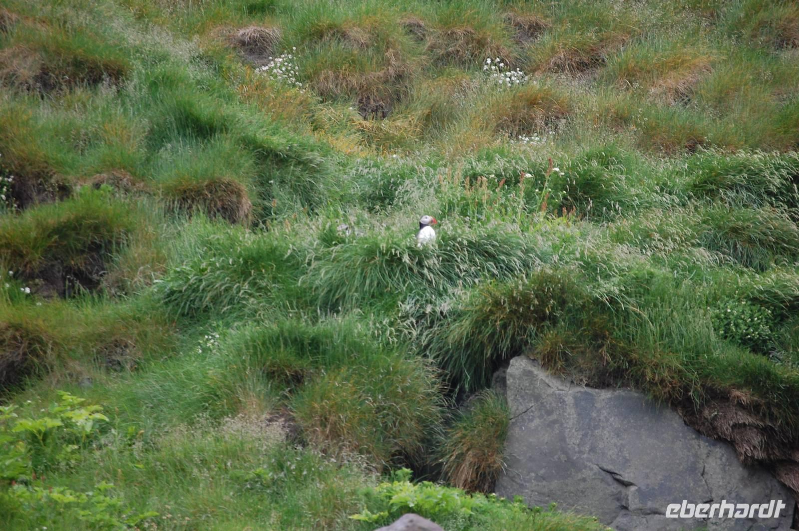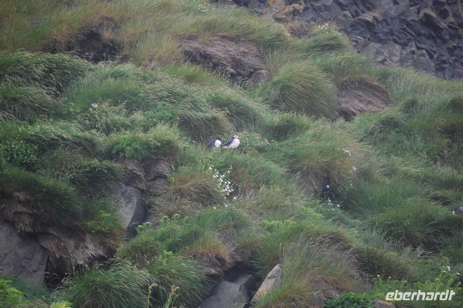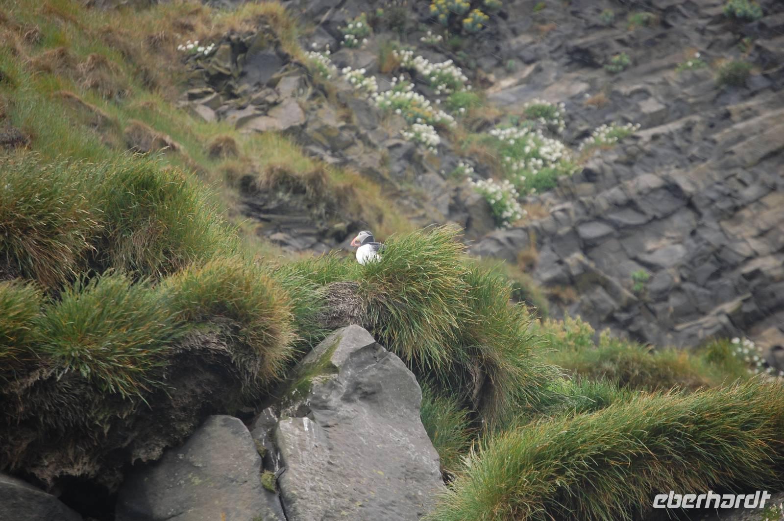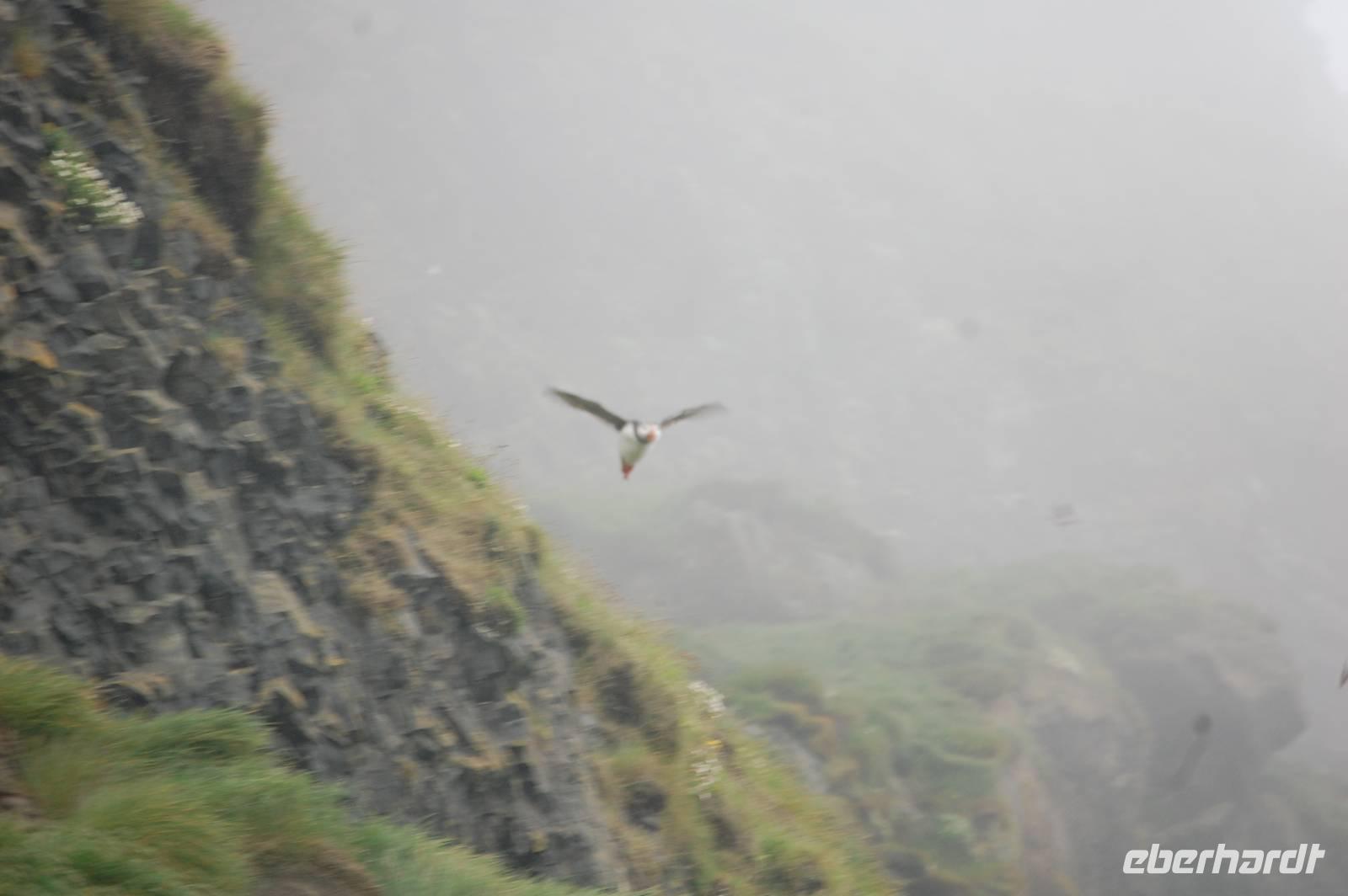 Pünktlich um 09.00 Uhr verlassen wir unser Hotel in Vik und sind auf der N1 unterwegs in Richtung Osten. Doch schon nach ein paar Kilometern verlassen wir die Hauptstraße, um zur Steilküste zu gelangen, wo wir die possierlichen Papageientaucher tatsächlich beim Brüten sehen. Es sind aber auch wunderschöne Basaltsäulen und eine Höhle zu sehen und abzulichten.