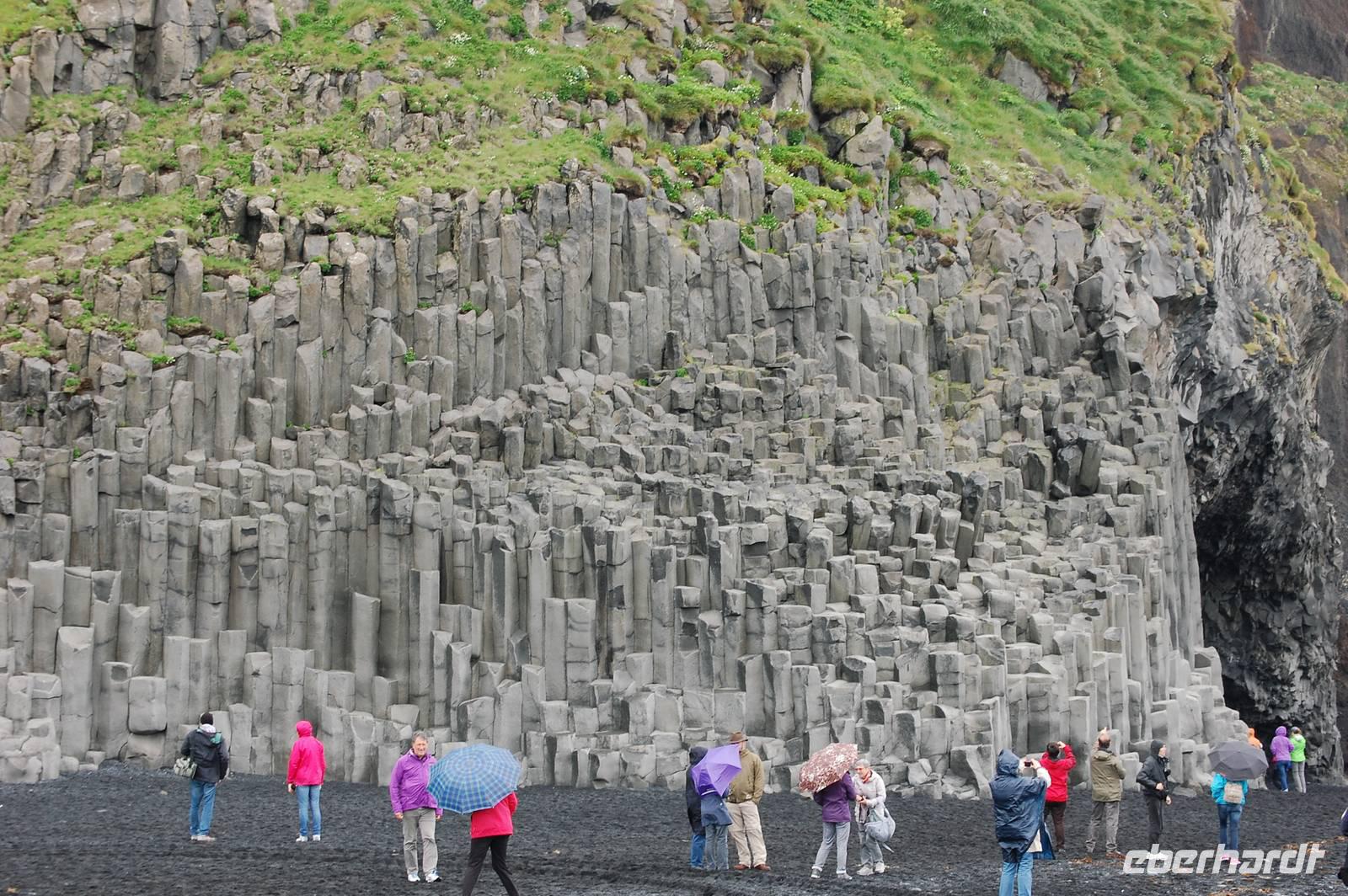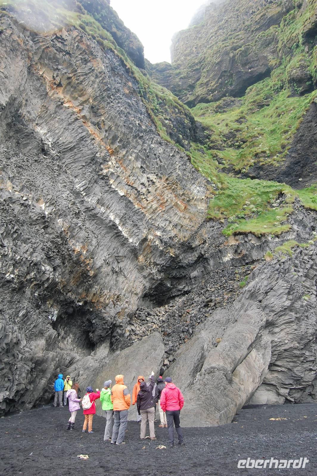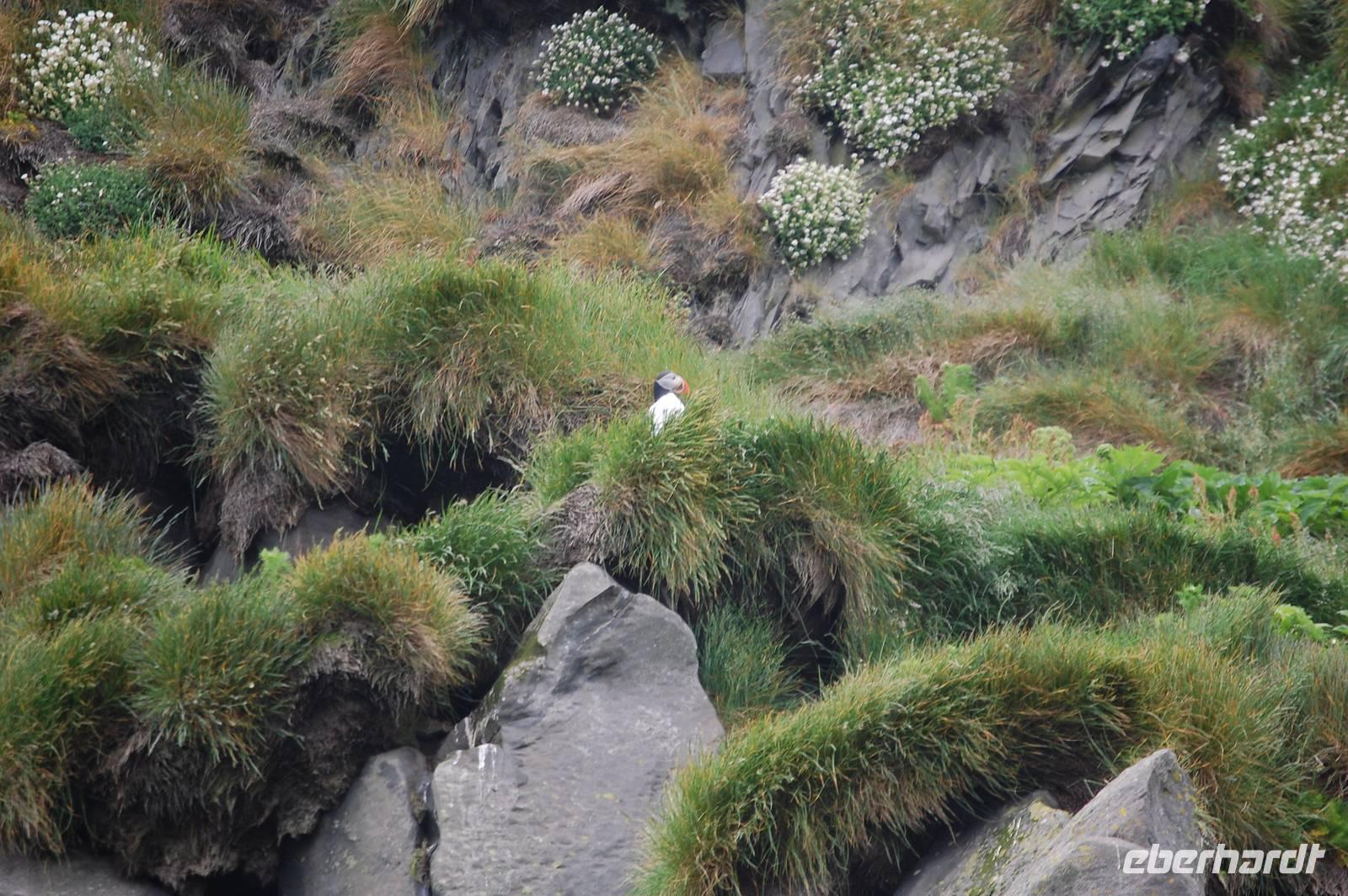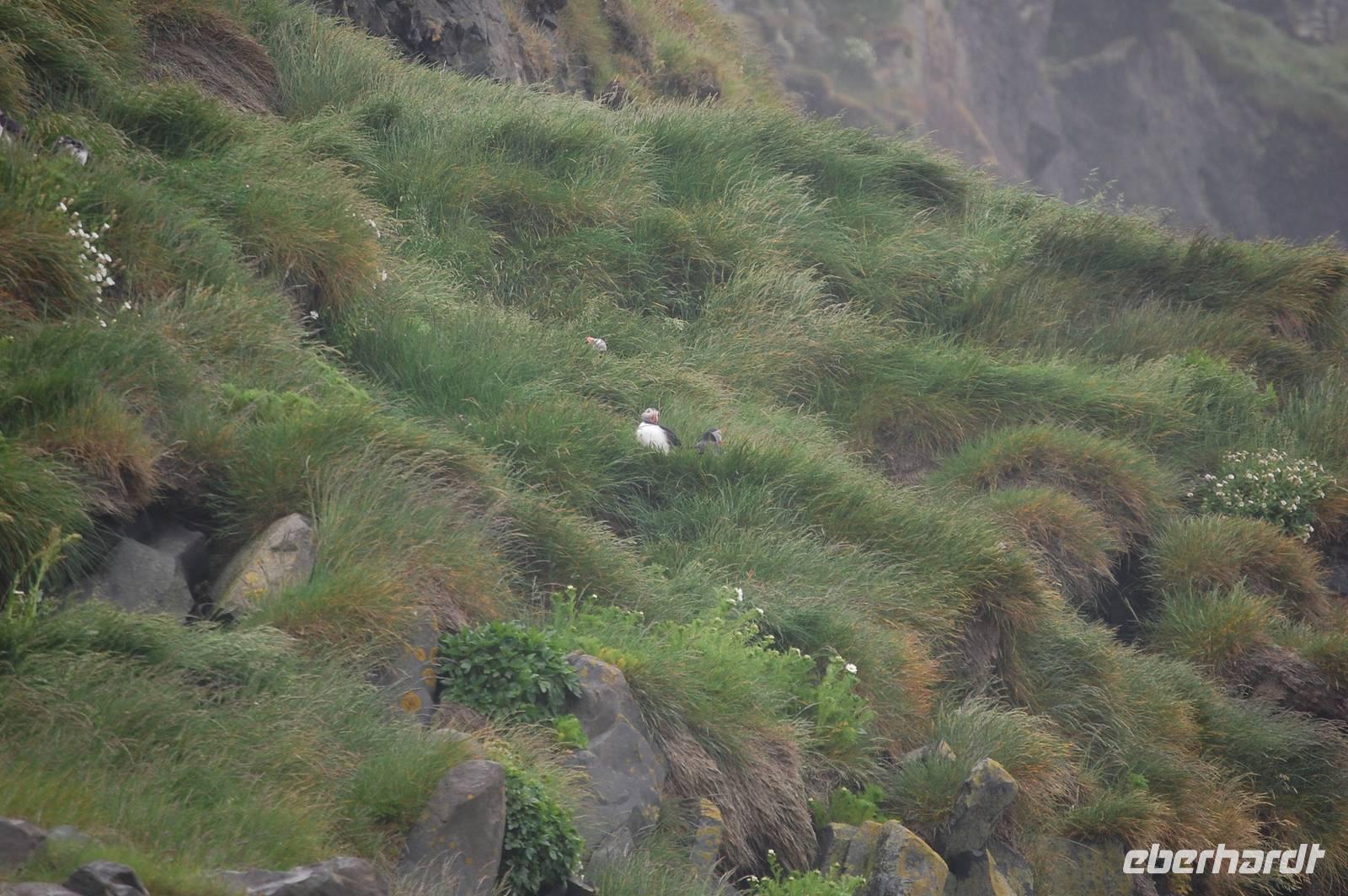 Pünktlich um 09.00 Uhr verlassen wir unser Hotel in Vik und sind auf der N1 unterwegs in Richtung Osten. Doch schon nach ein paar Kilometern verlassen wir die Hauptstraße, um zur Steilküste zu gelangen, wo wir die possierlichen Papageientaucher tatsächlich beim Brüten sehen. Es sind aber auch wunderschöne Basaltsäulen und eine Höhle zu sehen und abzulichten.