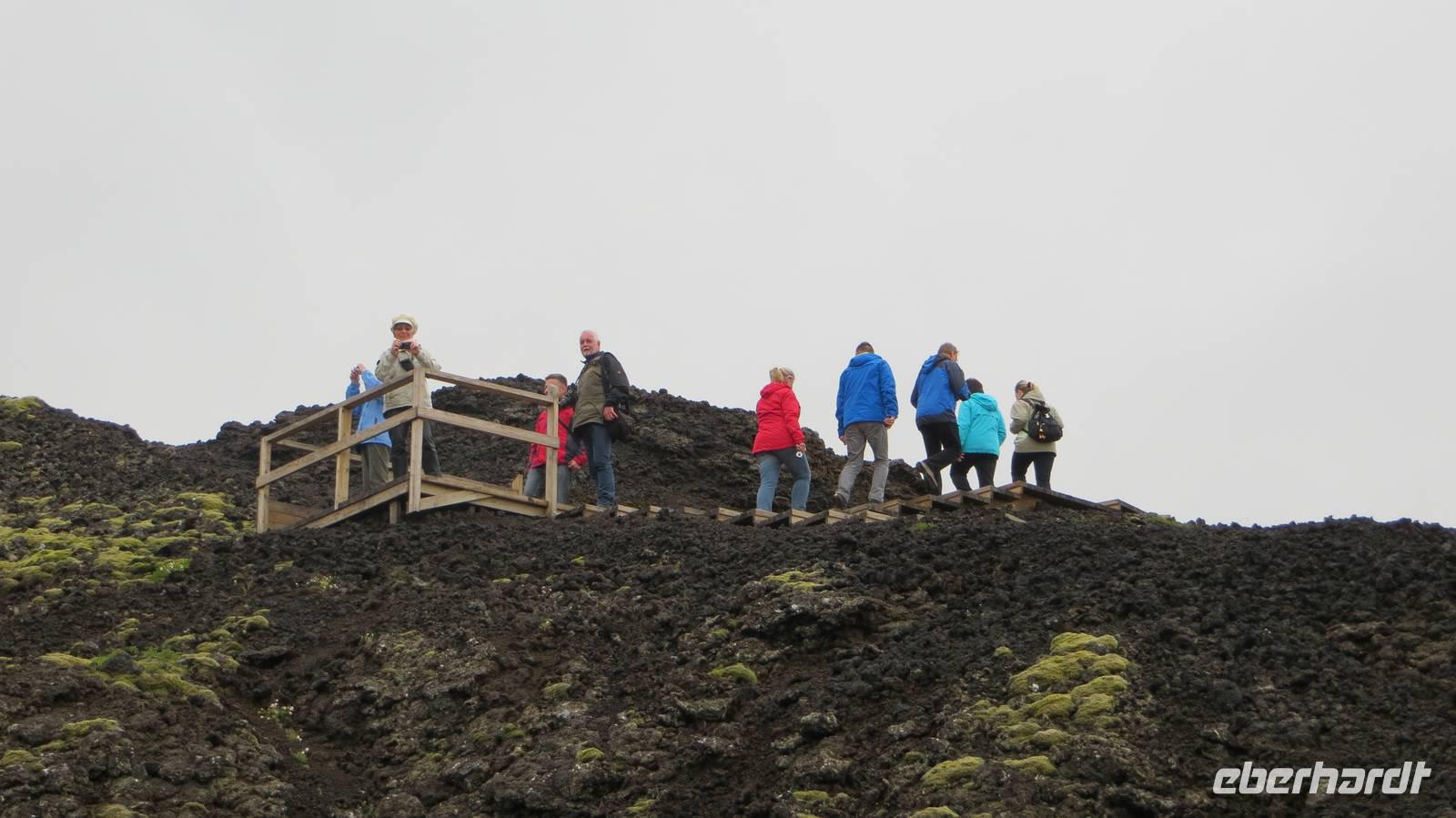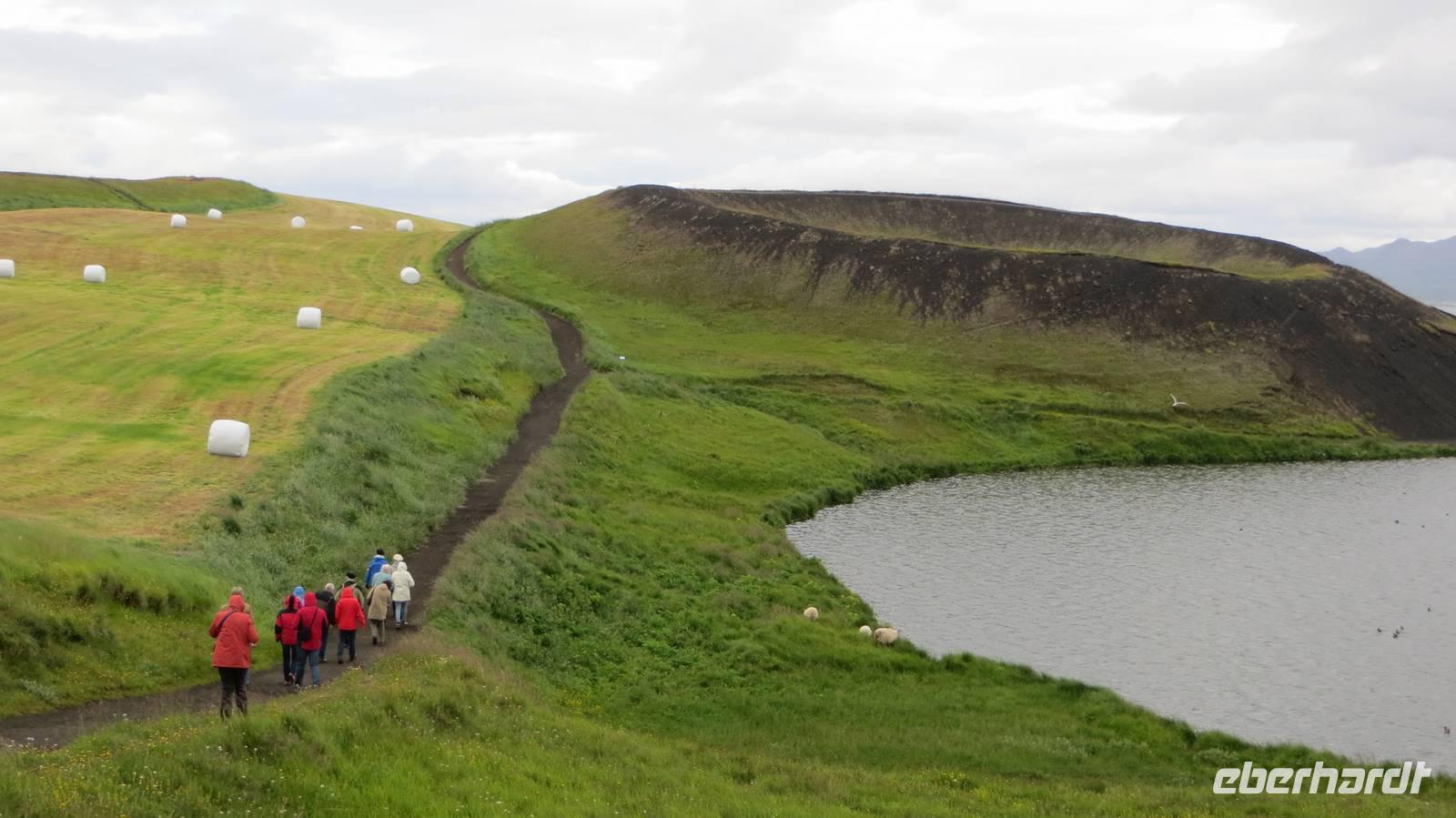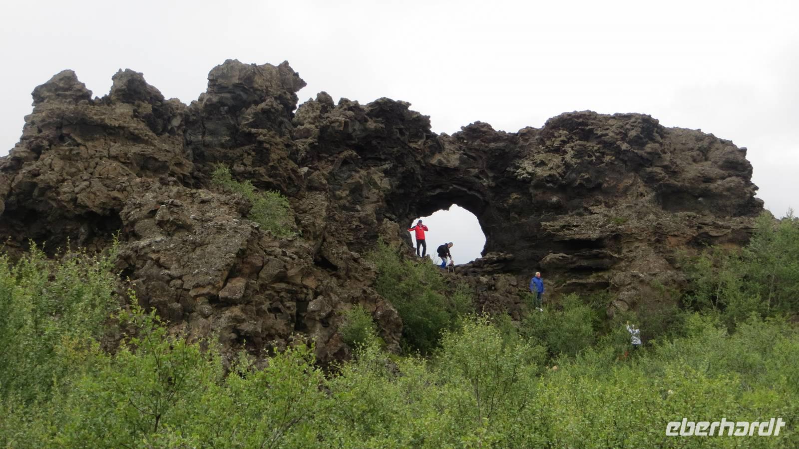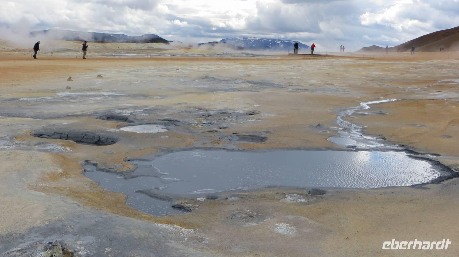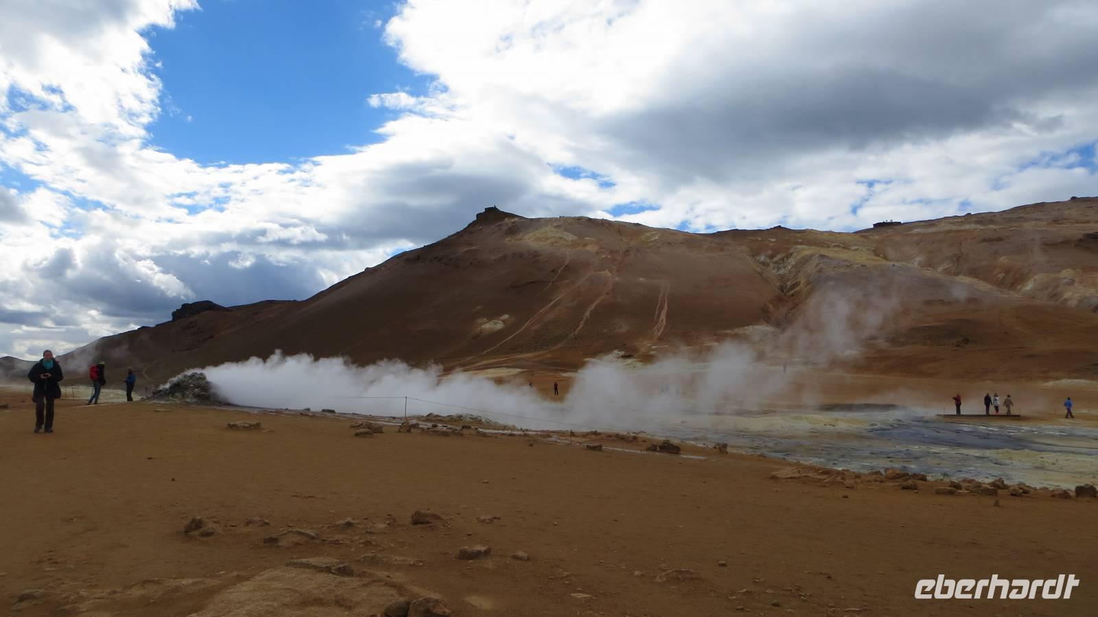 Da wir heute eine lange Fahrt mit vielen Programmpunkten vor uns haben, starten wir schon eine Stunde früher als gewohnt. Und so verlassen wir gegen 08:00 Uhr das Hotel in Akureyri. Zunächst fahren wir bis zum Wasserfall Godafoss - die gleiche Strecke wie gestern. Von hier setzen wir unsere Reise zum Myvatn, dem Mückensee, fort. Unterwegs legen wir einen Stopp am Laxá-Fluss ein. Dieser verfügt über einen interessanten Verlauf und weist zahlreiche Lachse auf, wodurch er ein beliebter Fluss zum Angeln ist. Dies ist in Island jedoch nicht ganz billig, da ein Tag angeln pro Person gleich mal 3000 € kosten kann. Am Mückensee herrscht heute stärkerer Wind und so werden wir nicht von den sonst hier zahlreich anzutreffenden Mücken begrüßt. Glücklich über diesen Umstand unternehmen wir einen kleinen Spaziergang entlang dem Binnensee, der eine Fläche von ca. 37 km² hat und Lebensraum von bis zu 16 verschiedenen Entenarten ist. Wir bestaunen hier die zahlreichen Pseudokrater, welche durch den Fluss frischer Lava über dieses Feuchtgebiet entstanden sind. Die Landschaft ist saftig grün und ein paar Schafe lassen sich das Gras schmecken. Auch einen kleinen Vogel, der am Wegesrand durch die Wiese läuft, hat schnell unsere Aufmerksamkeit. In der Ferne sehen wir auch einen riesigen Schildvulkan, der der größte auf Island ist. Bevor es weiter geht, gehen wir noch in einen kleinen Souvenirshop und erledigen unsere "technischen" Bedürfnisse . Unser zweites Ziel des heutigen Tages ist das Lavafeld von Dimmuborgir, was so viel heißt wie dunkle Städte oder dunkle Burgen. Bei einem Spaziergang durch das Labyrinth, welches aus zahlreichen Türmen, Brücken, Höhlen und Überhängen besteht, sehen wir auch Erdspalten, die sich diagonal durch das Lavafeld ziehen und sehr gefährlich sein können. Wir lassen unsere Fantasie spielen und erkennen in den bizarren Naturformationen die verschiedensten Gestalten. An einem großen Loch in einer Formation verlassen 3 Gäste kurzerhand die Gruppe, um einen Blick in die "Welt" dahinter zu riskieren . Gespannt wartet der Rest der Gruppe auf ihre Berichte. Wieder am Bus genießen wir noch einmal einen Blick auf dieses ca. 1 km² großes Feld. Dann geht es auch schon weiter. Nun haben wir uns erst einmal etwas Entspannung verdient und statten deshalb der Badelandschaft Jardbödin eine Besuch ab. Wir lassen uns in dem milchig blauen und auch teilweise wirklich ganz schön heißen Wasser treiben. Der Zeit vergeht wie im Flug und schon ist es wieder Zeit, dass wir uns auf den Weg machen. Doch bevor wir weiterfahren, stärken wir uns noch im Restaurant und der ein oder andere kostet das für diese Region typische Quellbrot mit Forelle. Wir fahren ein kleines Stück und genießen nochmals den Blick über Jardbödin, das ehemalige Thermalbad und den Mückensee. Nun geht es zum Hochtemperaturgebiet Námaskarð, wo wir buchstäblich in Teufels Küche kommen. Unterhalb des Berges Námafjall befindet sich das aktive Solfatarenfeld Hverarönd. Wir sind beeindruckt von diesem Naturschauspiel. Die in Gelb-. Orange- und Brauntönen gefärbte Ebene ist ein Feld mit brodelnden Schlammtöpfen und zahlreichen zischenden Dampf- und Schwefelquellen. Hier erleben wir hautnah, wie die Erde "lebt". Weiter geht es zum nächsten Naturerlebnis - dem Dettifoss, einem der wohl eindrucksvollsten Wasserfälle Europas. Er ist mit 45 m zwar nicht der höchste Wasserfall, aber mit einer Wassermenge von ca. 193 m³ pro Sekunde der energiereichste Wasserfall Europas. Wir sind überwältigt von diesem Naturphänomen. Welch ohrenbetäubenden Lärm und großen Sprühnebel der Wasserfall bewirkt. Entlang dem Jökulsá-Fluss laufen einige Gäste noch zum 10 m hohen Selfoss, welcher sich oberhalb des Dettifoss befindet. Auf unseren weiteren Weg in Richtung der Ostfjorde stellt uns Ulrik das berühmte isländische Reiterlied vor, welcher er am Ende sogar extra für uns zum Besten bringt . Um eine kleine Kaffeepause zu machen, fahren wir zu einem Bauernhof, der weit abseits der Straße im Nirgendwo liegt. Weit und breit gibt es hier nur diesen Hof, welcher aber über eine Kirche, ein Café und sogar eine eigene kleine Tankstelle verfügt. Wir schauen uns etwas um und lassen uns bei einem Ausblick in diese unendliche Weite einen Kaffee mit Kuchen schmecken. Schließlich brechen wir zu unserer letzten Etappe des heutigen Tages auf - nach Egilsstaðir bzw. Hallormsstaður, wo sich unser Hotel befindet. Wir fahren durch karge Wüstenlandschaft und legen unterwegs noch 3 kurze Stopps ein, um diese Landschaft, wo auch zahlreiche Wasserfälle zu sehen sind, nicht nur im Kopf sondern auch auf Fotos festzuhalten. Um 20:00 Uhr treffen wir schließlich im Hotel Hallormsstaður. Dieses ist ganz idyllisch im größten zusammenhängenden Wald Islands direkt an einem See gelegen. Wir beziehen schnell unsere Zimmer und treffen uns zum gemeinsamen Abendessen im Restaurant wieder. Mit Blick auf den See lassen wir uns das köstliche Buffet schmecken. Unser Busfahrer Siggi kann heute nicht mit uns zu Abend essen. Das Busmikrofon hat uns heute zum Ende des Tages leider komplett im Stich gelassen hat und so kümmert sich Siggi gleich nach unserer Ankunft im Hotel um die Reparatur, so dass wir morgen wieder mit einem funktionieren Mikrofon starten können.