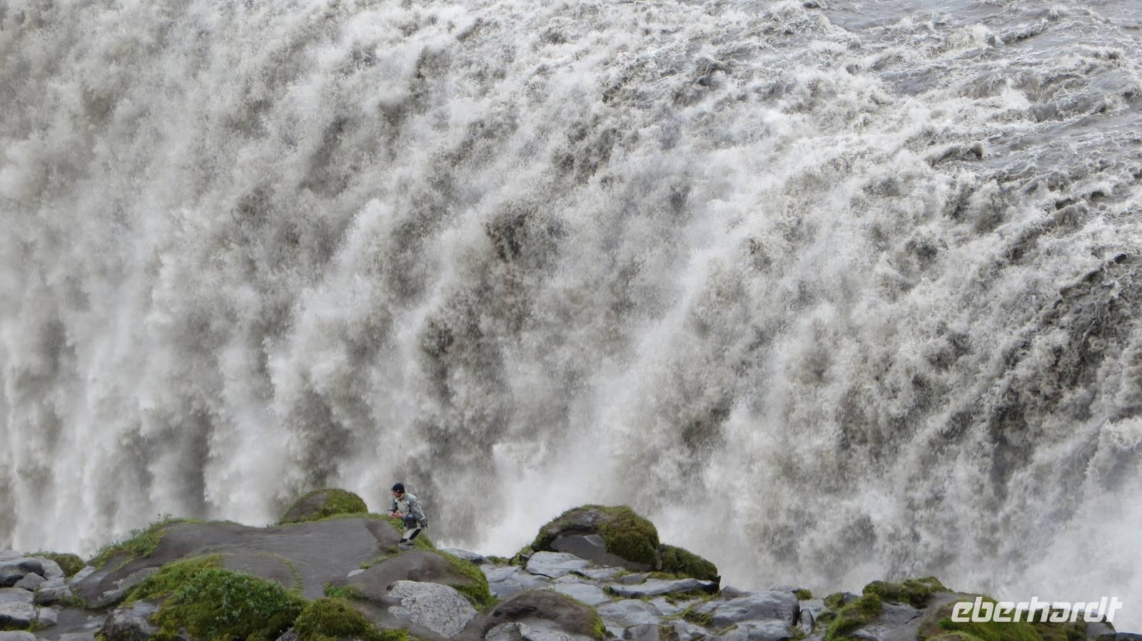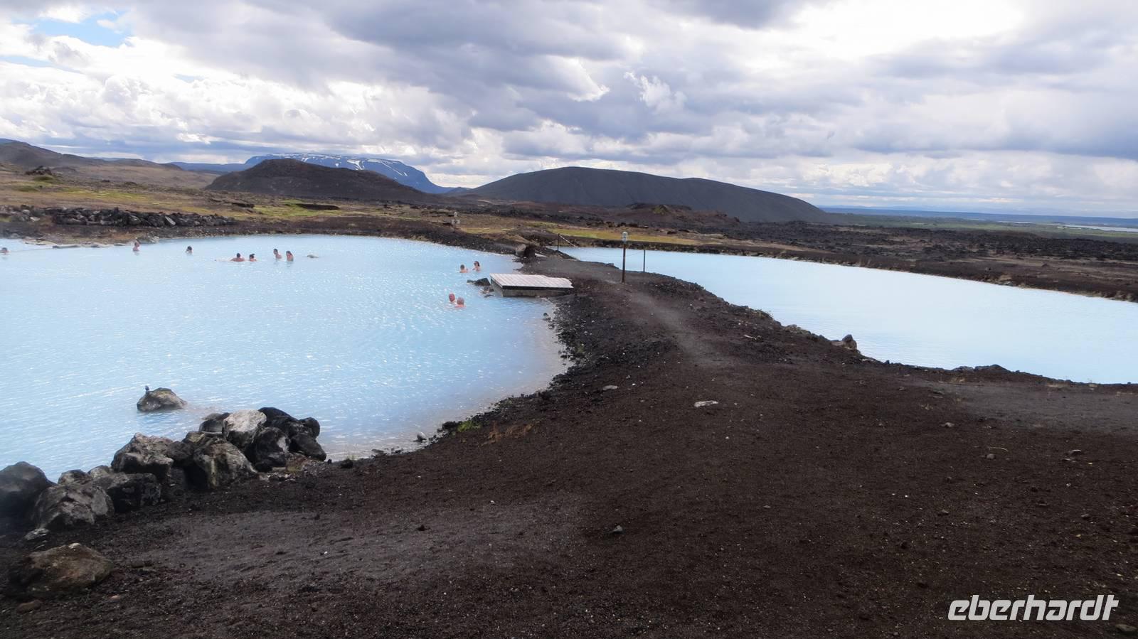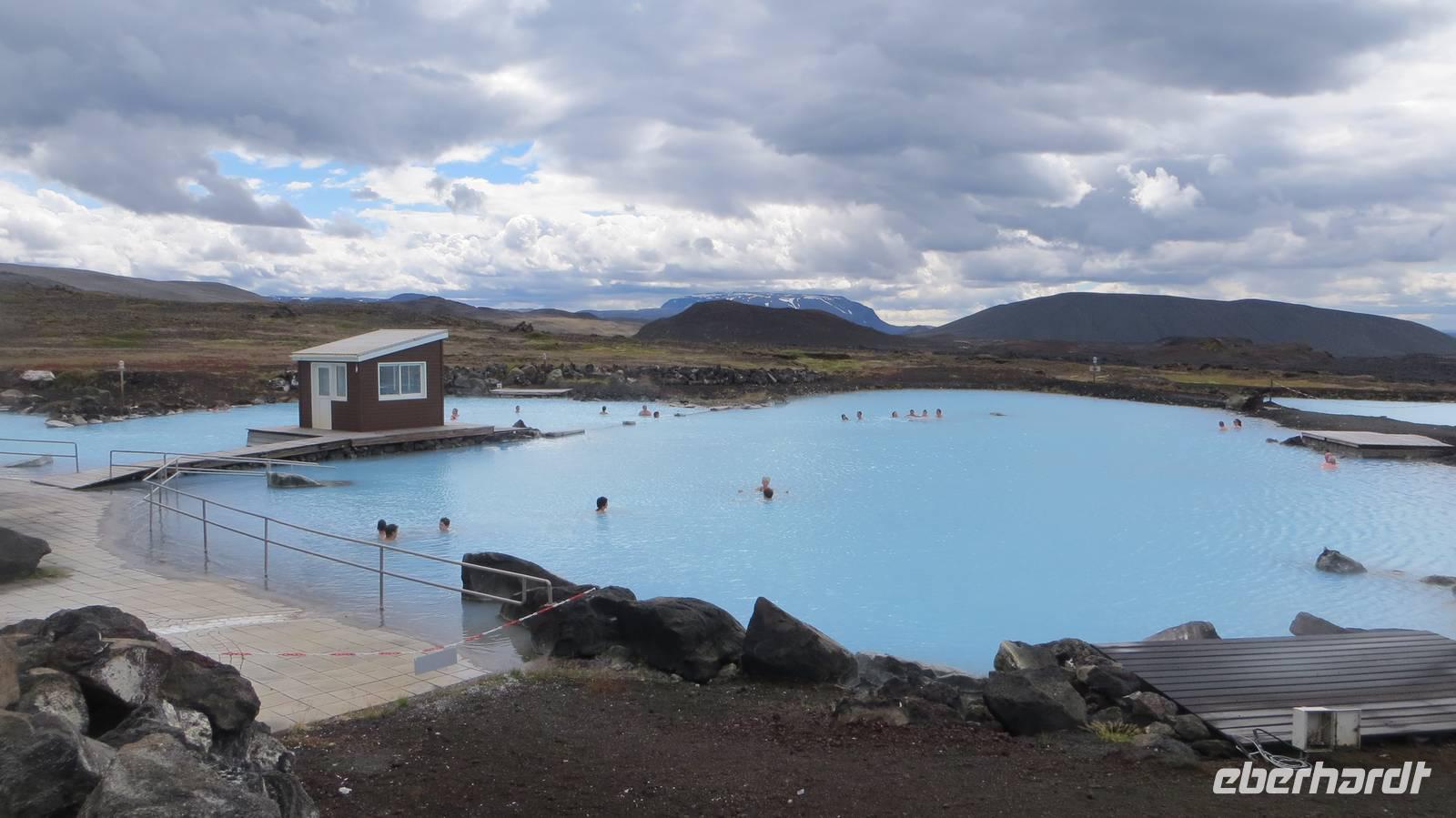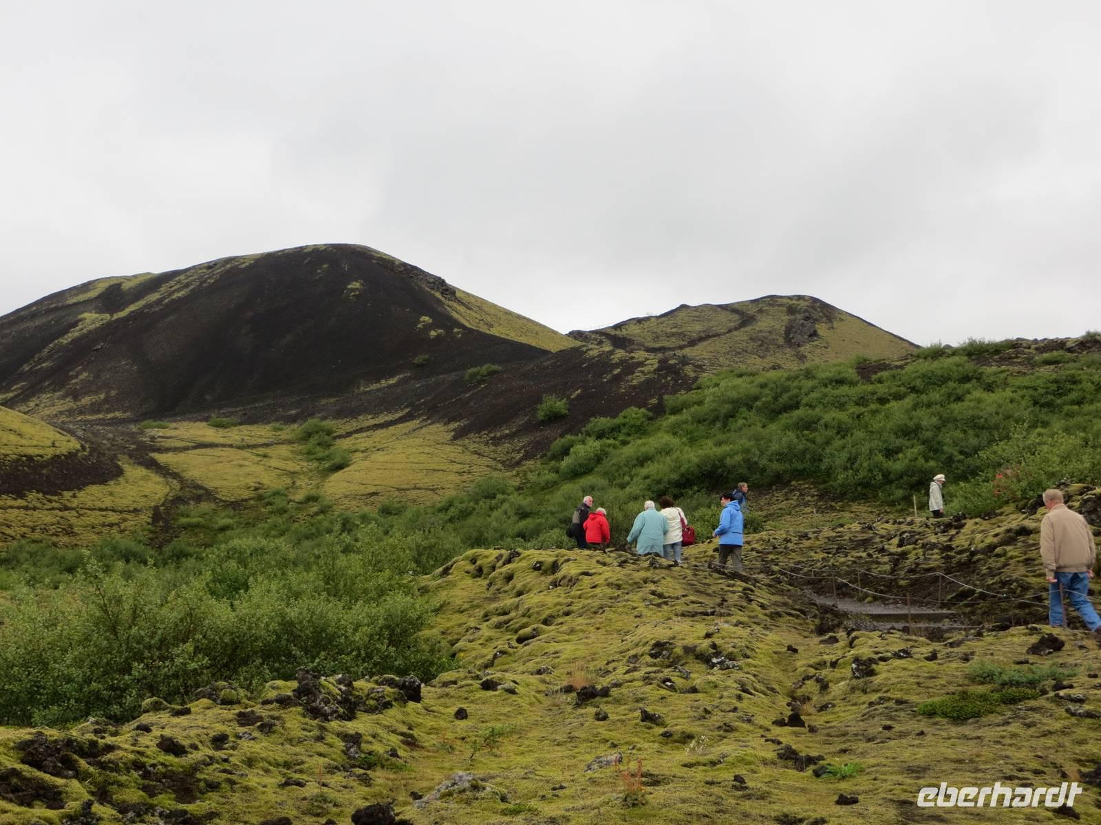 Da wir heute eine lange Fahrt mit vielen Programmpunkten vor uns haben, starten wir schon eine Stunde früher als gewohnt. Und so verlassen wir gegen 08:00 Uhr das Hotel in Akureyri. Zunächst fahren wir bis zum Wasserfall Godafoss - die gleiche Strecke wie gestern. Von hier setzen wir unsere Reise zum Myvatn, dem Mückensee, fort. Unterwegs legen wir einen Stopp am Laxá-Fluss ein. Dieser verfügt über einen interessanten Verlauf und weist zahlreiche Lachse auf, wodurch er ein beliebter Fluss zum Angeln ist. Dies ist in Island jedoch nicht ganz billig, da ein Tag angeln pro Person gleich mal 3000 € kosten kann. Am Mückensee herrscht heute stärkerer Wind und so werden wir nicht von den sonst hier zahlreich anzutreffenden Mücken begrüßt. Glücklich über diesen Umstand unternehmen wir einen kleinen Spaziergang entlang dem Binnensee, der eine Fläche von ca. 37 km² hat und Lebensraum von bis zu 16 verschiedenen Entenarten ist. Wir bestaunen hier die zahlreichen Pseudokrater, welche durch den Fluss frischer Lava über dieses Feuchtgebiet entstanden sind. Die Landschaft ist saftig grün und ein paar Schafe lassen sich das Gras schmecken. Auch einen kleinen Vogel, der am Wegesrand durch die Wiese läuft, hat schnell unsere Aufmerksamkeit. In der Ferne sehen wir auch einen riesigen Schildvulkan, der der größte auf Island ist. Bevor es weiter geht, gehen wir noch in einen kleinen Souvenirshop und erledigen unsere "technischen" Bedürfnisse . Unser zweites Ziel des heutigen Tages ist das Lavafeld von Dimmuborgir, was so viel heißt wie dunkle Städte oder dunkle Burgen. Bei einem Spaziergang durch das Labyrinth, welches aus zahlreichen Türmen, Brücken, Höhlen und Überhängen besteht, sehen wir auch Erdspalten, die sich diagonal durch das Lavafeld ziehen und sehr gefährlich sein können. Wir lassen unsere Fantasie spielen und erkennen in den bizarren Naturformationen die verschiedensten Gestalten. An einem großen Loch in einer Formation verlassen 3 Gäste kurzerhand die Gruppe, um einen Blick in die "Welt" dahinter zu riskieren . Gespannt wartet der Rest der Gruppe auf ihre Berichte. Wieder am Bus genießen wir noch einmal einen Blick auf dieses ca. 1 km² großes Feld. Dann geht es auch schon weiter. Nun haben wir uns erst einmal etwas Entspannung verdient und statten deshalb der Badelandschaft Jardbödin eine Besuch ab. Wir lassen uns in dem milchig blauen und auch teilweise wirklich ganz schön heißen Wasser treiben. Der Zeit vergeht wie im Flug und schon ist es wieder Zeit, dass wir uns auf den Weg machen. Doch bevor wir weiterfahren, stärken wir uns noch im Restaurant und der ein oder andere kostet das für diese Region typische Quellbrot mit Forelle. Wir fahren ein kleines Stück und genießen nochmals den Blick über Jardbödin, das ehemalige Thermalbad und den Mückensee. Nun geht es zum Hochtemperaturgebiet Námaskarð, wo wir buchstäblich in Teufels Küche kommen. Unterhalb des Berges Námafjall befindet sich das aktive Solfatarenfeld Hverarönd. Wir sind beeindruckt von diesem Naturschauspiel. Die in Gelb-. Orange- und Brauntönen gefärbte Ebene ist ein Feld mit brodelnden Schlammtöpfen und zahlreichen zischenden Dampf- und Schwefelquellen. Hier erleben wir hautnah, wie die Erde "lebt". Weiter geht es zum nächsten Naturerlebnis - dem Dettifoss, einem der wohl eindrucksvollsten Wasserfälle Europas. Er ist mit 45 m zwar nicht der höchste Wasserfall, aber mit einer Wassermenge von ca. 193 m³ pro Sekunde der energiereichste Wasserfall Europas. Wir sind überwältigt von diesem Naturphänomen. Welch ohrenbetäubenden Lärm und großen Sprühnebel der Wasserfall bewirkt. Entlang dem Jökulsá-Fluss laufen einige Gäste noch zum 10 m hohen Selfoss, welcher sich oberhalb des Dettifoss befindet. Auf unseren weiteren Weg in Richtung der Ostfjorde stellt uns Ulrik das berühmte isländische Reiterlied vor, welcher er am Ende sogar extra für uns zum Besten bringt . Um eine kleine Kaffeepause zu machen, fahren wir zu einem Bauernhof, der weit abseits der Straße im Nirgendwo liegt. Weit und breit gibt es hier nur diesen Hof, welcher aber über eine Kirche, ein Café und sogar eine eigene kleine Tankstelle verfügt. Wir schauen uns etwas um und lassen uns bei einem Ausblick in diese unendliche Weite einen Kaffee mit Kuchen schmecken. Schließlich brechen wir zu unserer letzten Etappe des heutigen Tages auf - nach Egilsstaðir bzw. Hallormsstaður, wo sich unser Hotel befindet. Wir fahren durch karge Wüstenlandschaft und legen unterwegs noch 3 kurze Stopps ein, um diese Landschaft, wo auch zahlreiche Wasserfälle zu sehen sind, nicht nur im Kopf sondern auch auf Fotos festzuhalten. Um 20:00 Uhr treffen wir schließlich im Hotel Hallormsstaður. Dieses ist ganz idyllisch im größten zusammenhängenden Wald Islands direkt an einem See gelegen. Wir beziehen schnell unsere Zimmer und treffen uns zum gemeinsamen Abendessen im Restaurant wieder. Mit Blick auf den See lassen wir uns das köstliche Buffet schmecken. Unser Busfahrer Siggi kann heute nicht mit uns zu Abend essen. Das Busmikrofon hat uns heute zum Ende des Tages leider komplett im Stich gelassen hat und so kümmert sich Siggi gleich nach unserer Ankunft im Hotel um die Reparatur, so dass wir morgen wieder mit einem funktionieren Mikrofon starten können.