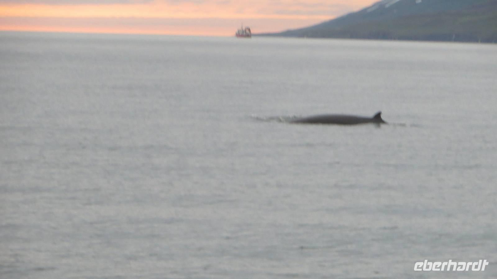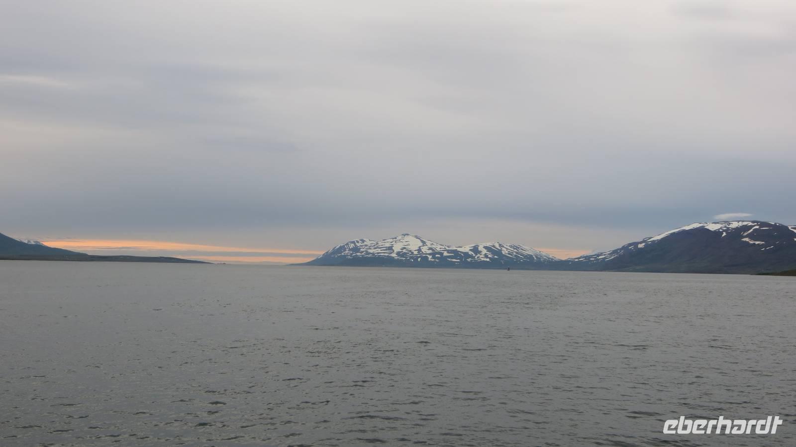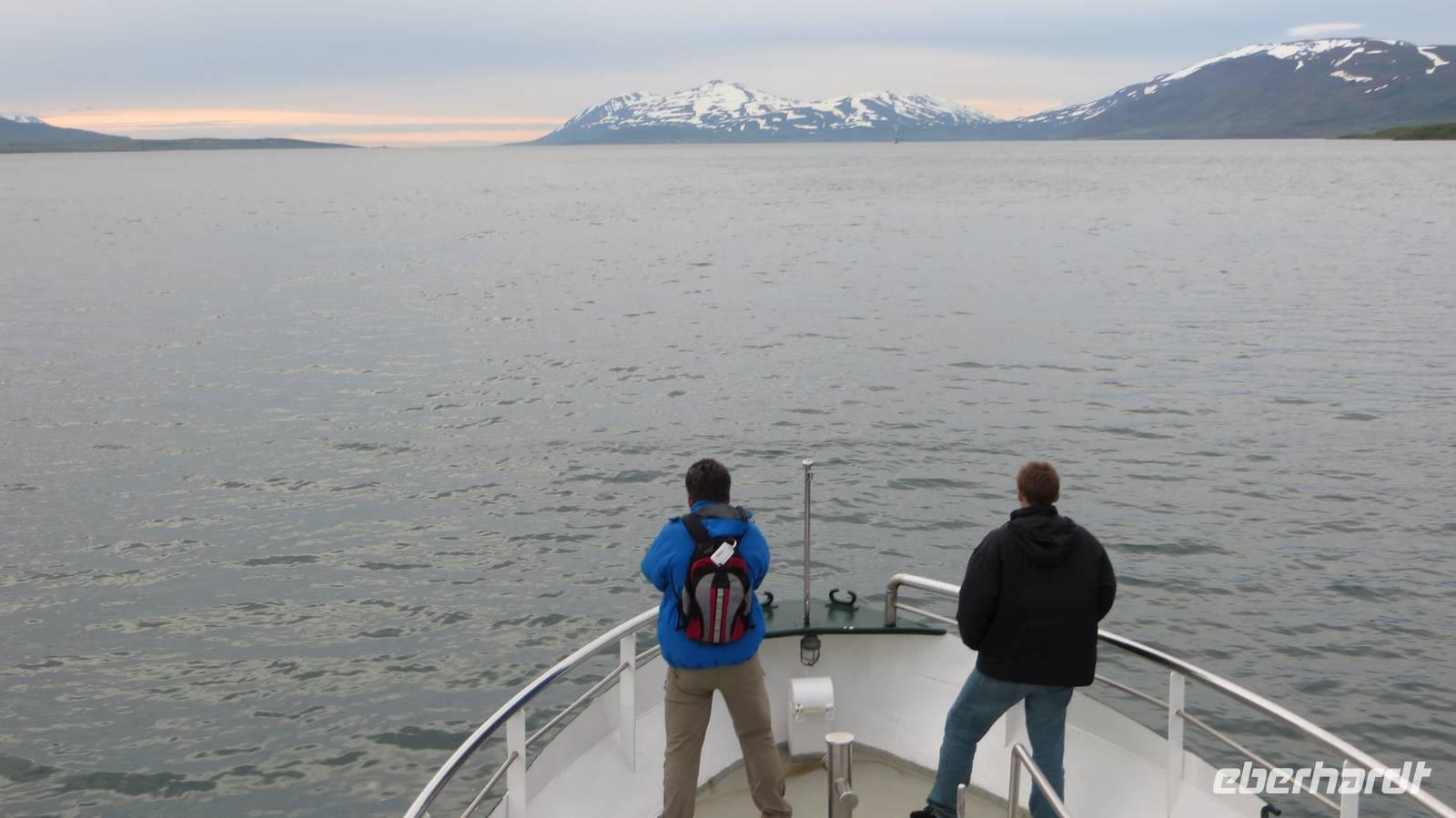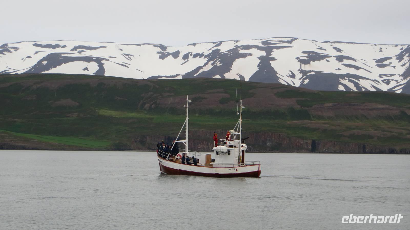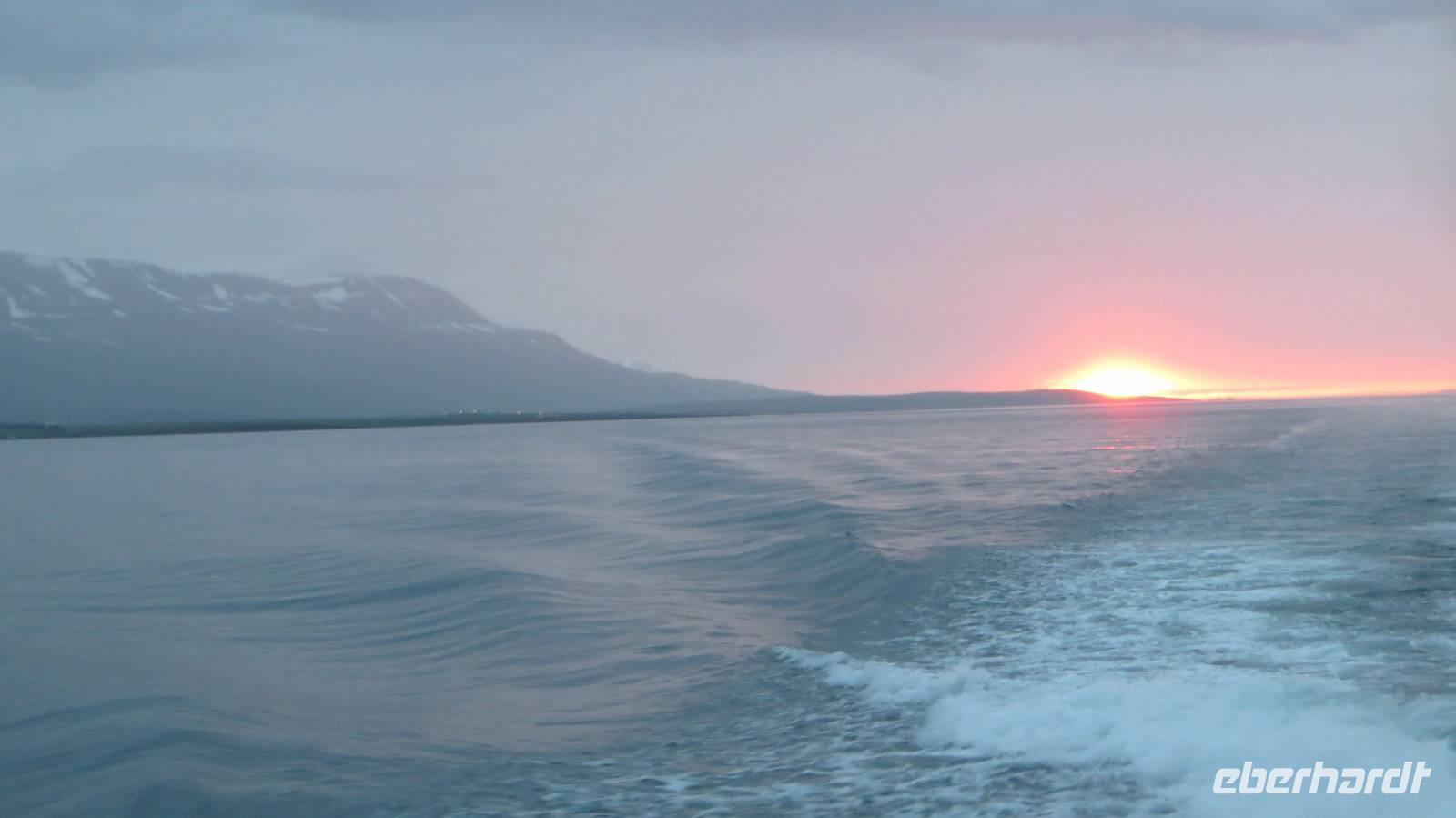 Heute heißt es erst einmal Abschied nehmen von der isländischen Hauptstadt. Und so starten wir mit gepackten Koffern pünktlich 9:00 Uhr von unserem Hotel. Für die kommenden Tage werden uns nun Sigi als Busfahrer und Ulrike als Reiseleiter diese sagenhafte nordische Insel mit all ihren Facetten zeigen. Nachdem wir Reykjavík wie gestern in Richtung Norden verlassen haben, erreichen wir schon bald den Walfjordtunnel. Durch diesen 6 km langen Tunnel, welcher an einer Stelle sogar bis zu 160 m tief ist, durchqueren wir den Fjord. Anschließend geht es weiter bis in die Kleinstadt Borgarnes, wo wir unsere erste kleine Pause einlegen. Borgarnes ist Heimatort berühmter Dichter und Sagahelden, wie z.B. von Egill Skallagrímsson. Nachdem alle wieder im Bus sind, verlassen wir nun die Küste und fahren in das Landesinnere bis in das Norðurádalur Tal, wo sich der erloschene Krater Grábrók befindet. Inmitten eines Lavafeldes steigen wir aus und starten zu einem kleinen Spaziergang. Auf einer Holztreppe gelangen wir bis auf den Kraterrand, wo wir eine komplette Runde auf diesem laufen können. Wir genießen die herrliche Aussicht und sehen einen weiteren Krater, den Grábrókarfell. Im Bus stärken wir uns erst einmal mit typisch isländischer Schokolade, die mit Lakritze gefüllt ist - mmhh schmeckt das lecker. Weiter führt uns die heutige Fahrt über die Hochebene Holtavörðuheiði bis wir die Nordküste von Island am Hrútafjörður erreichen. Von hier geht es über Blönduós bis nach Skagafjörður, wo wir heute zu Besuch auf dem Pferdehof Flugumýri sind. Dieser Hof wird von Eyrún Anna Sigurðardóttir und Páll Bjarki Pálsson sowie ihren fünf Kindern betrieben und verfügt im Moment über 120 Pferde. Höchstpersönlich von der Hofbesitzerin empfangen, führt sie uns in den Stall, wo sie uns anhand der Pferde ihre Besonderheiten erläutert. An einer Schautafel erklärt sie uns die 5 unterschiedlichen Gangarten Schritt, Trab, Galopp, Töl und Pass, welche in diesem Umfang ausschließlich von Islandpferden beherrscht werden und im Prinzip angeboren sind. Damit wir nun aber diese Gangarten auch einmal in Natur sehen können, verlassen wir wieder den Stall und gehen auf eine Terrasse, wo wir bei Tee, Kaffee, Kuchen und Pfannkuchen eine kleine Darbietung der Gangarten uns anschauen. Wir genießen die Zeit mit diesen beeindruckenden Tieren und machen uns schließlich wieder auf den Weg nach Akureyri. Wir nehmen Abschied von Flugumýri und werden noch lange von dem Hund des Hofes verfolgt. Vorbei an schneebefleckten Bergen und grünen Bergwiesen erreichen wir am Abend die Hauptstadt des Nordens, Akureyri. Sie ist die zweitgrößte Stadt Islands und idyllisch am Ende des Eyjafjörðurs gelegen. Die kommenden zwei Nächte werden wir im Edda-Hotel verbringen. Diese Art von Hotels sind in mehreren Orten auf Island zu finden und haben zur Besonderheit, dass sie im Winter als Wohnheime für die Studenten dienen und im Sommer unter Betreiben der Studenten als Hotels genutzt werden. Ein tolle Idee, welche von den Touristen auf Island gut angenommen wird. Nachdem alle in Ruhe ihr Zimmer bezogen haben, treffen wir uns zum gemeinsamen Abendessen. Am vielfältigen Buffet ist für jeden etwas dabei, so dass wir alle mit vollen Bäuchen das Restaurant verlassen. Da Akureyri als Ort für einmalige Walbeobachtungsfahrten bekannt ist, nutzt auch ein Großteil der Gruppe die heutige Gelegenheit zu einer Walsafari. Ulrik hat schon alles für uns organisiert, so dass wir direkt nach dem Abendessen aufbrechen können. Vorbei an der katholischen und protestantischen Kirche spazieren wir zum Hafen, wo bereits schon das Schiff, welches übrigens ein ehemaliges deutsches Polizeischiff ist, für uns bereit steht. Wir gehen an Bord und stechen pünktlich 20:30 Uhr in See. An Bord haben wir als Guide ein Mädchen aus Deutschland, welches uns während der gesamten Fahrt über die Umgebung, die Vögel und die Wale informiert. Sie erklärt uns auch das System nach welchem angesagt wird, wo Wale zu sehen sind. Die Kommandos hierfür erfolgen nach dem Uhrzeigerprinzip. So ist z.B. am Schiffsheck 6 Uhr. Wir fahren auf dem Fjörd in Richtung Meer, bis schließlich das erst Kommando ertönt. Von nun an müssen wir immer wachsam sein und die Kameras bereithalten. Wir versuchen jedes Mal, wenn sich diese faszinierenden Tiere mal kurz an der Wasseroberfläche sehen lassen, ein Foto zu schießen, doch leider ist dies nicht so einfach. Dennoch freuen wir uns über unser Glück und fahren schließlich bei einem traumhaften Sonnenuntergang zurück nach Akureyri, wo wir kurz nach Mitternacht eintreffen. Es hat inzwischen angefangen stark zu regnen, so dass wir strömenden Regen zurück zum Hotel laufen müssen. Geschafft von diesem ereignisreichen Tag fallen wir tot müde ins Bett.