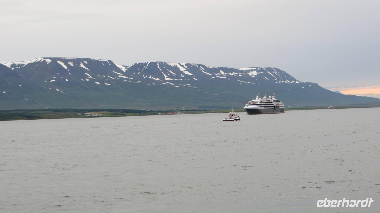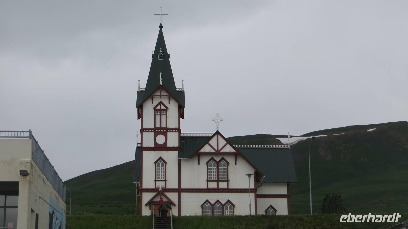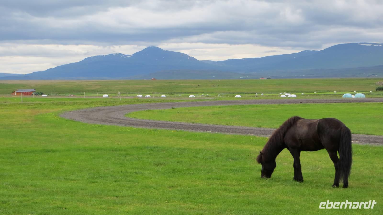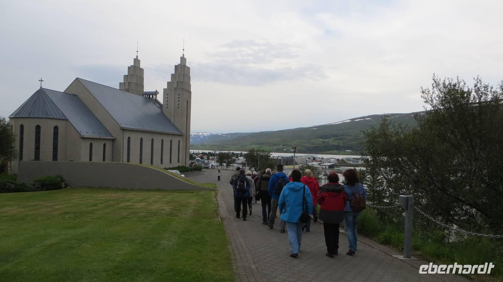 Heute heißt es erst einmal Abschied nehmen von der isländischen Hauptstadt. Und so starten wir mit gepackten Koffern pünktlich 9:00 Uhr von unserem Hotel. Für die kommenden Tage werden uns nun Sigi als Busfahrer und Ulrike als Reiseleiter diese sagenhafte nordische Insel mit all ihren Facetten zeigen. Nachdem wir Reykjavík wie gestern in Richtung Norden verlassen haben, erreichen wir schon bald den Walfjordtunnel. Durch diesen 6 km langen Tunnel, welcher an einer Stelle sogar bis zu 160 m tief ist, durchqueren wir den Fjord. Anschließend geht es weiter bis in die Kleinstadt Borgarnes, wo wir unsere erste kleine Pause einlegen. Borgarnes ist Heimatort berühmter Dichter und Sagahelden, wie z.B. von Egill Skallagrímsson. Nachdem alle wieder im Bus sind, verlassen wir nun die Küste und fahren in das Landesinnere bis in das Norðurádalur Tal, wo sich der erloschene Krater Grábrók befindet. Inmitten eines Lavafeldes steigen wir aus und starten zu einem kleinen Spaziergang. Auf einer Holztreppe gelangen wir bis auf den Kraterrand, wo wir eine komplette Runde auf diesem laufen können. Wir genießen die herrliche Aussicht und sehen einen weiteren Krater, den Grábrókarfell. Im Bus stärken wir uns erst einmal mit typisch isländischer Schokolade, die mit Lakritze gefüllt ist - mmhh schmeckt das lecker. Weiter führt uns die heutige Fahrt über die Hochebene Holtavörðuheiði bis wir die Nordküste von Island am Hrútafjörður erreichen. Von hier geht es über Blönduós bis nach Skagafjörður, wo wir heute zu Besuch auf dem Pferdehof Flugumýri sind. Dieser Hof wird von Eyrún Anna Sigurðardóttir und Páll Bjarki Pálsson sowie ihren fünf Kindern betrieben und verfügt im Moment über 120 Pferde. Höchstpersönlich von der Hofbesitzerin empfangen, führt sie uns in den Stall, wo sie uns anhand der Pferde ihre Besonderheiten erläutert. An einer Schautafel erklärt sie uns die 5 unterschiedlichen Gangarten Schritt, Trab, Galopp, Töl und Pass, welche in diesem Umfang ausschließlich von Islandpferden beherrscht werden und im Prinzip angeboren sind. Damit wir nun aber diese Gangarten auch einmal in Natur sehen können, verlassen wir wieder den Stall und gehen auf eine Terrasse, wo wir bei Tee, Kaffee, Kuchen und Pfannkuchen eine kleine Darbietung der Gangarten uns anschauen. Wir genießen die Zeit mit diesen beeindruckenden Tieren und machen uns schließlich wieder auf den Weg nach Akureyri. Wir nehmen Abschied von Flugumýri und werden noch lange von dem Hund des Hofes verfolgt. Vorbei an schneebefleckten Bergen und grünen Bergwiesen erreichen wir am Abend die Hauptstadt des Nordens, Akureyri. Sie ist die zweitgrößte Stadt Islands und idyllisch am Ende des Eyjafjörðurs gelegen. Die kommenden zwei Nächte werden wir im Edda-Hotel verbringen. Diese Art von Hotels sind in mehreren Orten auf Island zu finden und haben zur Besonderheit, dass sie im Winter als Wohnheime für die Studenten dienen und im Sommer unter Betreiben der Studenten als Hotels genutzt werden. Ein tolle Idee, welche von den Touristen auf Island gut angenommen wird. Nachdem alle in Ruhe ihr Zimmer bezogen haben, treffen wir uns zum gemeinsamen Abendessen. Am vielfältigen Buffet ist für jeden etwas dabei, so dass wir alle mit vollen Bäuchen das Restaurant verlassen. Da Akureyri als Ort für einmalige Walbeobachtungsfahrten bekannt ist, nutzt auch ein Großteil der Gruppe die heutige Gelegenheit zu einer Walsafari. Ulrik hat schon alles für uns organisiert, so dass wir direkt nach dem Abendessen aufbrechen können. Vorbei an der katholischen und protestantischen Kirche spazieren wir zum Hafen, wo bereits schon das Schiff, welches übrigens ein ehemaliges deutsches Polizeischiff ist, für uns bereit steht. Wir gehen an Bord und stechen pünktlich 20:30 Uhr in See. An Bord haben wir als Guide ein Mädchen aus Deutschland, welches uns während der gesamten Fahrt über die Umgebung, die Vögel und die Wale informiert. Sie erklärt uns auch das System nach welchem angesagt wird, wo Wale zu sehen sind. Die Kommandos hierfür erfolgen nach dem Uhrzeigerprinzip. So ist z.B. am Schiffsheck 6 Uhr. Wir fahren auf dem Fjörd in Richtung Meer, bis schließlich das erst Kommando ertönt. Von nun an müssen wir immer wachsam sein und die Kameras bereithalten. Wir versuchen jedes Mal, wenn sich diese faszinierenden Tiere mal kurz an der Wasseroberfläche sehen lassen, ein Foto zu schießen, doch leider ist dies nicht so einfach. Dennoch freuen wir uns über unser Glück und fahren schließlich bei einem traumhaften Sonnenuntergang zurück nach Akureyri, wo wir kurz nach Mitternacht eintreffen. Es hat inzwischen angefangen stark zu regnen, so dass wir strömenden Regen zurück zum Hotel laufen müssen. Geschafft von diesem ereignisreichen Tag fallen wir tot müde ins Bett.