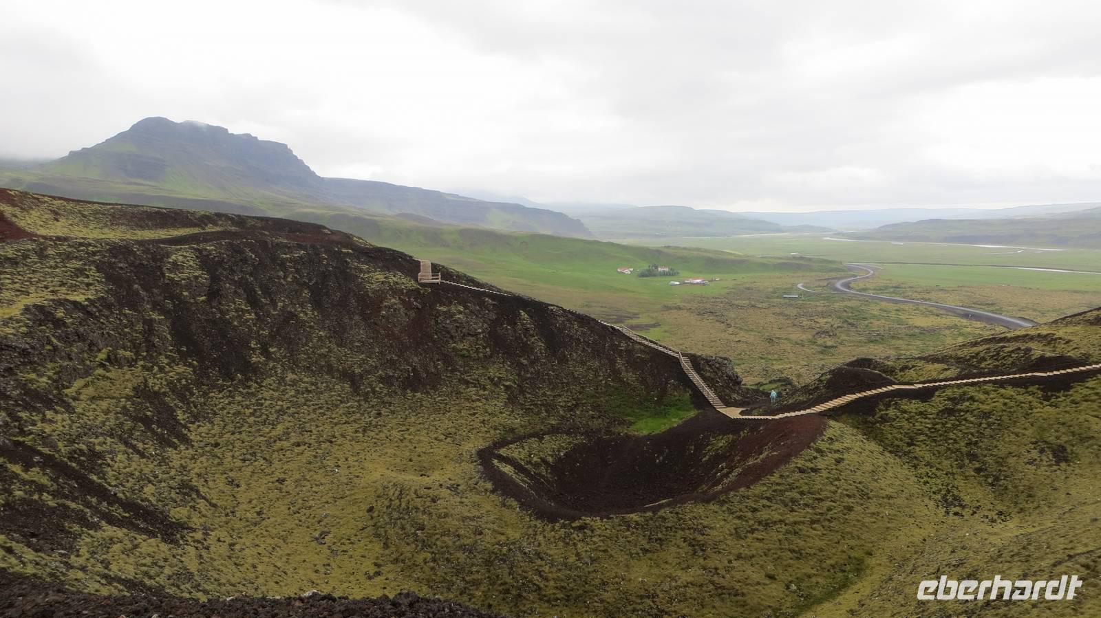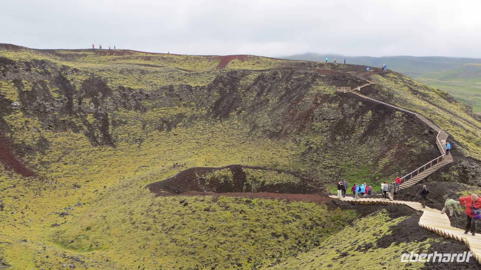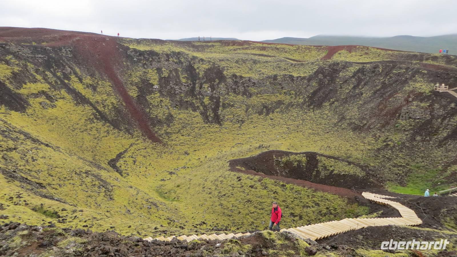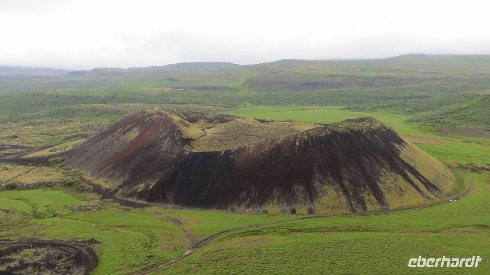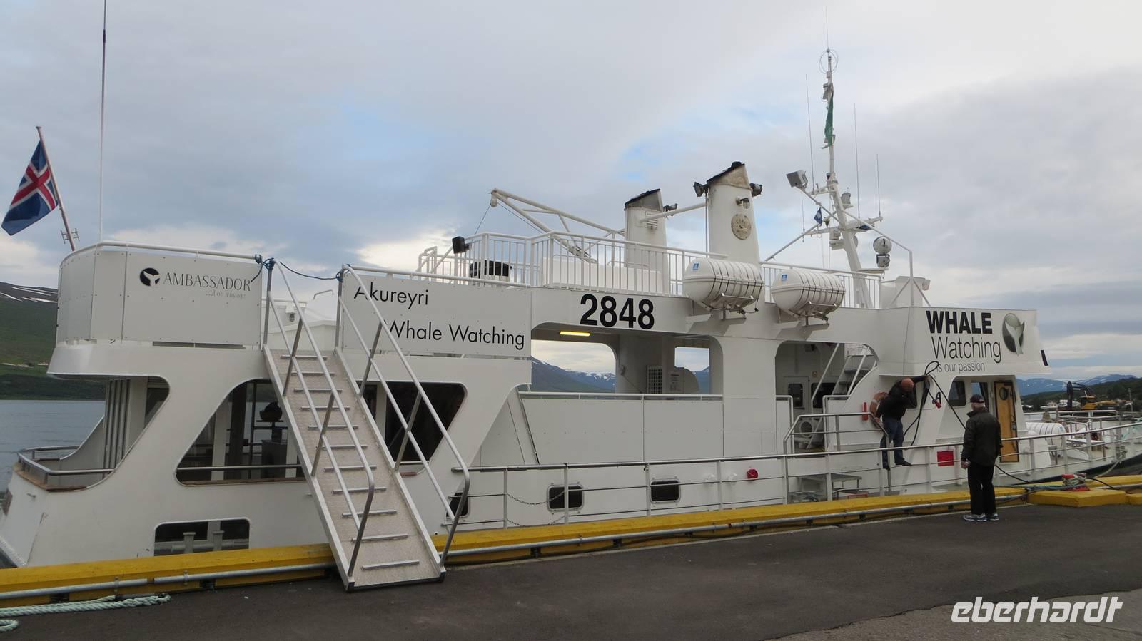 Heute heißt es erst einmal Abschied nehmen von der isländischen Hauptstadt. Und so starten wir mit gepackten Koffern pünktlich 9:00 Uhr von unserem Hotel. Für die kommenden Tage werden uns nun Sigi als Busfahrer und Ulrike als Reiseleiter diese sagenhafte nordische Insel mit all ihren Facetten zeigen. Nachdem wir Reykjavík wie gestern in Richtung Norden verlassen haben, erreichen wir schon bald den Walfjordtunnel. Durch diesen 6 km langen Tunnel, welcher an einer Stelle sogar bis zu 160 m tief ist, durchqueren wir den Fjord. Anschließend geht es weiter bis in die Kleinstadt Borgarnes, wo wir unsere erste kleine Pause einlegen. Borgarnes ist Heimatort berühmter Dichter und Sagahelden, wie z.B. von Egill Skallagrímsson. Nachdem alle wieder im Bus sind, verlassen wir nun die Küste und fahren in das Landesinnere bis in das Norðurádalur Tal, wo sich der erloschene Krater Grábrók befindet. Inmitten eines Lavafeldes steigen wir aus und starten zu einem kleinen Spaziergang. Auf einer Holztreppe gelangen wir bis auf den Kraterrand, wo wir eine komplette Runde auf diesem laufen können. Wir genießen die herrliche Aussicht und sehen einen weiteren Krater, den Grábrókarfell. Im Bus stärken wir uns erst einmal mit typisch isländischer Schokolade, die mit Lakritze gefüllt ist - mmhh schmeckt das lecker. Weiter führt uns die heutige Fahrt über die Hochebene Holtavörðuheiði bis wir die Nordküste von Island am Hrútafjörður erreichen. Von hier geht es über Blönduós bis nach Skagafjörður, wo wir heute zu Besuch auf dem Pferdehof Flugumýri sind. Dieser Hof wird von Eyrún Anna Sigurðardóttir und Páll Bjarki Pálsson sowie ihren fünf Kindern betrieben und verfügt im Moment über 120 Pferde. Höchstpersönlich von der Hofbesitzerin empfangen, führt sie uns in den Stall, wo sie uns anhand der Pferde ihre Besonderheiten erläutert. An einer Schautafel erklärt sie uns die 5 unterschiedlichen Gangarten Schritt, Trab, Galopp, Töl und Pass, welche in diesem Umfang ausschließlich von Islandpferden beherrscht werden und im Prinzip angeboren sind. Damit wir nun aber diese Gangarten auch einmal in Natur sehen können, verlassen wir wieder den Stall und gehen auf eine Terrasse, wo wir bei Tee, Kaffee, Kuchen und Pfannkuchen eine kleine Darbietung der Gangarten uns anschauen. Wir genießen die Zeit mit diesen beeindruckenden Tieren und machen uns schließlich wieder auf den Weg nach Akureyri. Wir nehmen Abschied von Flugumýri und werden noch lange von dem Hund des Hofes verfolgt. Vorbei an schneebefleckten Bergen und grünen Bergwiesen erreichen wir am Abend die Hauptstadt des Nordens, Akureyri. Sie ist die zweitgrößte Stadt Islands und idyllisch am Ende des Eyjafjörðurs gelegen. Die kommenden zwei Nächte werden wir im Edda-Hotel verbringen. Diese Art von Hotels sind in mehreren Orten auf Island zu finden und haben zur Besonderheit, dass sie im Winter als Wohnheime für die Studenten dienen und im Sommer unter Betreiben der Studenten als Hotels genutzt werden. Ein tolle Idee, welche von den Touristen auf Island gut angenommen wird. Nachdem alle in Ruhe ihr Zimmer bezogen haben, treffen wir uns zum gemeinsamen Abendessen. Am vielfältigen Buffet ist für jeden etwas dabei, so dass wir alle mit vollen Bäuchen das Restaurant verlassen. Da Akureyri als Ort für einmalige Walbeobachtungsfahrten bekannt ist, nutzt auch ein Großteil der Gruppe die heutige Gelegenheit zu einer Walsafari. Ulrik hat schon alles für uns organisiert, so dass wir direkt nach dem Abendessen aufbrechen können. Vorbei an der katholischen und protestantischen Kirche spazieren wir zum Hafen, wo bereits schon das Schiff, welches übrigens ein ehemaliges deutsches Polizeischiff ist, für uns bereit steht. Wir gehen an Bord und stechen pünktlich 20:30 Uhr in See. An Bord haben wir als Guide ein Mädchen aus Deutschland, welches uns während der gesamten Fahrt über die Umgebung, die Vögel und die Wale informiert. Sie erklärt uns auch das System nach welchem angesagt wird, wo Wale zu sehen sind. Die Kommandos hierfür erfolgen nach dem Uhrzeigerprinzip. So ist z.B. am Schiffsheck 6 Uhr. Wir fahren auf dem Fjörd in Richtung Meer, bis schließlich das erst Kommando ertönt. Von nun an müssen wir immer wachsam sein und die Kameras bereithalten. Wir versuchen jedes Mal, wenn sich diese faszinierenden Tiere mal kurz an der Wasseroberfläche sehen lassen, ein Foto zu schießen, doch leider ist dies nicht so einfach. Dennoch freuen wir uns über unser Glück und fahren schließlich bei einem traumhaften Sonnenuntergang zurück nach Akureyri, wo wir kurz nach Mitternacht eintreffen. Es hat inzwischen angefangen stark zu regnen, so dass wir strömenden Regen zurück zum Hotel laufen müssen. Geschafft von diesem ereignisreichen Tag fallen wir tot müde ins Bett.